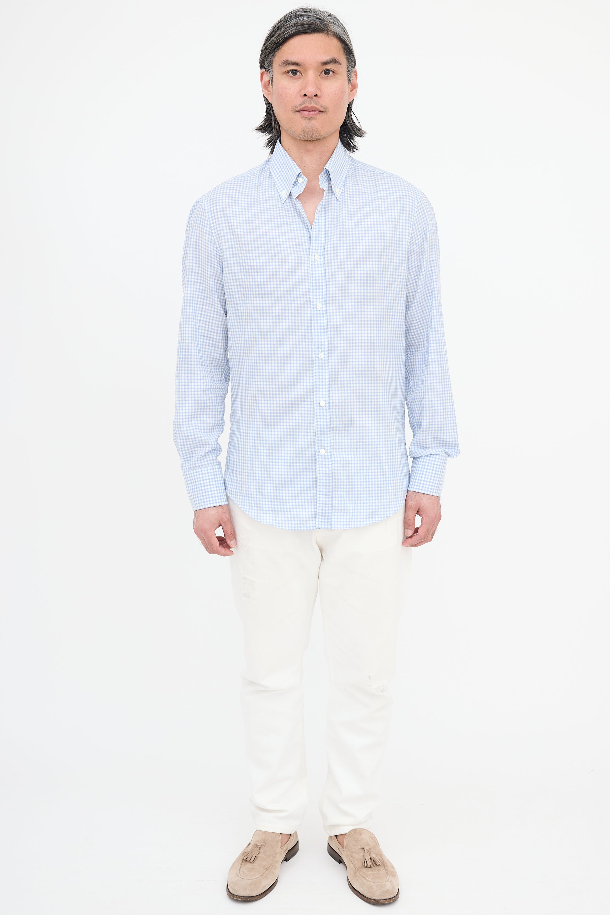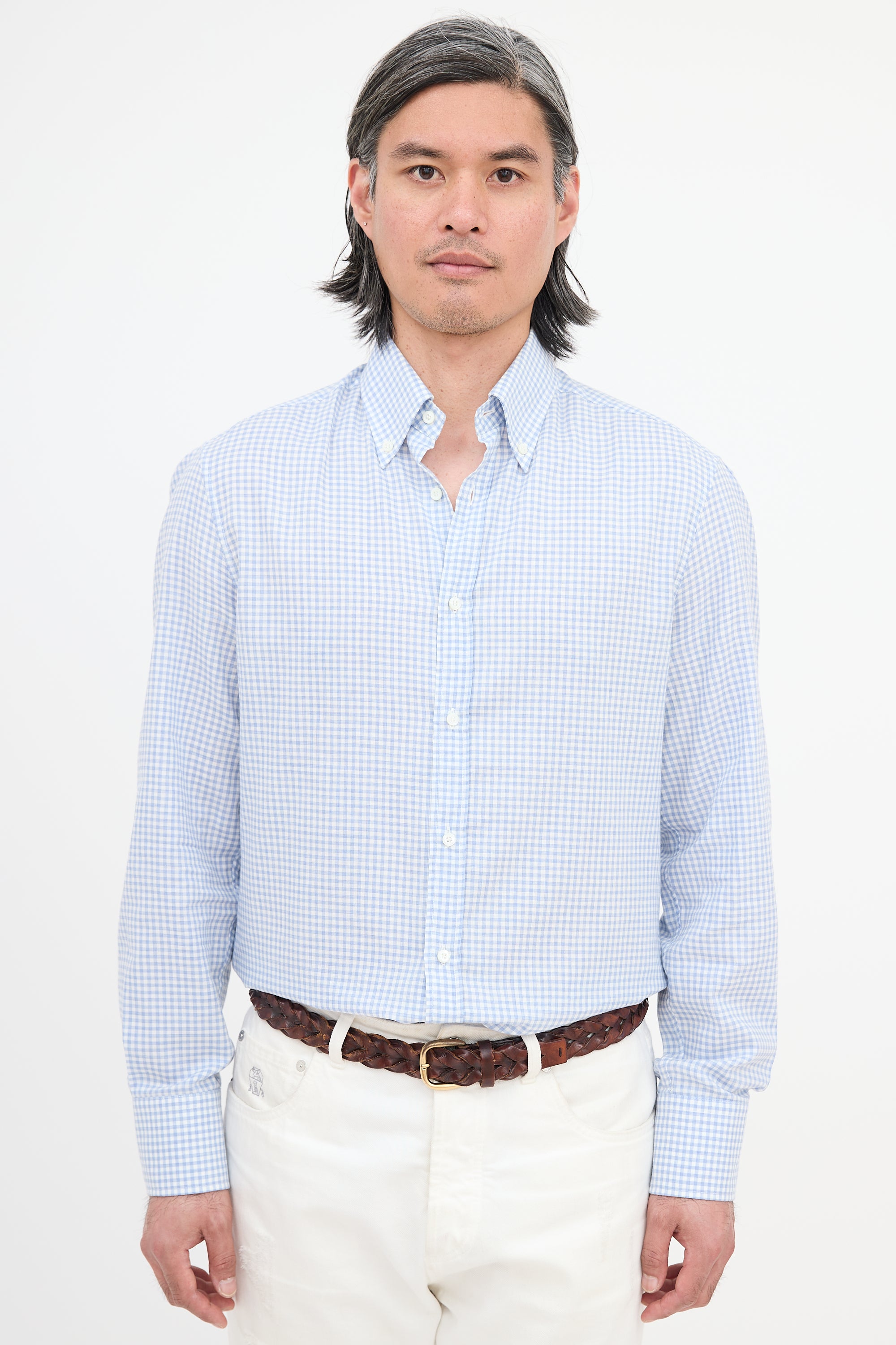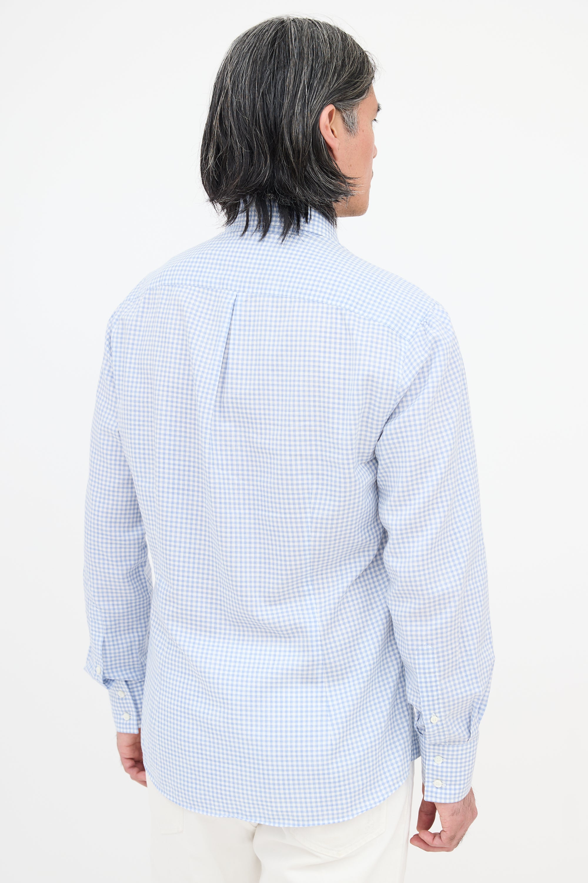 Pre-owned Brunello Cucinelli light blue and white slim fit shirt featuring gingham pattern, button down collar, button front, box pleated back yoke, gathered shoulders, and buttoned cuffs.