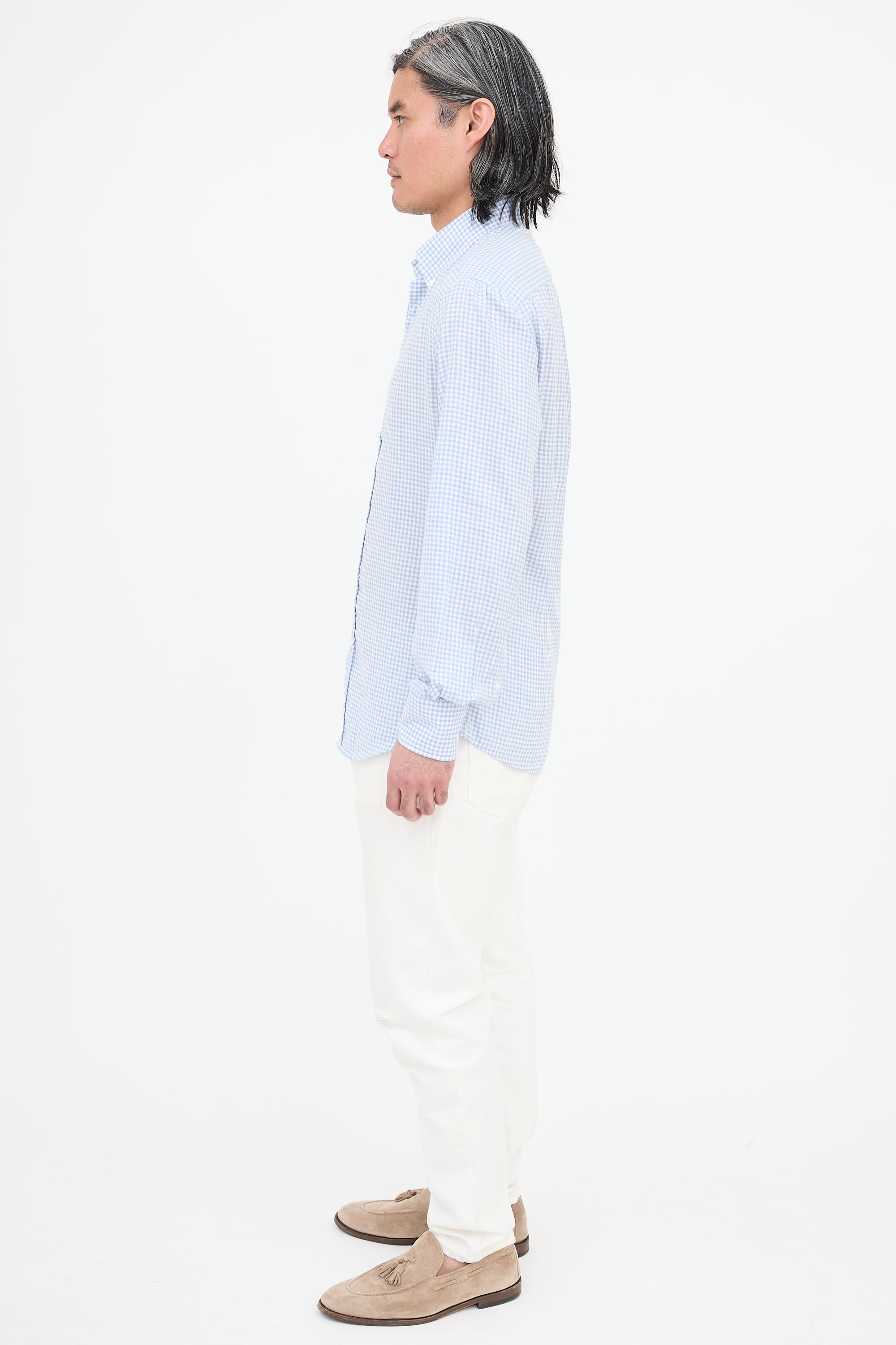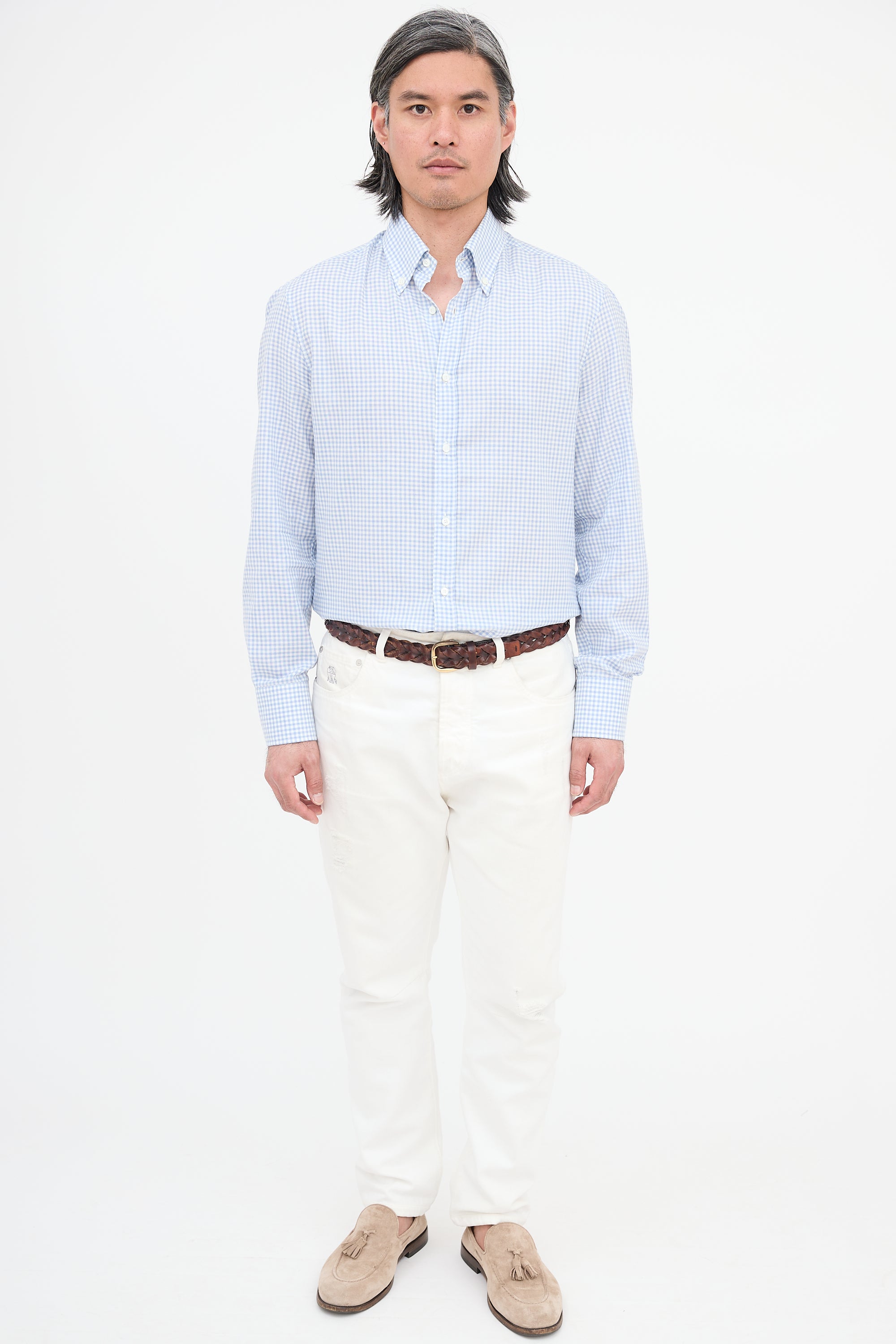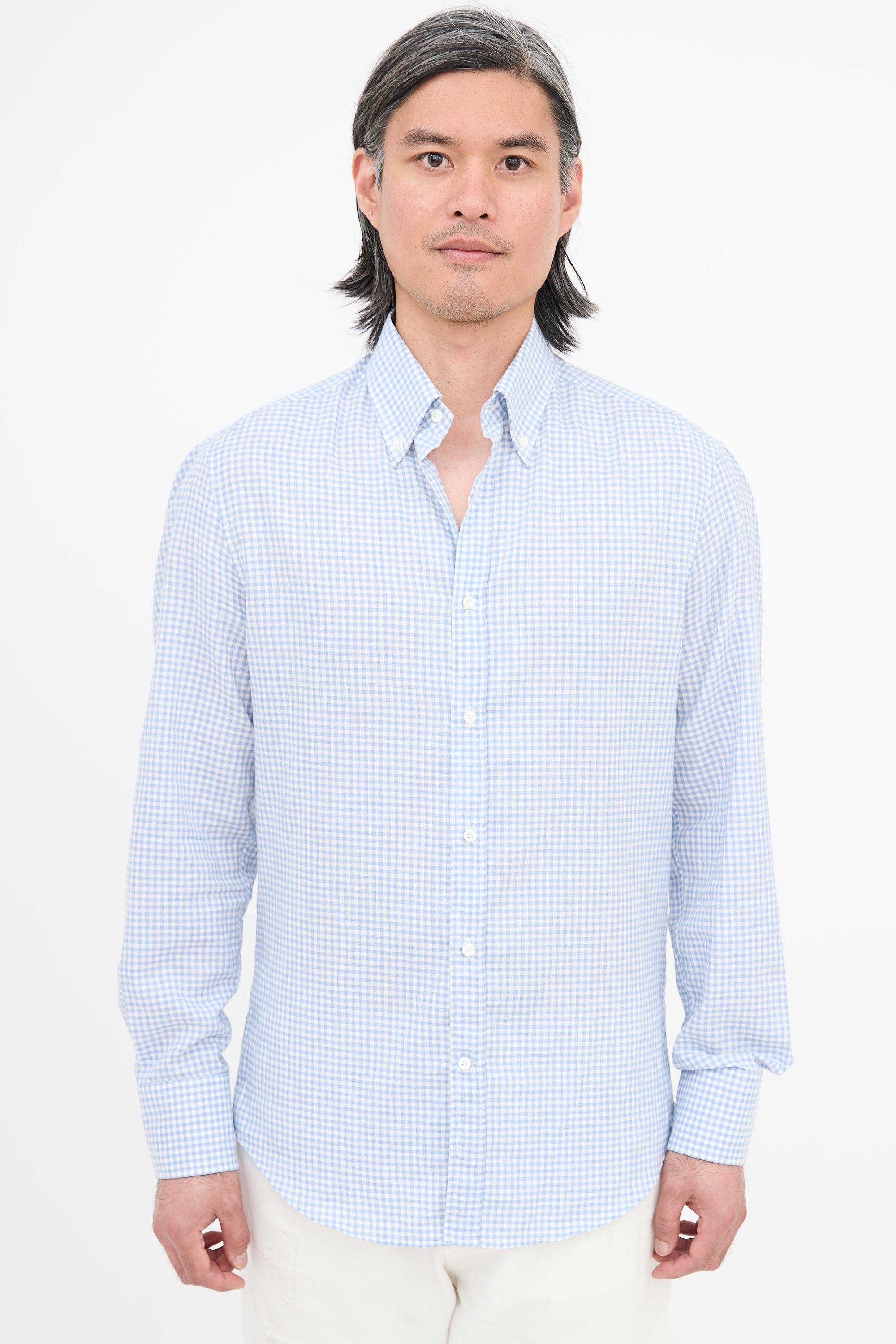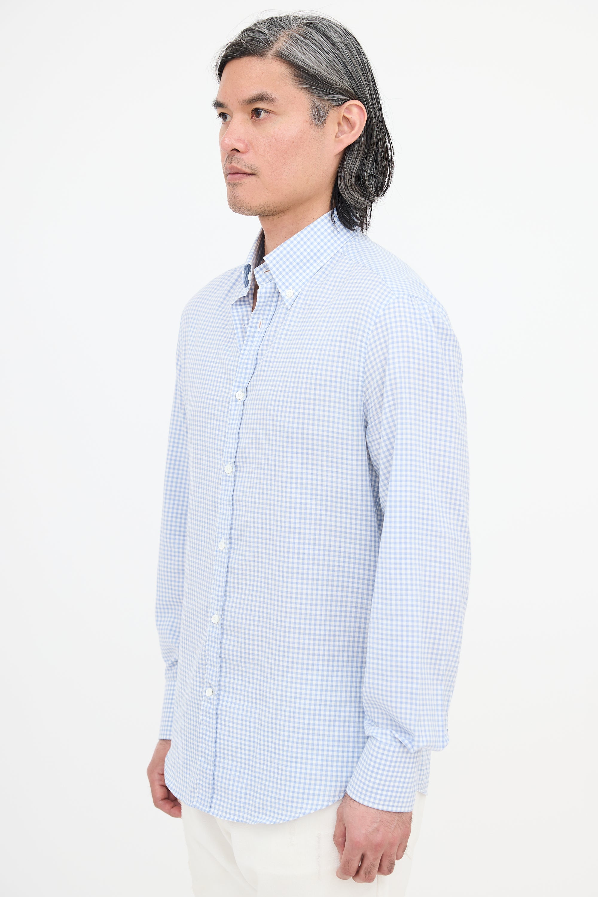 Pre-owned Brunello Cucinelli light blue and white slim fit shirt featuring gingham pattern, button down collar, button front, box pleated back yoke, gathered shoulders, and buttoned cuffs.