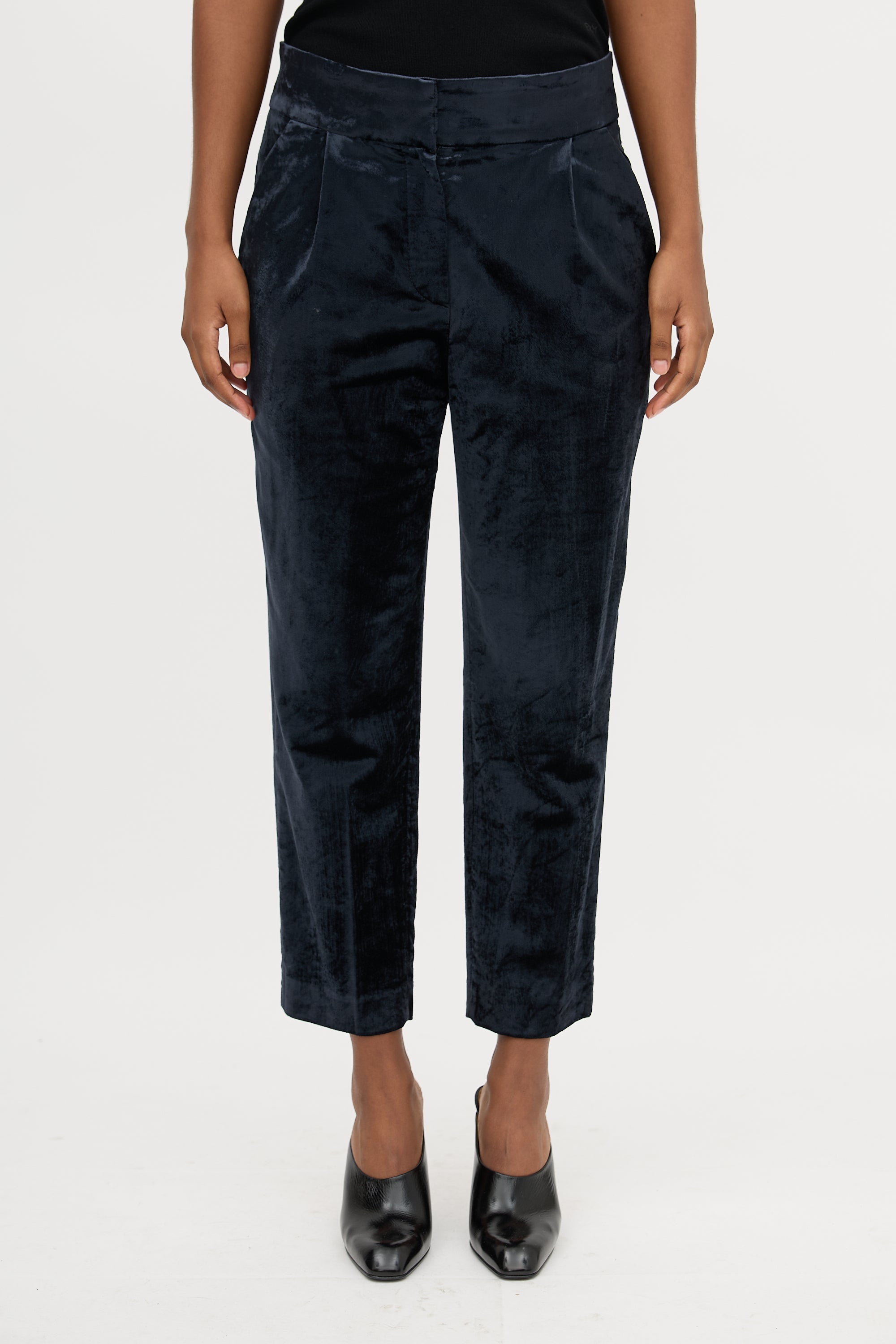 Pre-owned Brunello Cucinelli navy velvet trousers featuring tapered leg, front pleats, four pocket styling, and zip fly.