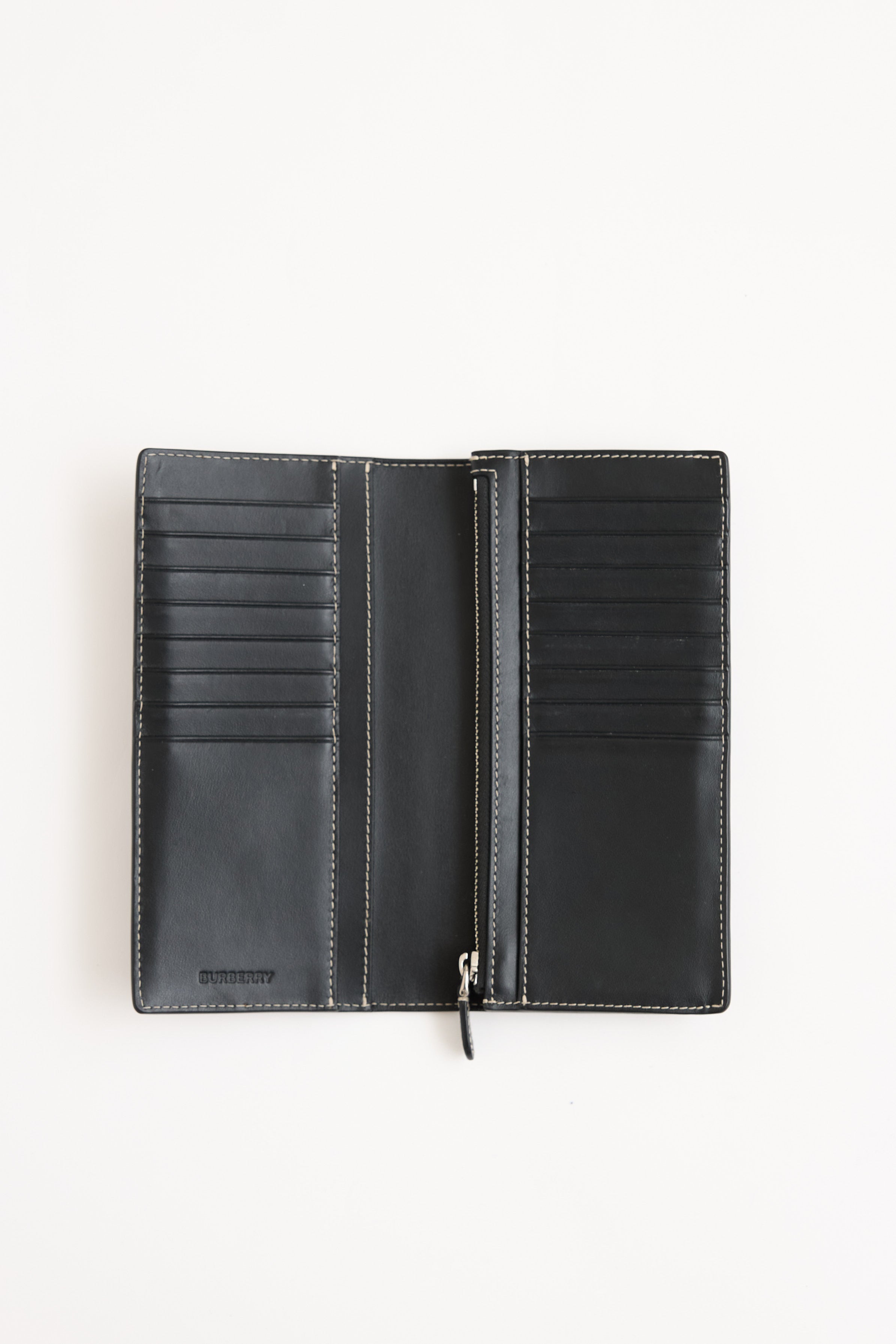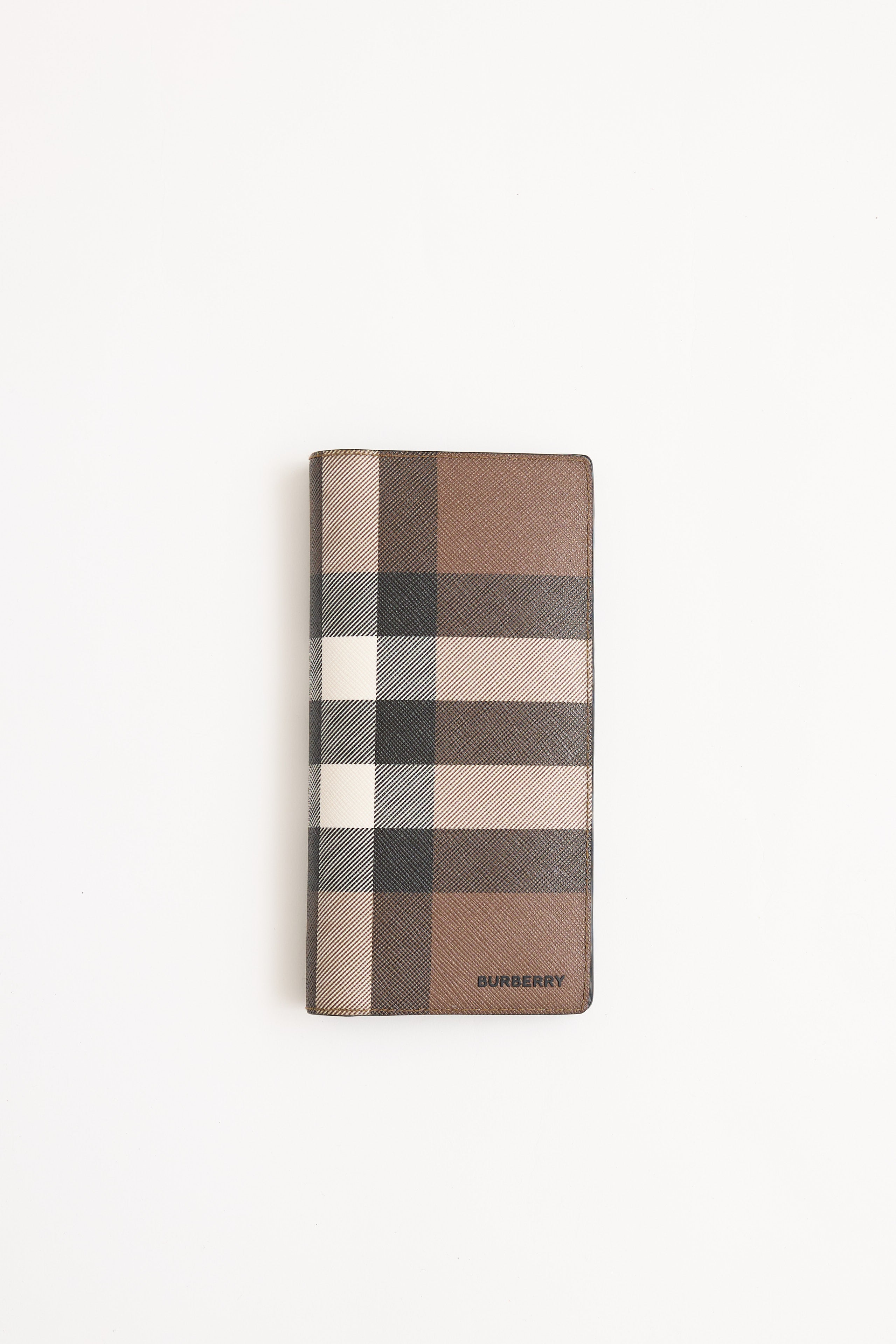 Pre-owned Burberry brown check continental long wallet featuring coated canvas exterior, debossed logo on front, leather interior, 3 bill slots, 16 card slots and one zipper pocket.