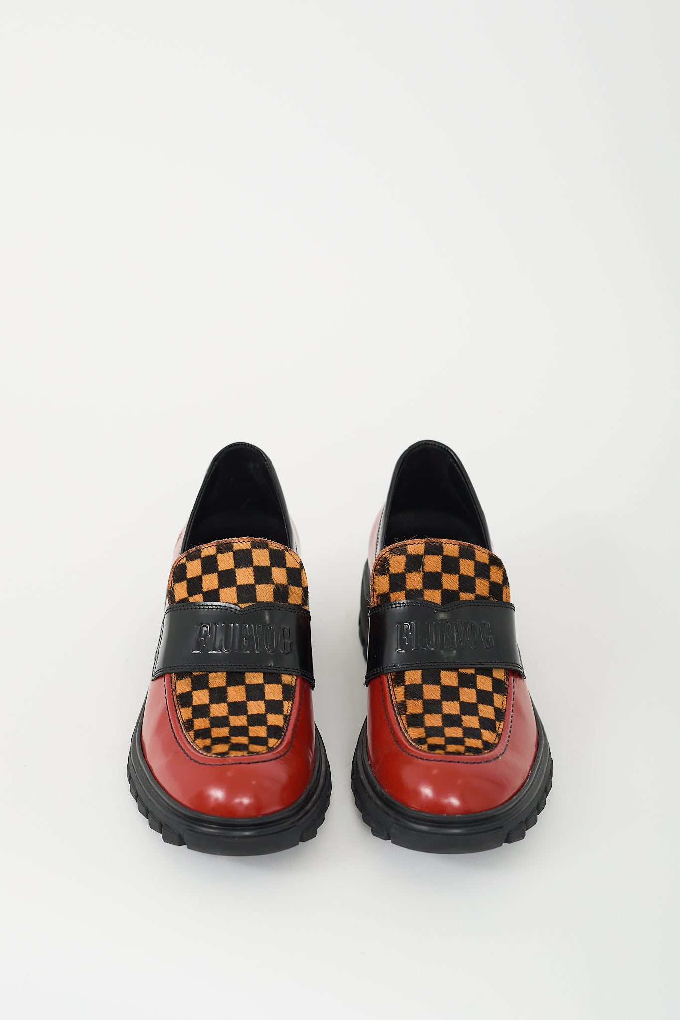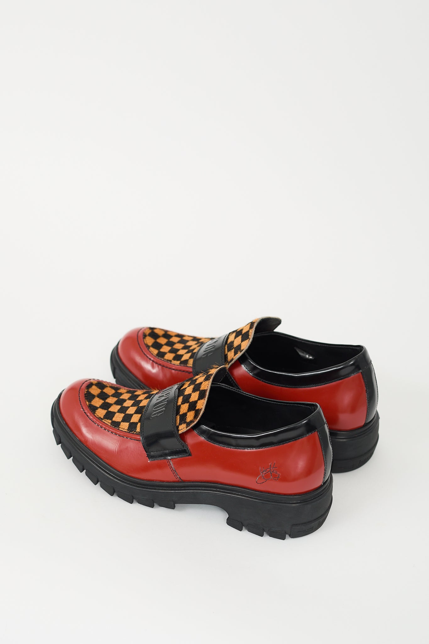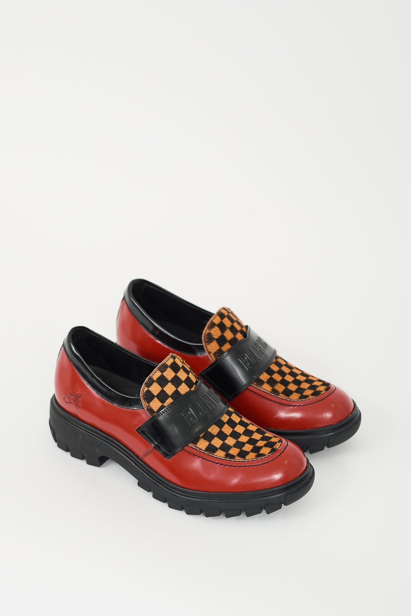 Pre-owned John Fluevog red leather and multicolour Linggo loafers featuring rounded toe, black and yellow checkered pony hair vamp, embossed logo vamp strap, slip on entry, and rubber treaded outsole. Comes with original dust bag.