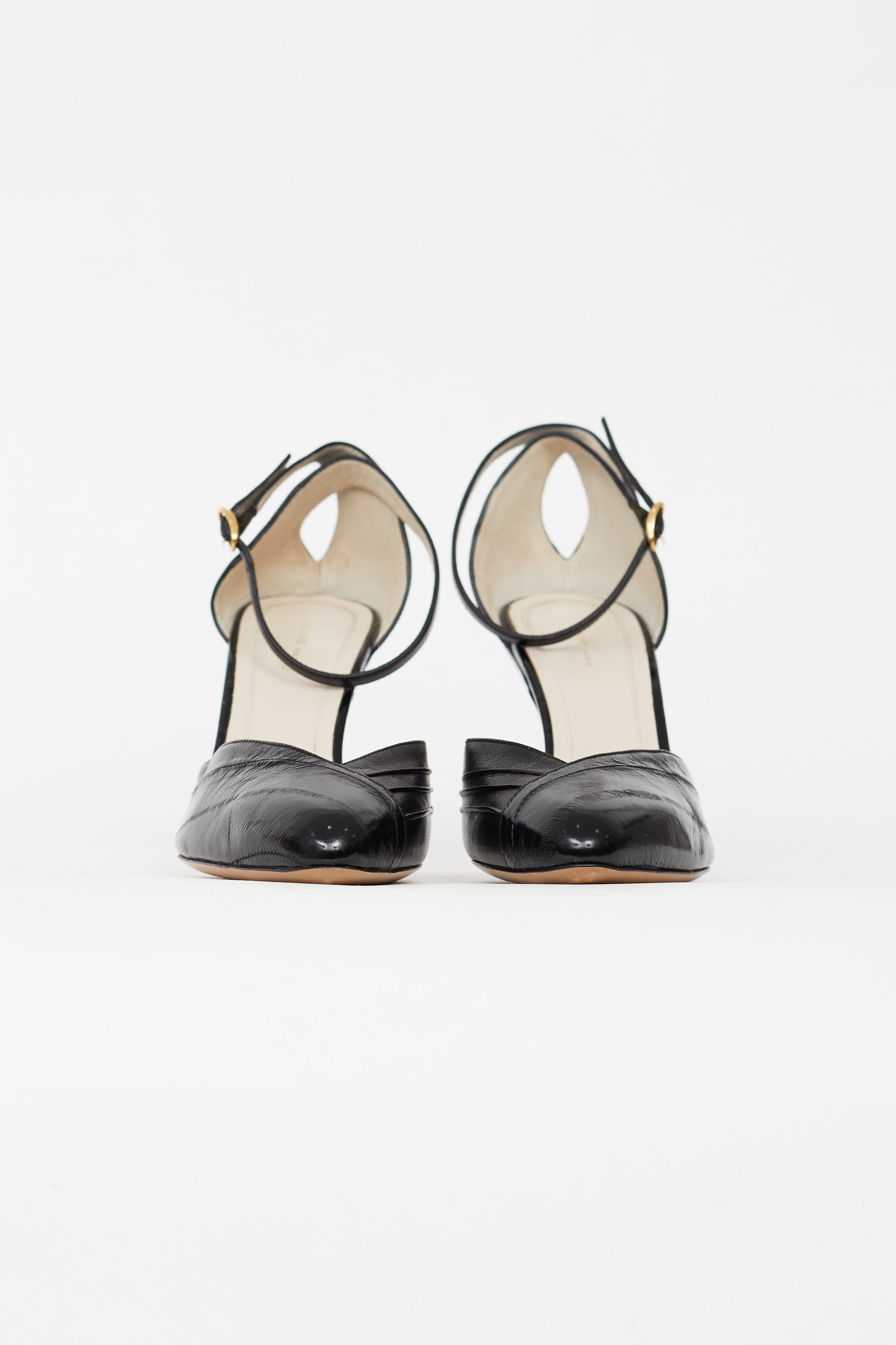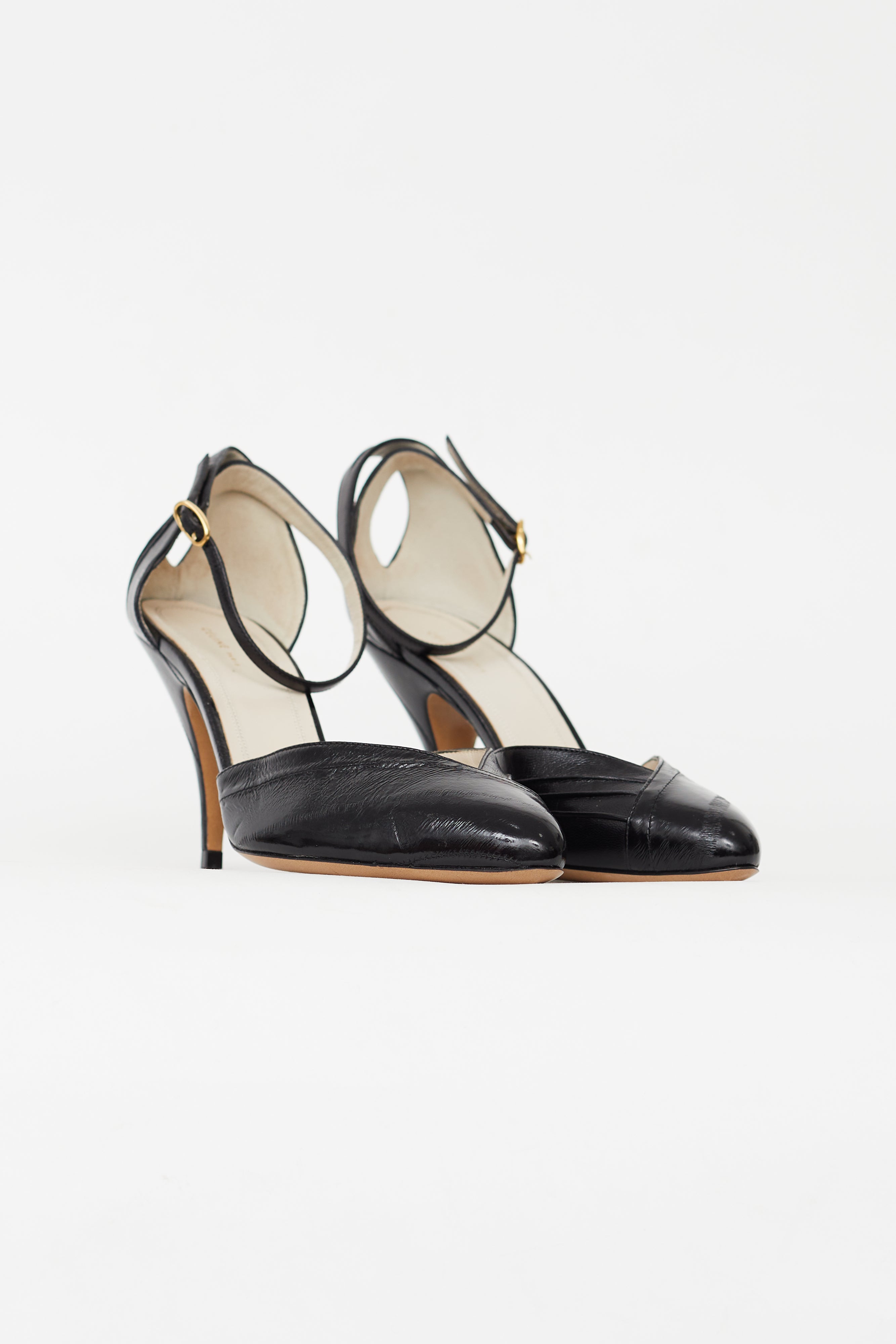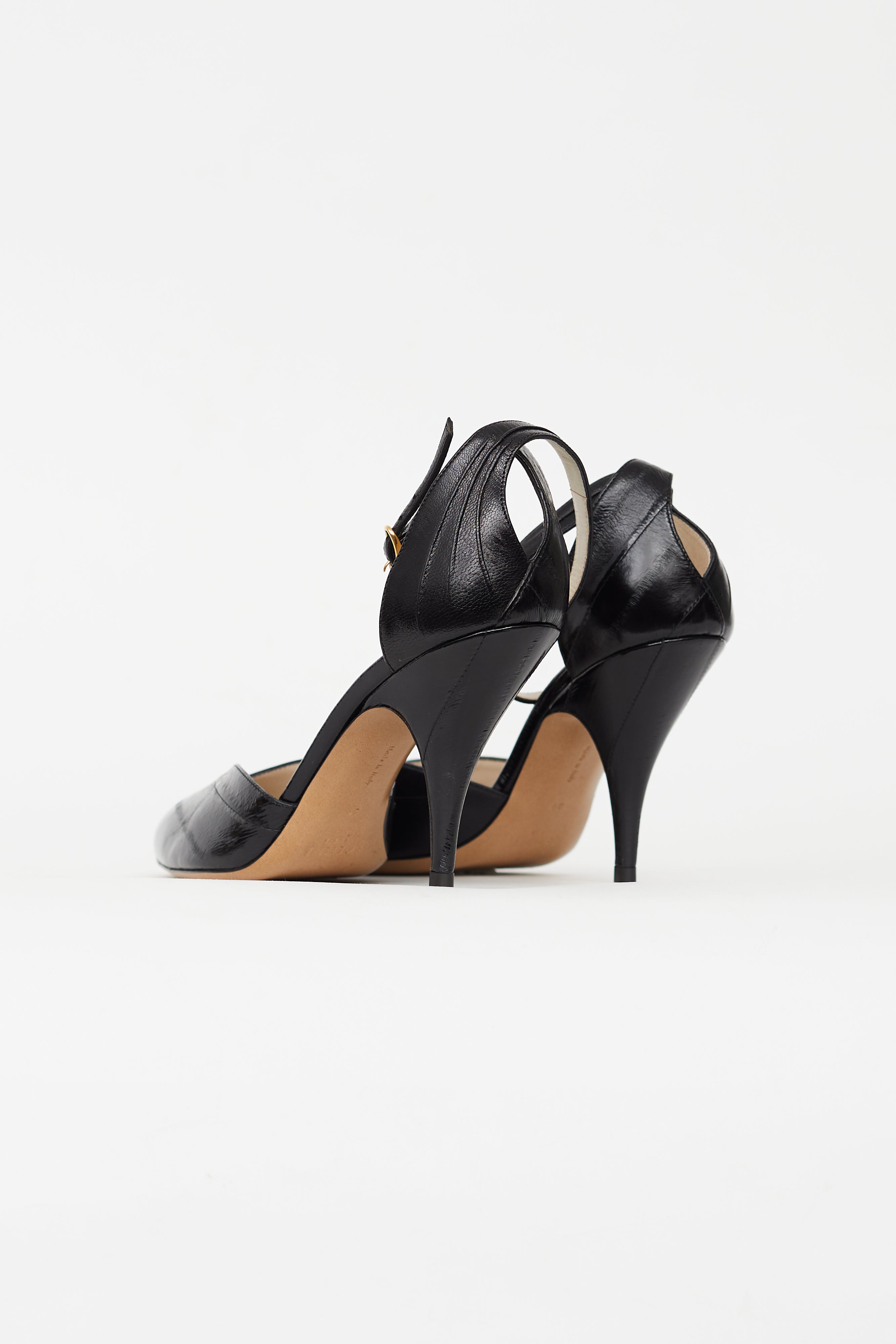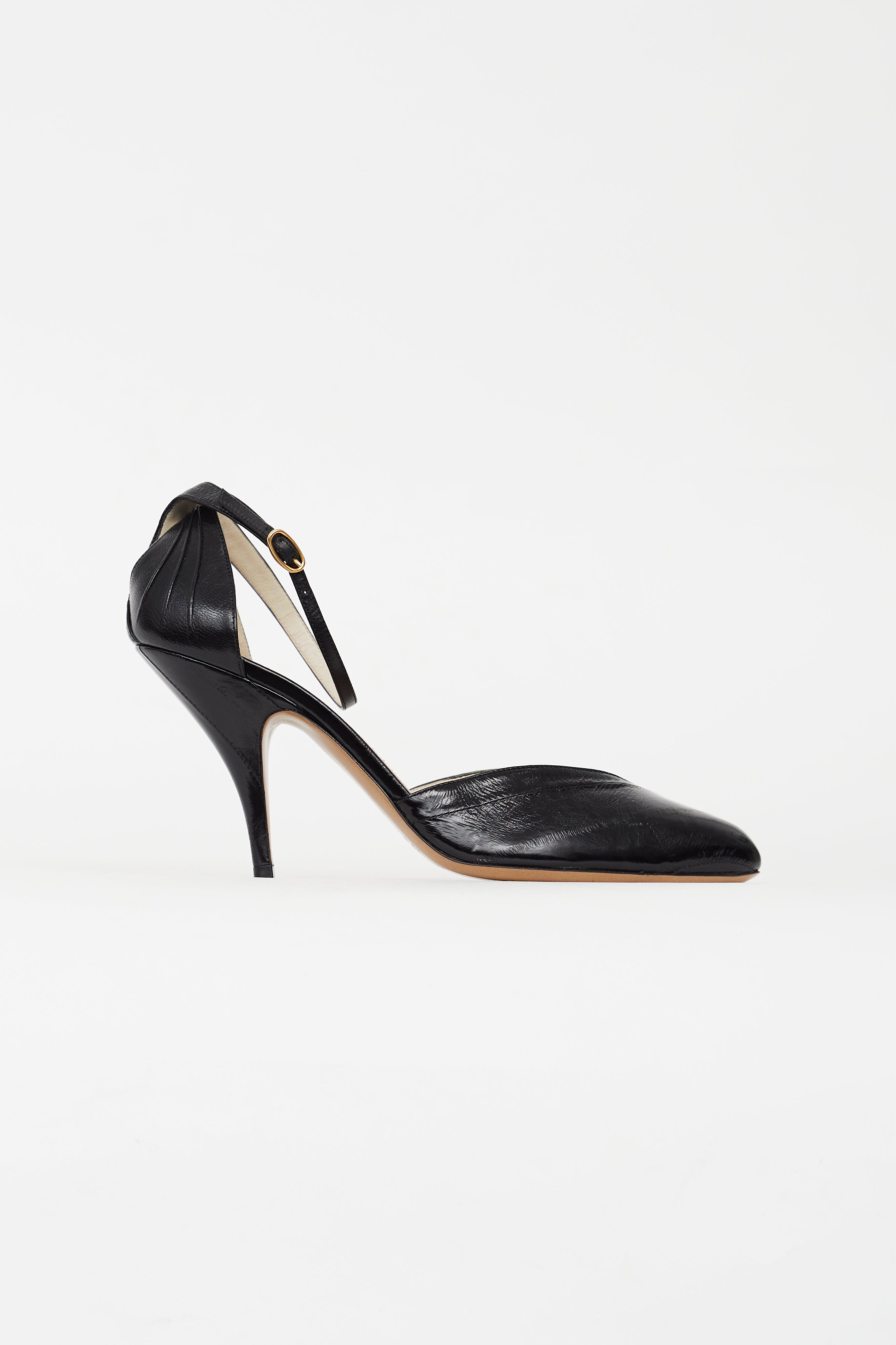 Pre-owned Celine black leather heels featuring a pointed toe with criss cross detail, wrapped stiletto heel, and adjustable strap at ankle.
