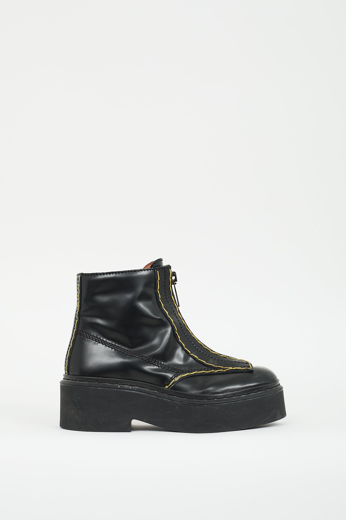 Pre-owned Celine black leather ankle boots featuring rounded toe, yellow contrast stitching, zip closure at front, and platform sole.