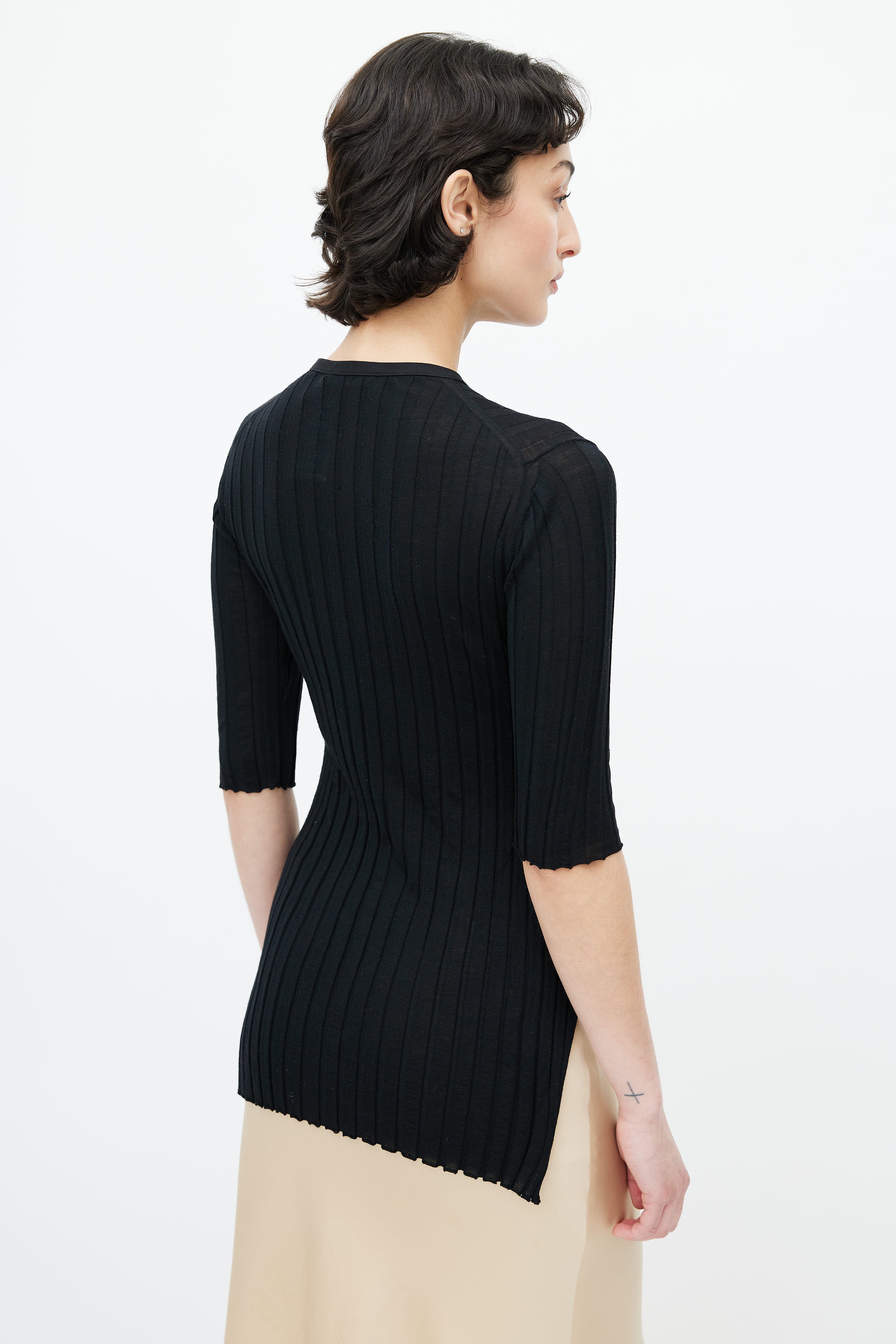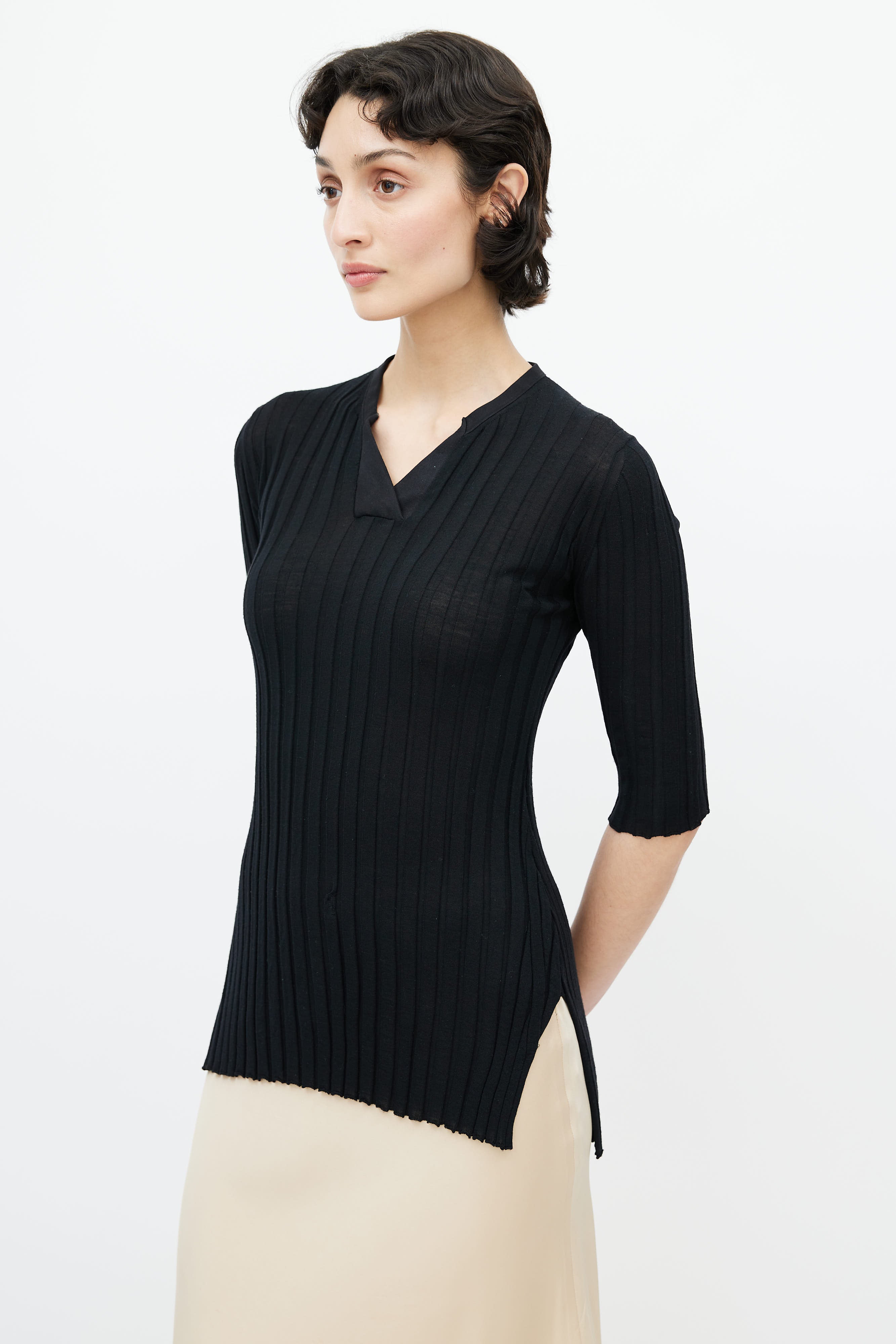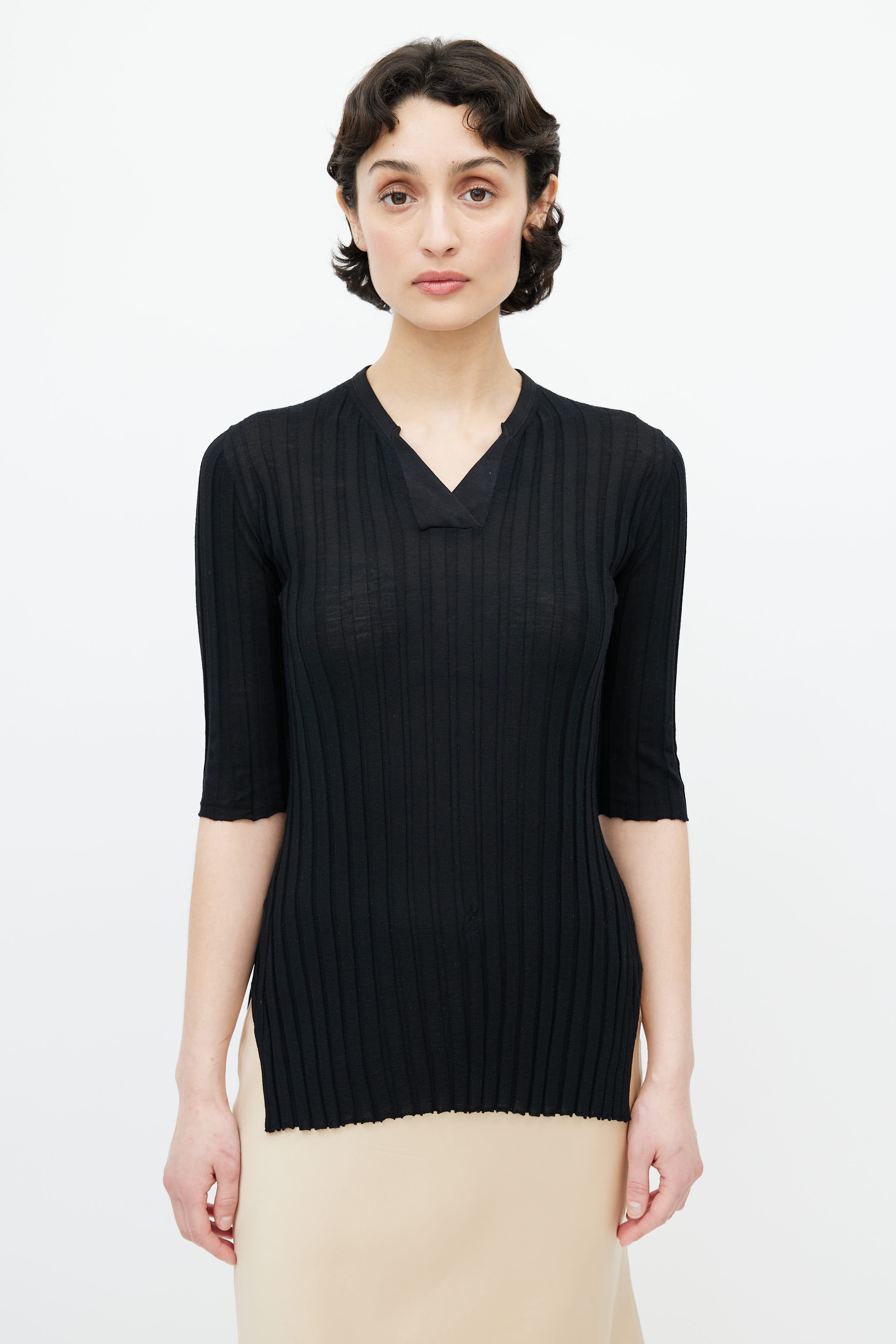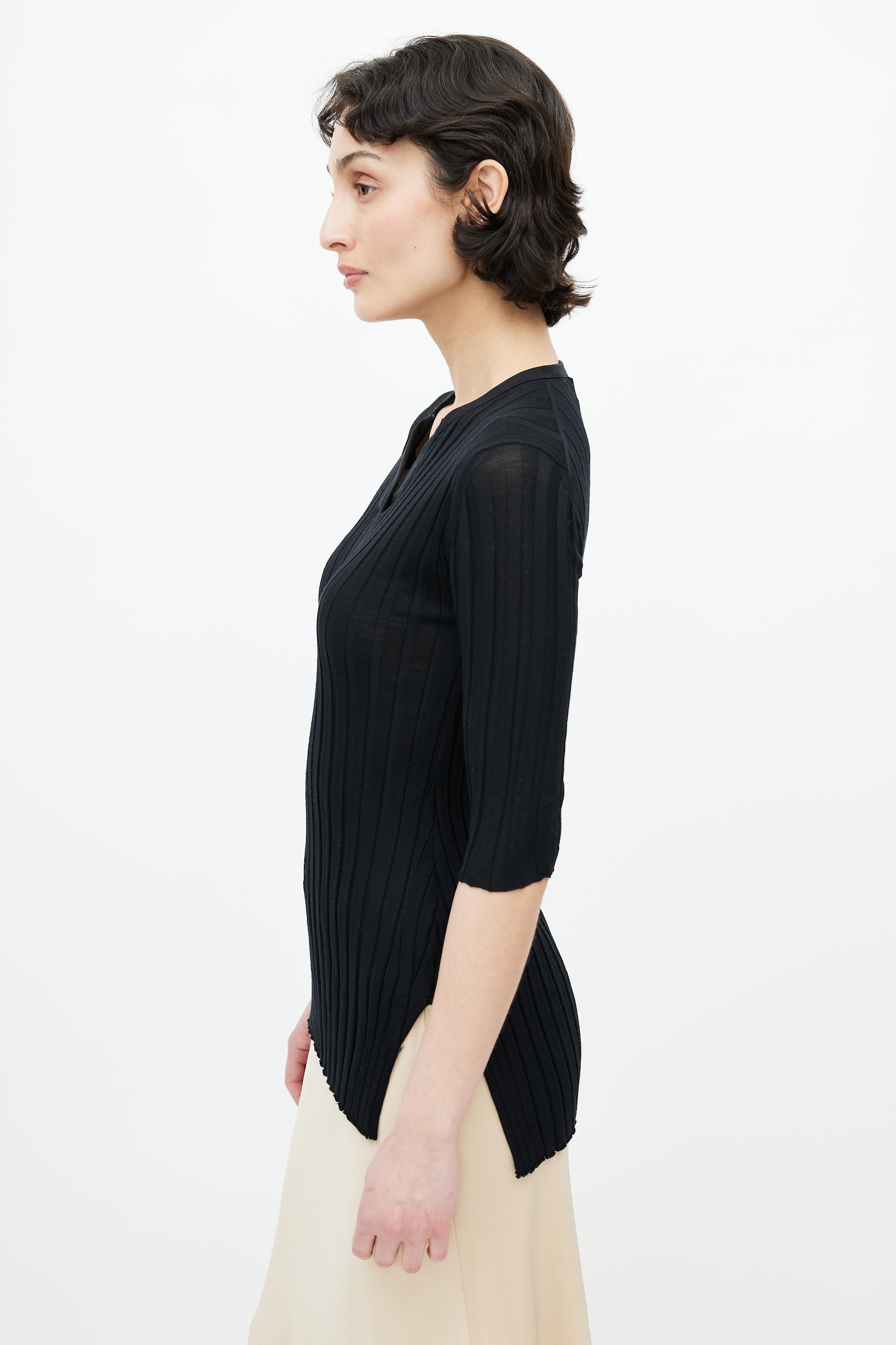 Pre-owned Celine black short sleeve top featuring ribbing throughout, V-neckline, and slits at side hem.