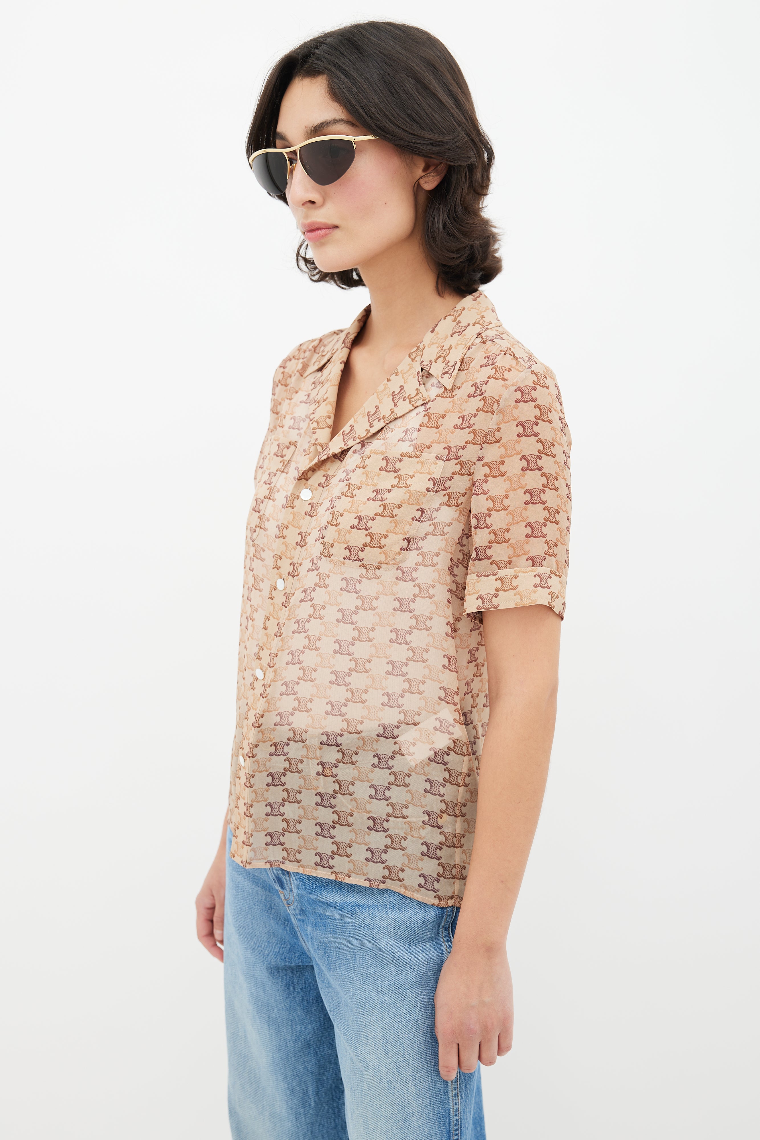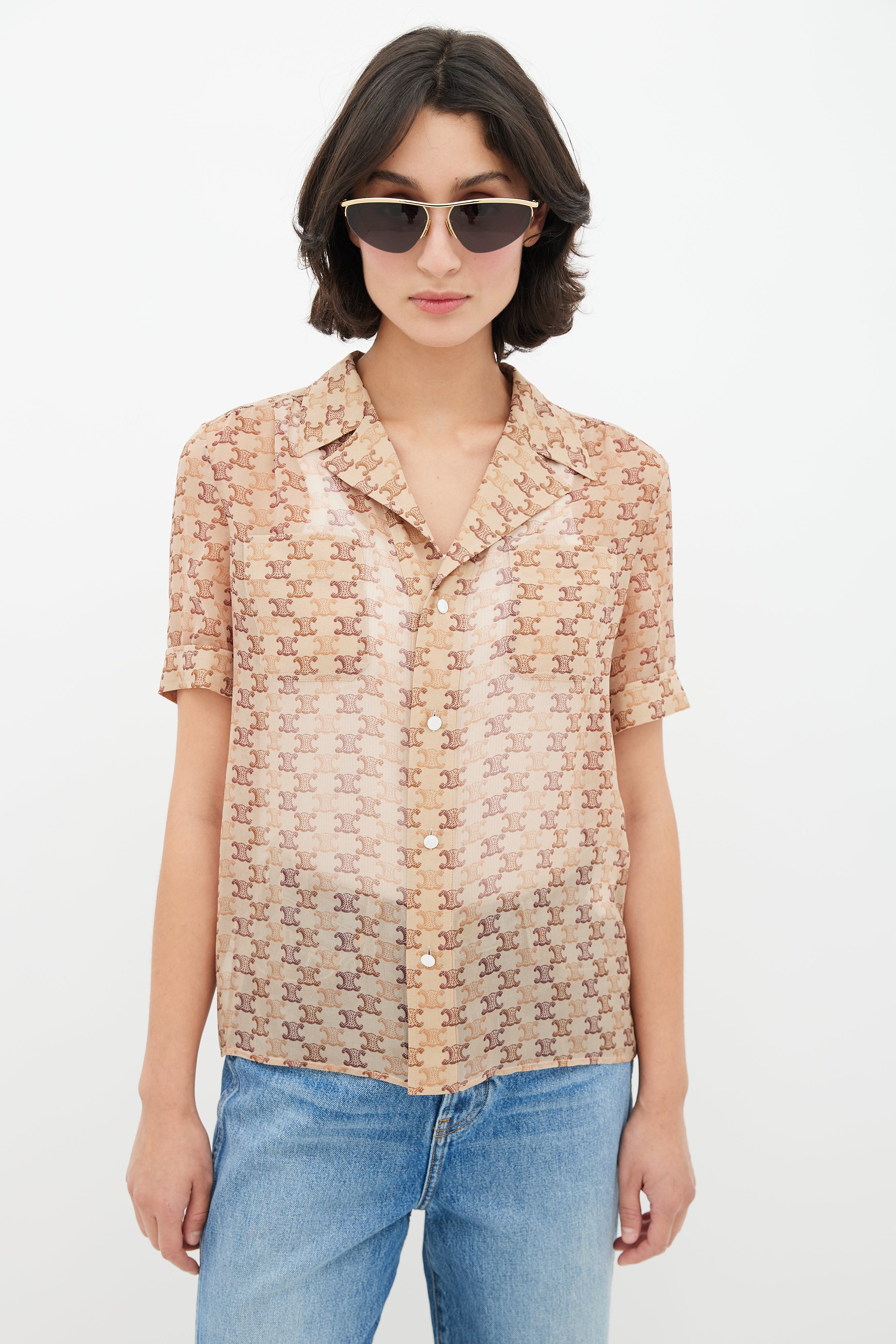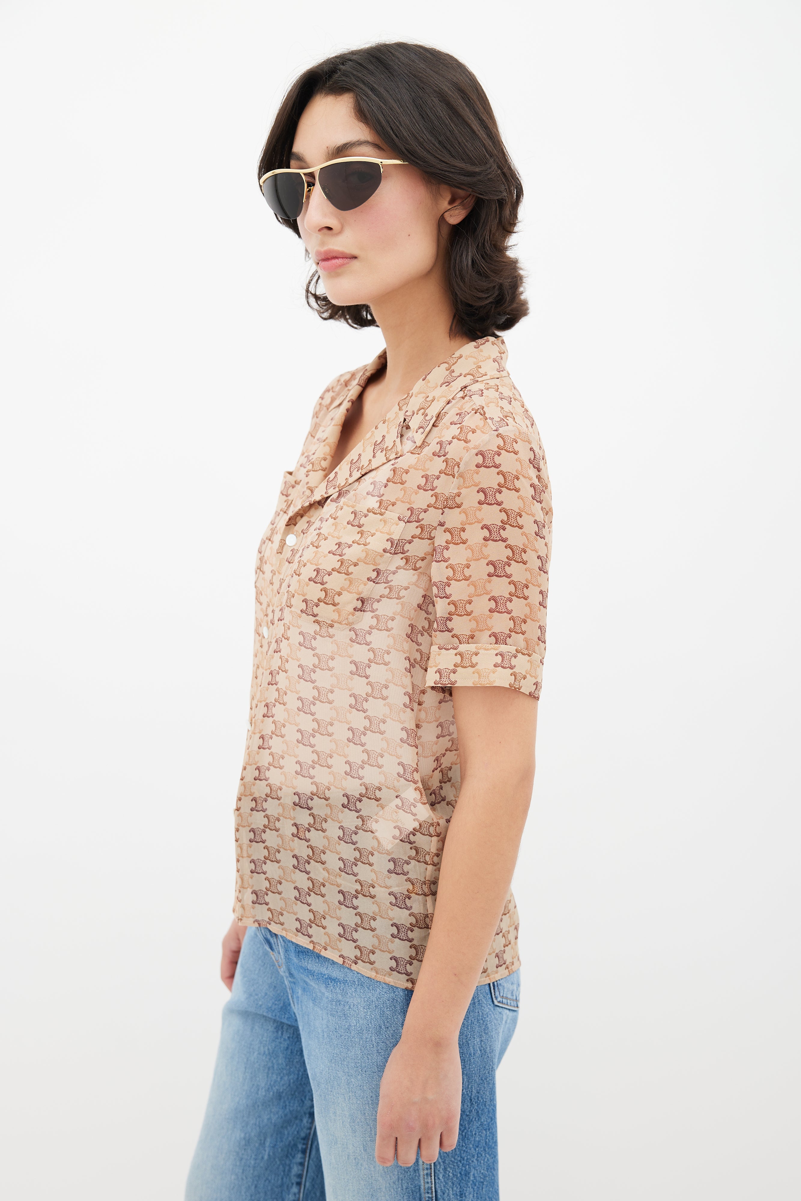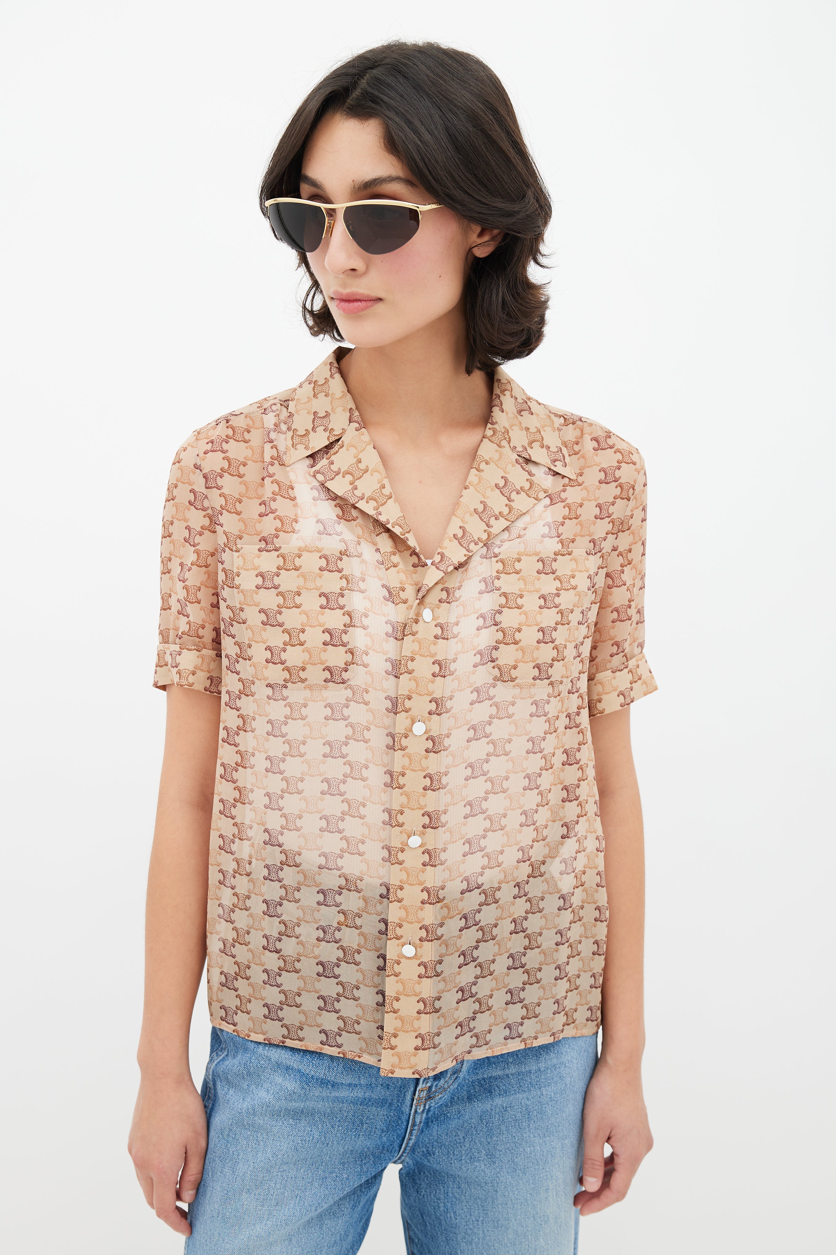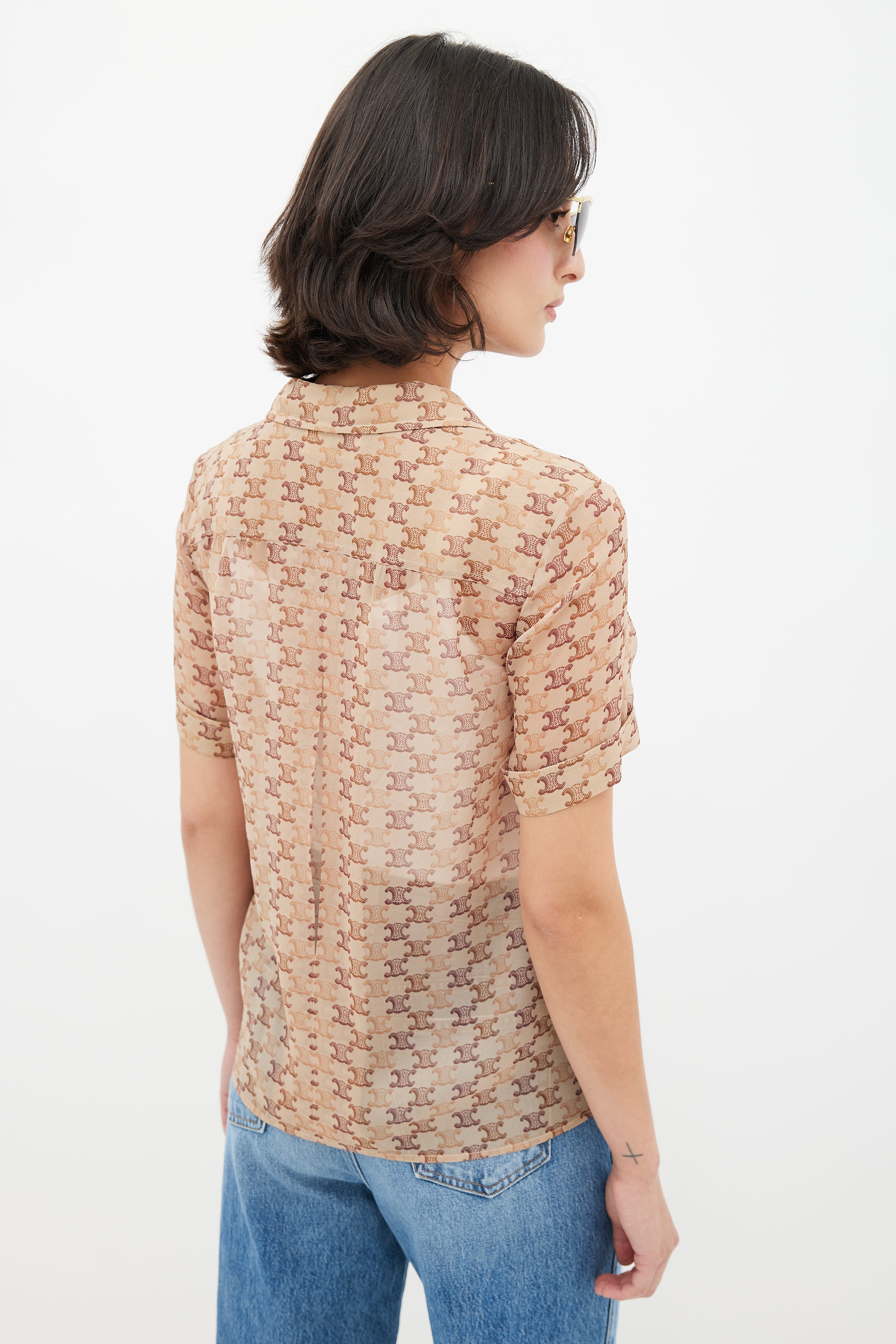 Pre-owned Celine brown semi sheer shirt featuring camp collar, button up front, Triomphe monogram print, and two chest pocket. Hedi Slimane era design.