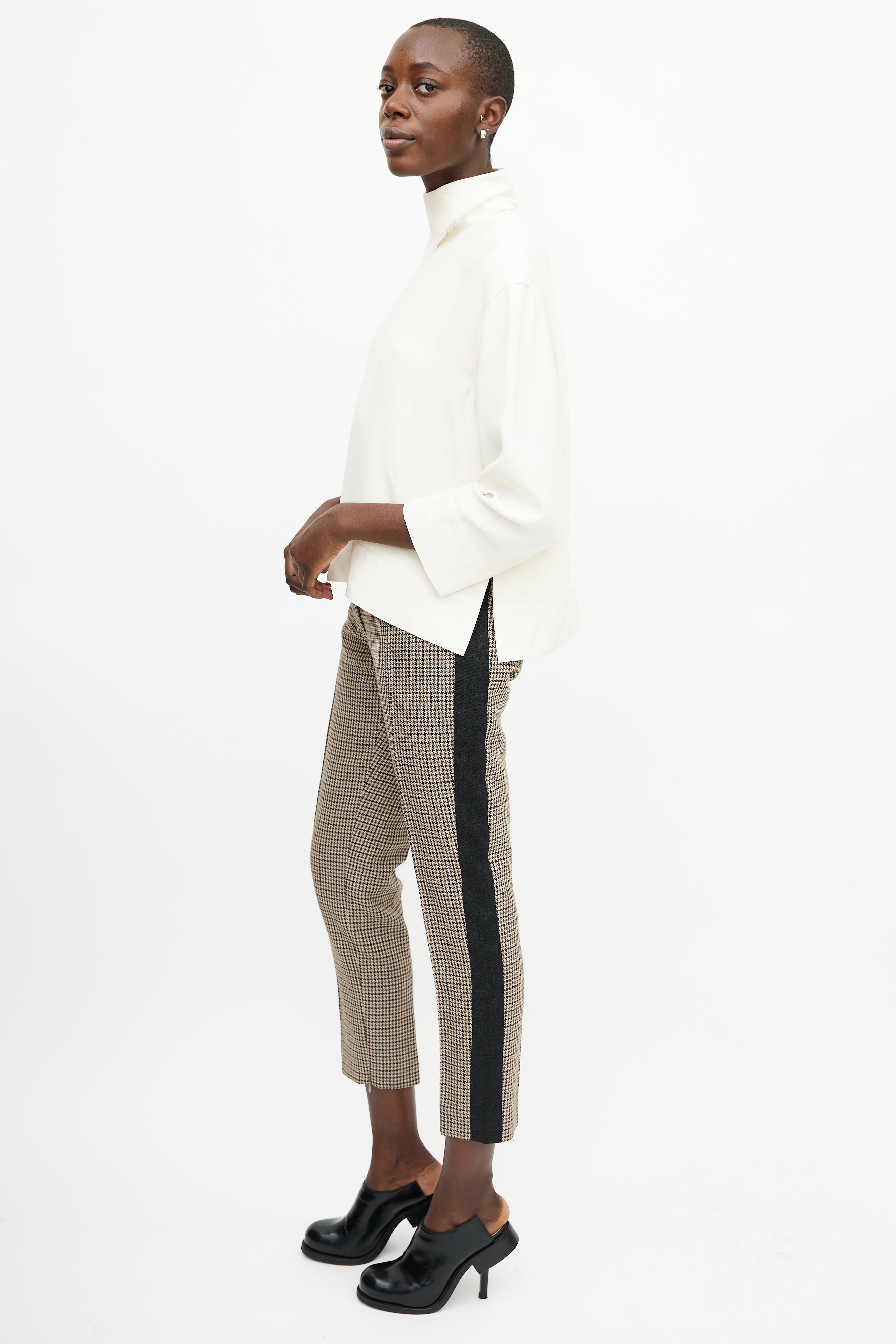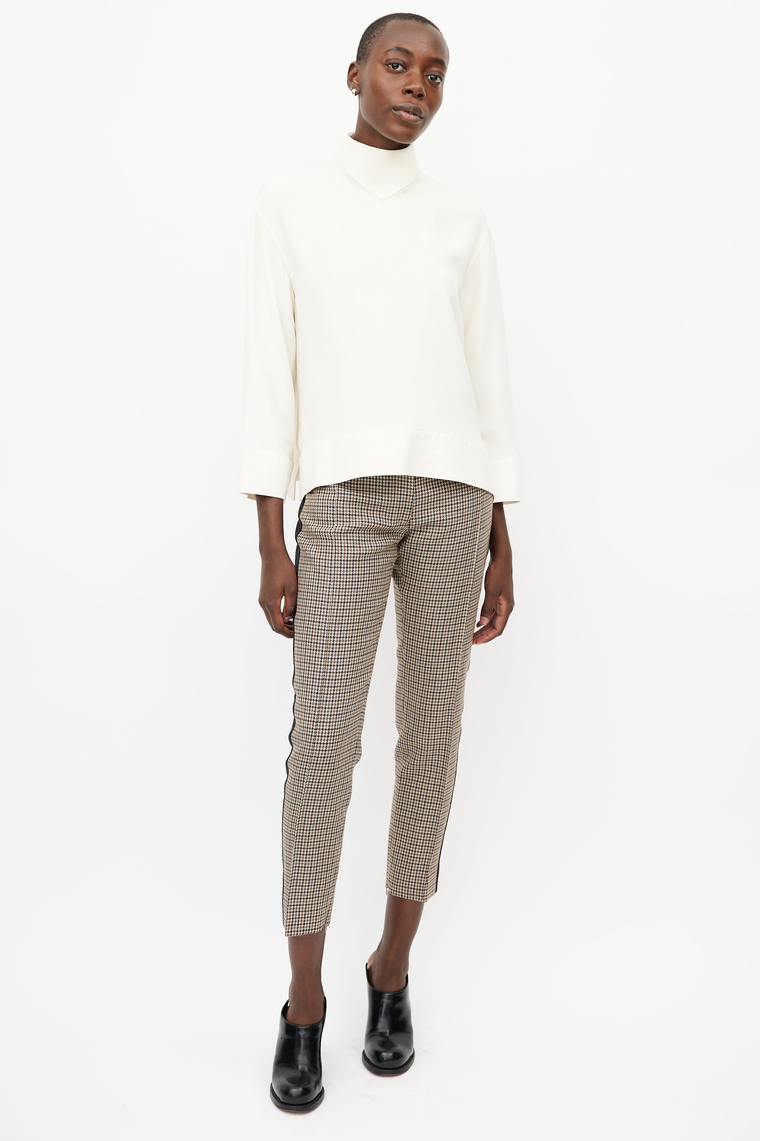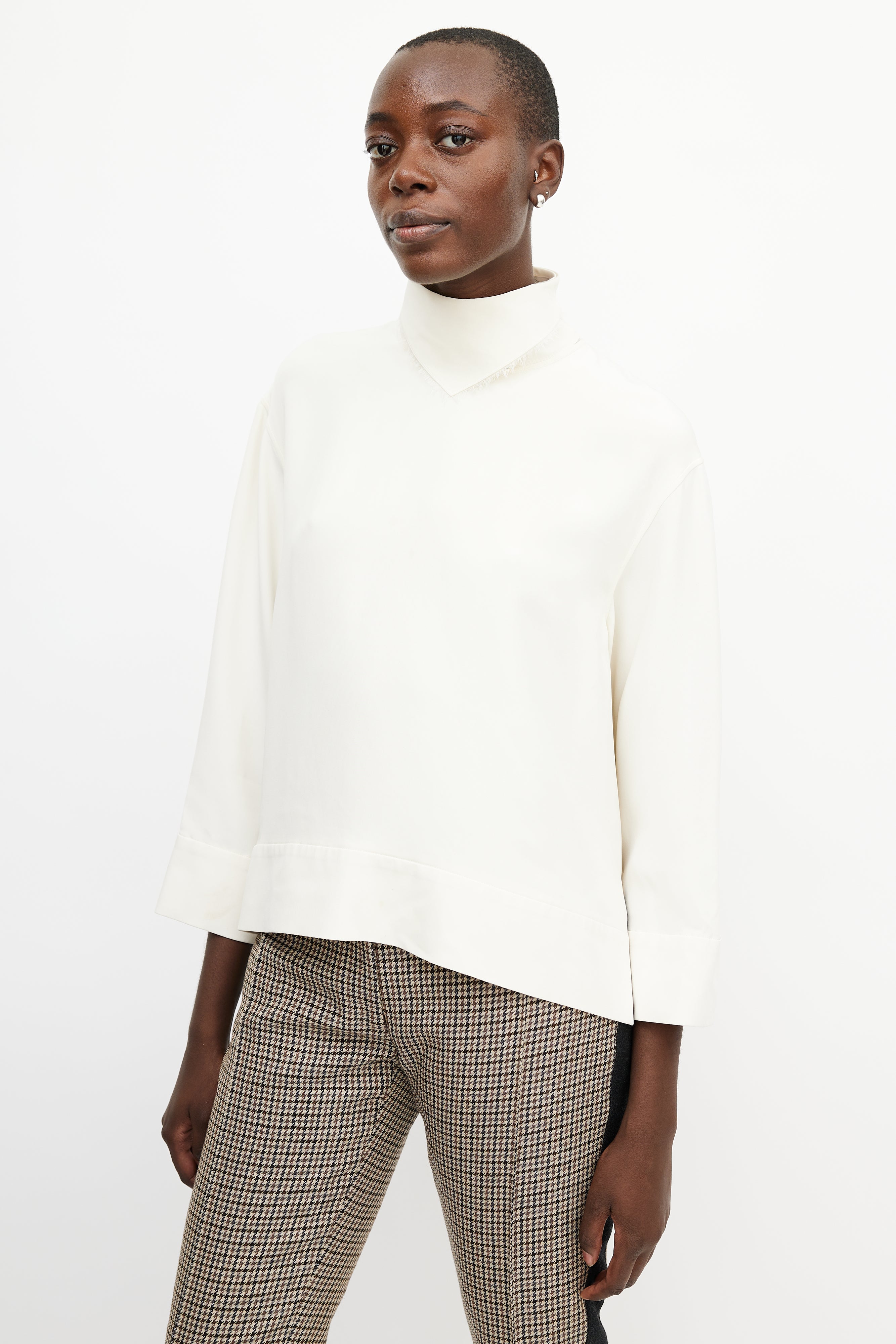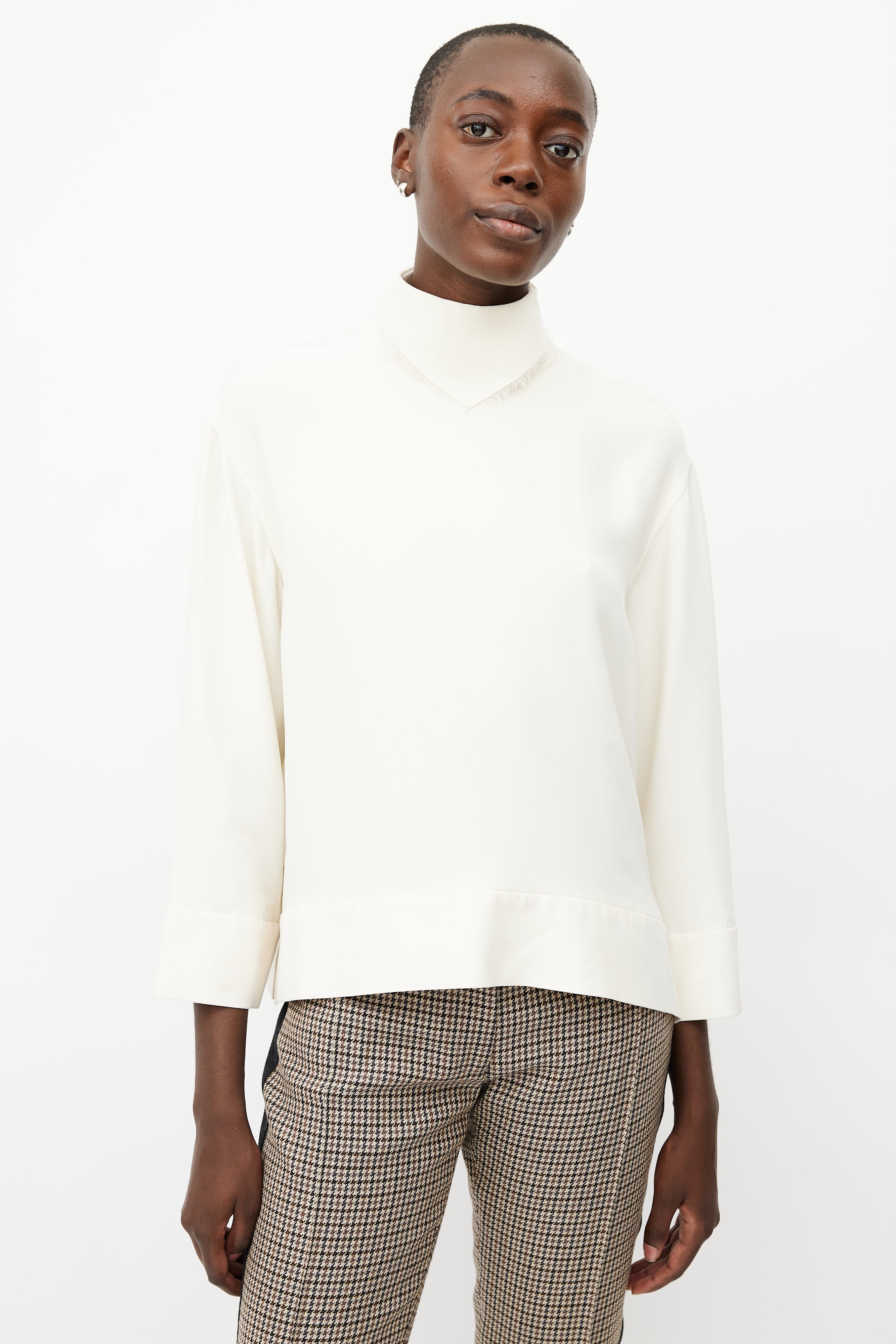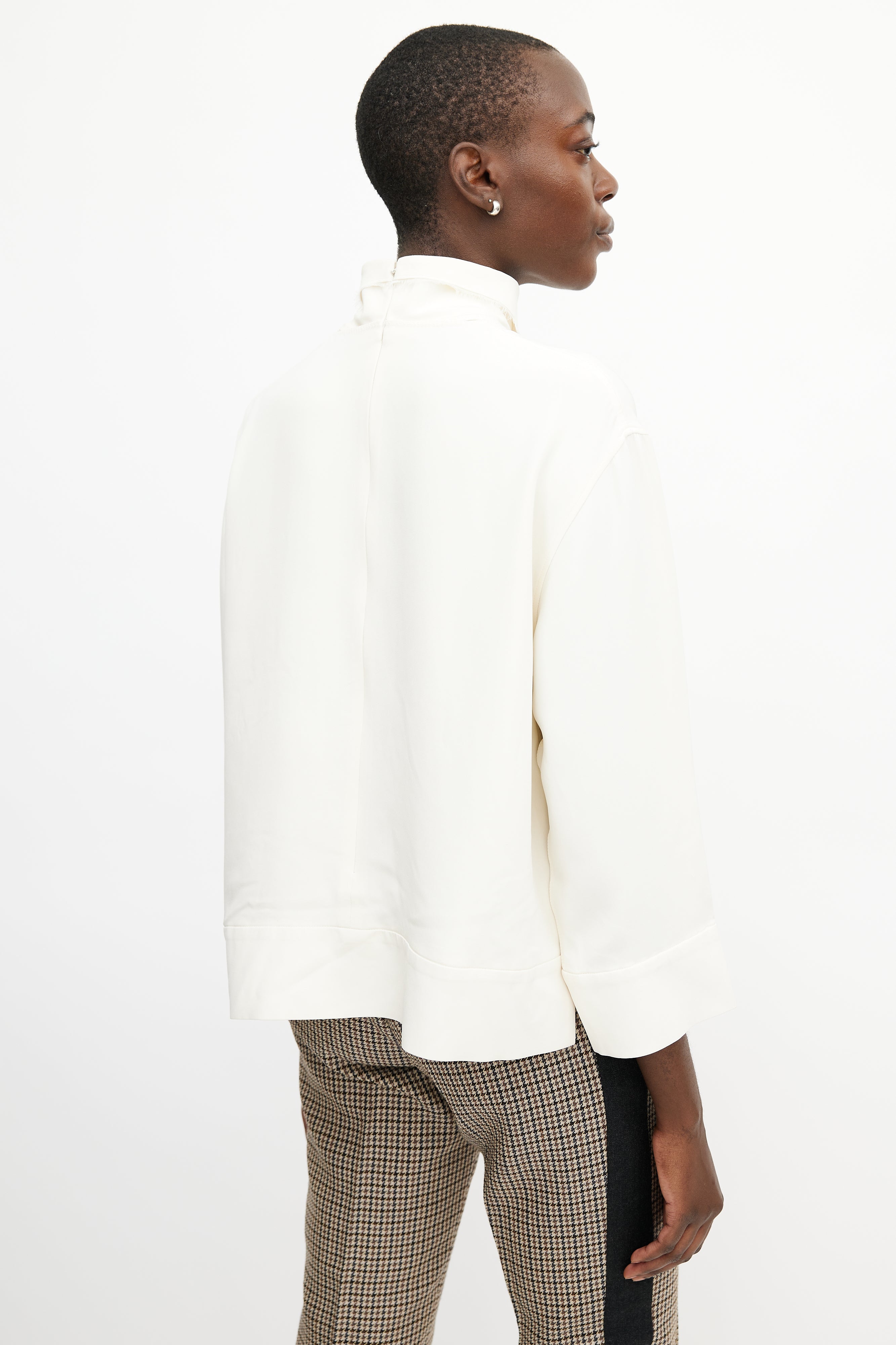 Pre-owned Celine cream silk top featuring a mock neck with bandana detail, long sleeves, and zip at back with hook and eye closure. Lined.