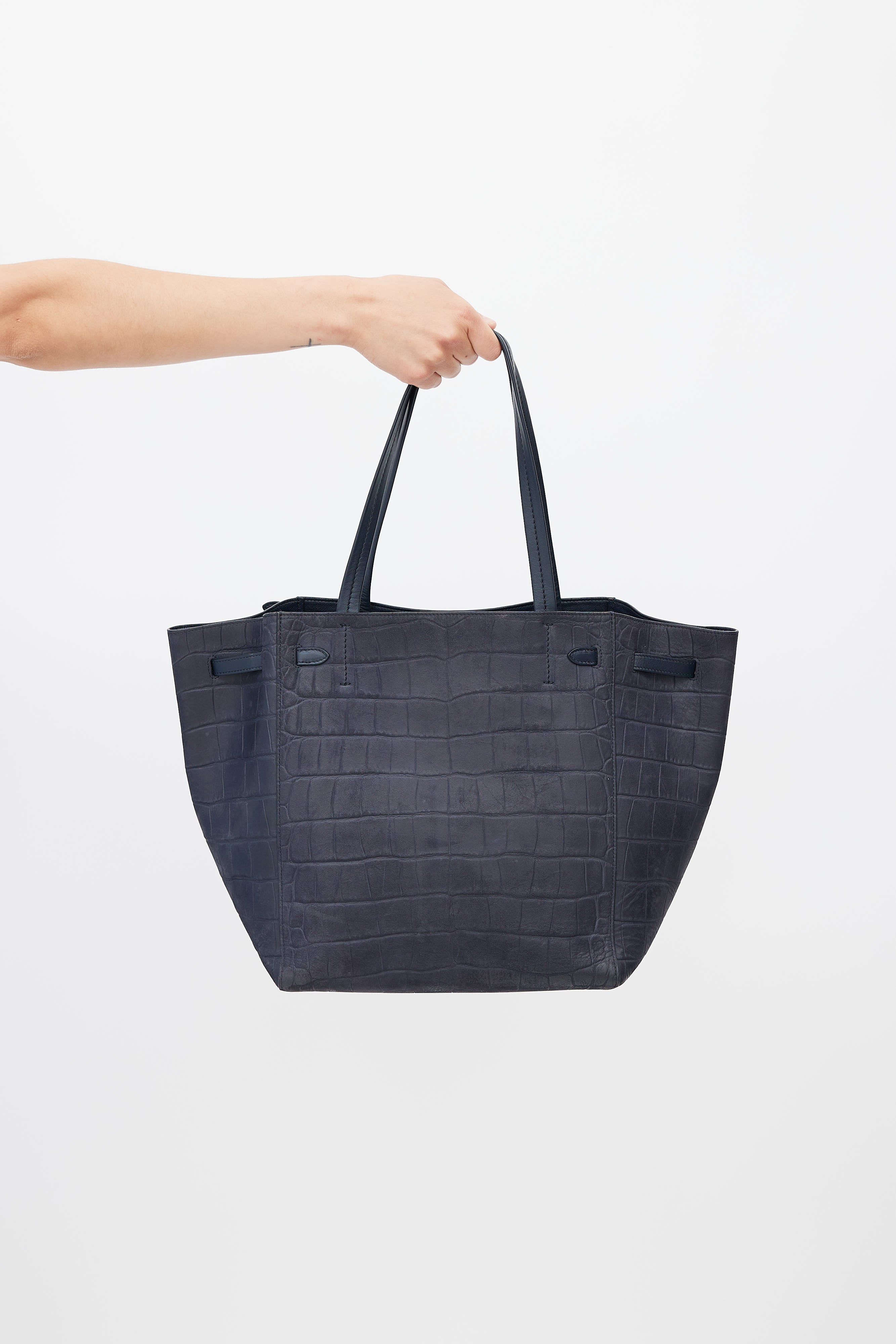 Pre-owned Celine navy Cabas Phantom leather tote bag featuring embossed crocodile print throughout, gold tone logo at front, two leather top handles, one main compartment with one zip pocket and two slip pockets, and adjustable tie belt at front. Comes with original dust bag.