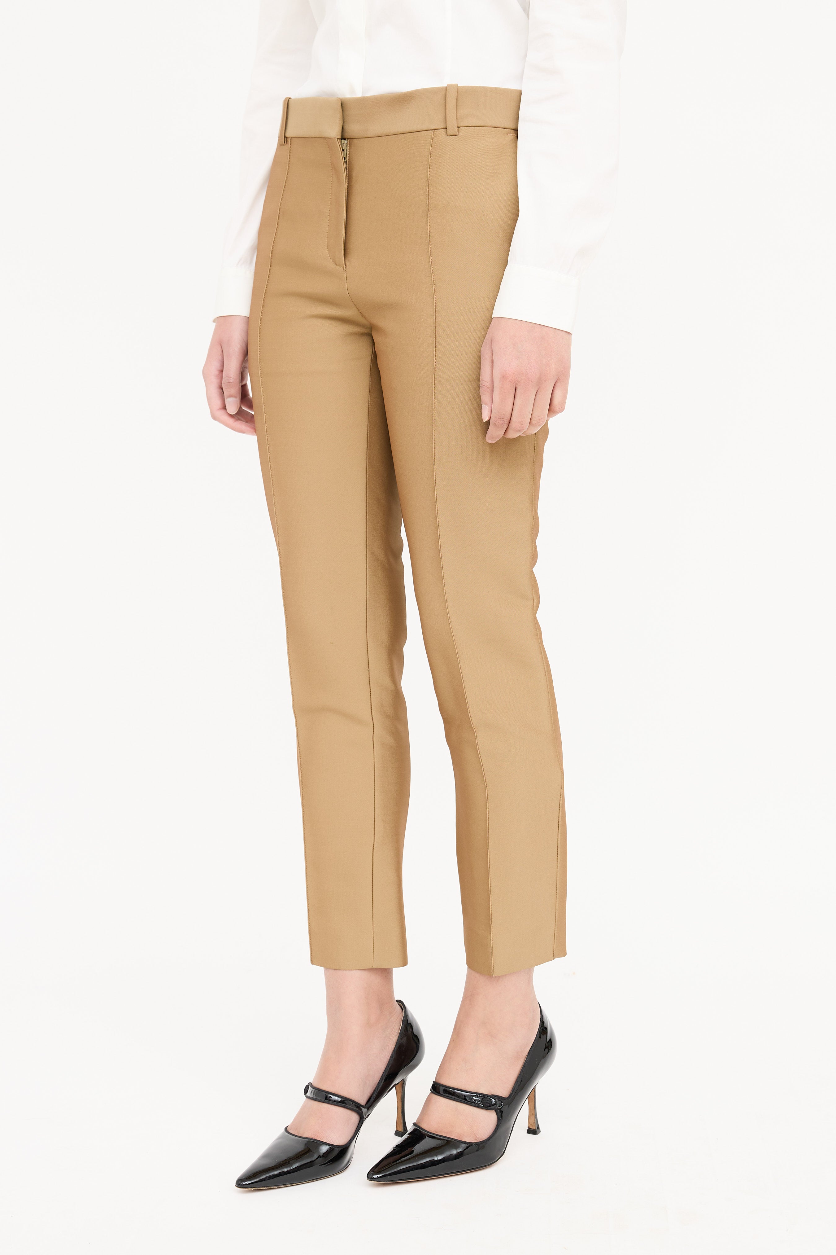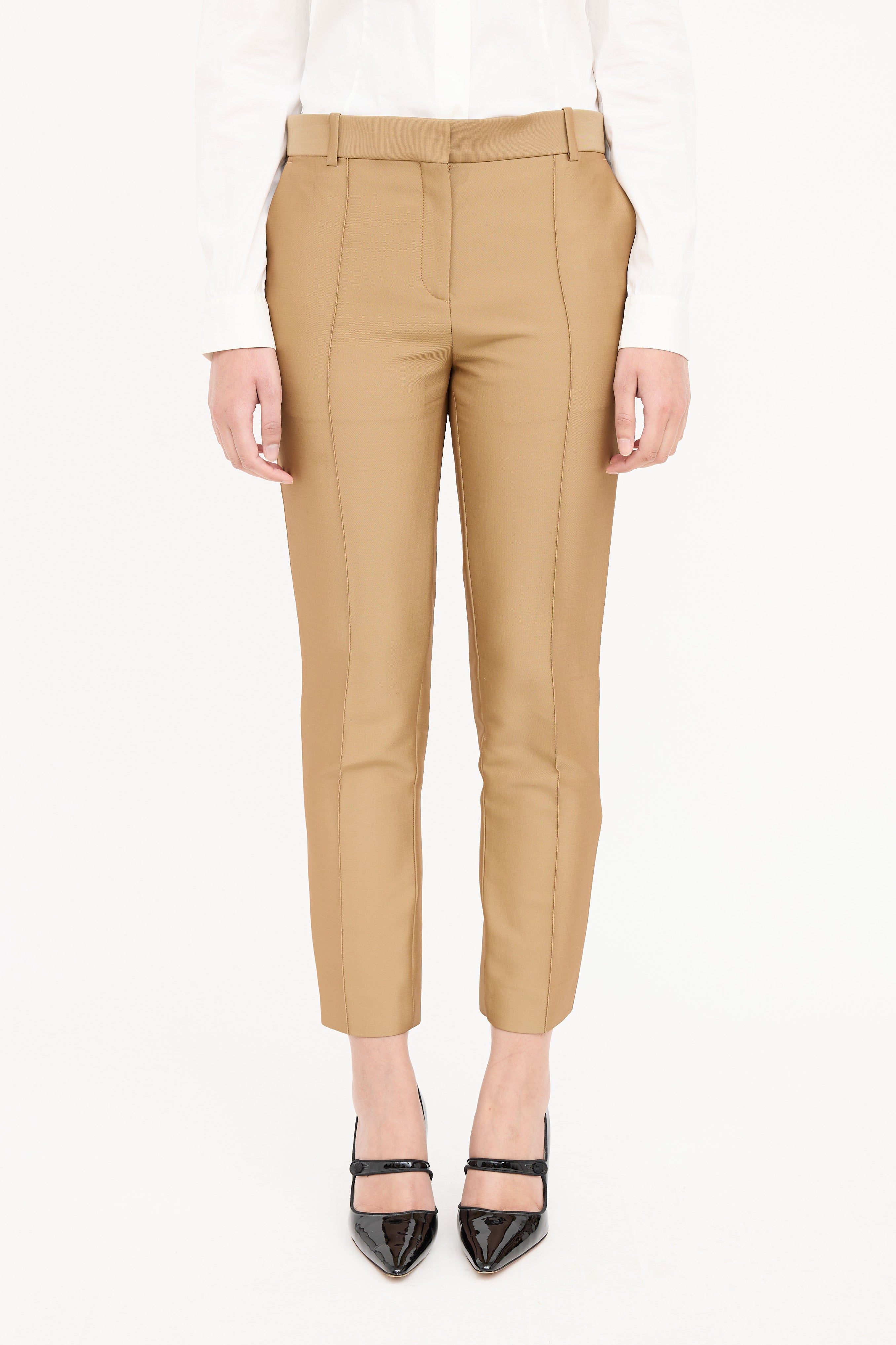 Pre-owned Celine brown pants featuring clasp and zip closure, belt loops on waist, dual slip pockets on hip, tapered leg and dual stitched slip pockets on back.