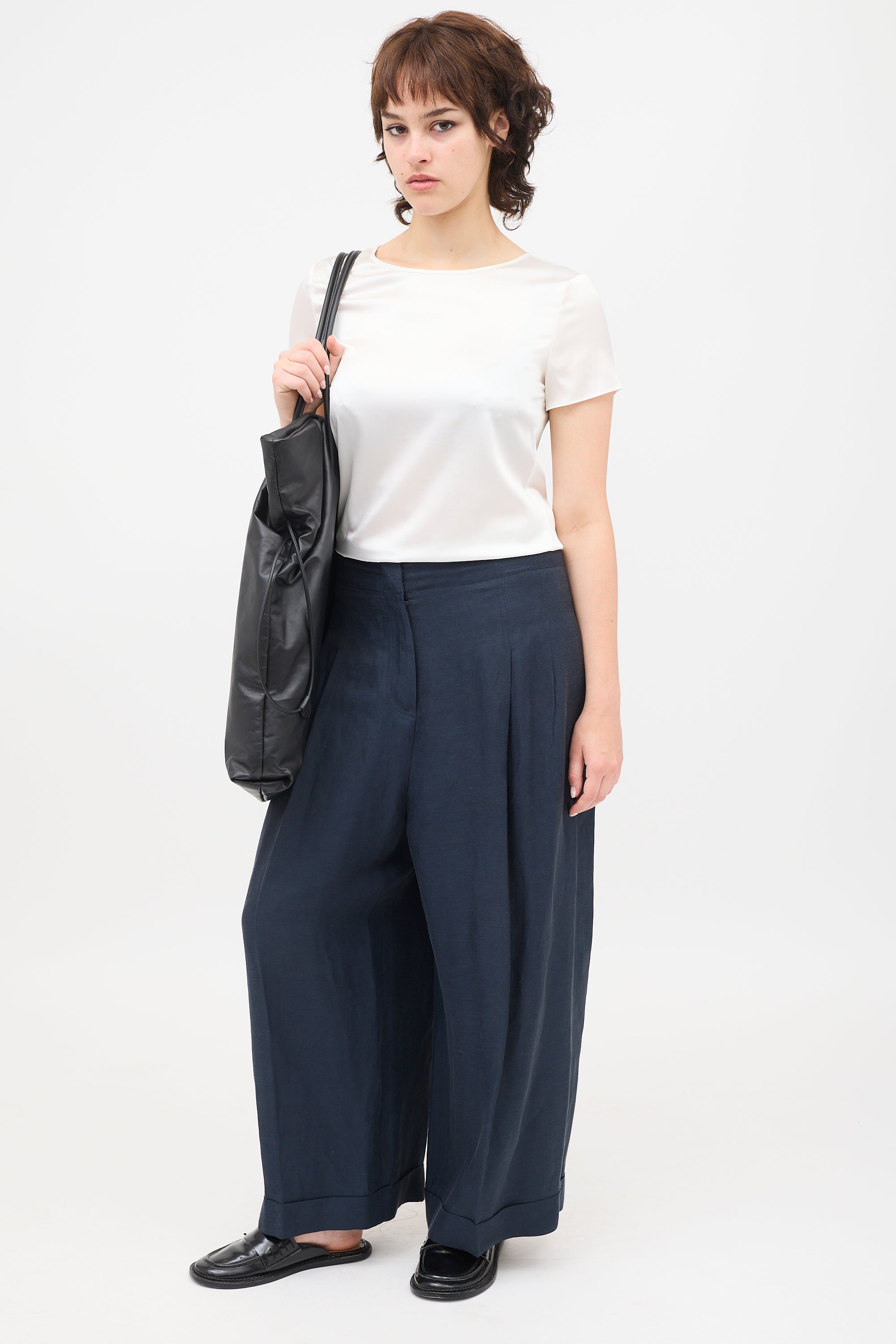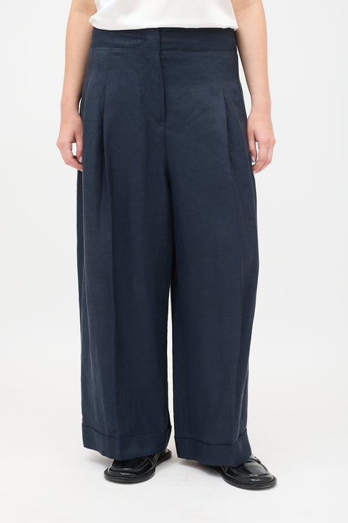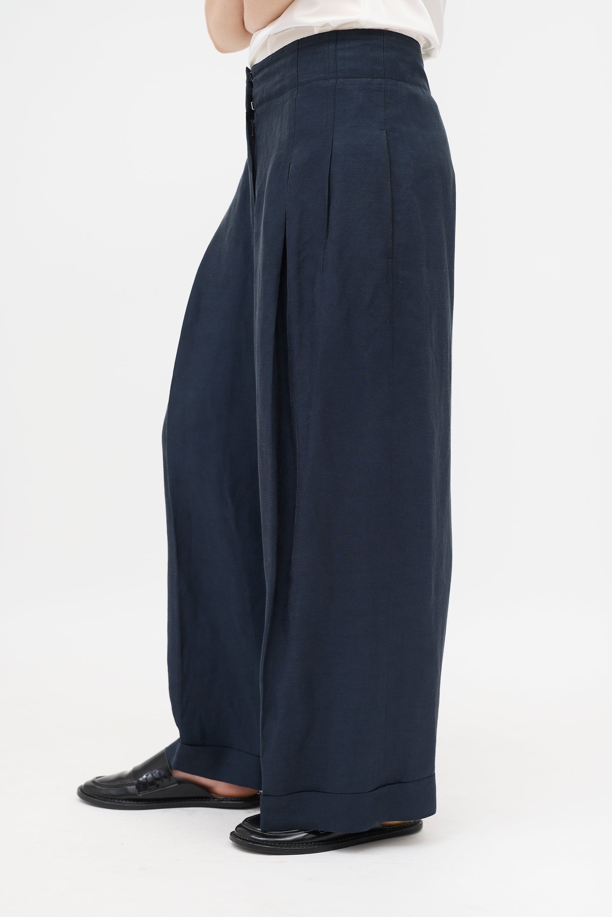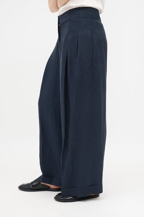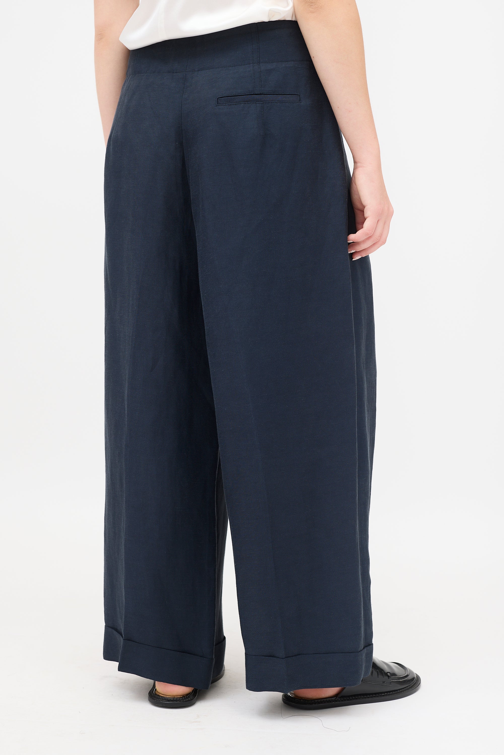 Pre-owned Celine navy trousers featuring high rise, three pocket styling, pleated front, and wide leg. Unlined. Clipped to fit model.