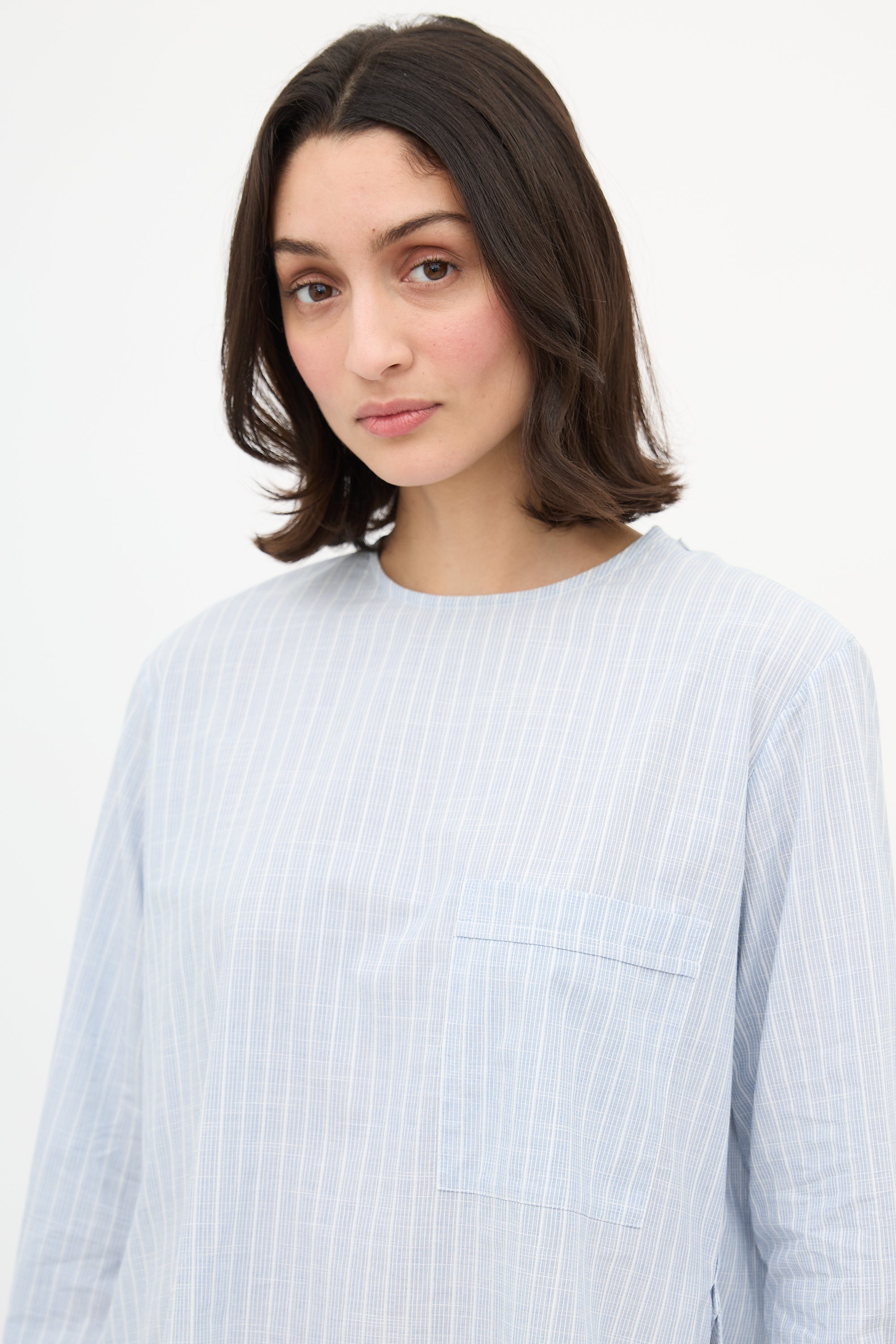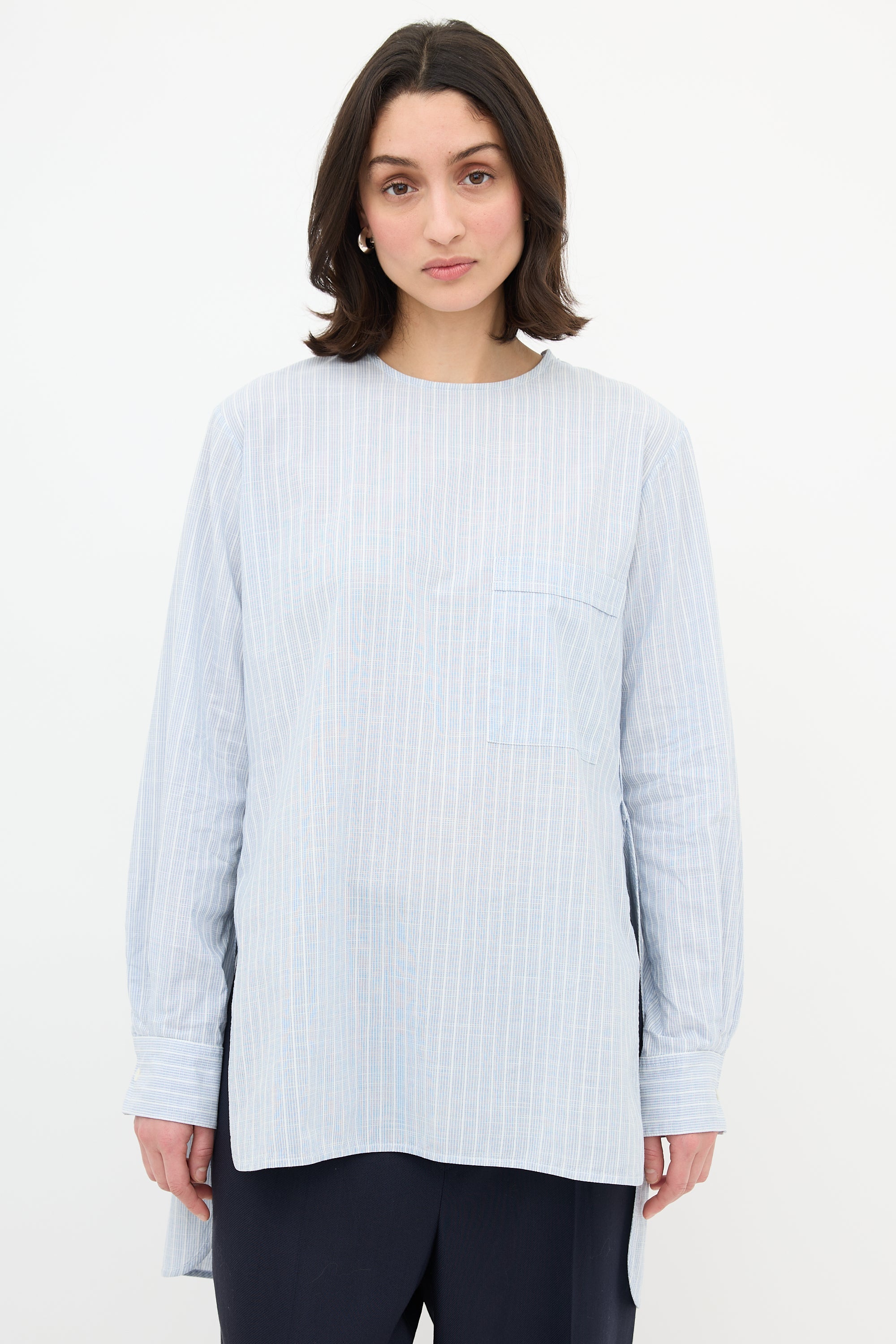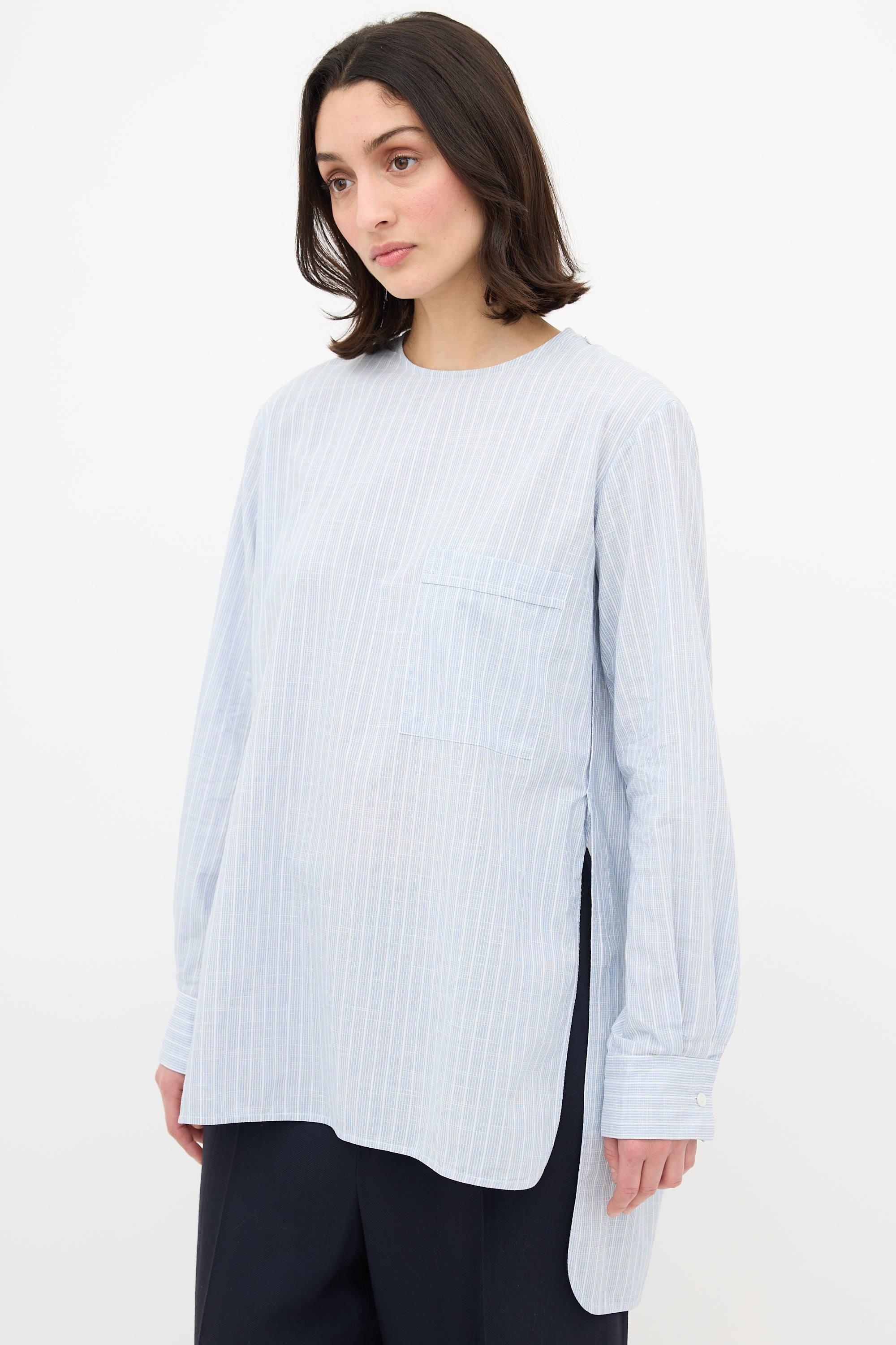 Pre-owned Celine blue and white striped blouse featuring a round neckline, concealed zip closure at shoulder, patch pocket at chest, buttoned cuffs, box pleat at back, and a high low split hem.