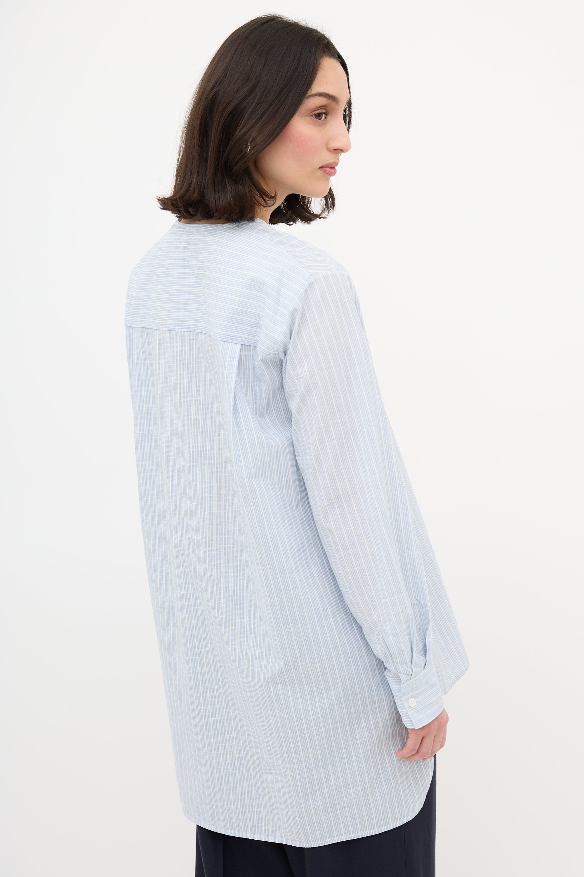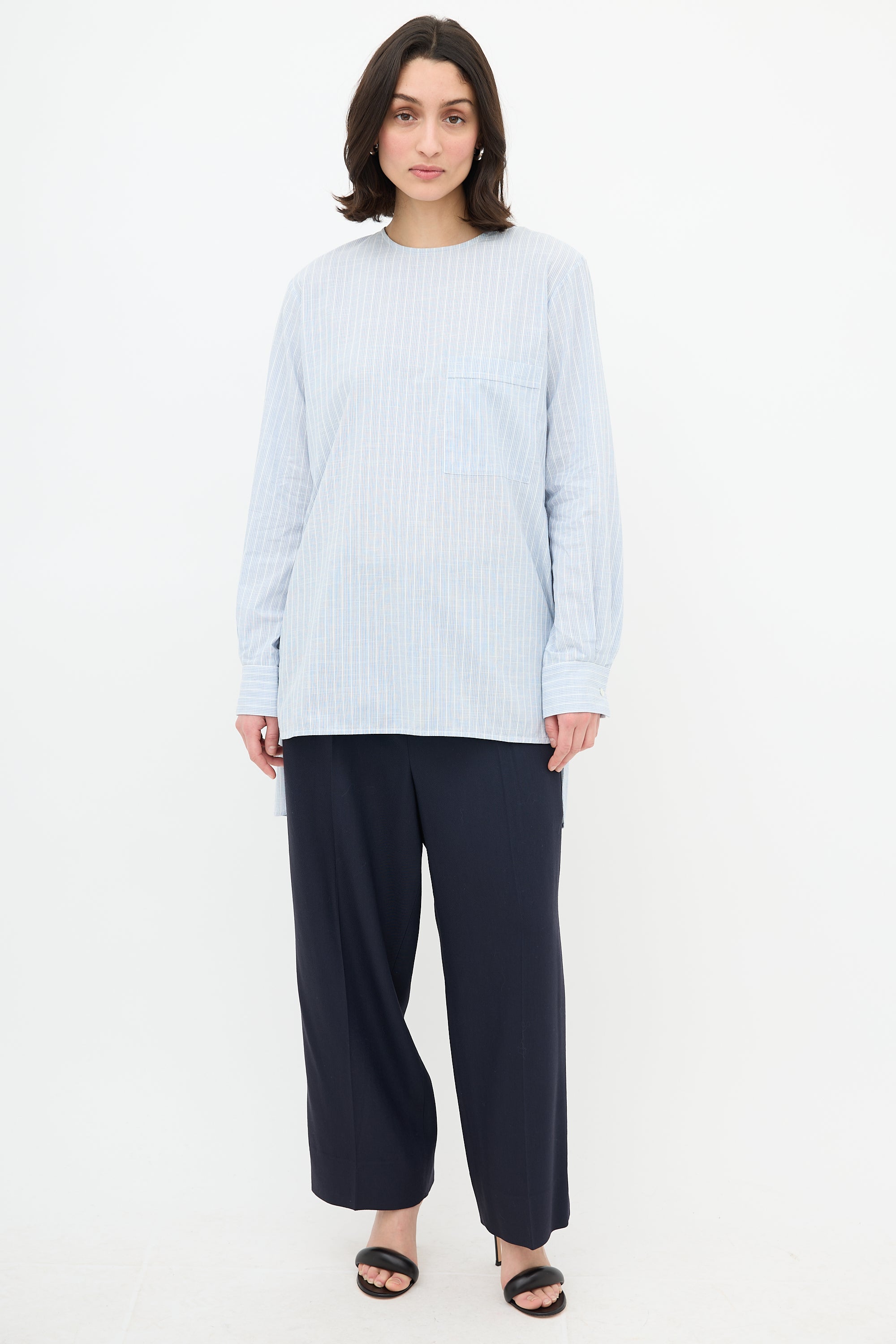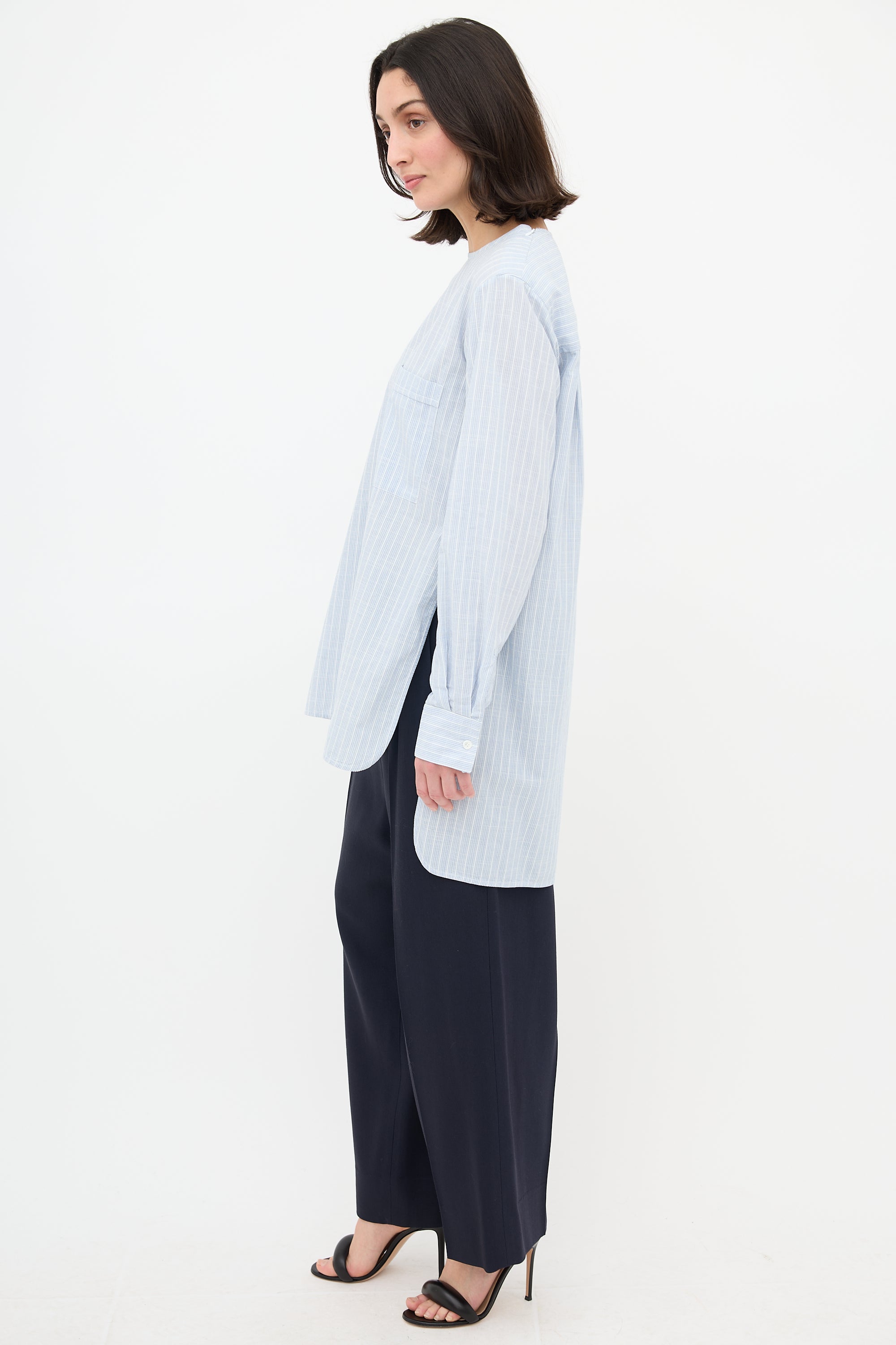 Pre-owned Celine blue and white striped blouse featuring a round neckline, concealed zip closure at shoulder, patch pocket at chest, buttoned cuffs, box pleat at back, and a high low split hem.