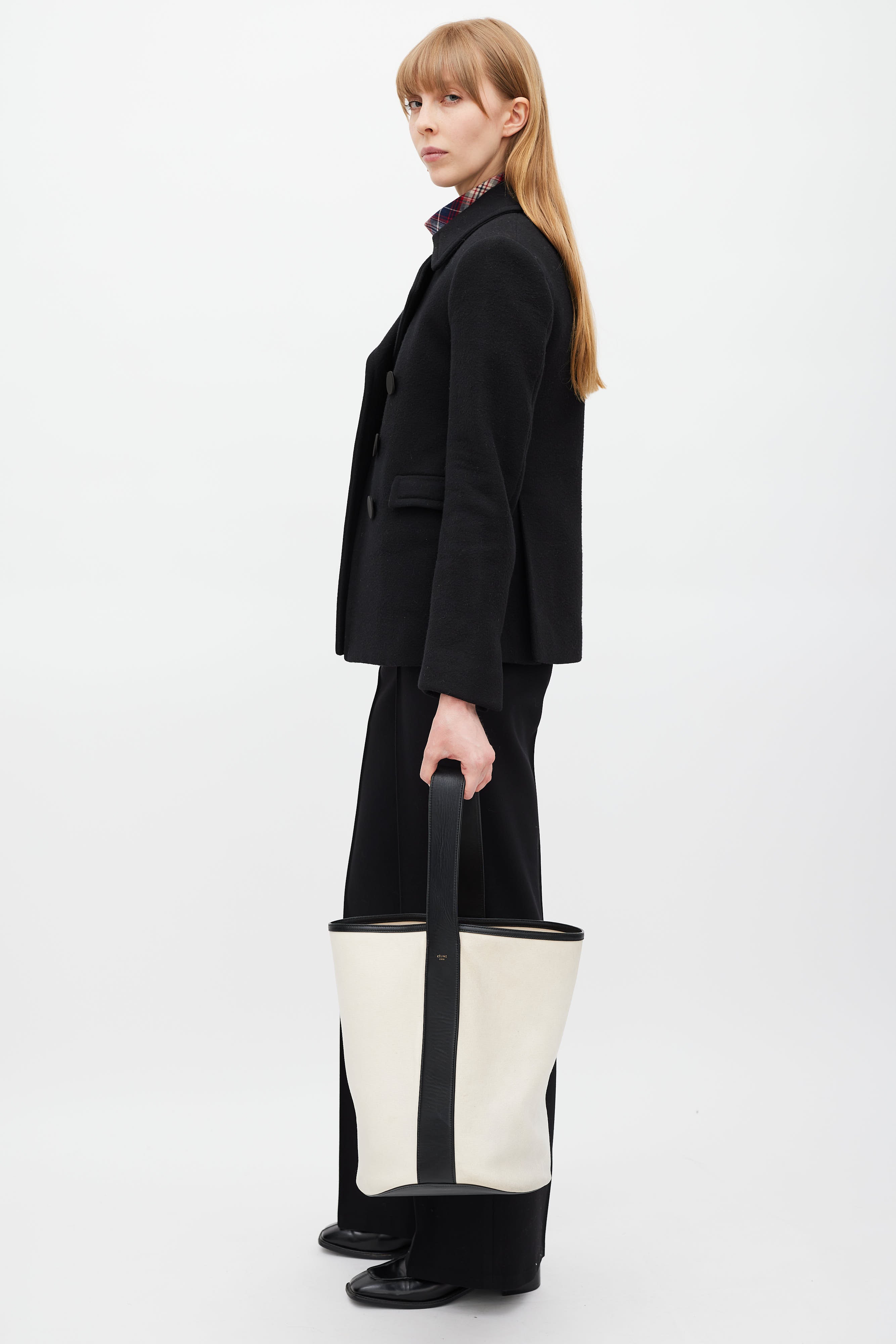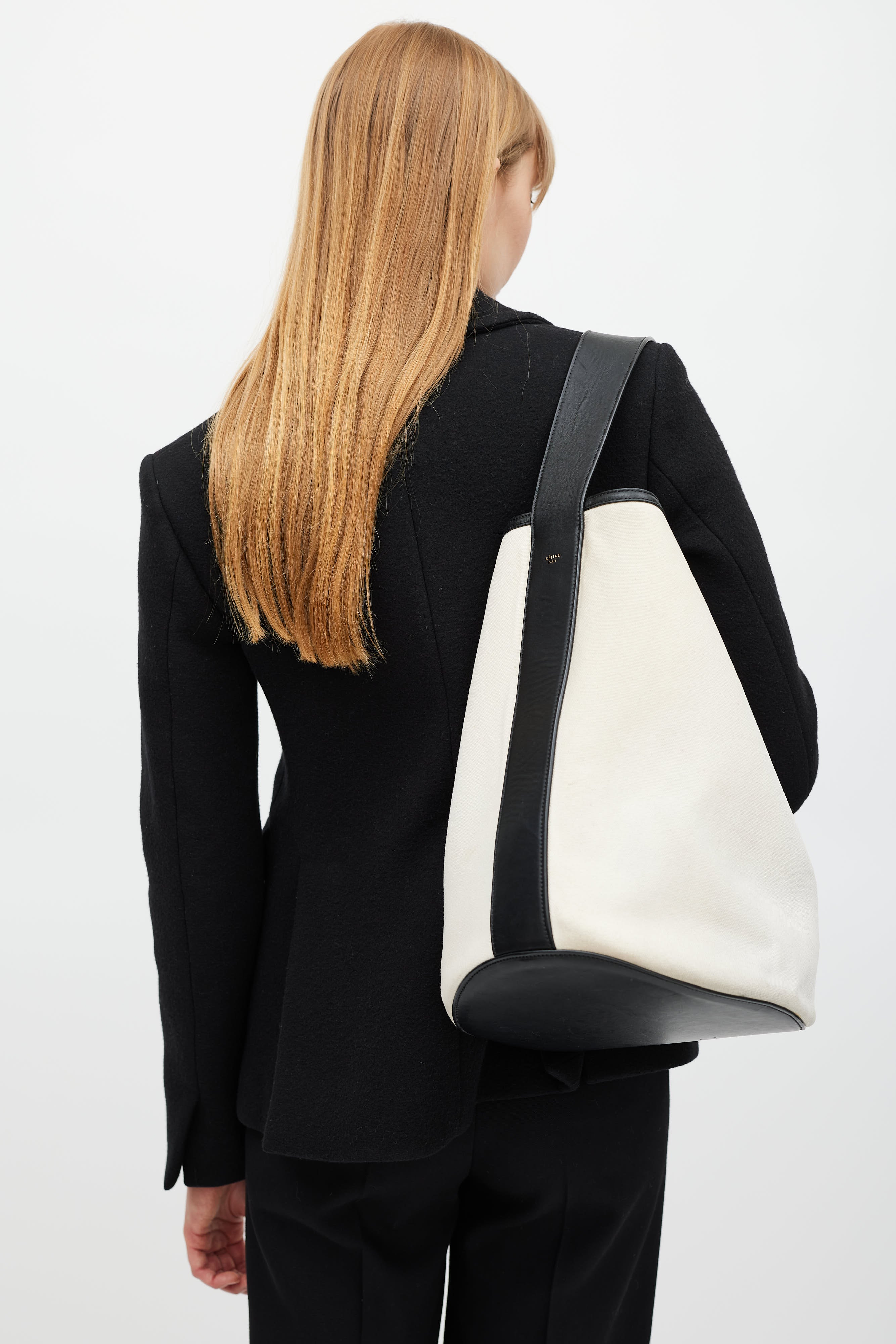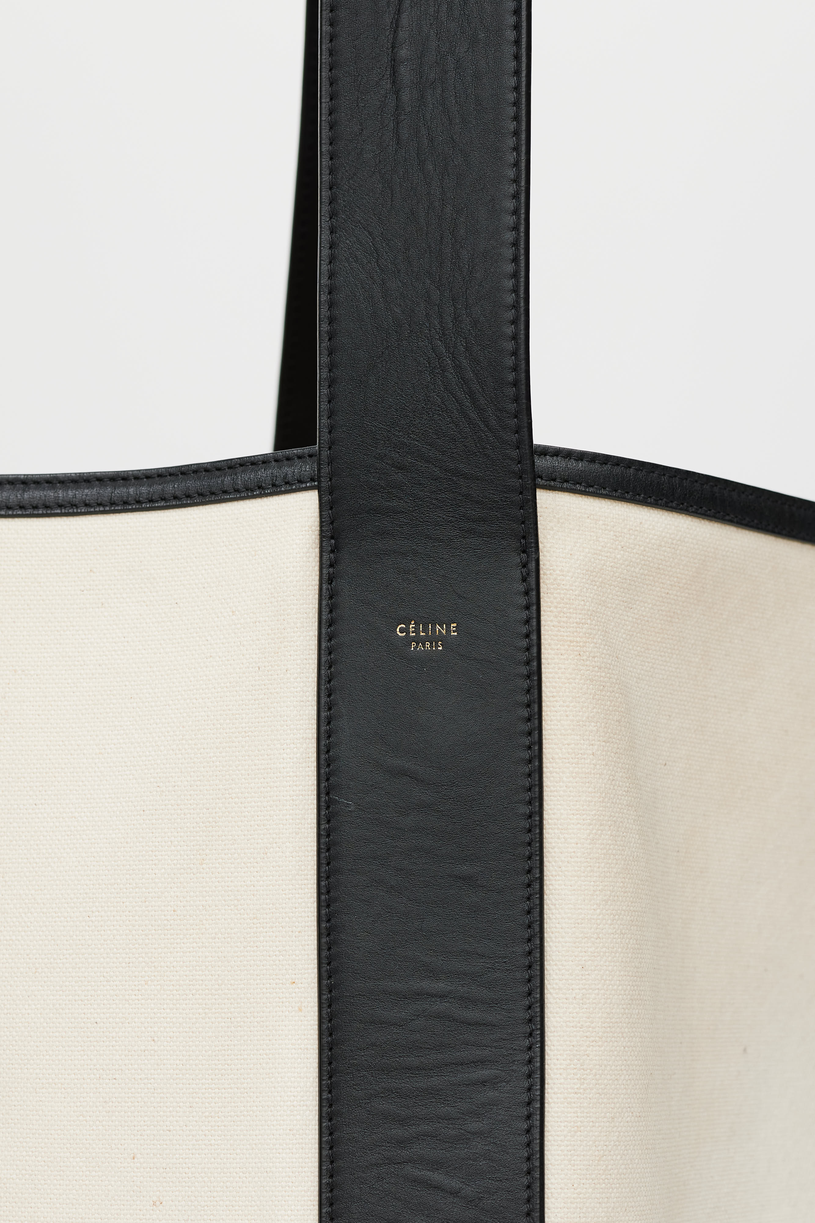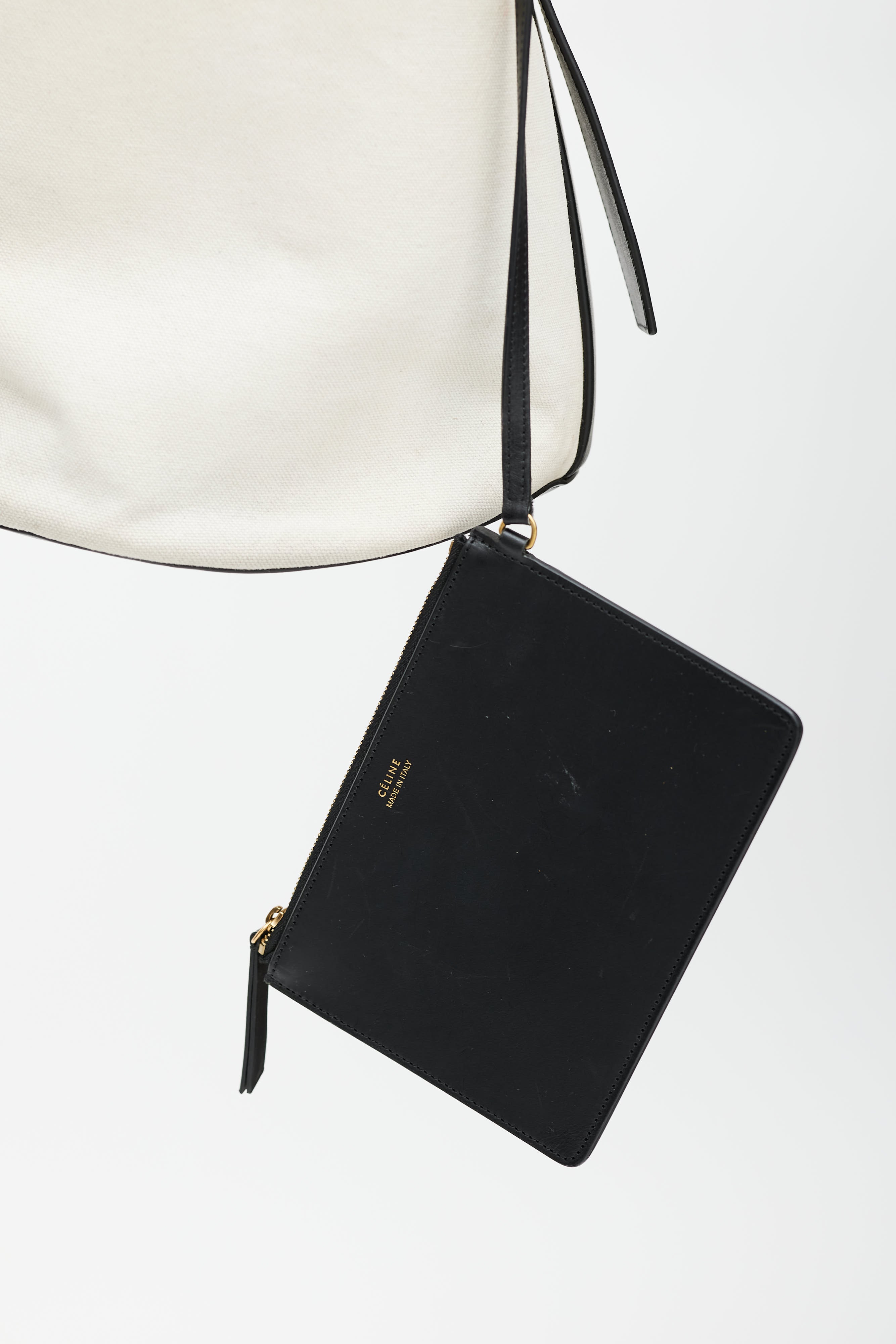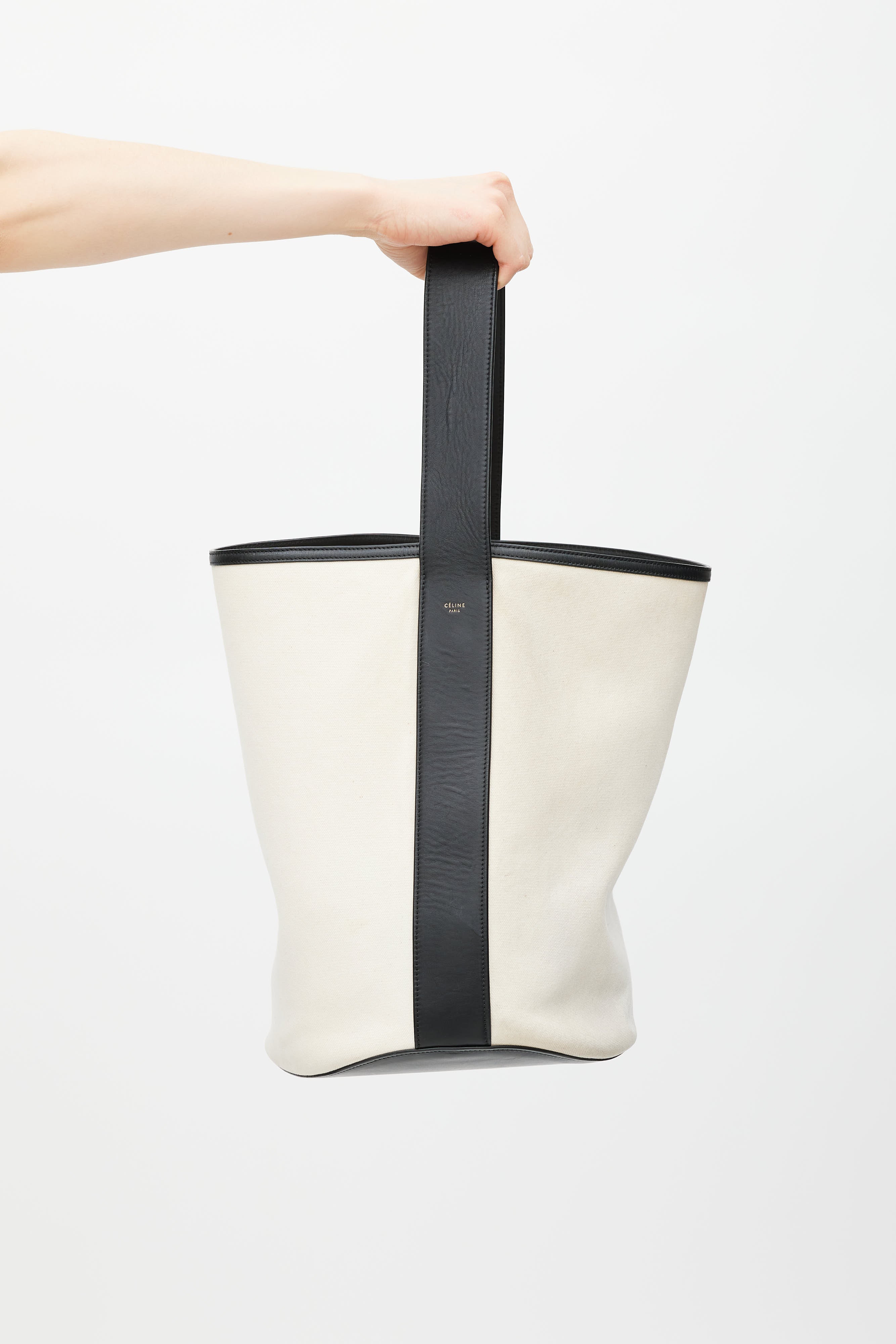 Pre-owned Celine Resort 2015 white washed canvas and black calfskin bucket bag featuring a black adjustable top handle, leather trim throughout, embossed logo at side, one main compartment, and detachable inner zip pouch. Phoebe Philo era design.
