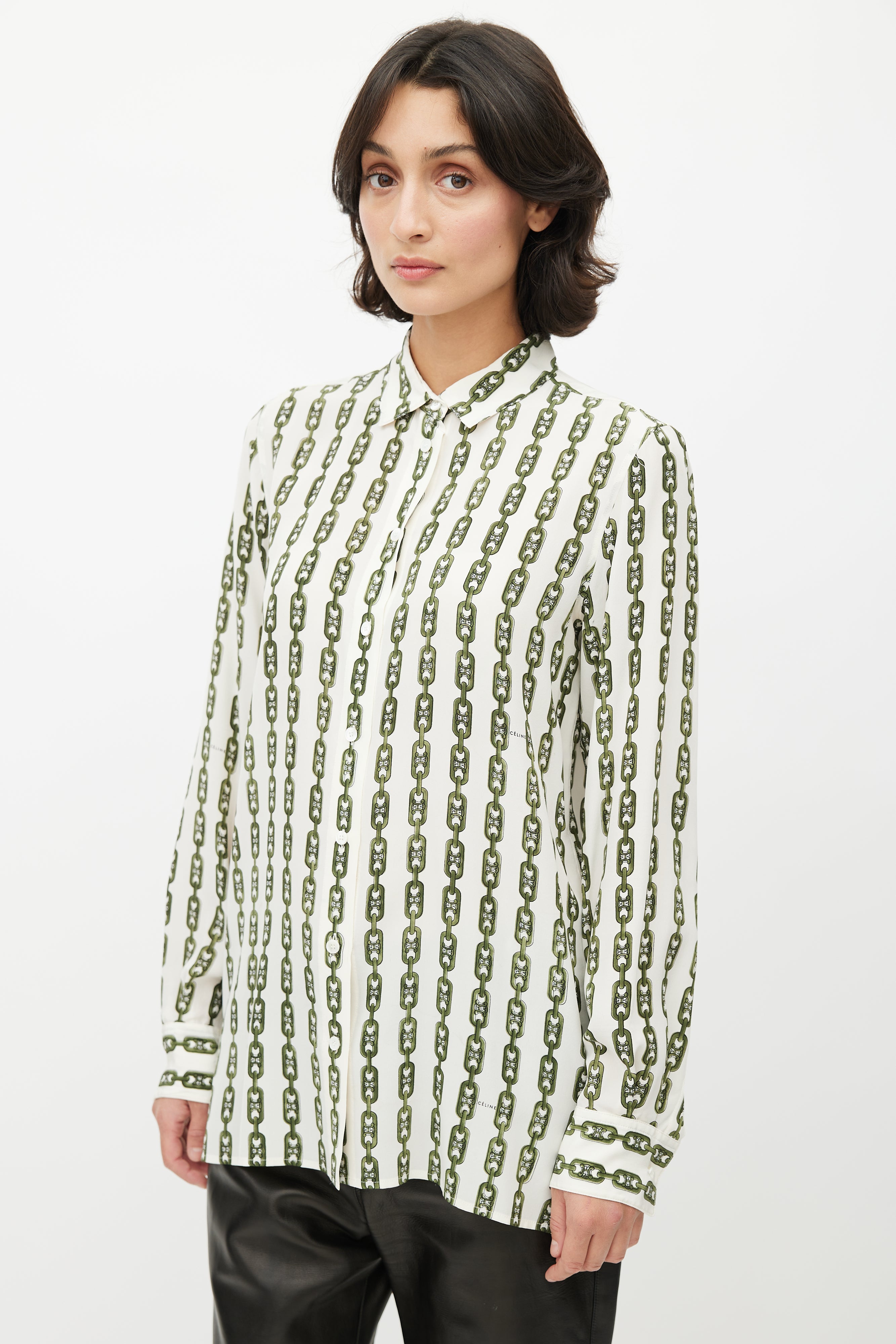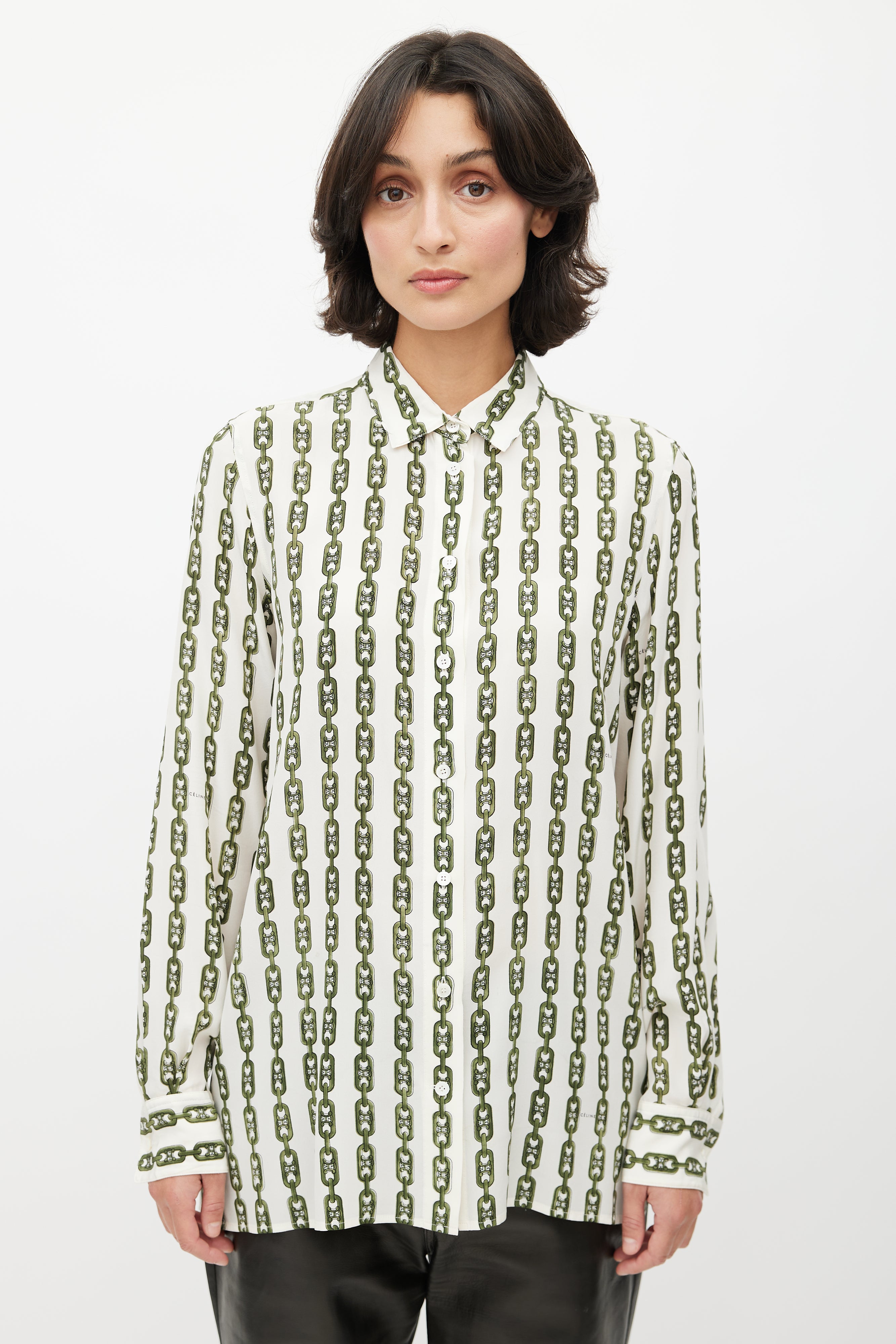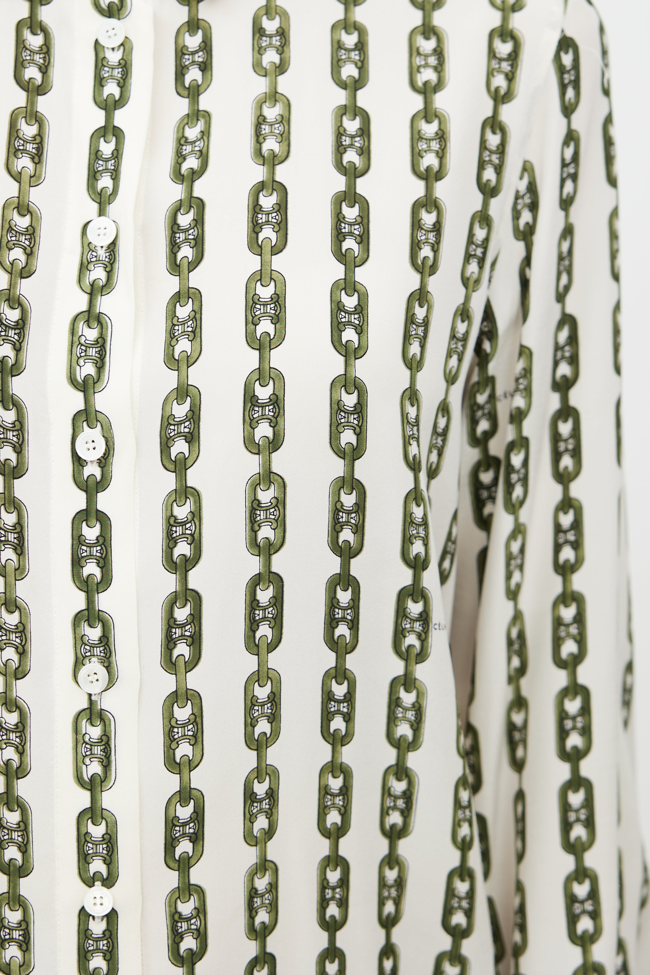 Pre-owned Celine cream shirt featuring green chain print with Triomphe monogram, classic collar, button up front, and buttoned cuffs. Phoebe Philo era design.