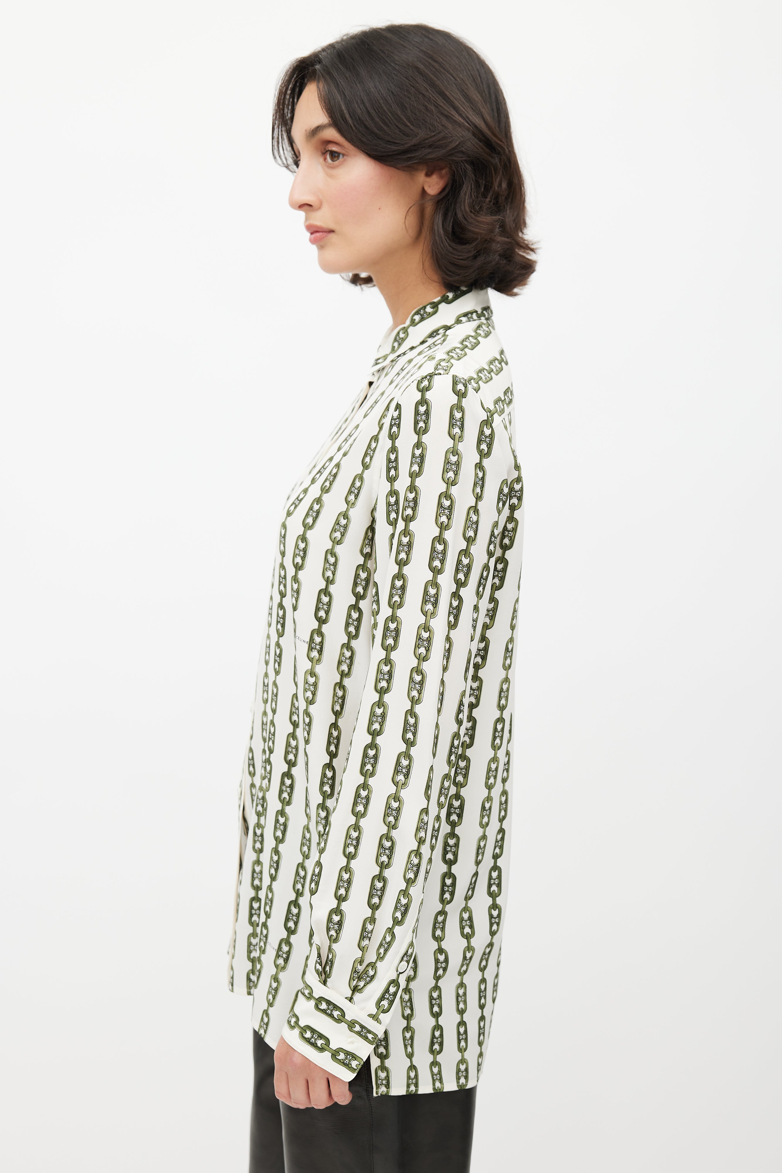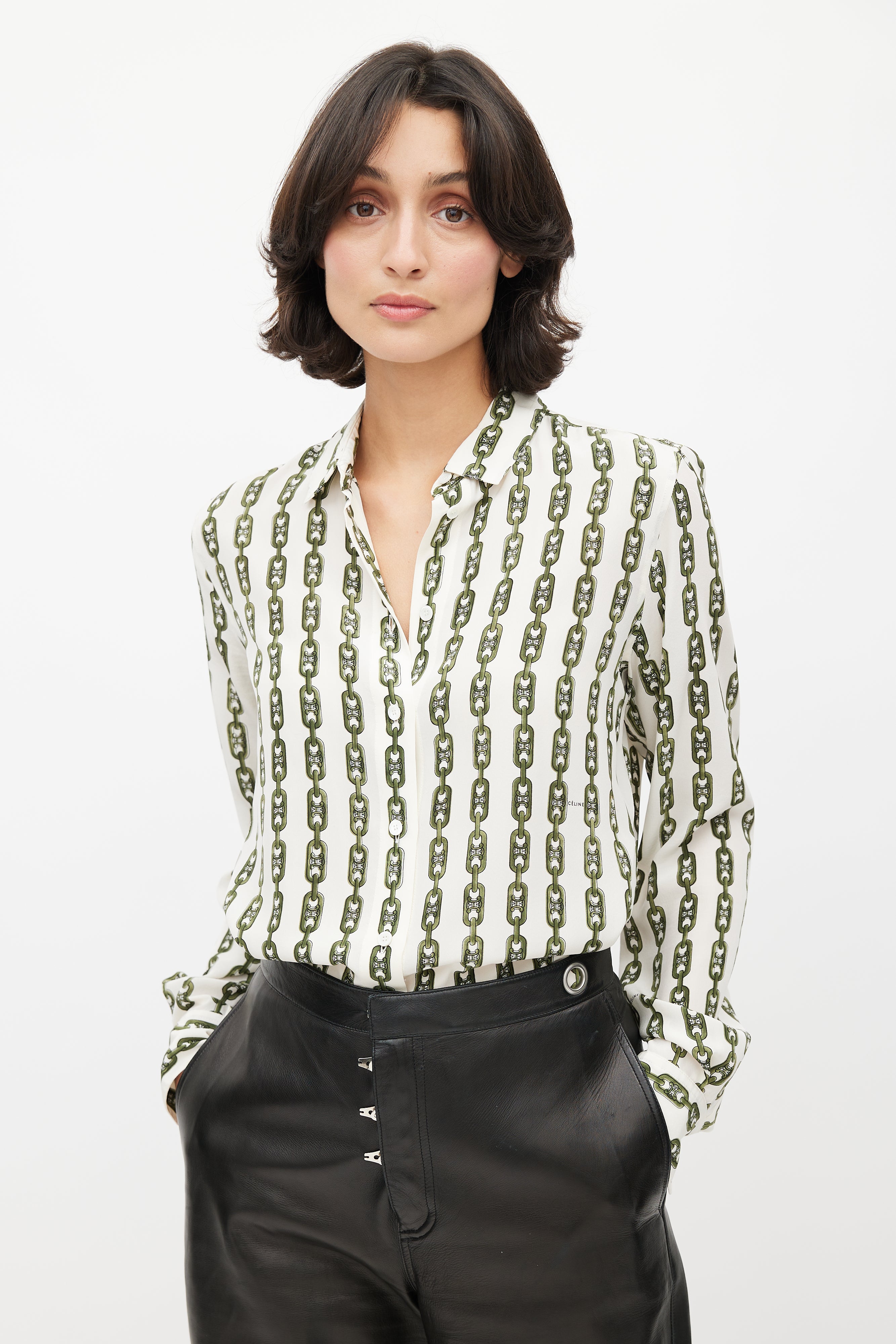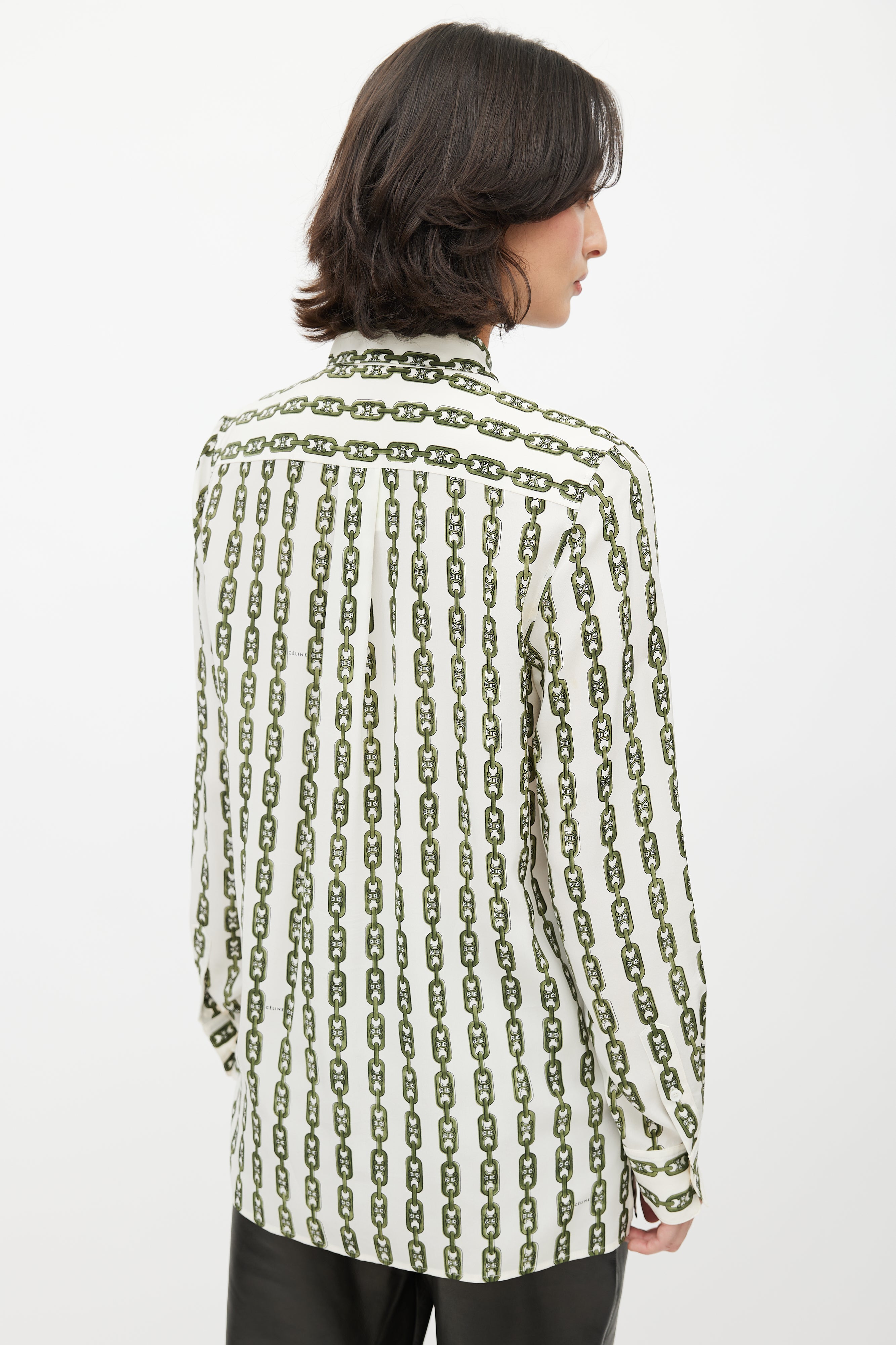 Pre-owned Celine cream shirt featuring green chain print with Triomphe monogram, classic collar, button up front, and buttoned cuffs. Phoebe Philo era design.
