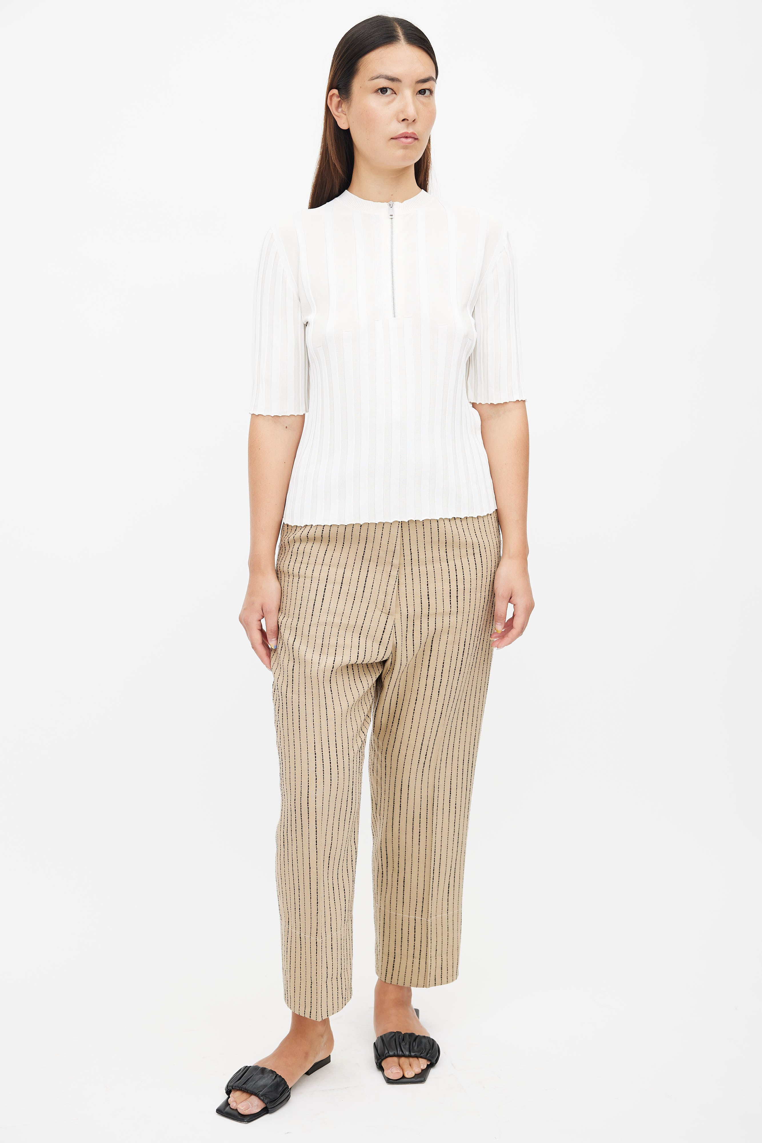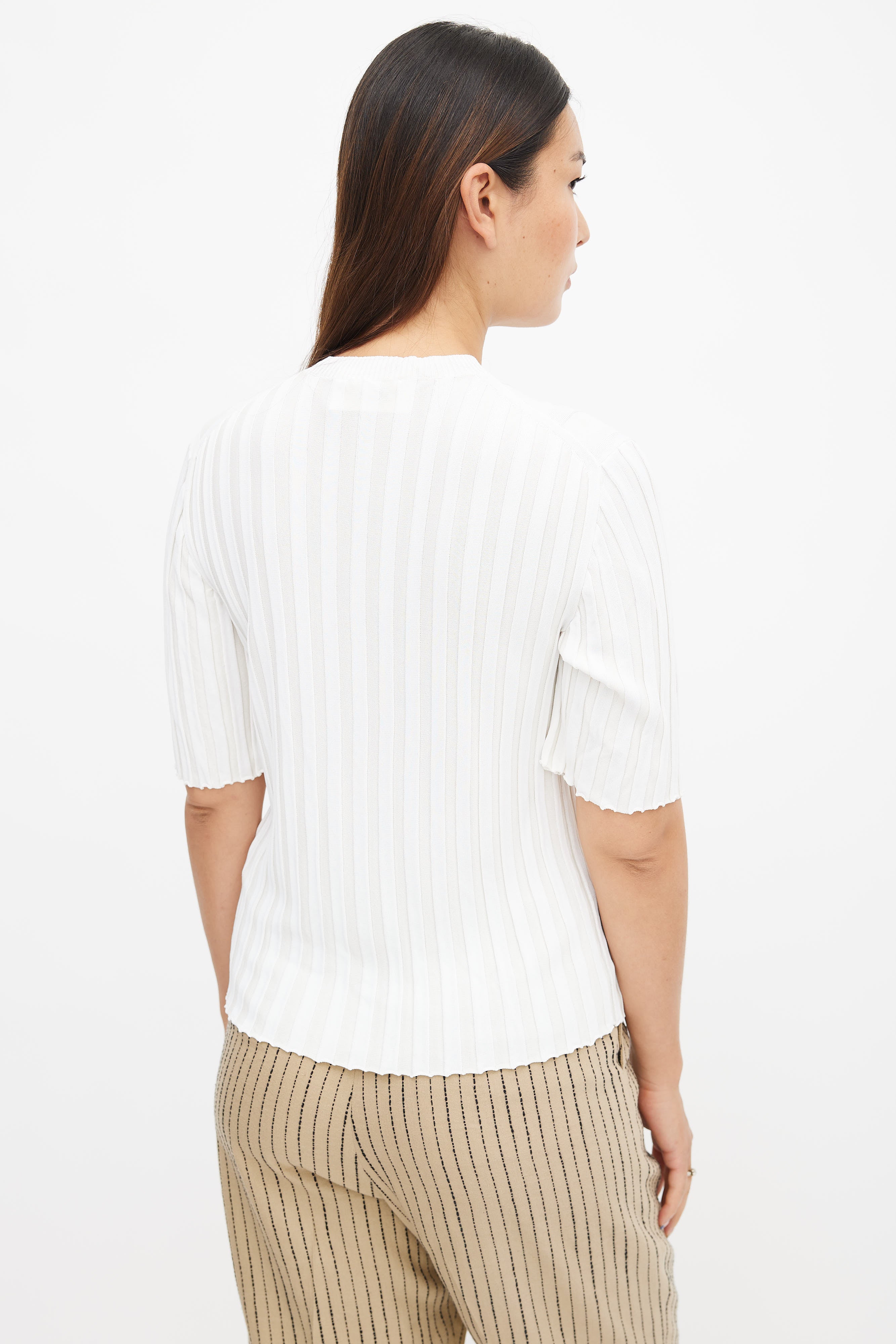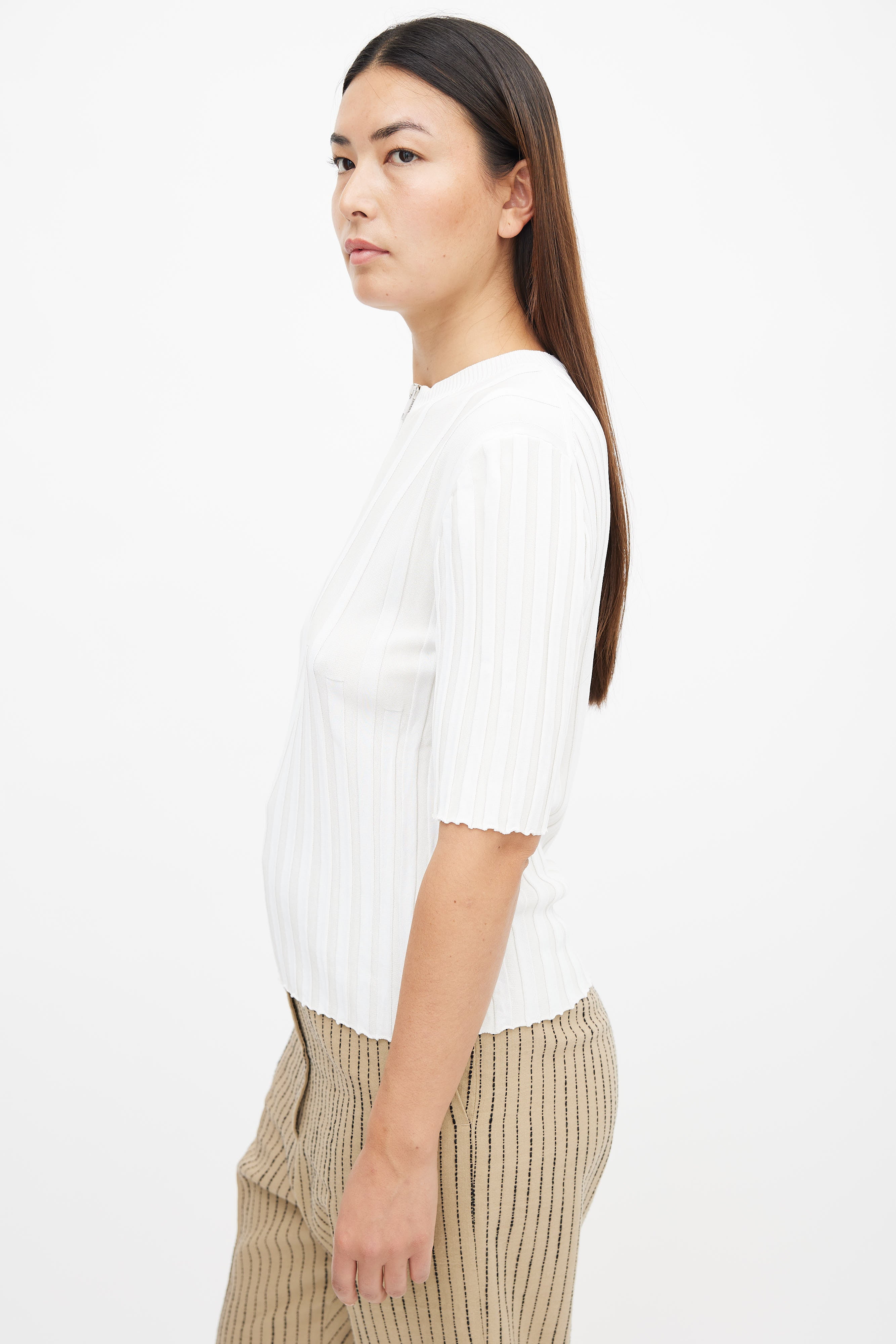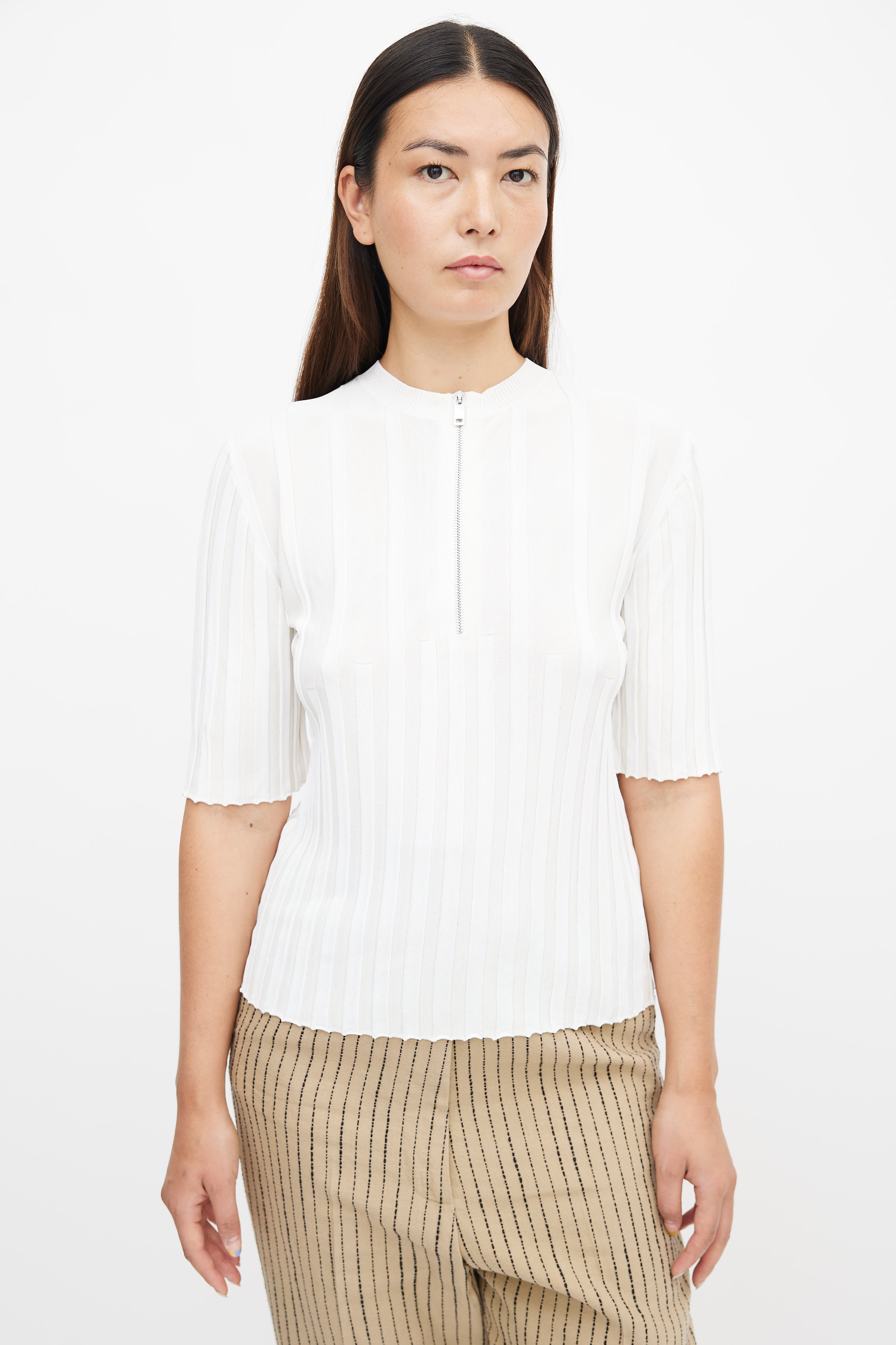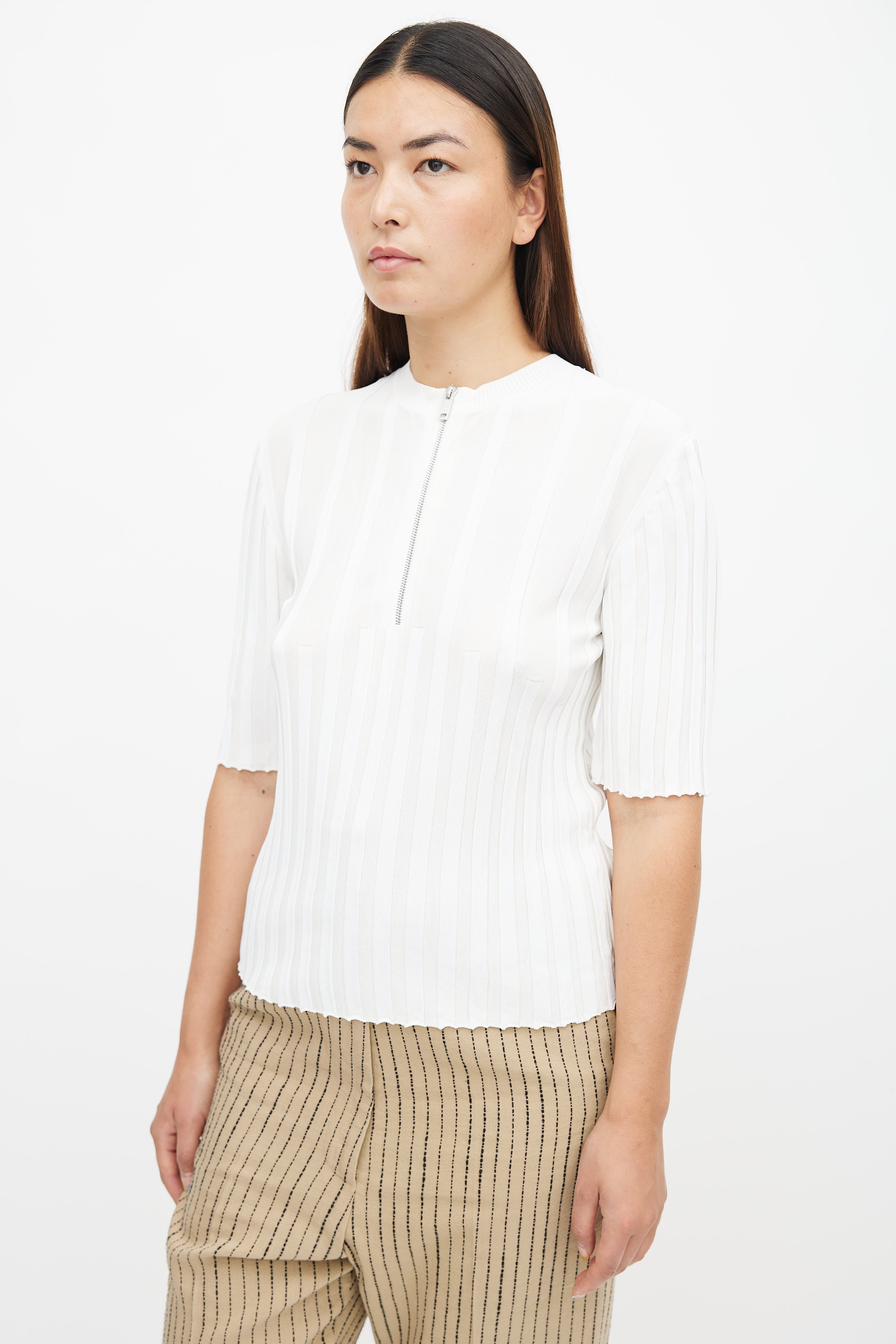 Pre-owned Céline white semi sheer top featuring half zip closure at front, crew neckline, three quarter sleeves, and ribbed knit.