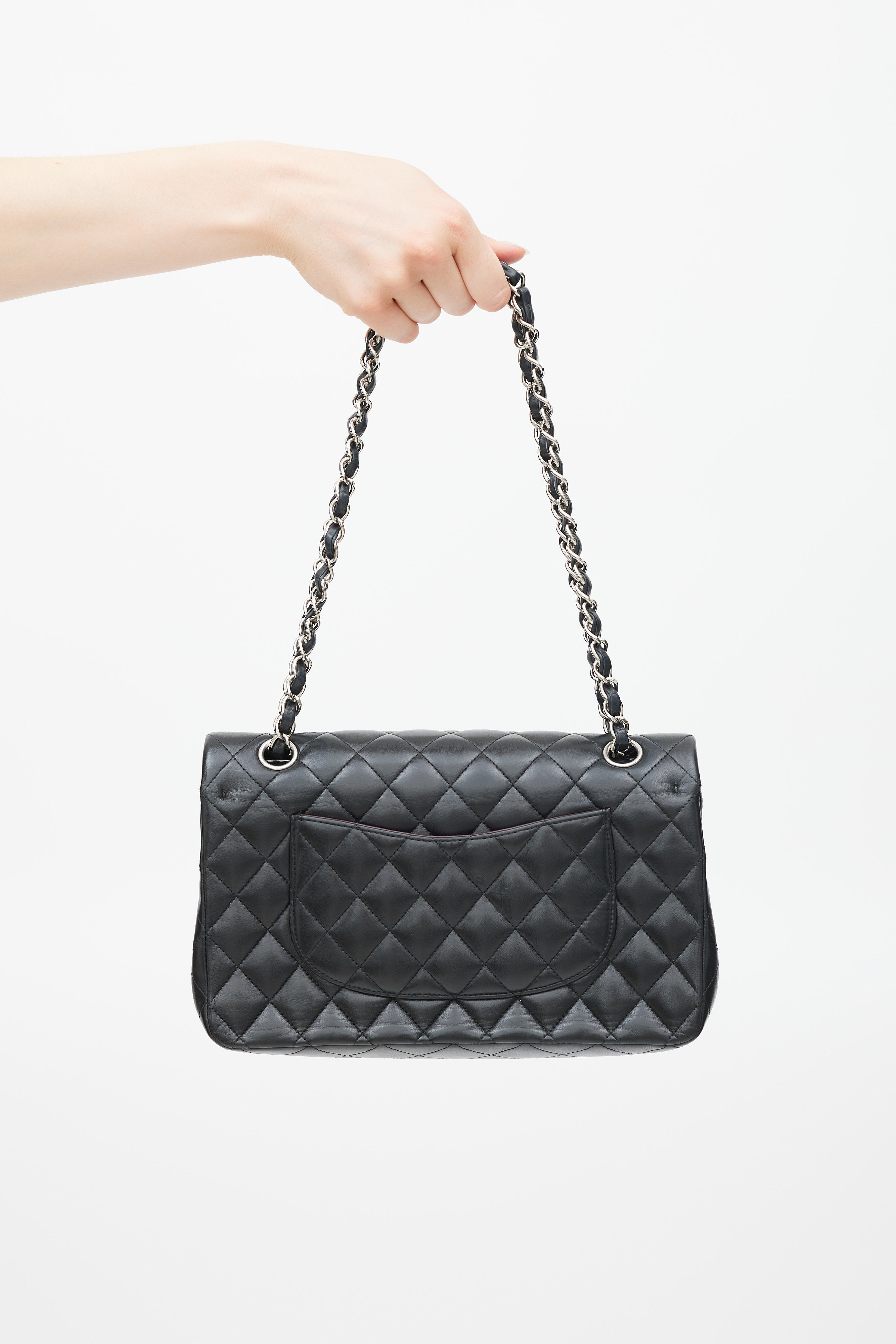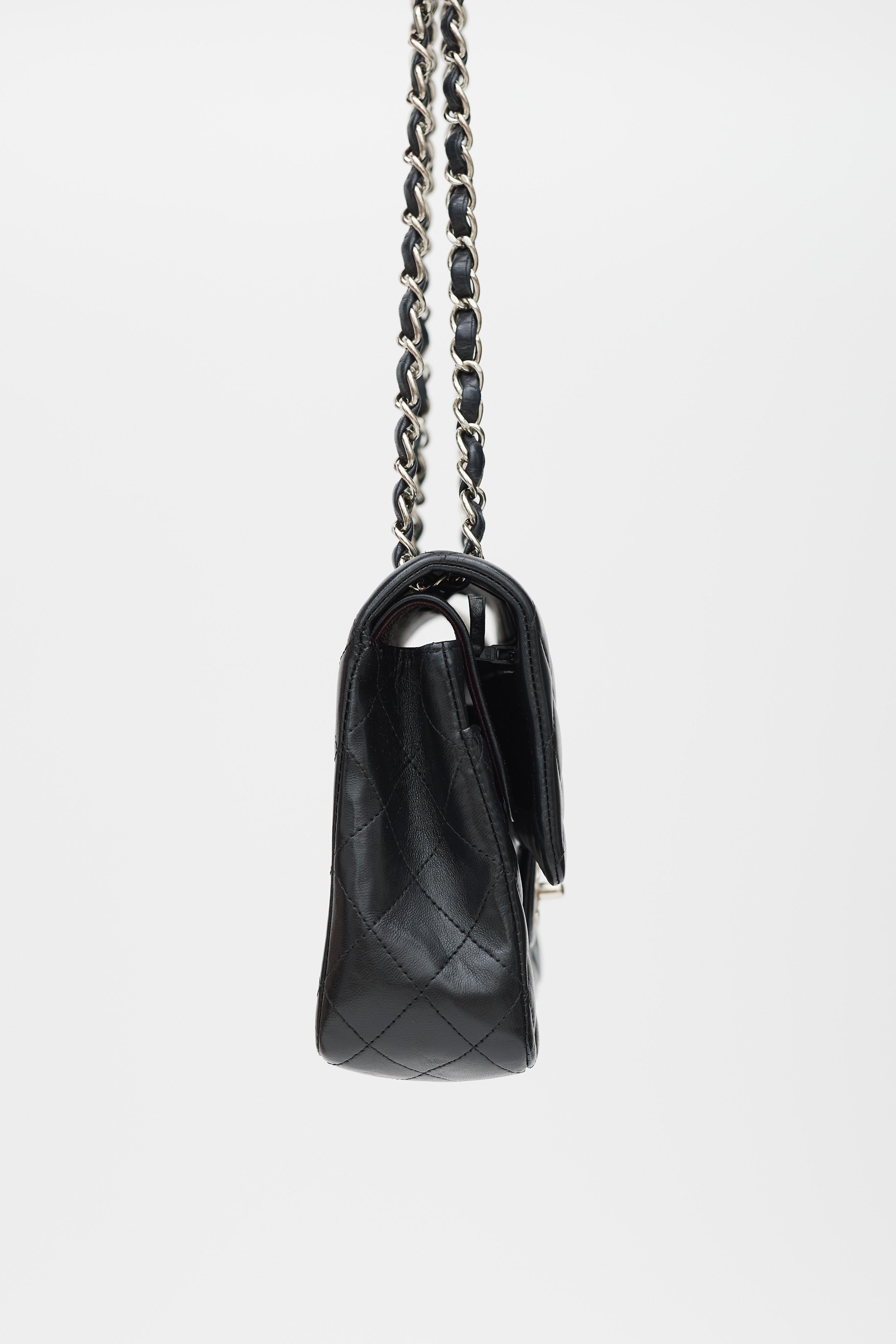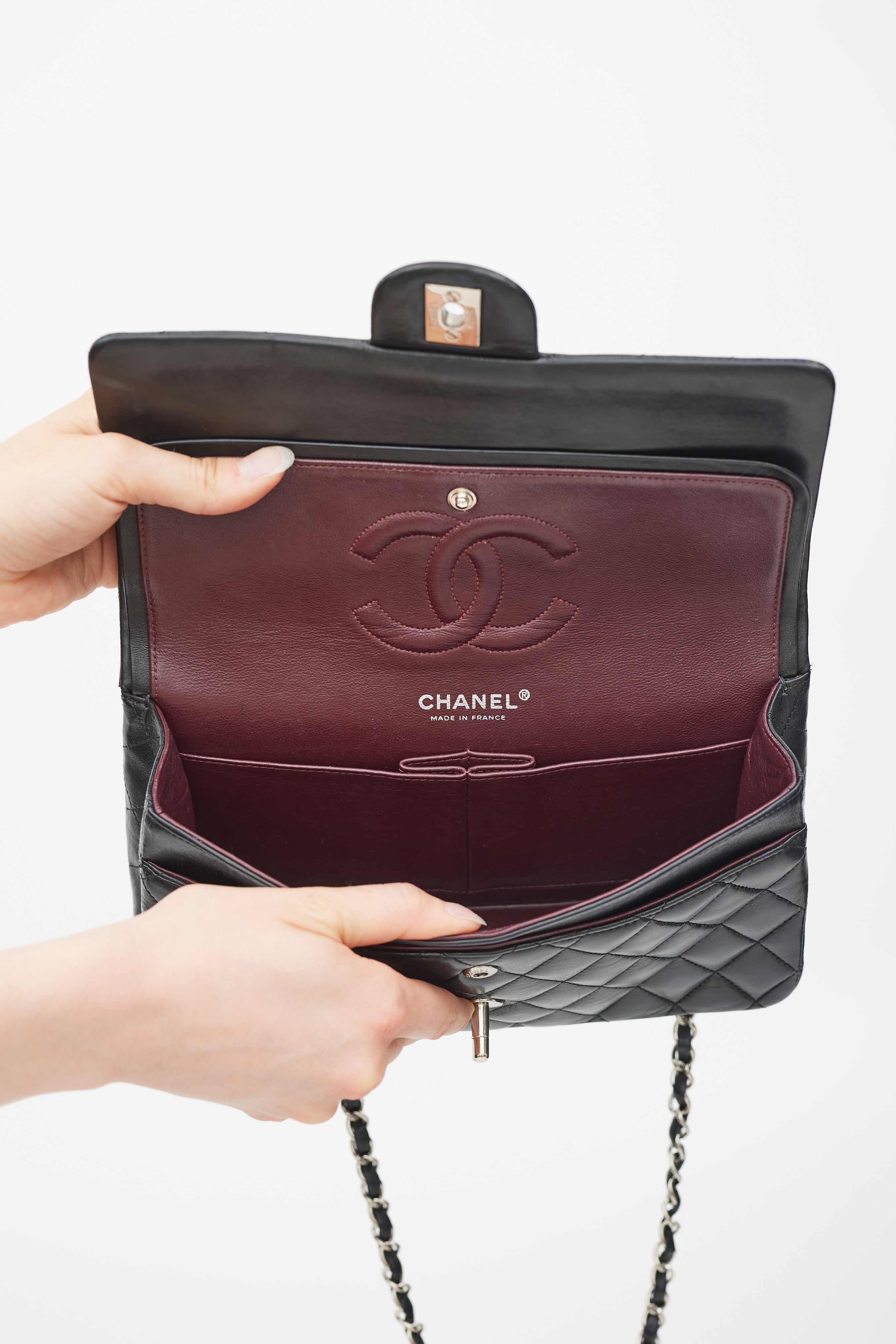 Pre-owned Chanel 2008/9 black medium Double Flap bag featuring quilted leather body, silver tone hardware, single back slip pocket, top flap with CC logo hardware, twist lock closure, braided leather and chain shoulder strap, single zip pocket and single slip pocket under top flap, stitched CC logo, silver tone printed logo, and single slip pocket under snap buttoned second flap, and one burgundy leather lined main compartment with two slip pockets.