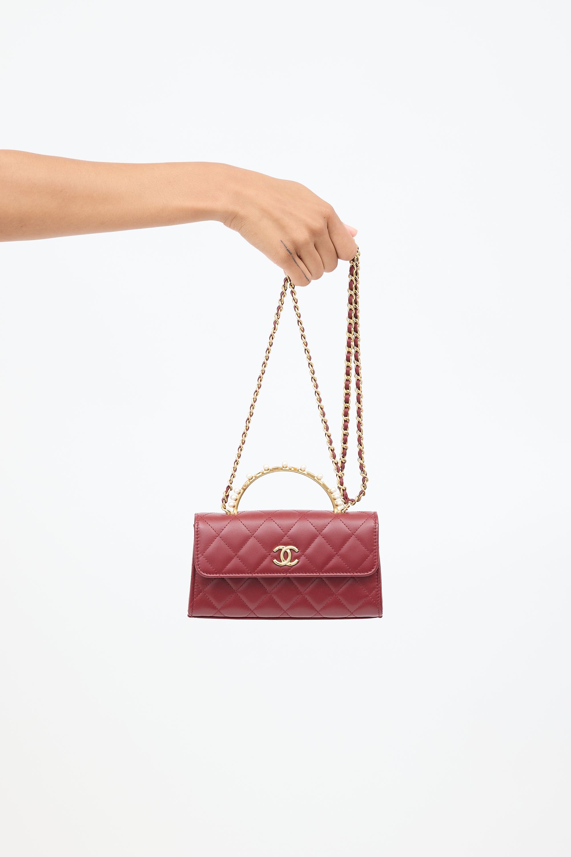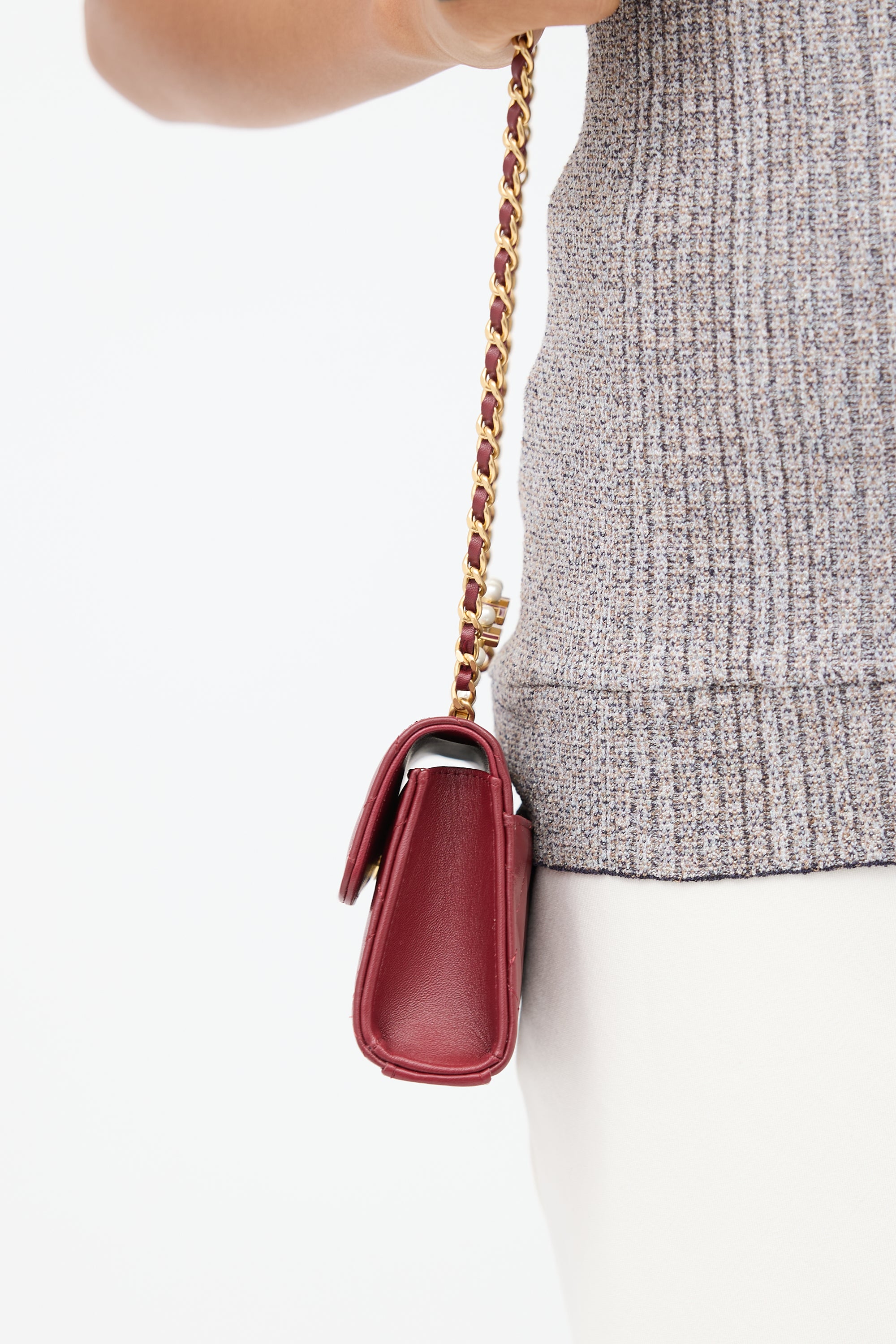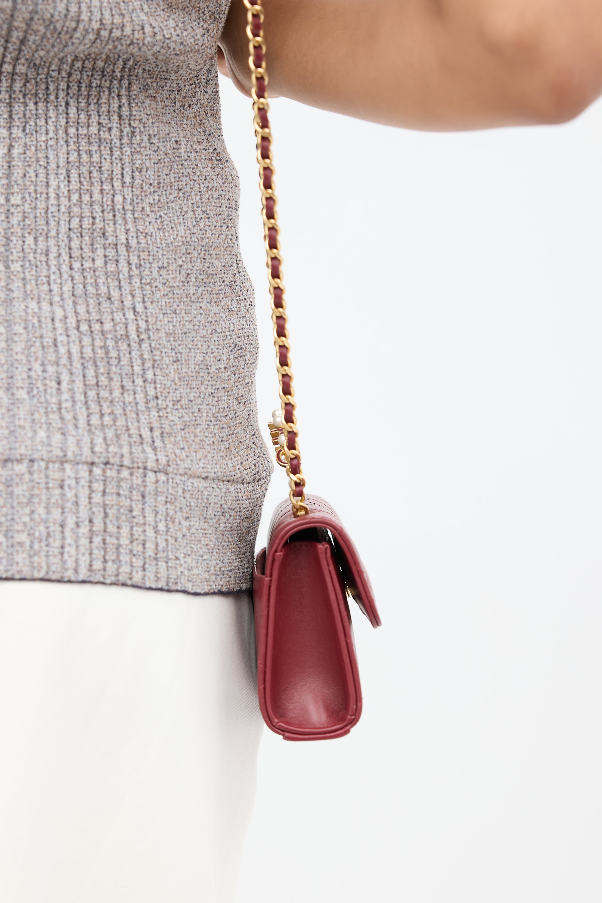 Pre-owned Chanel FW 2023 burgundy leather Flap Phone Holder bag featuring gold tone hardware, signature quilted leather exterior, gold tone CC logo at front, structured top handle with pearl and logo hardware, braided leather and chain strap, snap button closure, canvas lined main compartment, one slip and one card pocket inside, and one slip pocket at back. Comes with original box and dust bag.