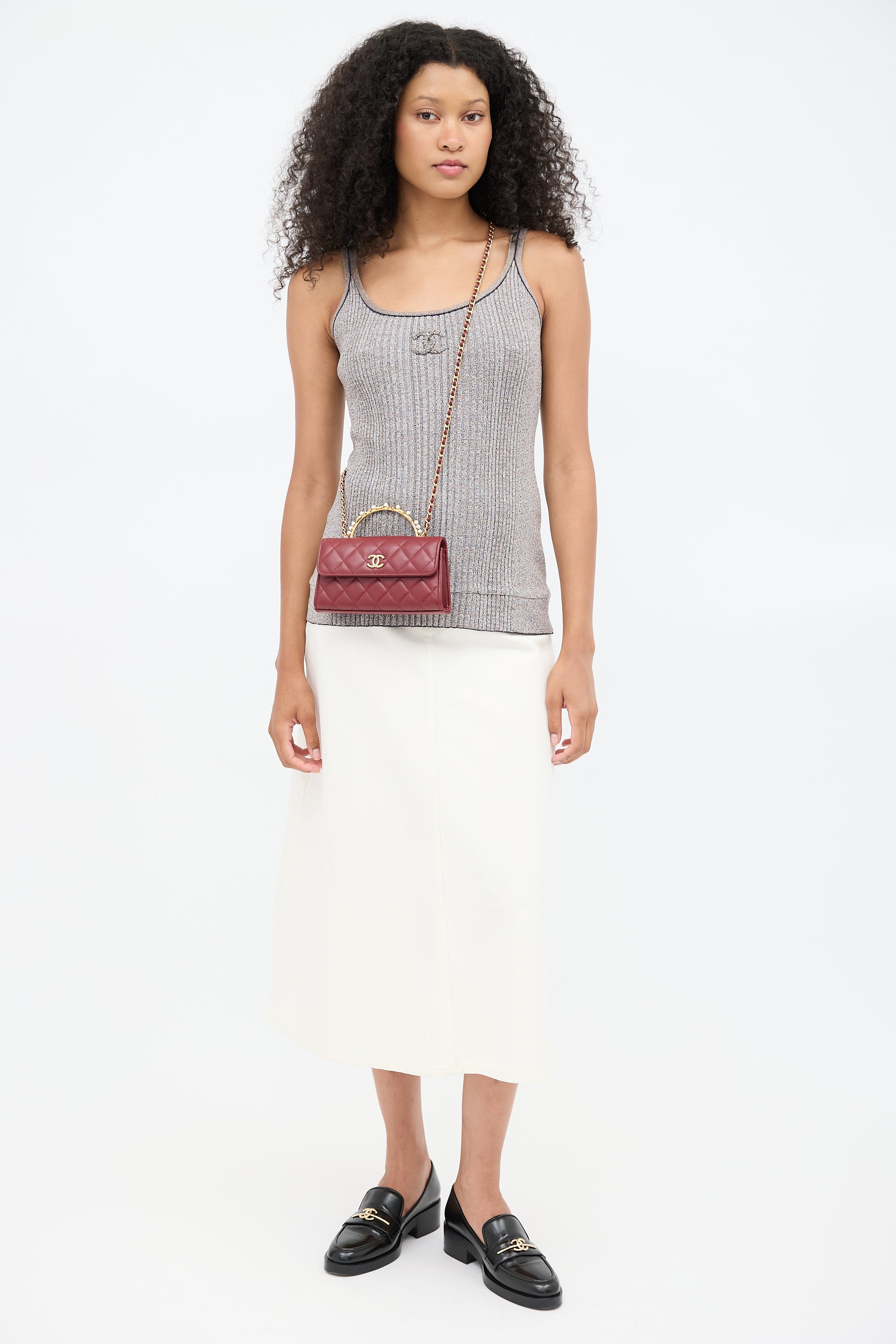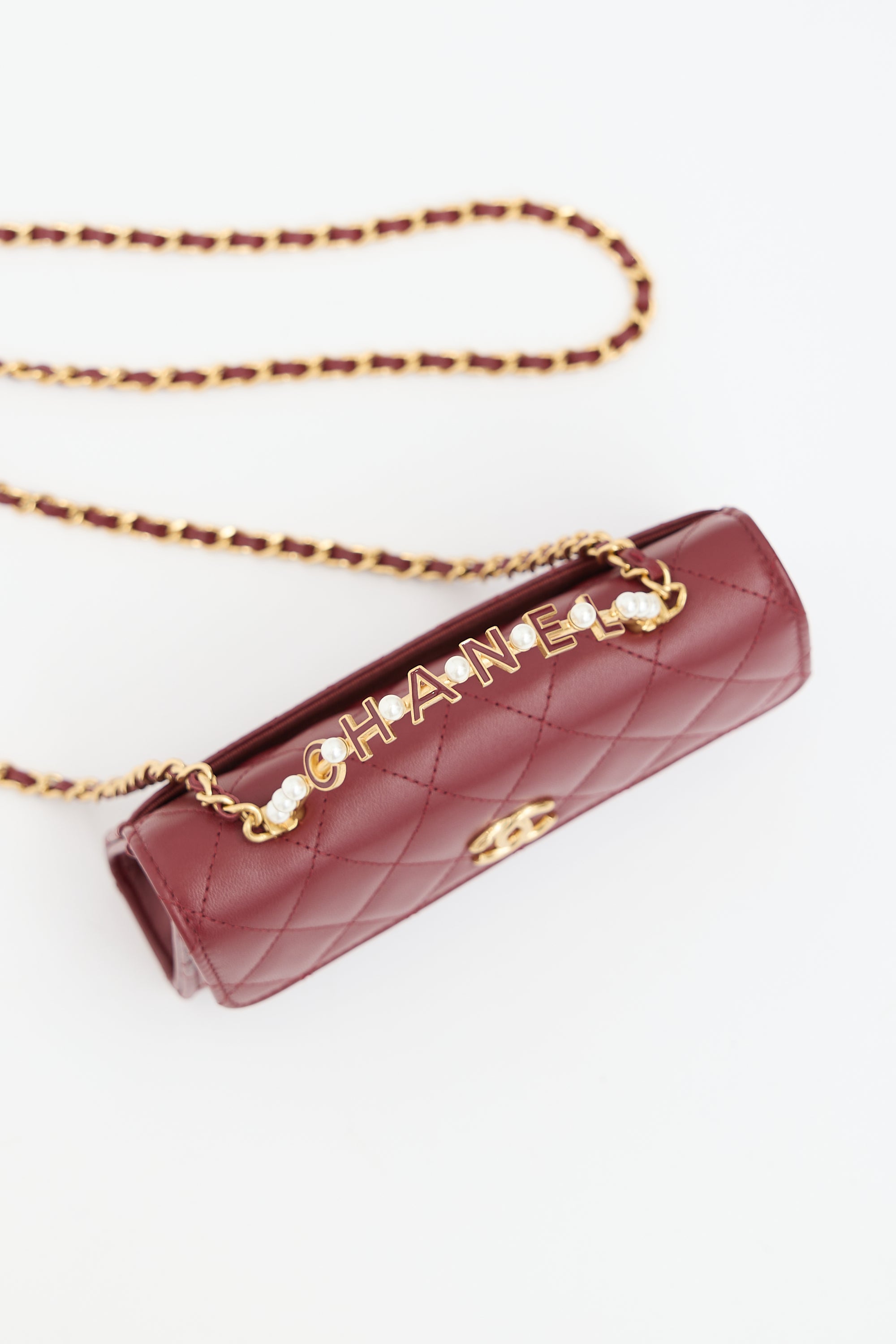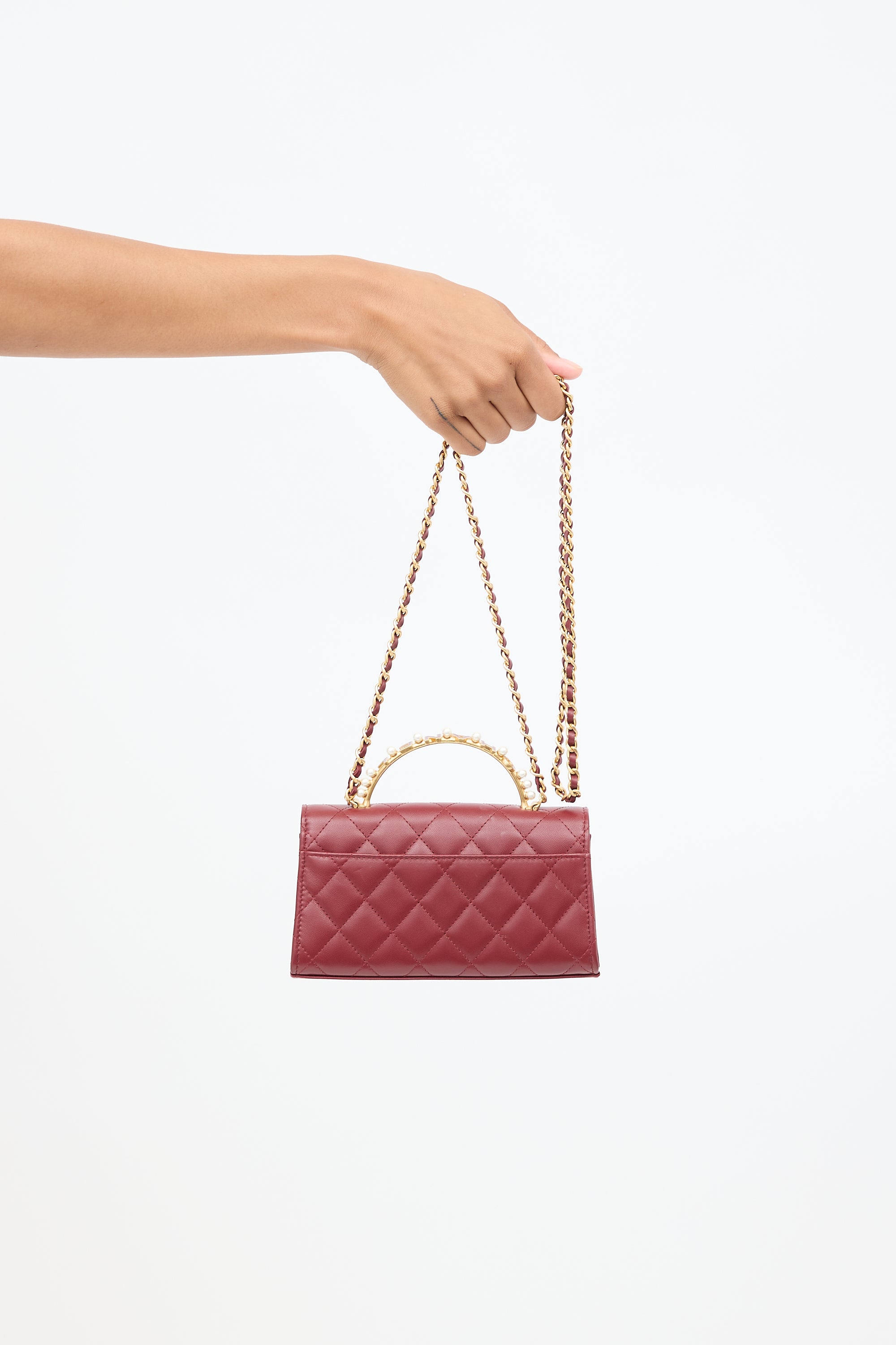 Pre-owned Chanel FW 2023 burgundy leather Flap Phone Holder bag featuring gold tone hardware, signature quilted leather exterior, gold tone CC logo at front, structured top handle with pearl and logo hardware, braided leather and chain strap, snap button closure, canvas lined main compartment, one slip and one card pocket inside, and one slip pocket at back. Comes with original box and dust bag.