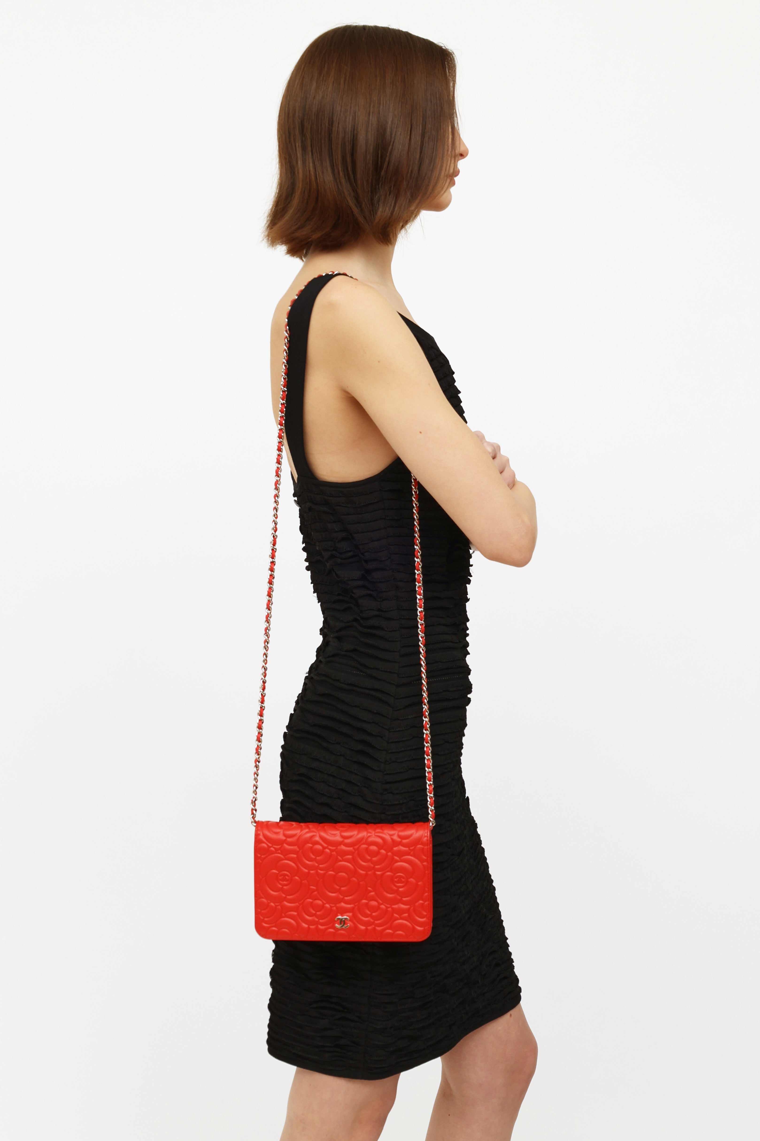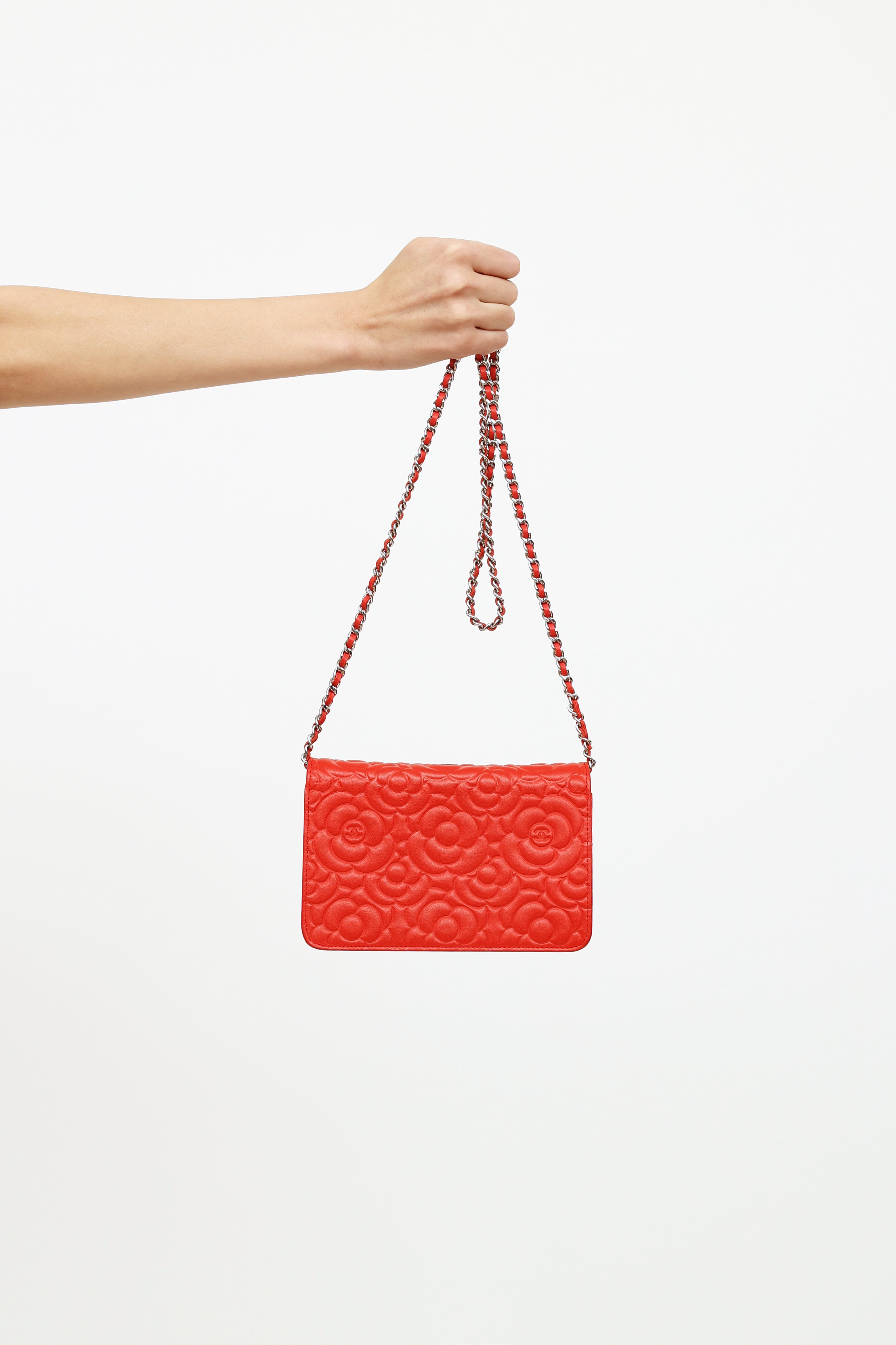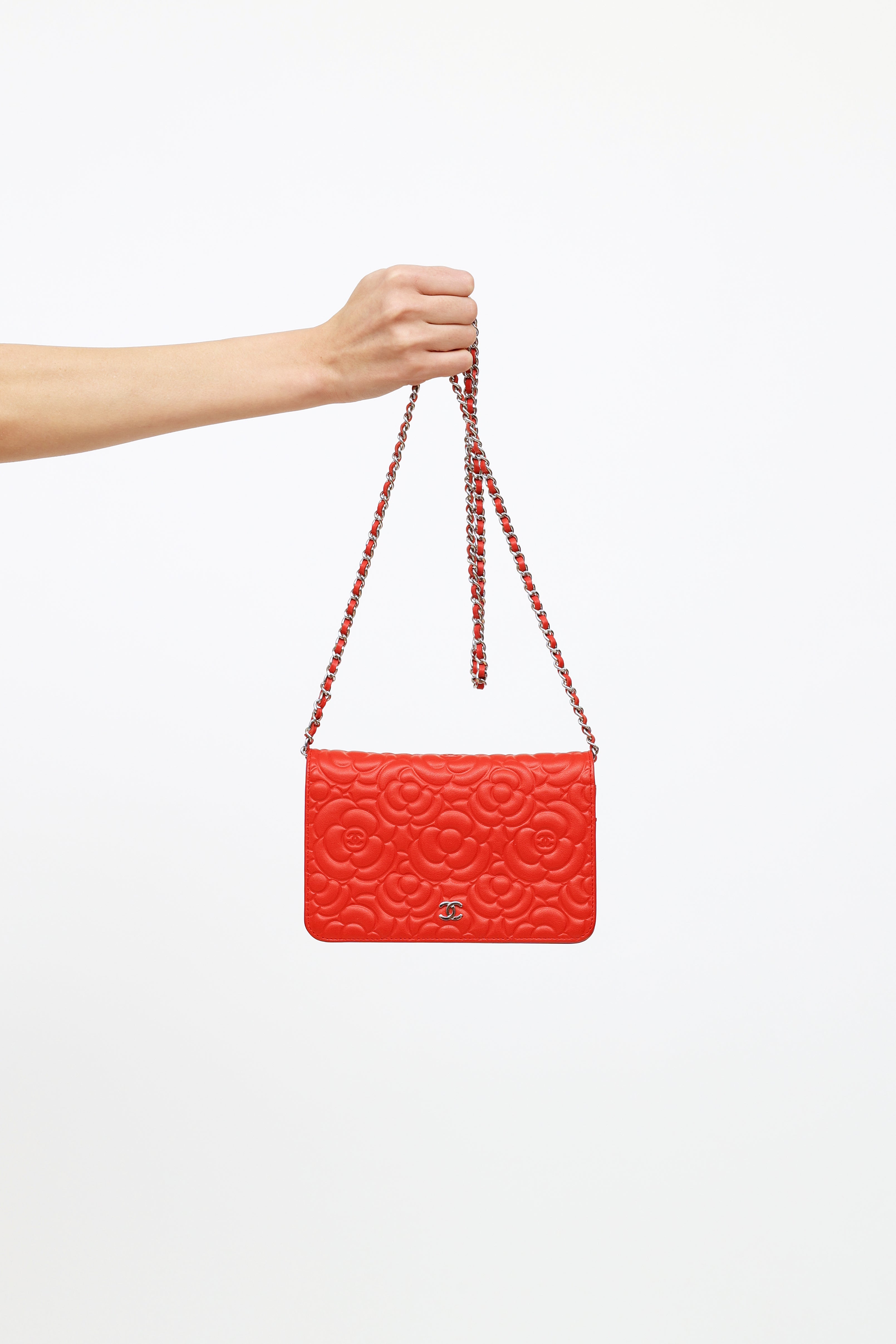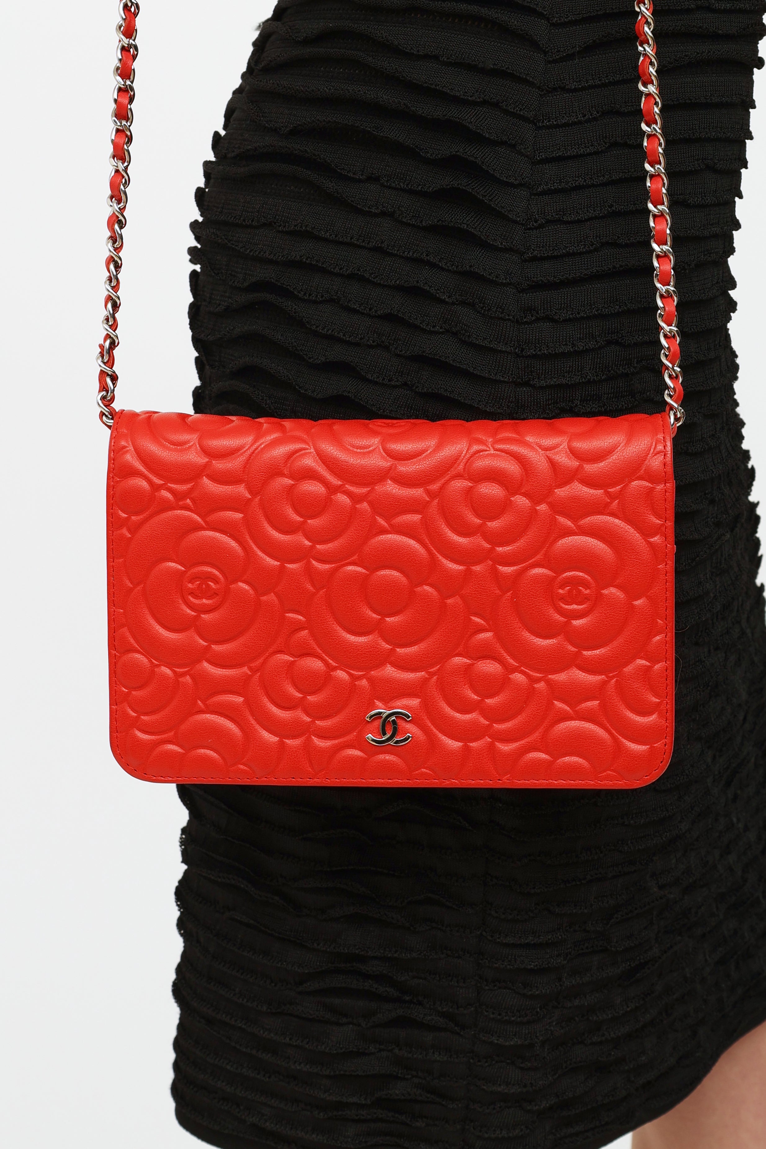 Pre-owned Chanel red CC wallet on chain featuring embossed Camellia pattern at face and back, silver tone CC plaque at front, snap button closure, woven leather and silver tone shoulder strap. Leather lined interior featuring one zipped pocket under flap, slip pocket at front, one zipped compartment and 6 card slots. Series 27.