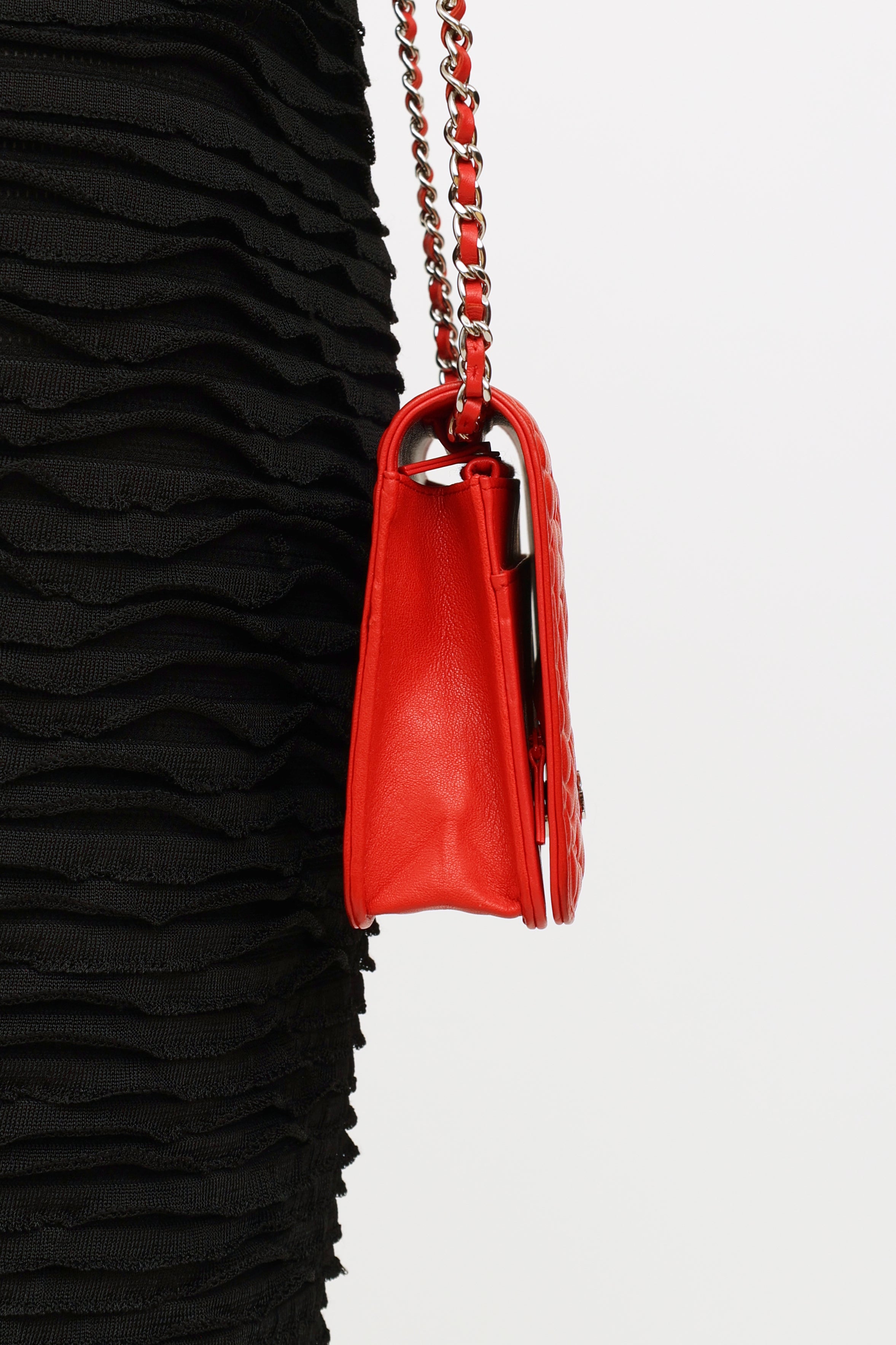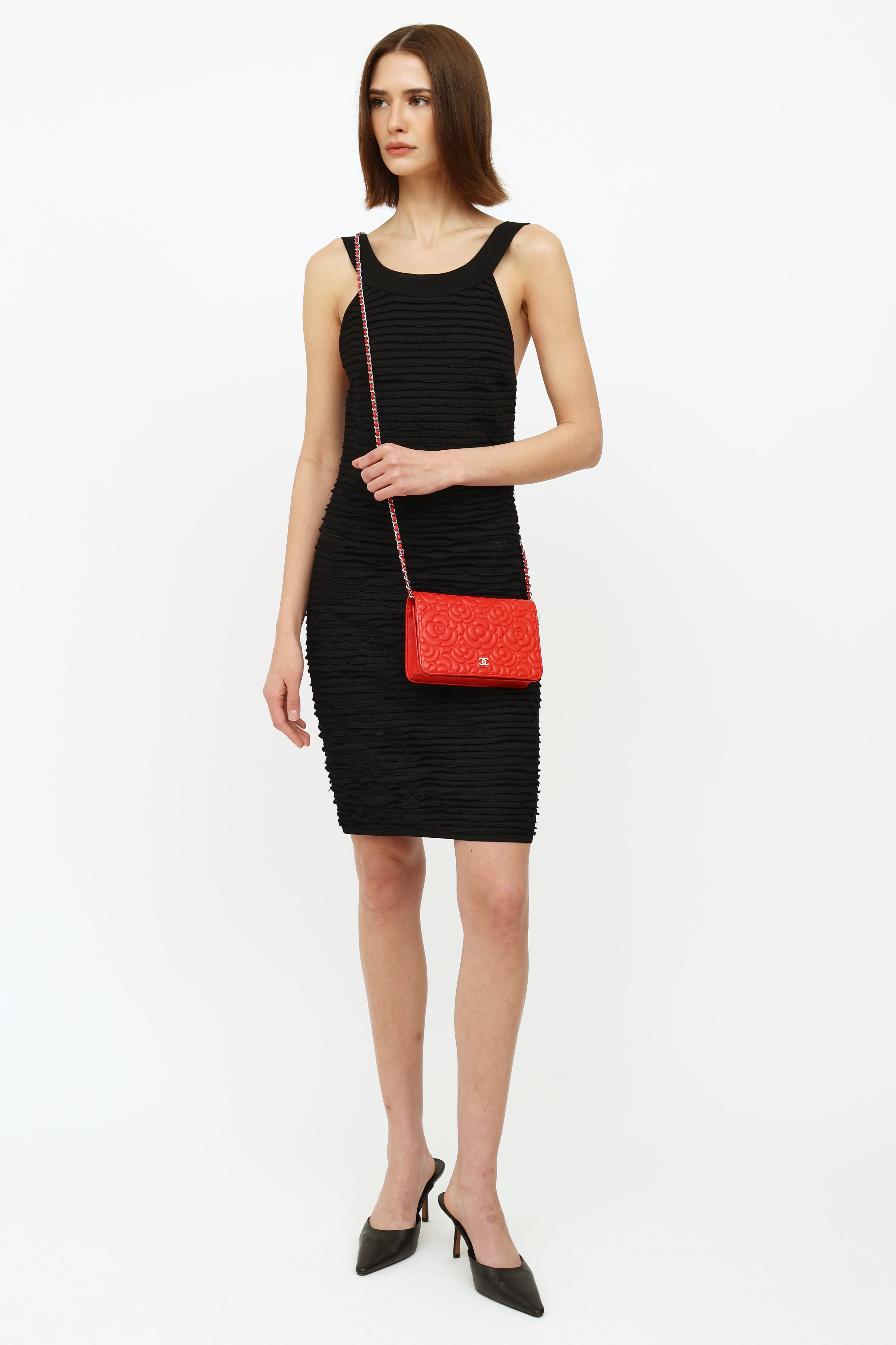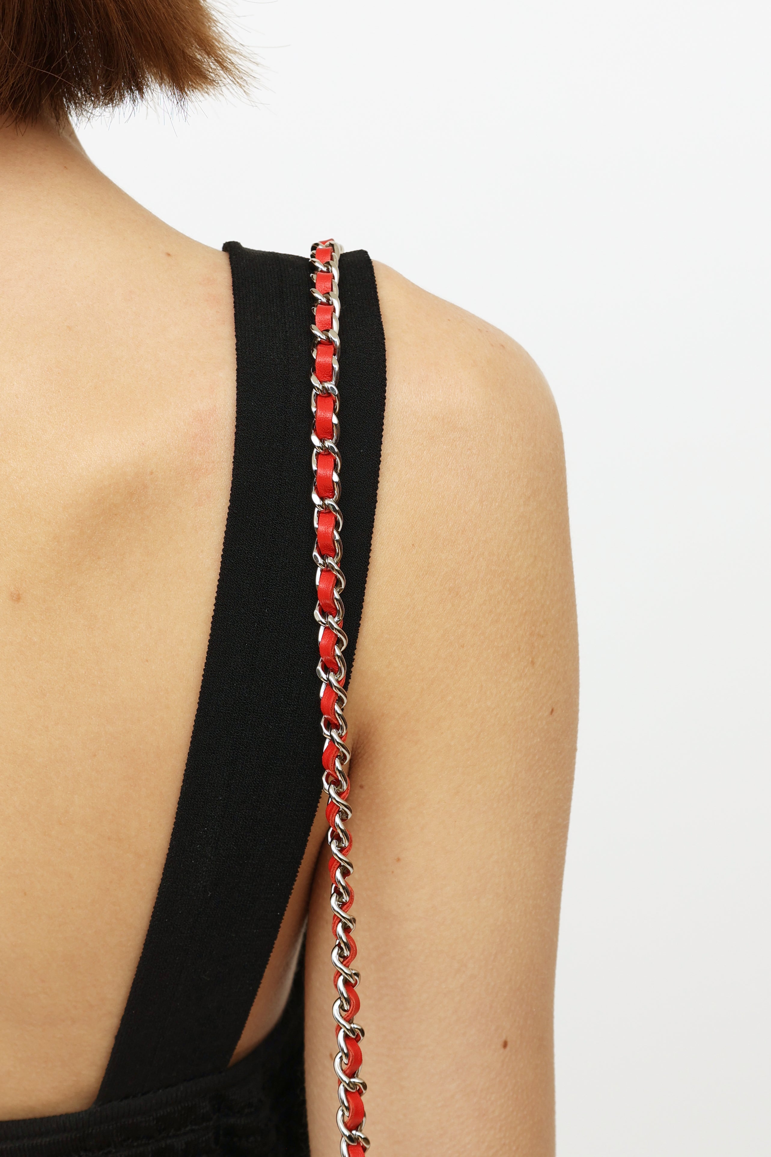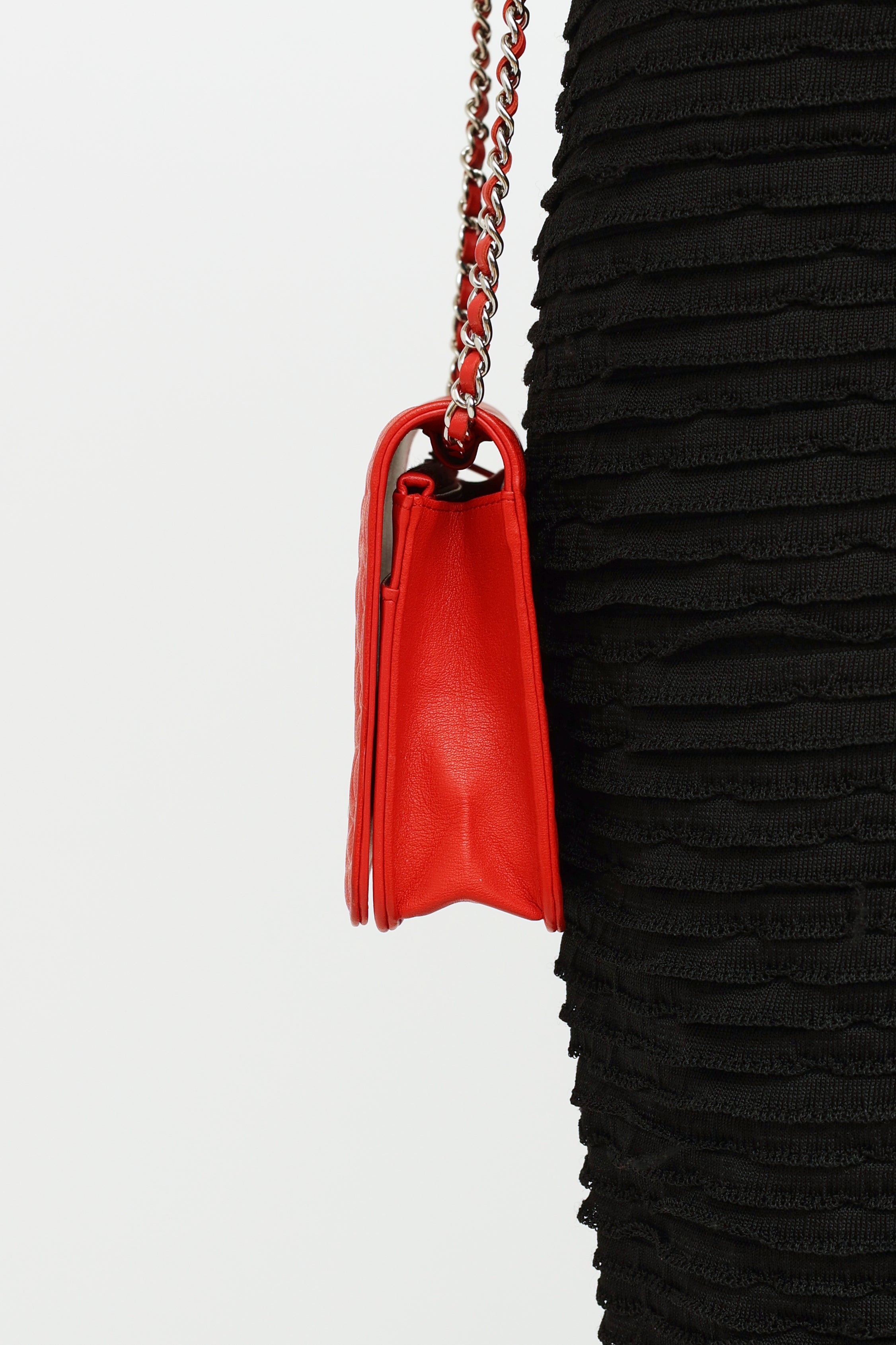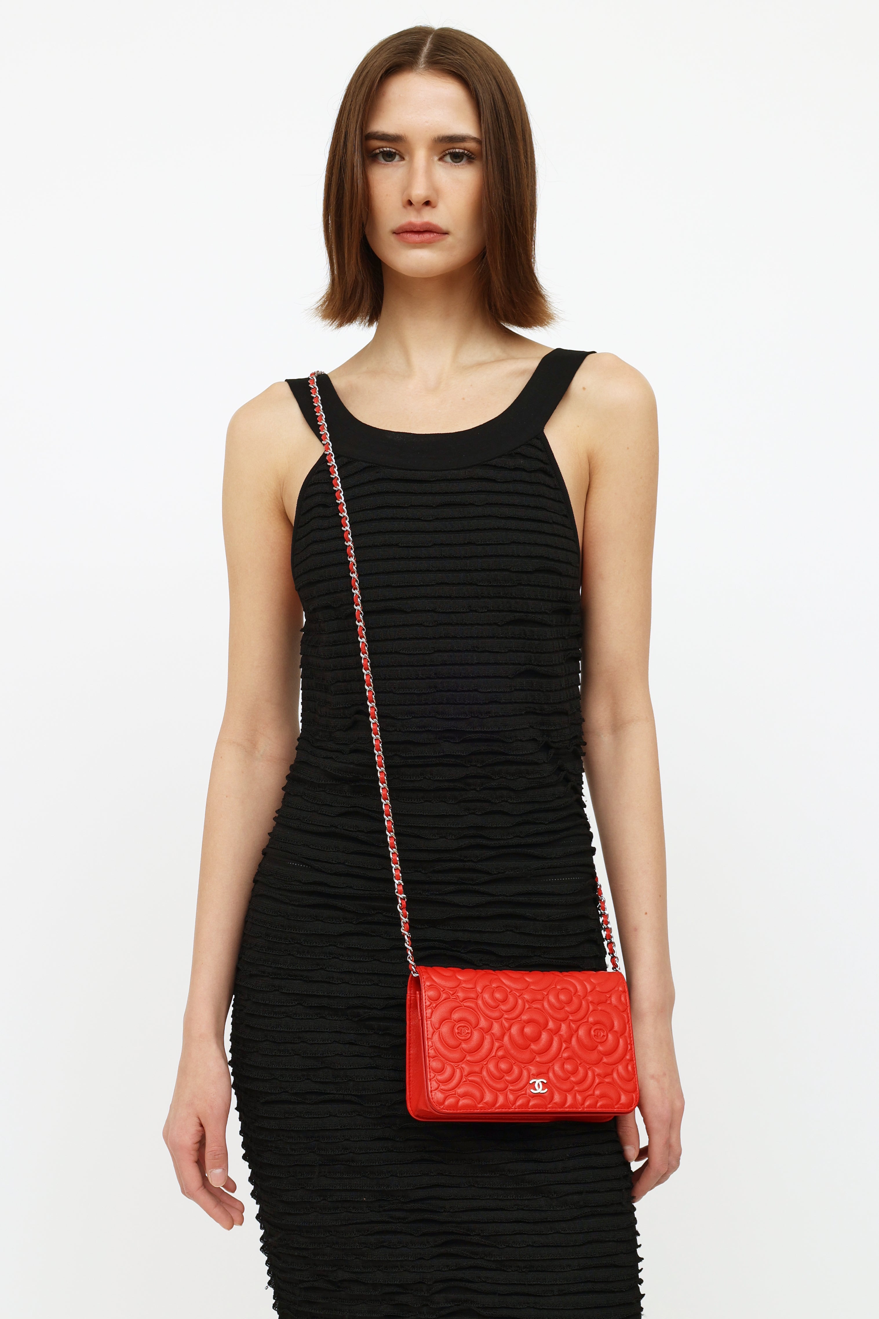 Pre-owned Chanel red CC wallet on chain featuring embossed Camellia pattern at face and back, silver tone CC plaque at front, snap button closure, woven leather and silver tone shoulder strap. Leather lined interior featuring one zipped pocket under flap, slip pocket at front, one zipped compartment and 6 card slots. Series 27.
