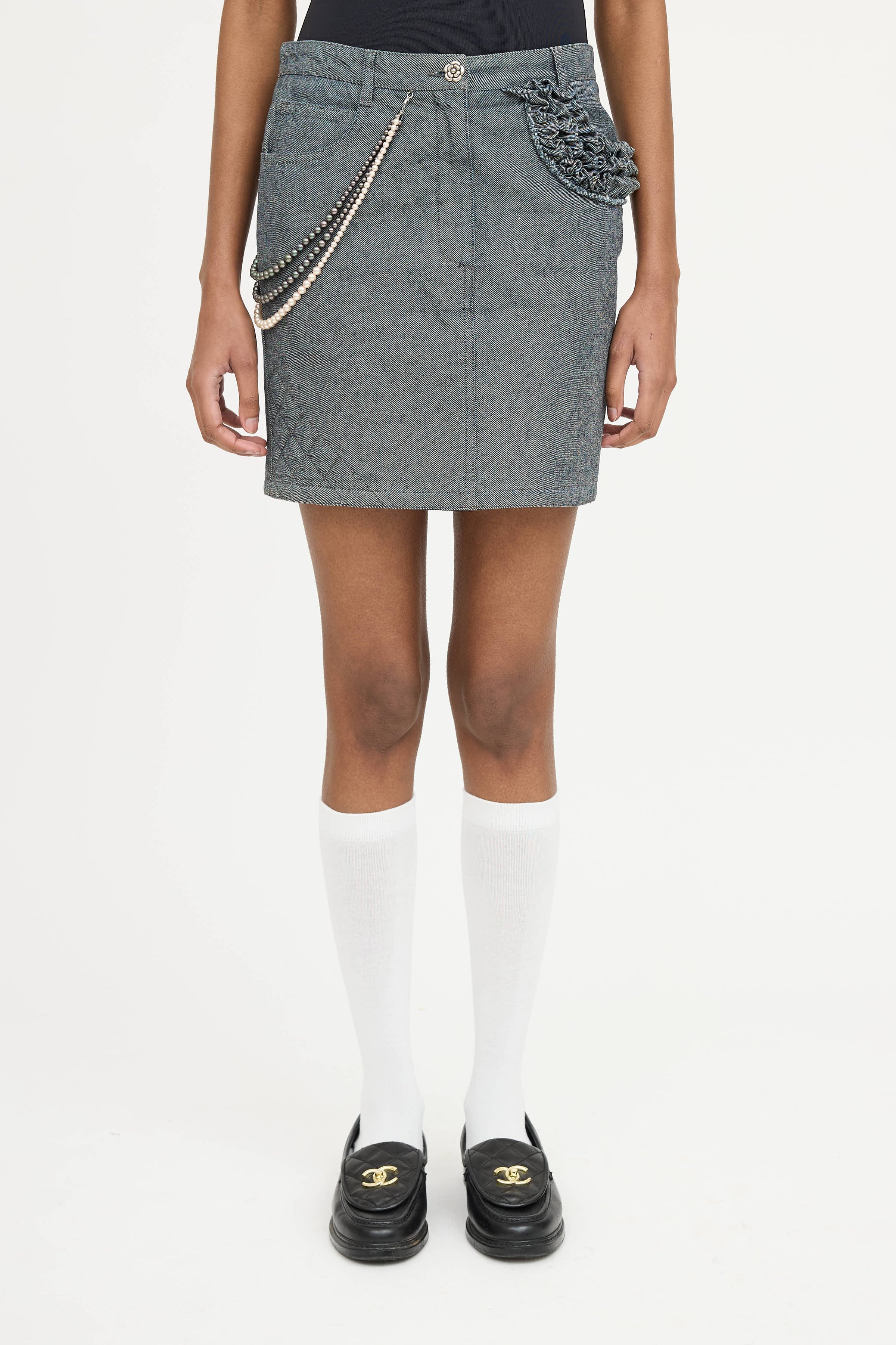 Pre-owned Chanel 2002 grey denim mini skirt featuring silver tone Camellia button front, belt loops, zip fly, five pocket styling, ruffle trim, and detachable multi strand pearls. From the 2002 Cruise Collection by Karl Lagerfeld.