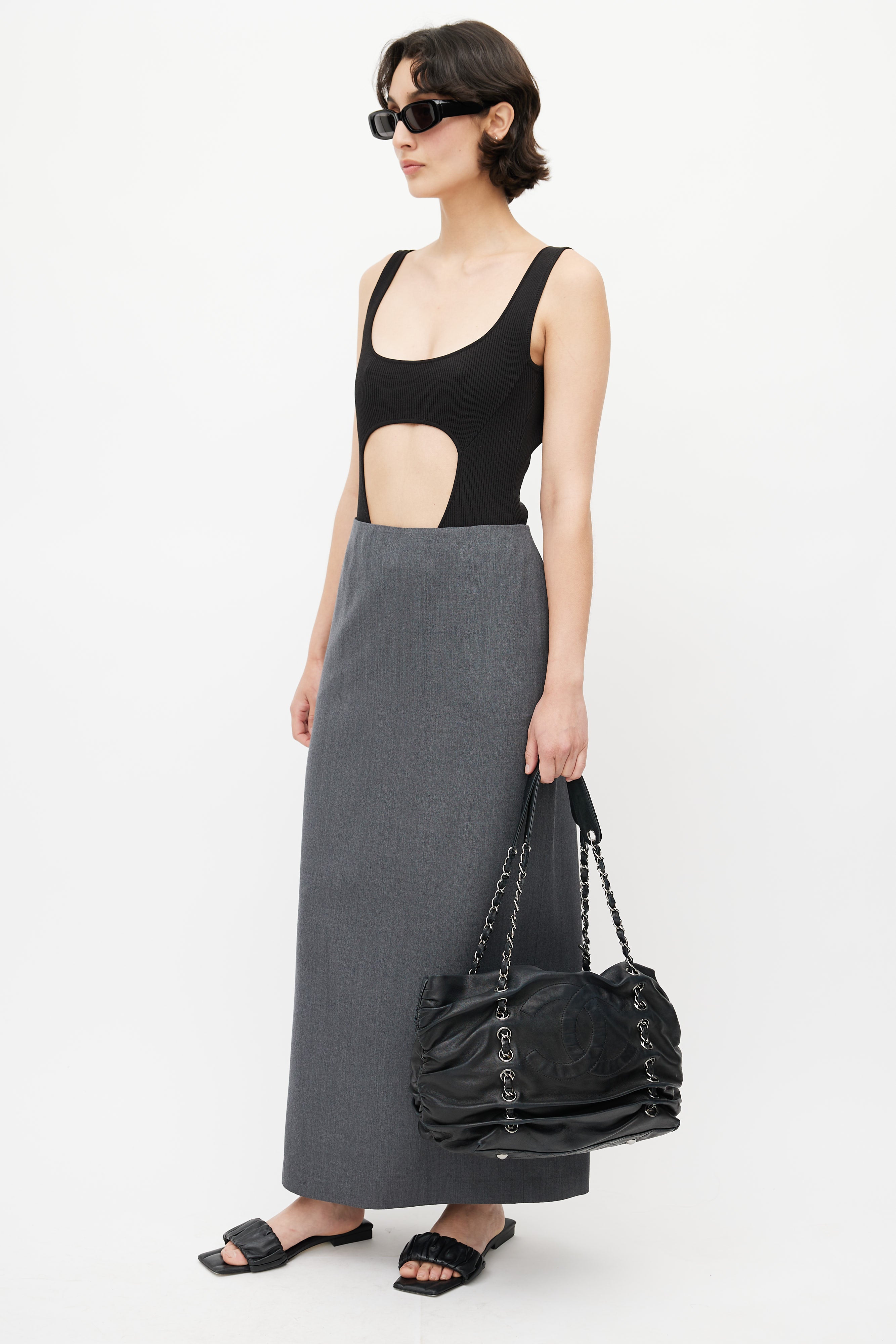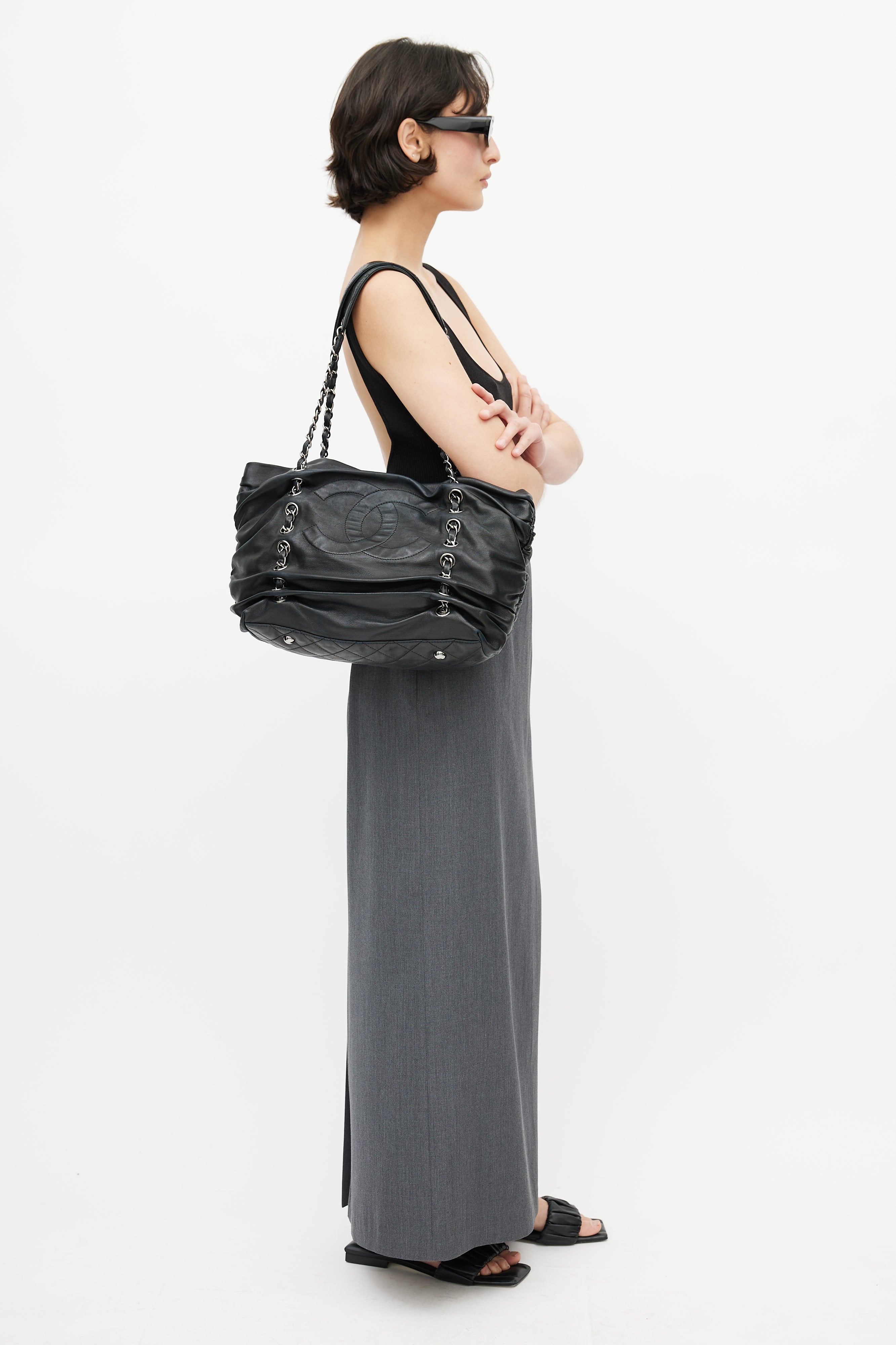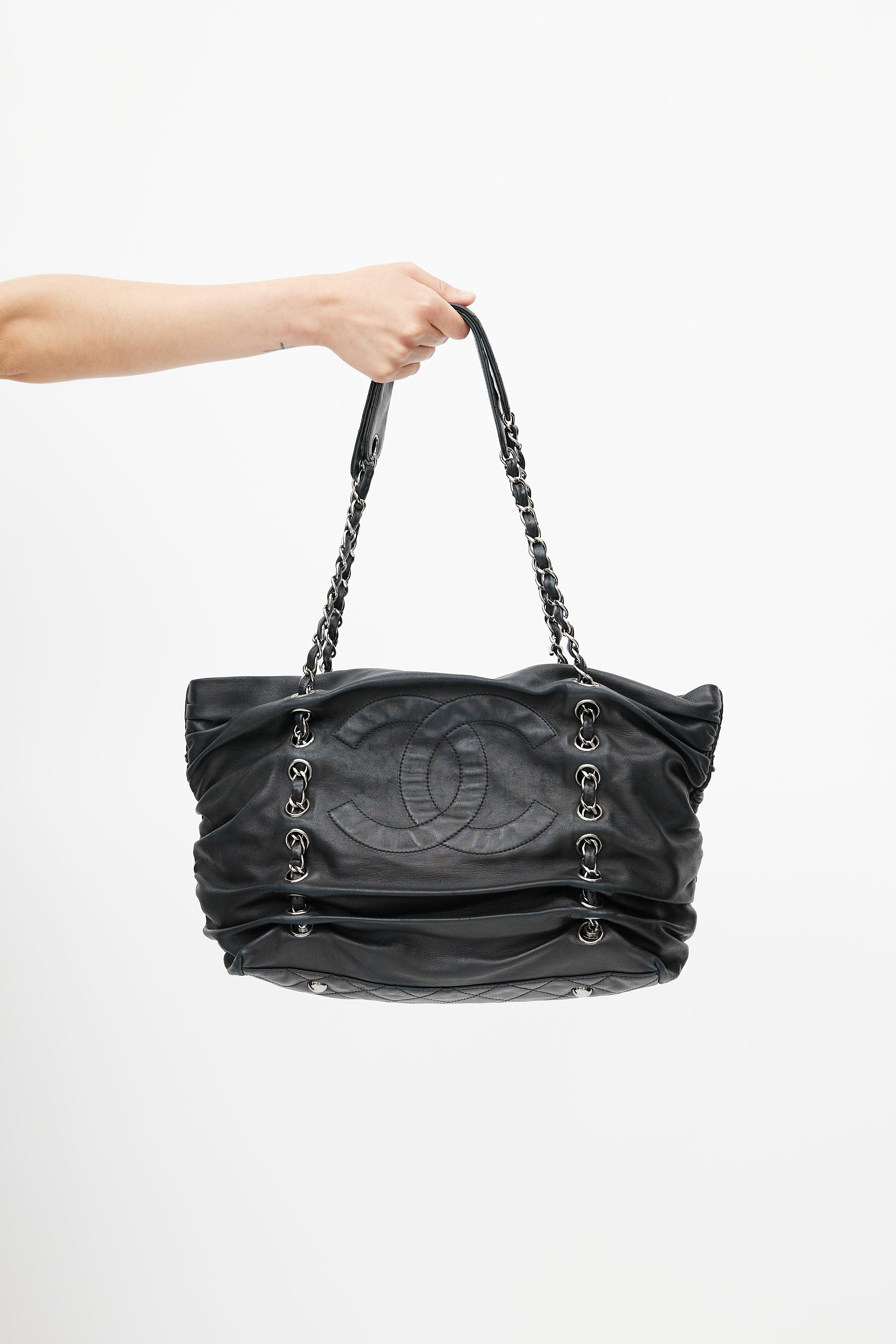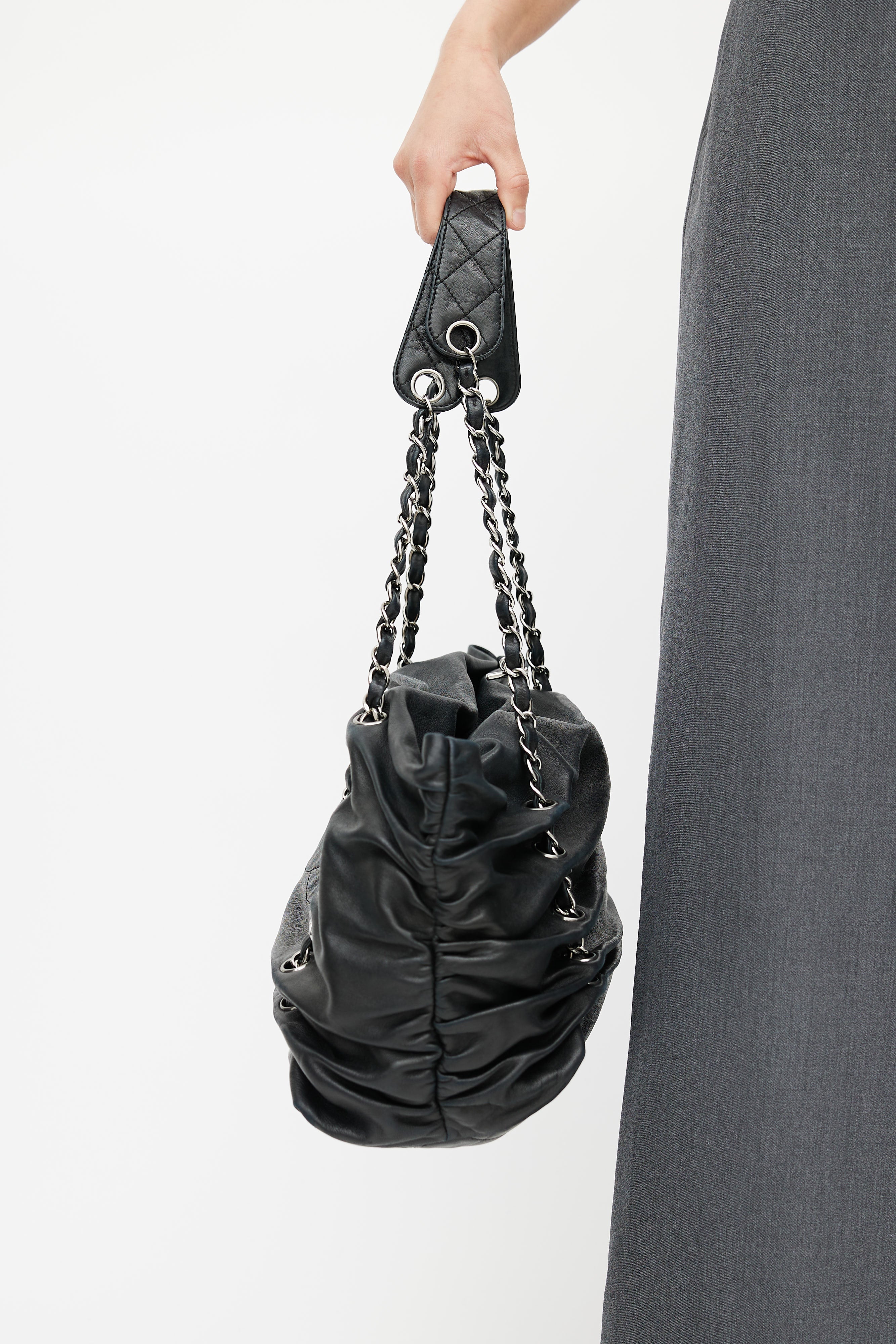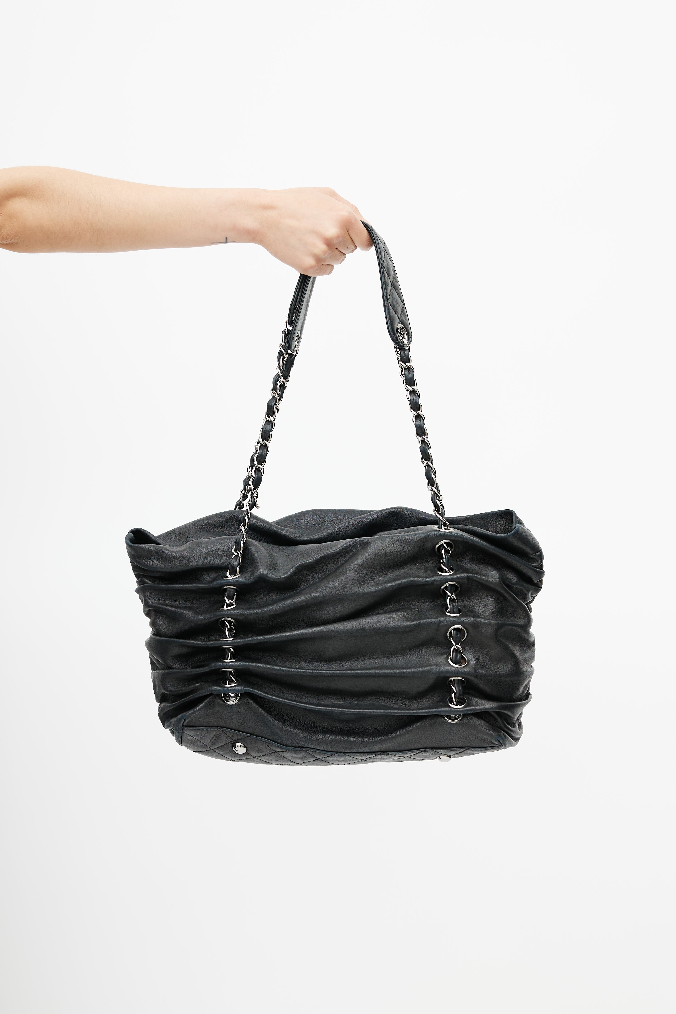 Pre-owned 2006s Chanel black Timeless Shar Pei bag featuring silver tone hardware, CC logo at face, metal feet, braided leather & chain shoulder strap, ruching throughout, snap buttons closure, quilted lining, key strap, interior zip pocket, and two interior slip pocket.
