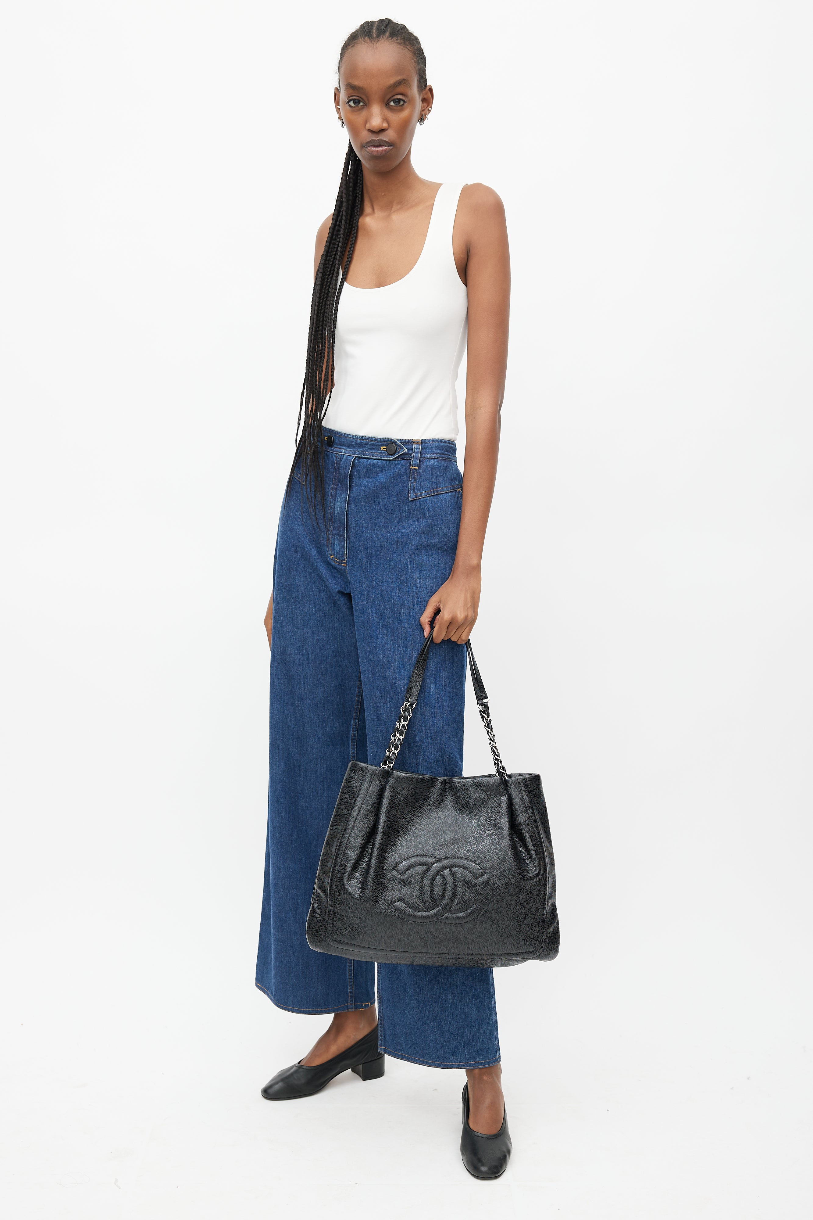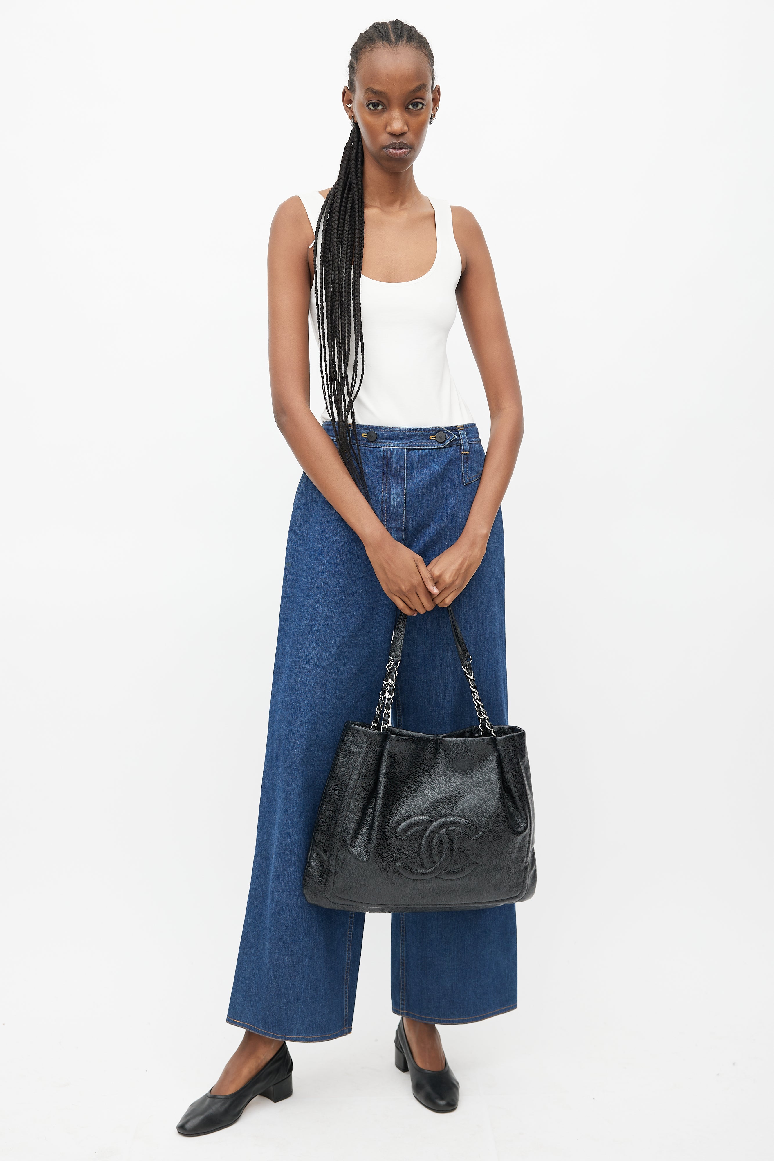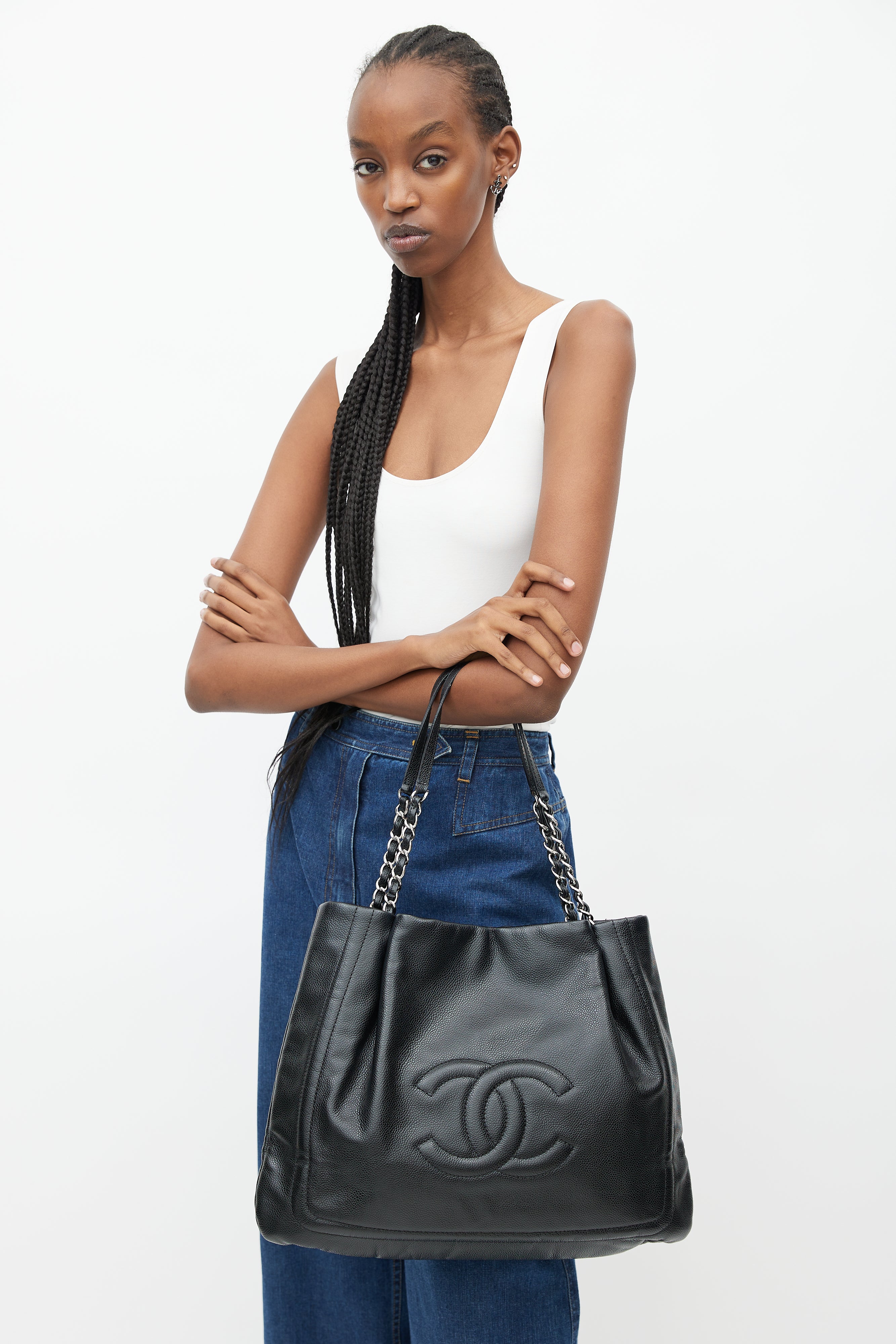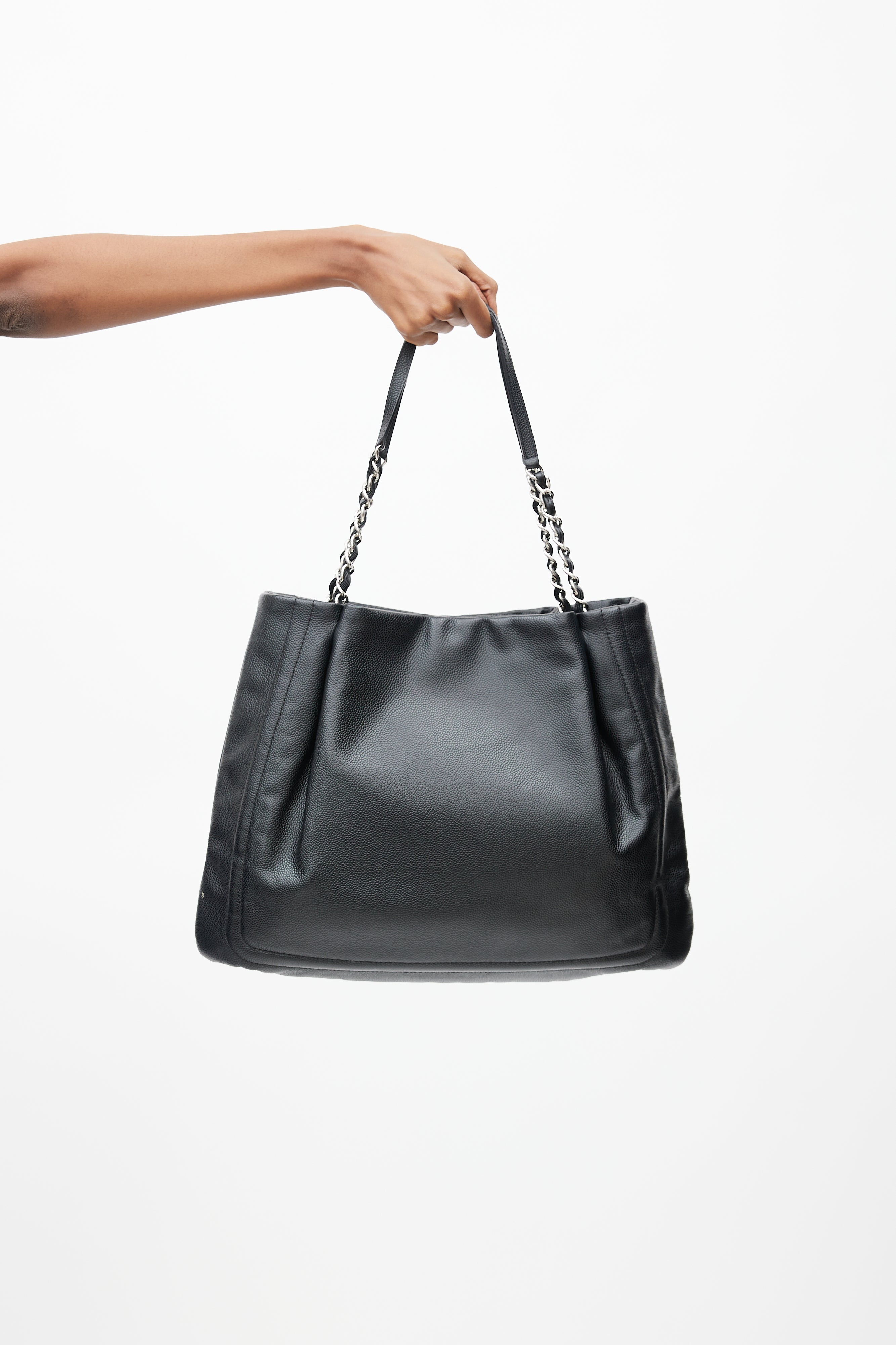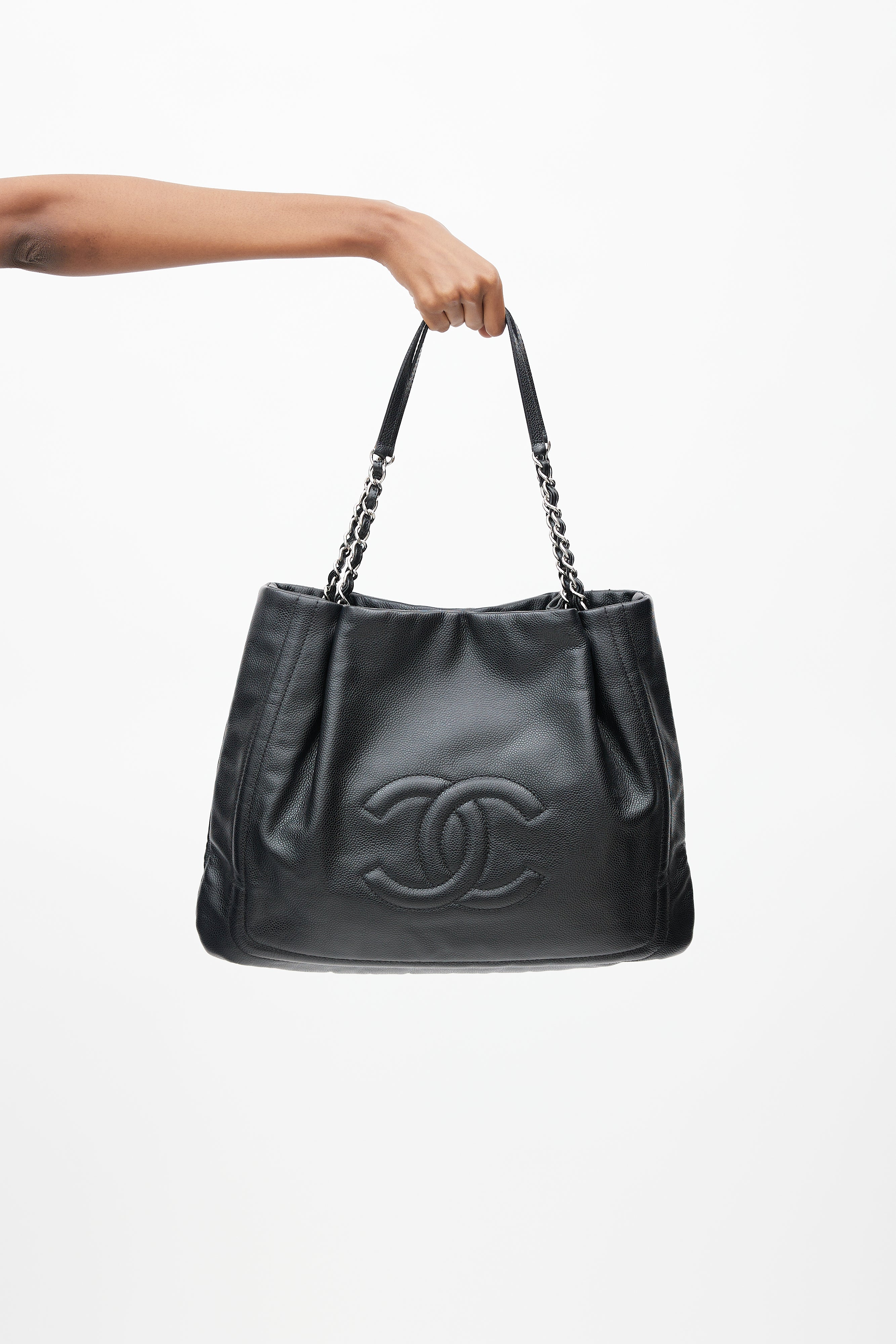 Pre-owned 2011 Chanel black Pleated Timeless tote bag featuring braided leather and silver chain handles, magnetic button closure, pleated top, embroidered CC logo at face, lined main compartment, key strap, and interior zip and slip pockets.