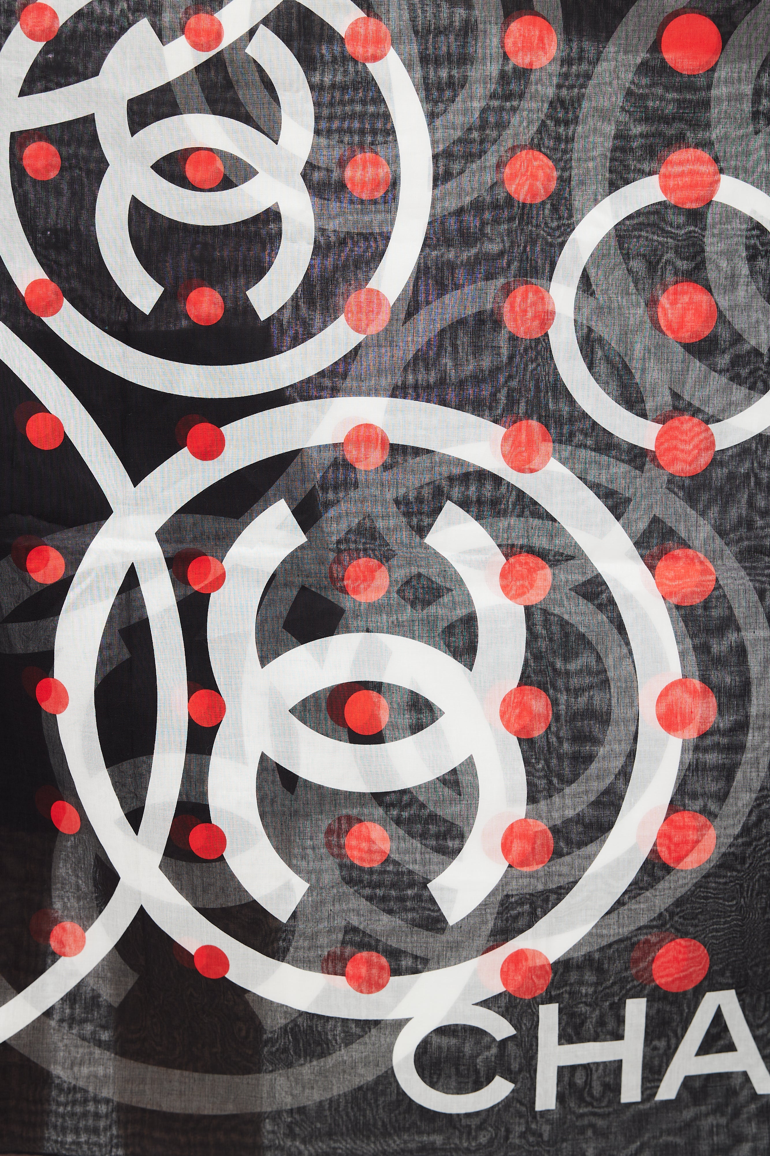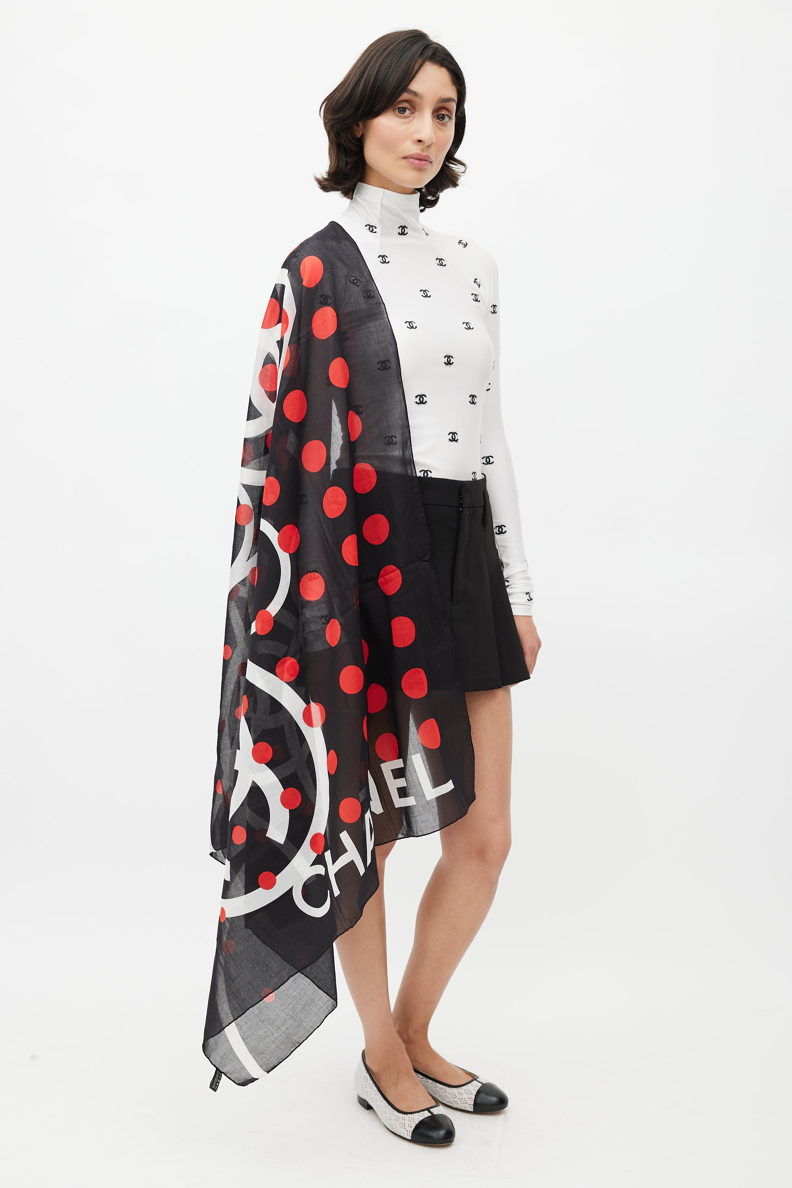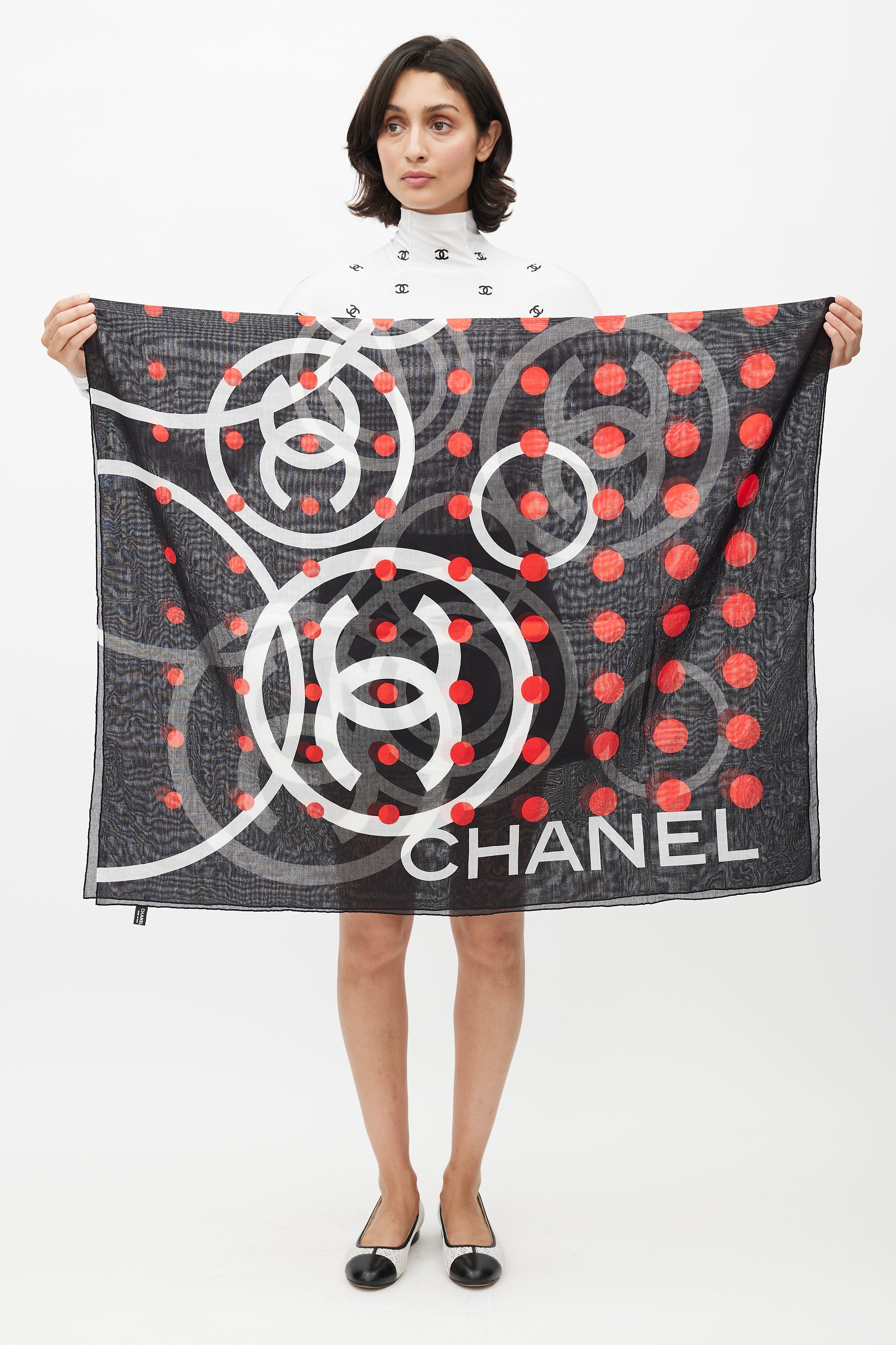 Pre-owned Chanel black scarf featuring red polkadot, white logo print, and hand rolled trim. Comes with original dust bag and box.
