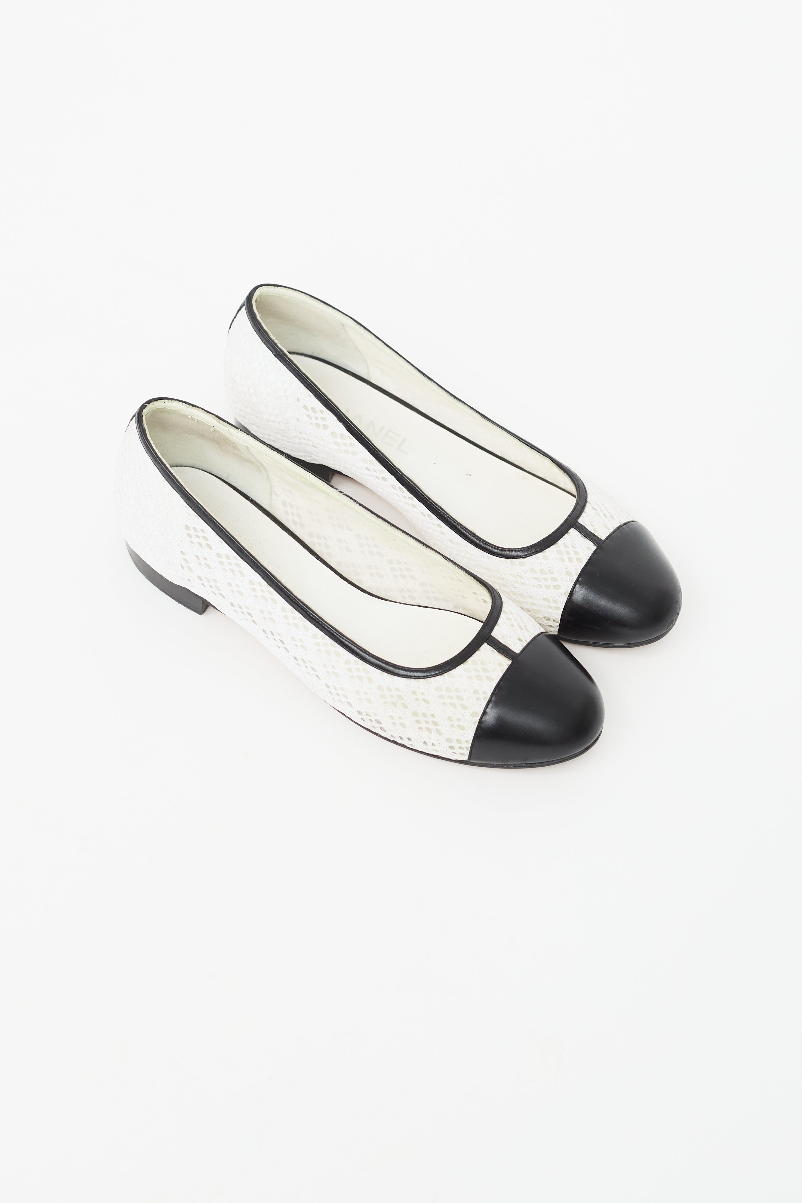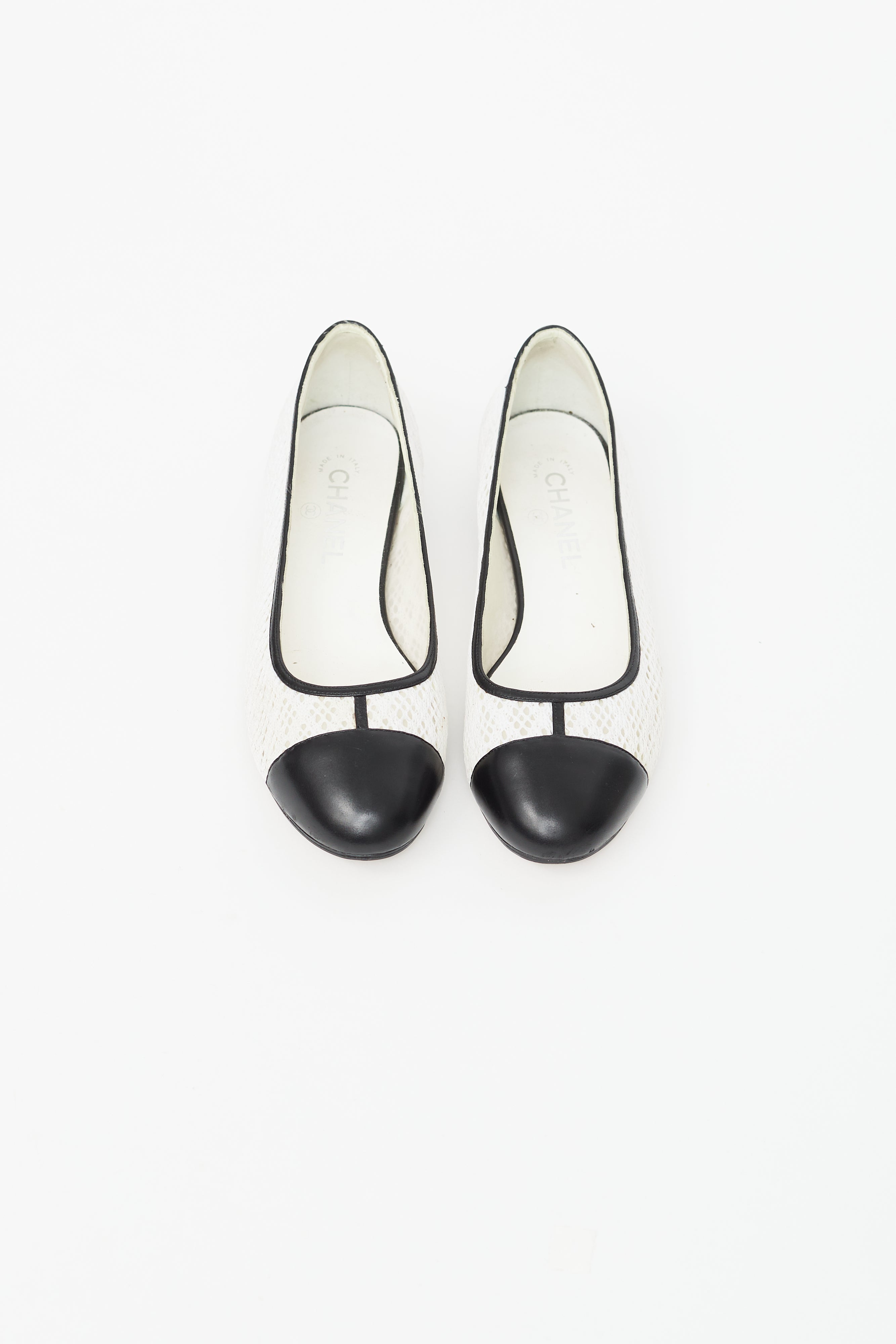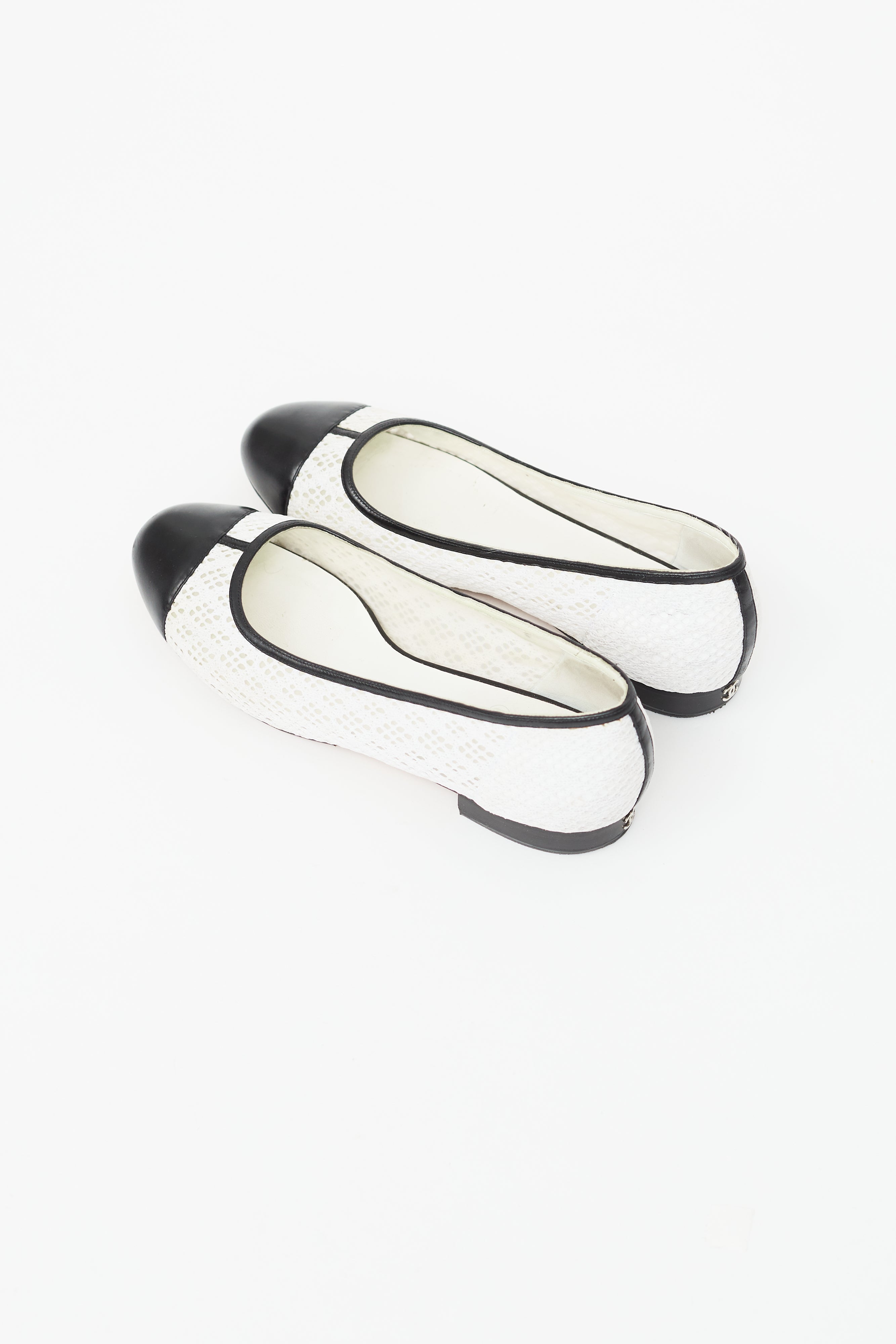 Pre-owned Chanel black and white ballet flat featuring semi sheer lace side with mesh backing, black leather rounded toe, black leather collar, and block heel with gold tone CC logo. Comes with original dust bag.
