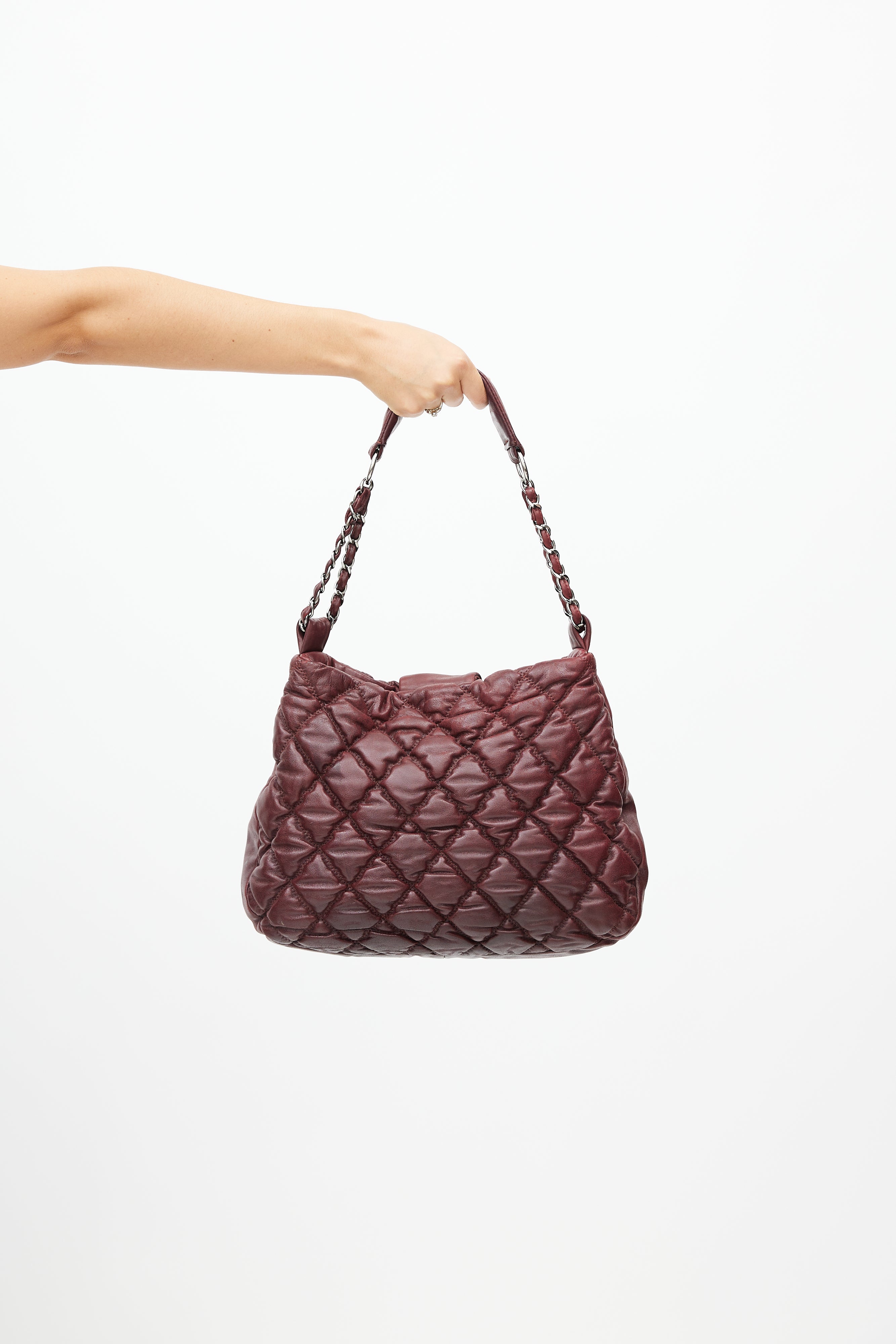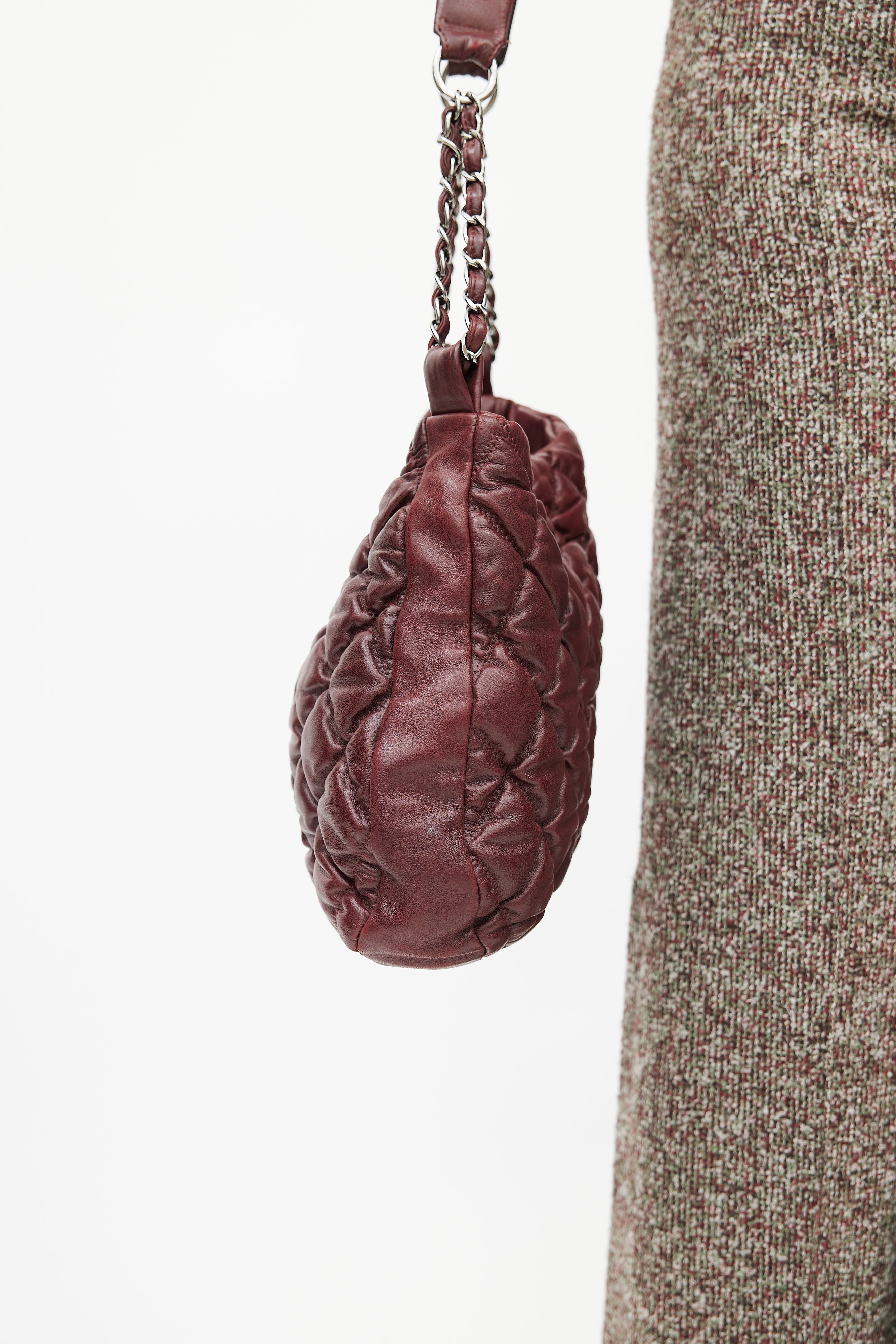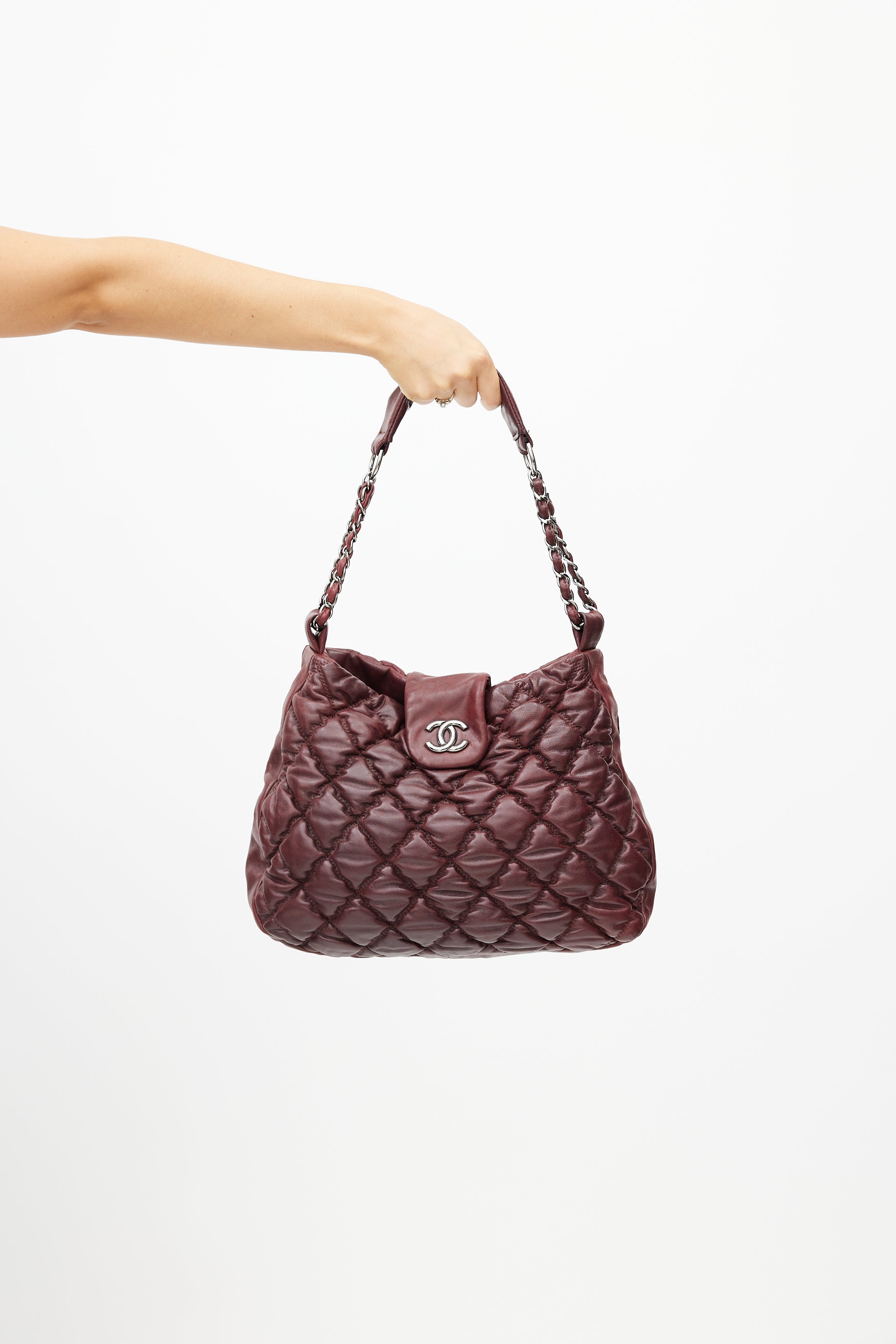 Pre-owned Chanel 2008 burgundy Bubble leather bag featuring a silver tone braided chainlink shoulder strap, quilted detailing throughout, one main compartment with two slip pockets and one zip pocket, and top snap closure with silver tone CC logo hardware.