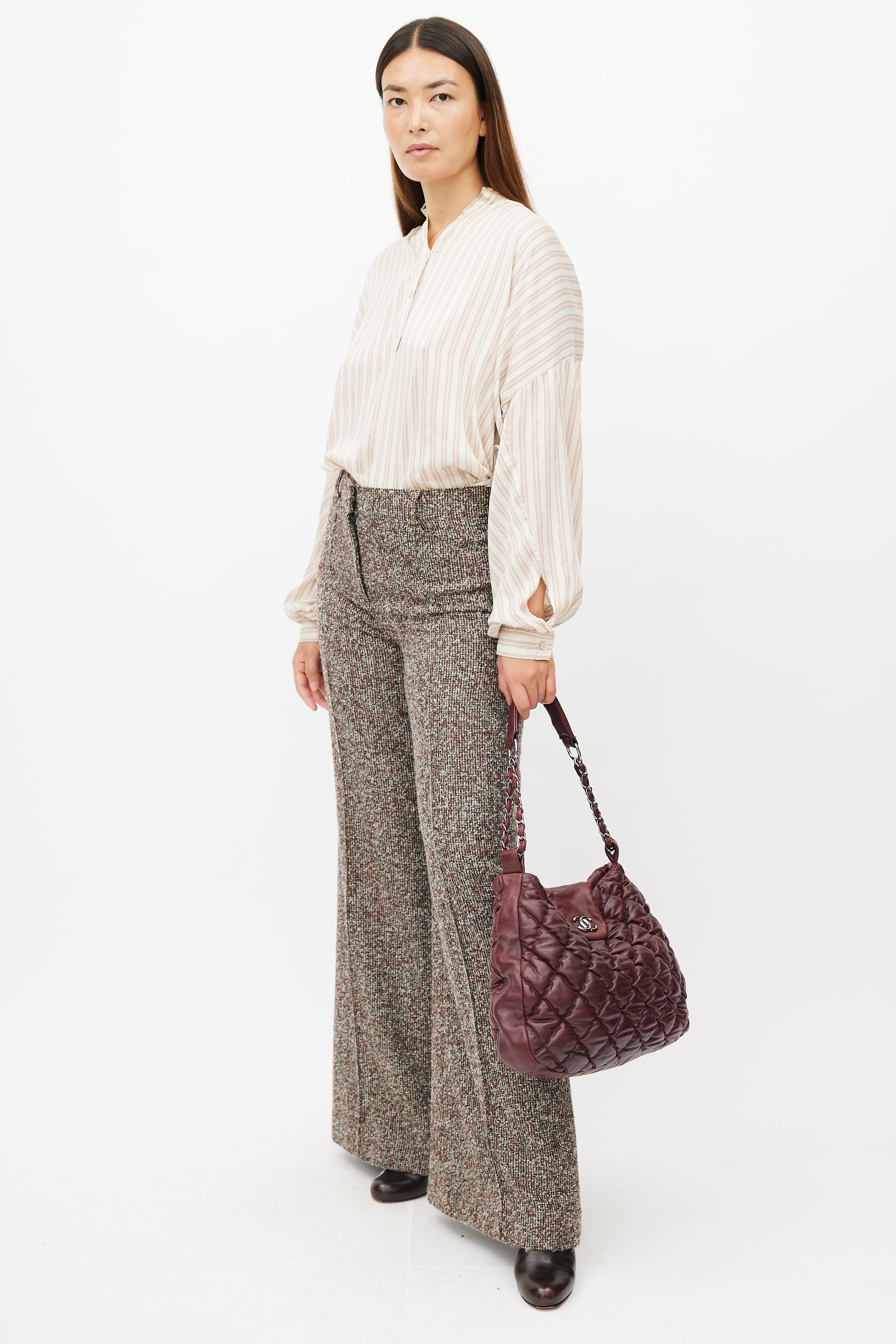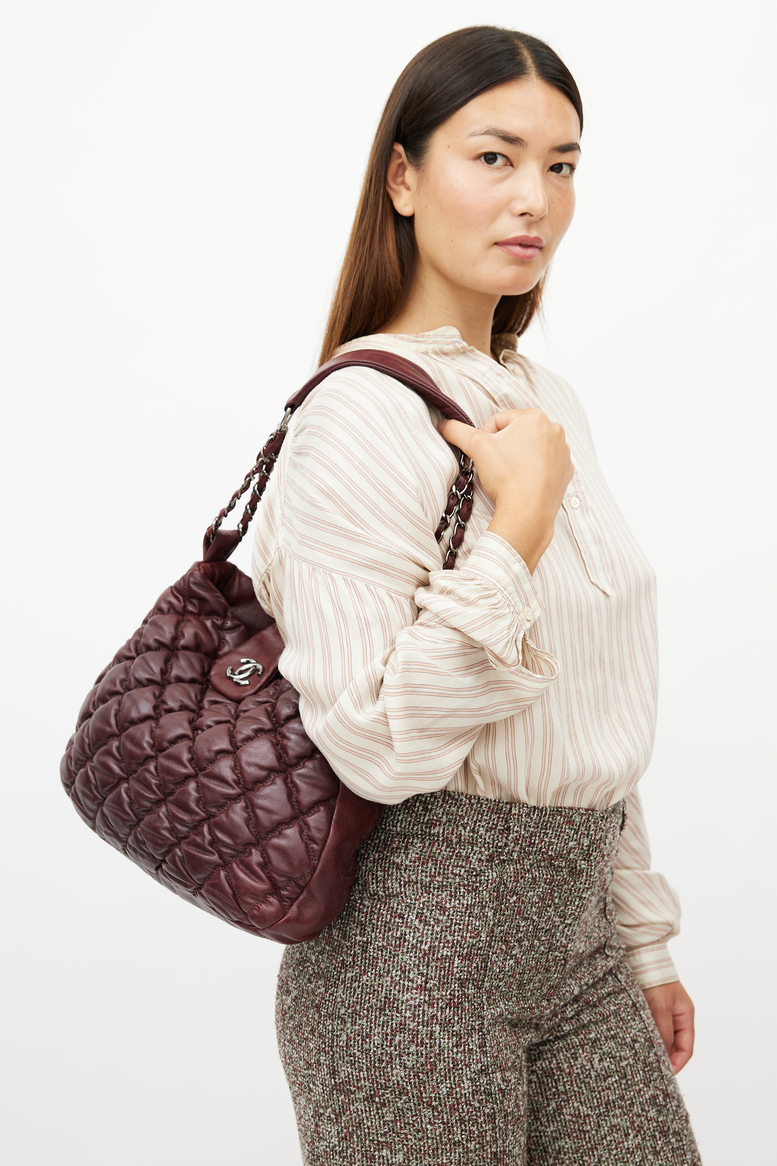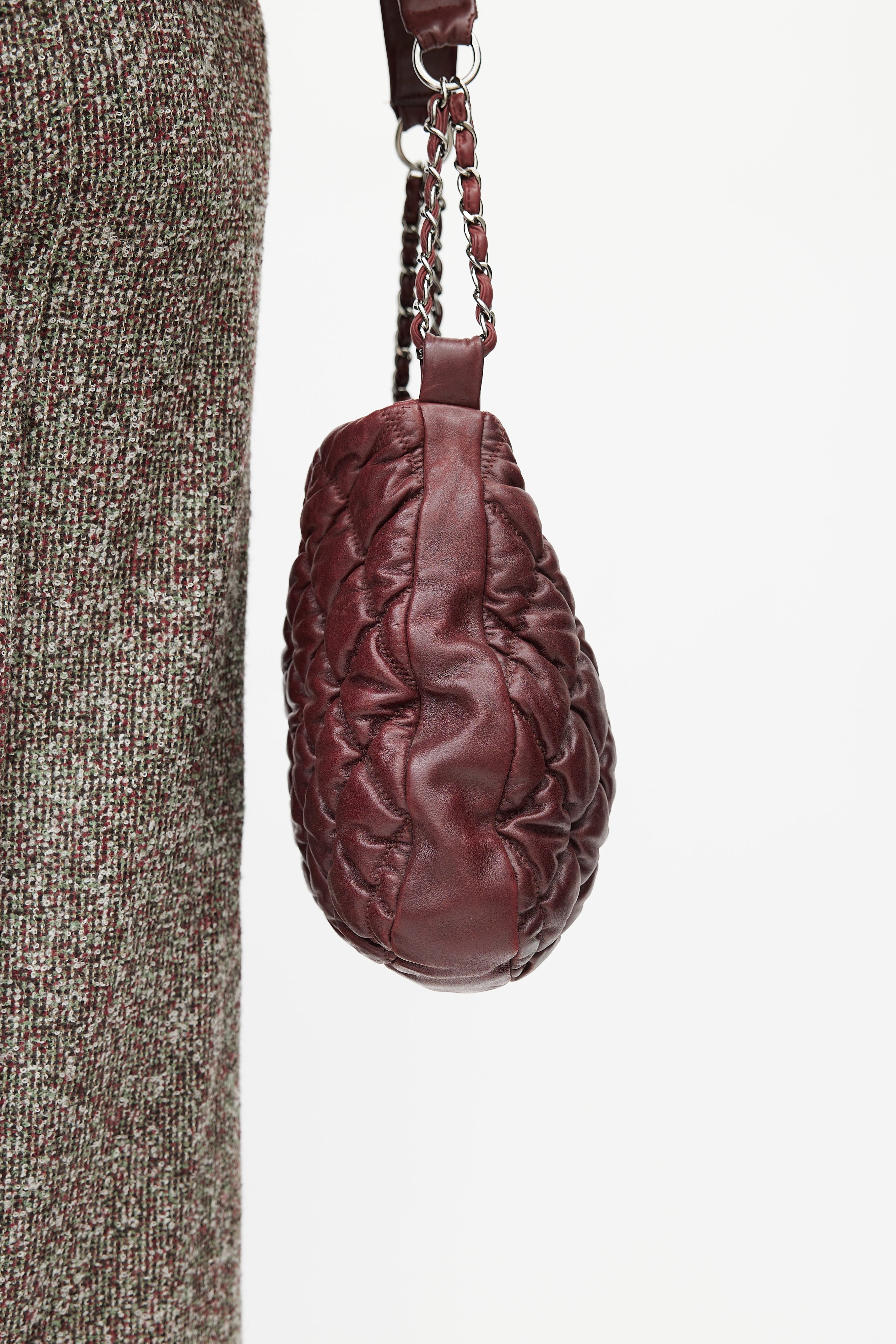 Pre-owned Chanel 2008 burgundy Bubble leather bag featuring a silver tone braided chainlink shoulder strap, quilted detailing throughout, one main compartment with two slip pockets and one zip pocket, and top snap closure with silver tone CC logo hardware.