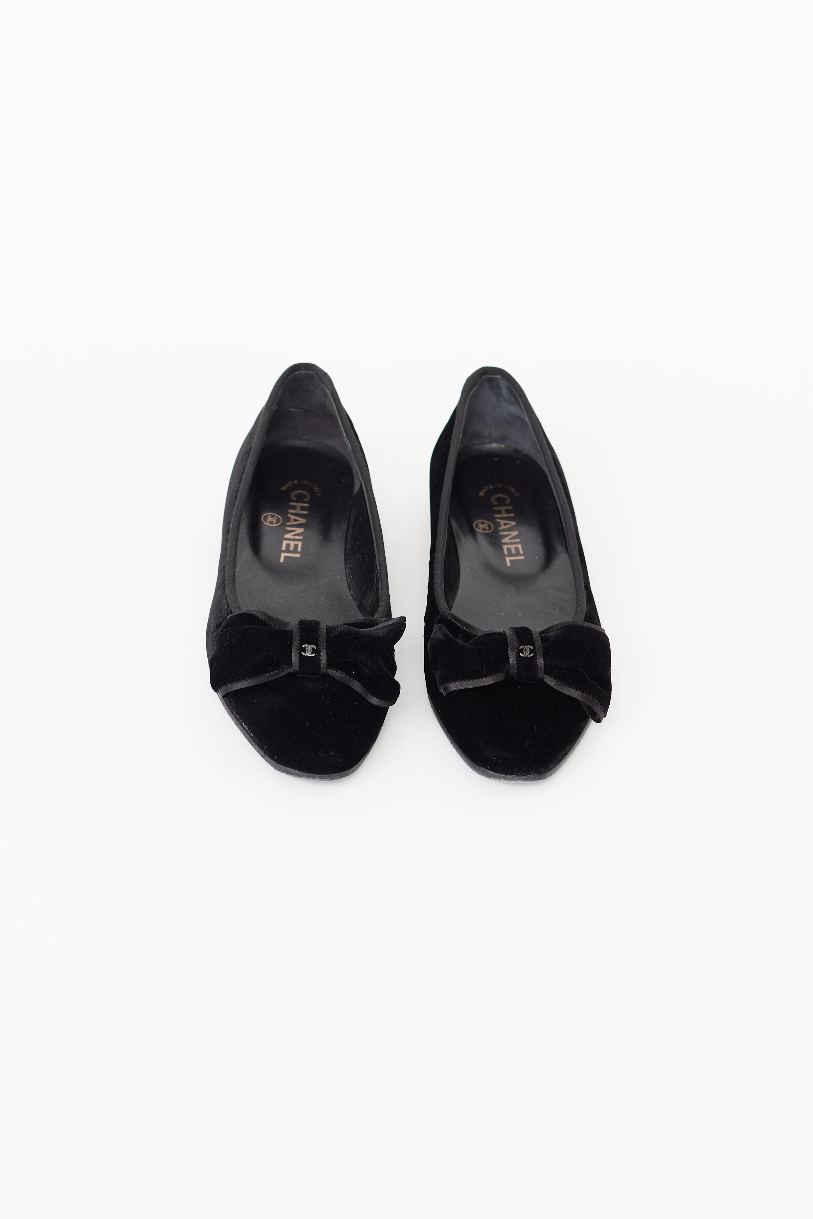 Pre-owned Fall 2004 Chanel black ballet flats featuring tapered square toe, attached bow at vamp, CC logo hardware at bow, slip on entry, and tonal grosgrain trim. Comes with original box and dust bag.