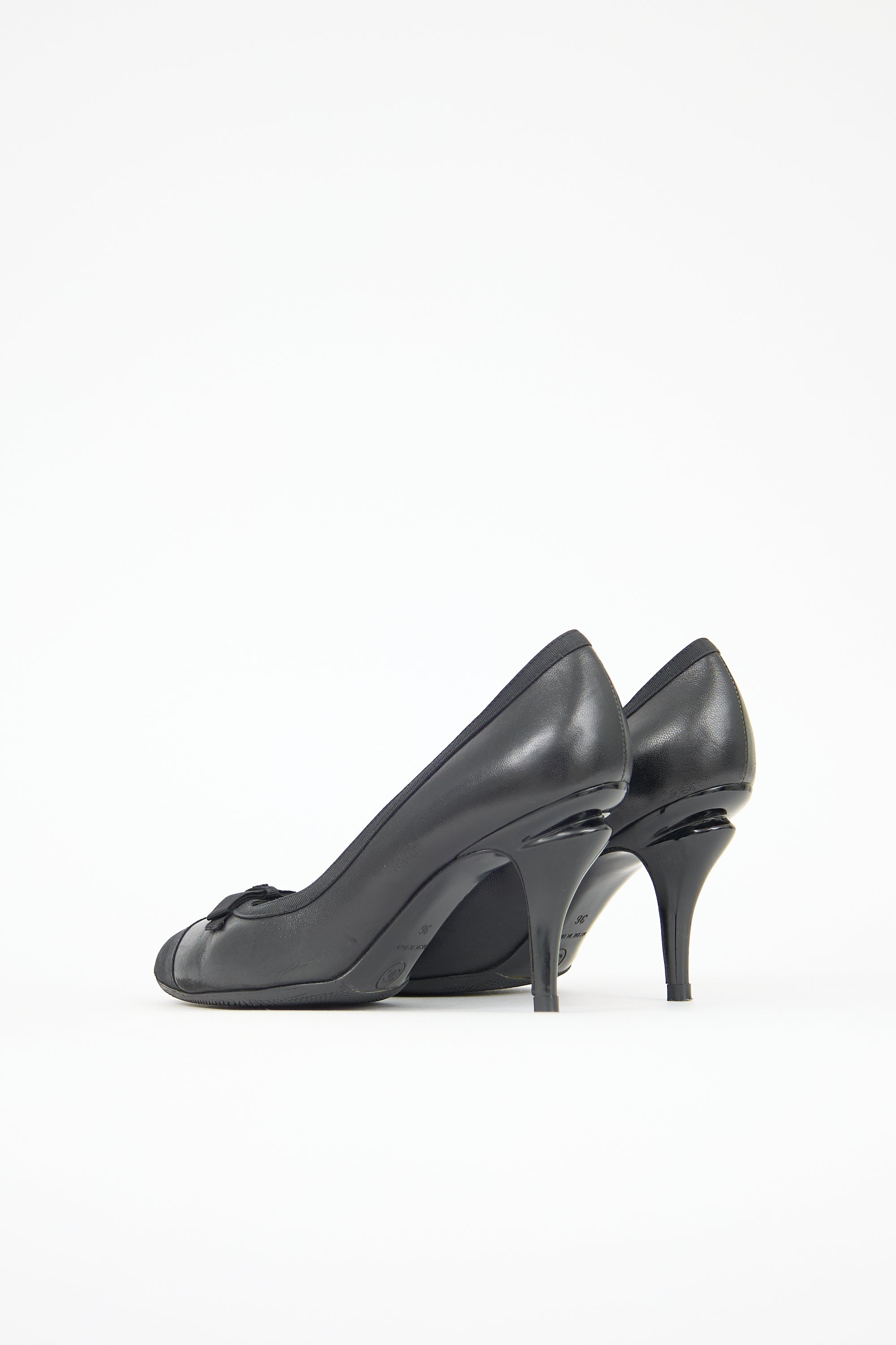 Pre-owned Chanel black leather pumps featuring a rounded toe with a grosgrain cap, grosgrain bow at vamp with tonal CC hardware, grosgrain trimmed collar, and a sculptural heel. Comes with original dust bags.