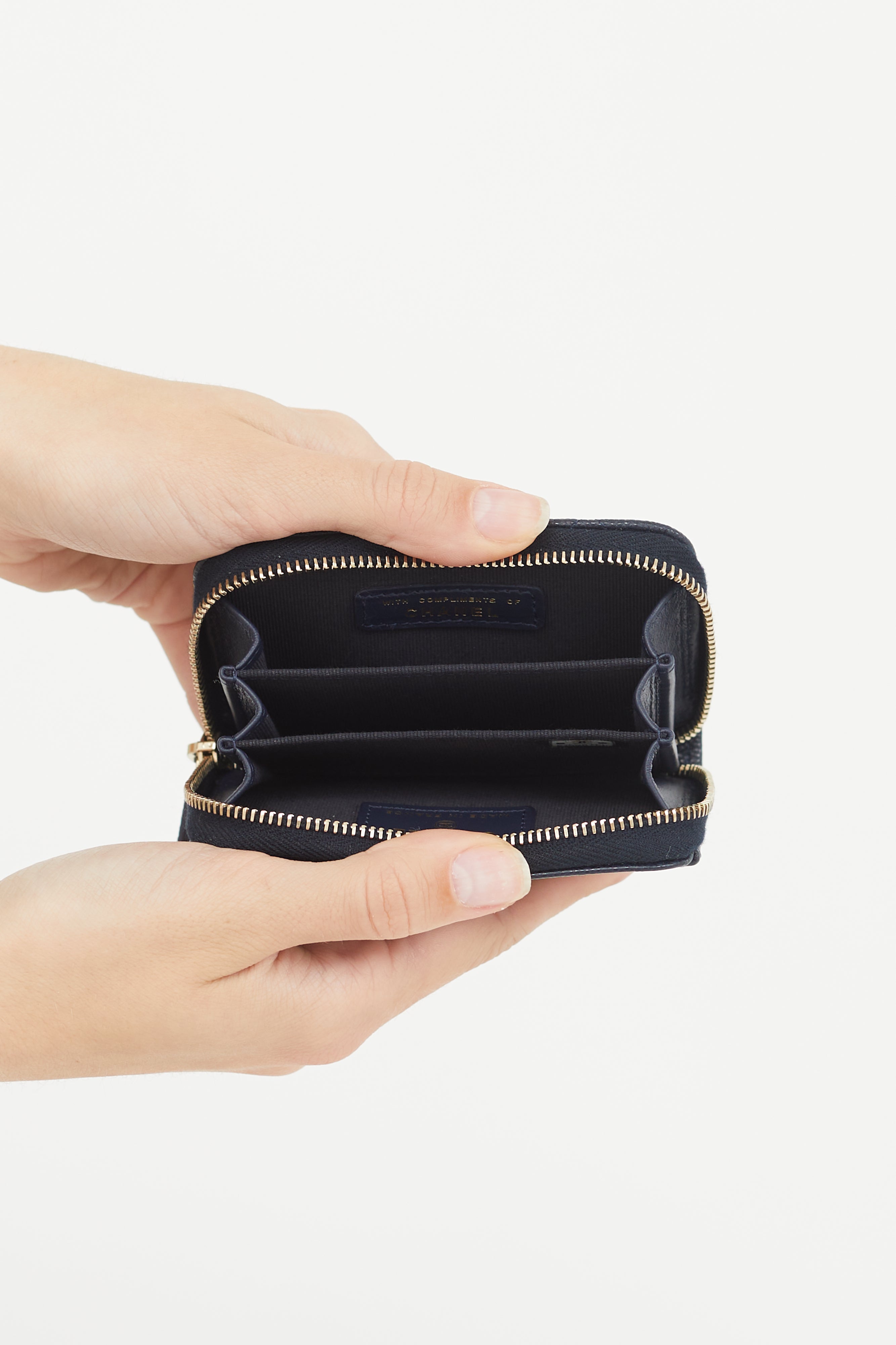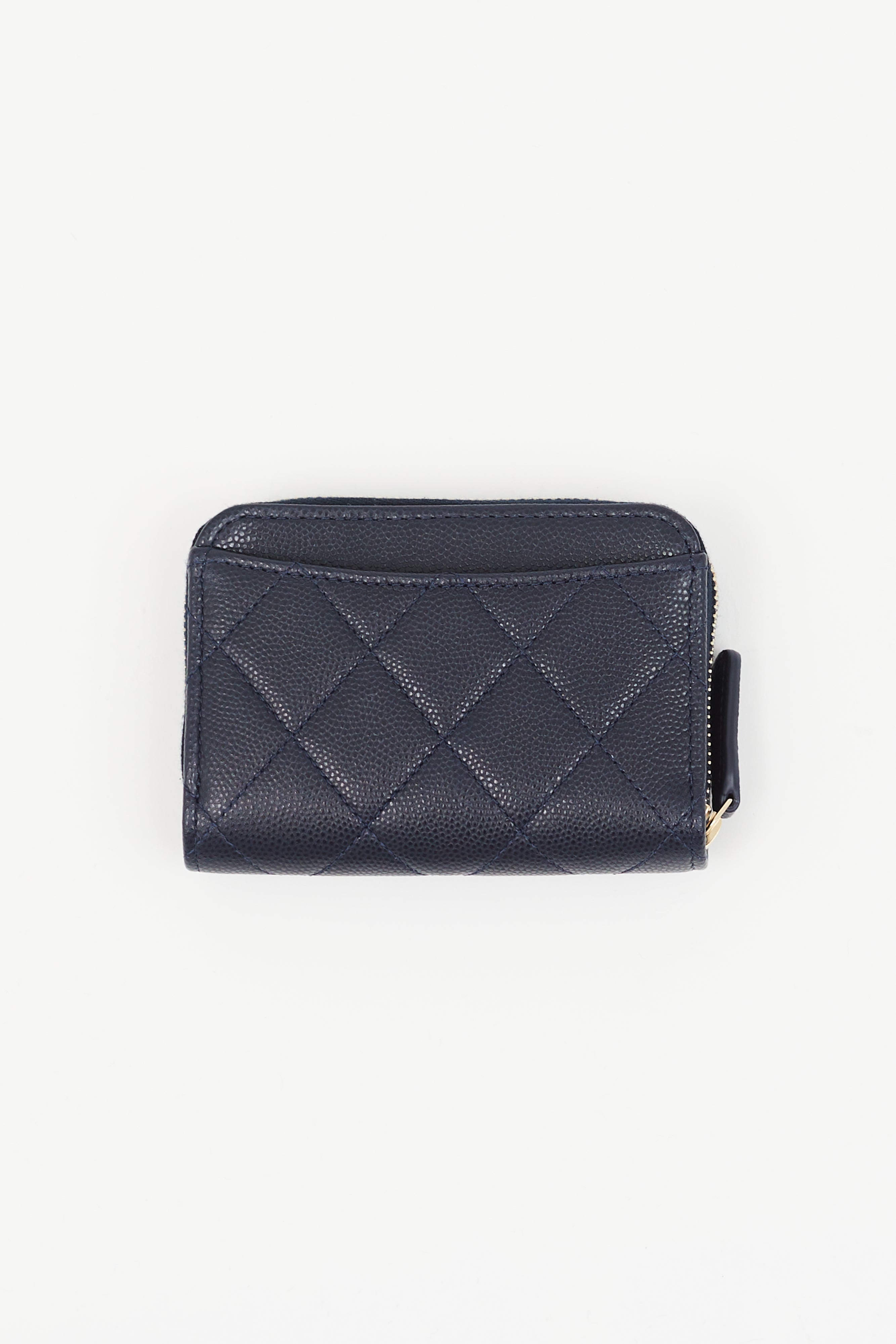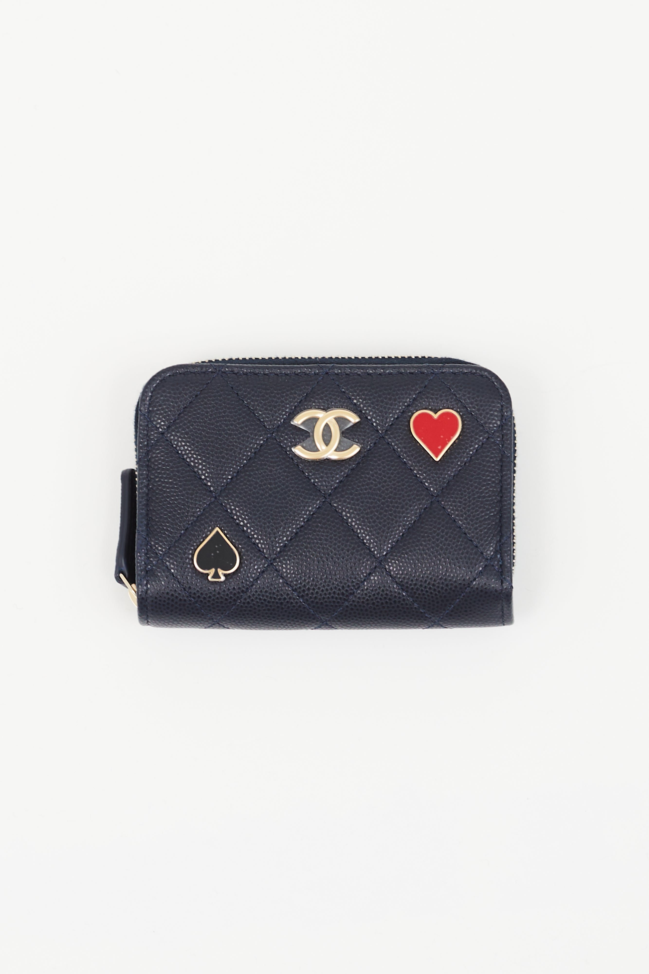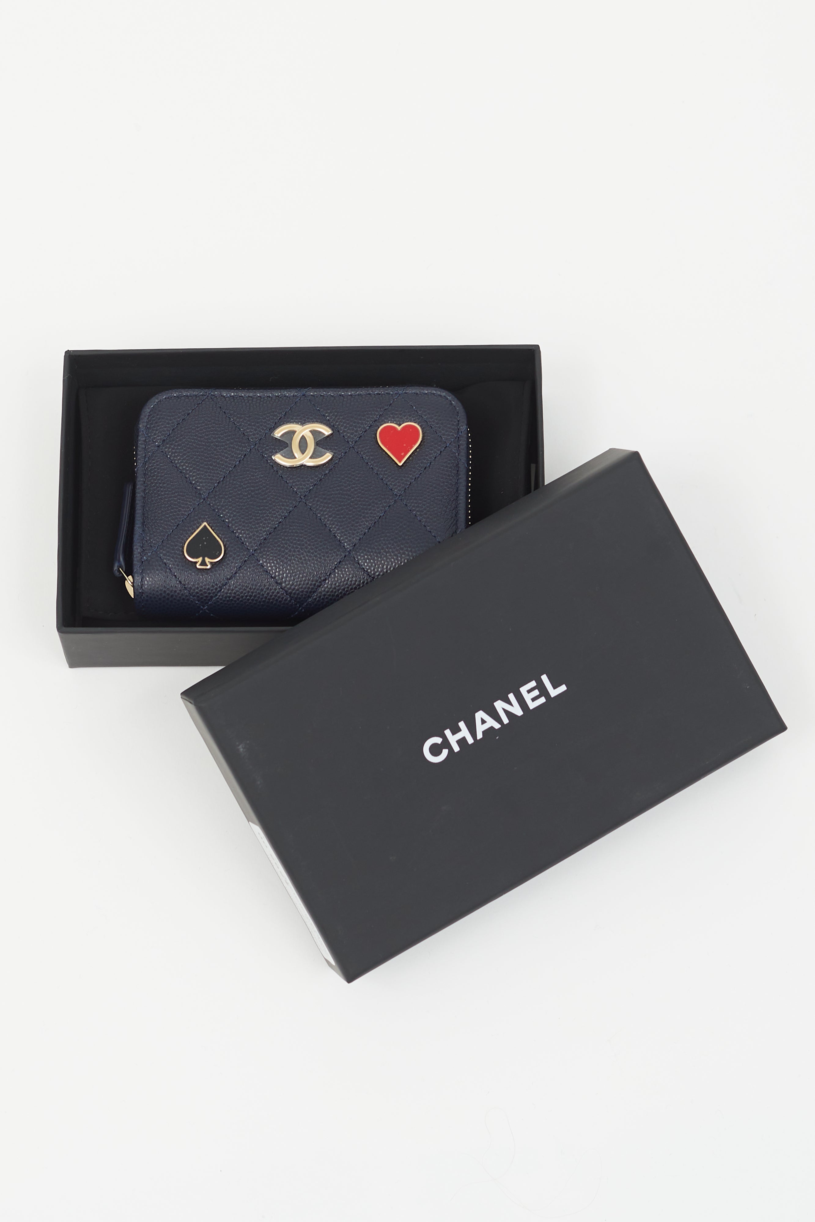 Pre-owned Chanel navy leather quilted playing card CC wallet featuring a tonal quilted pattern throughout, rectangular shape, gold tone CC hardware at centre front, playing card style enamel motifs at front, slip pocket at back, gold tone top zip closure with leather pull tab and three slip pockets at interior. Comes with original dust bag and box.