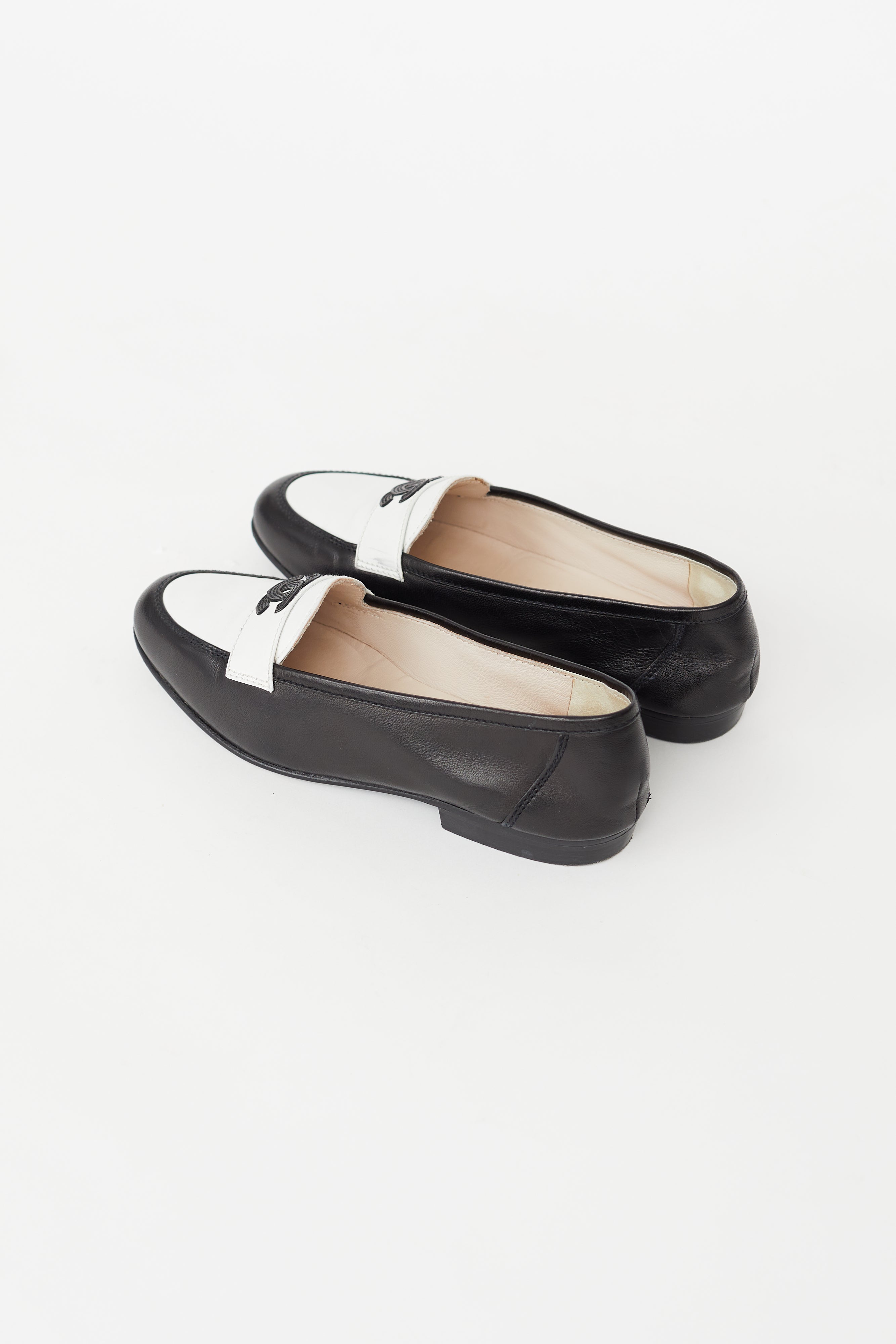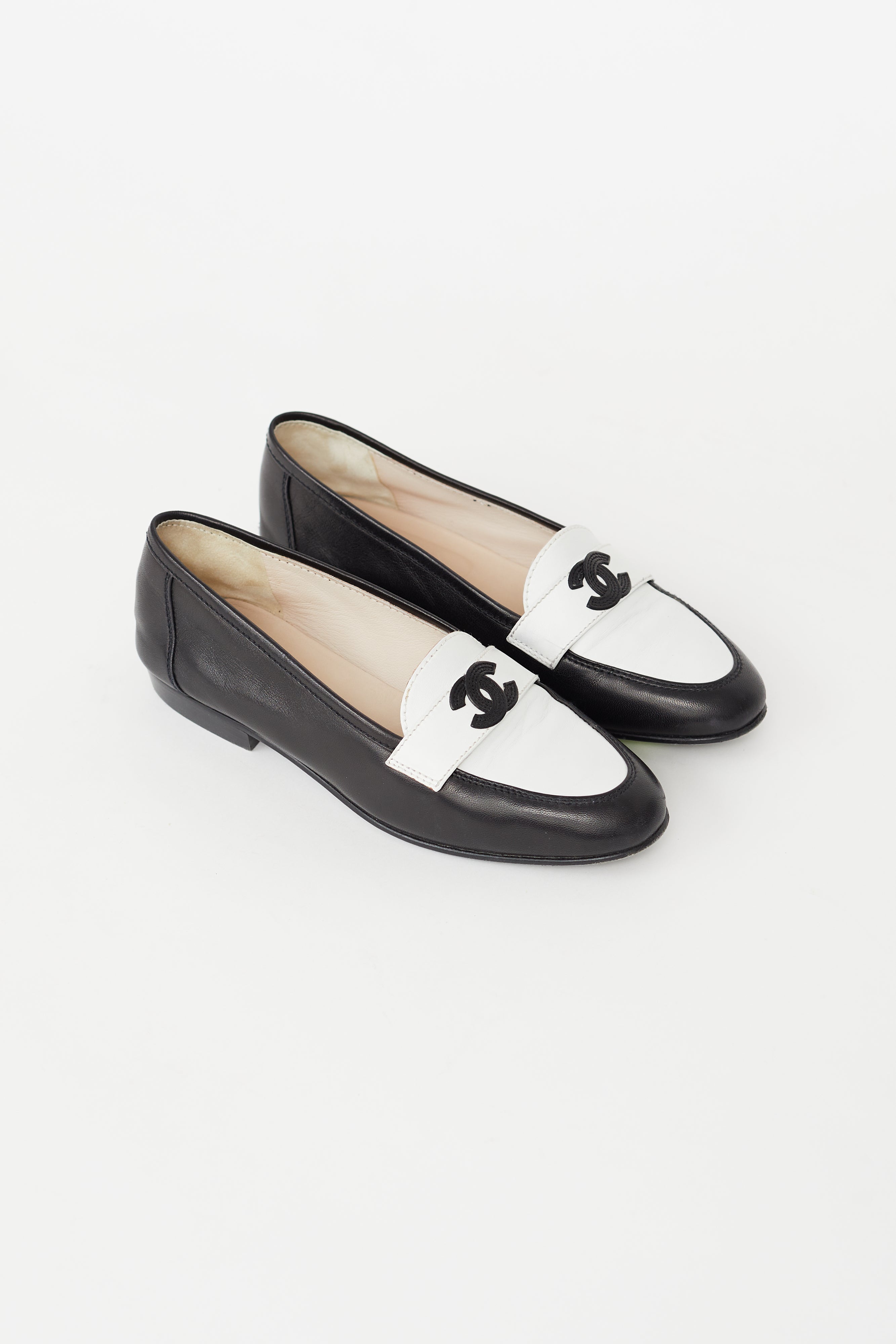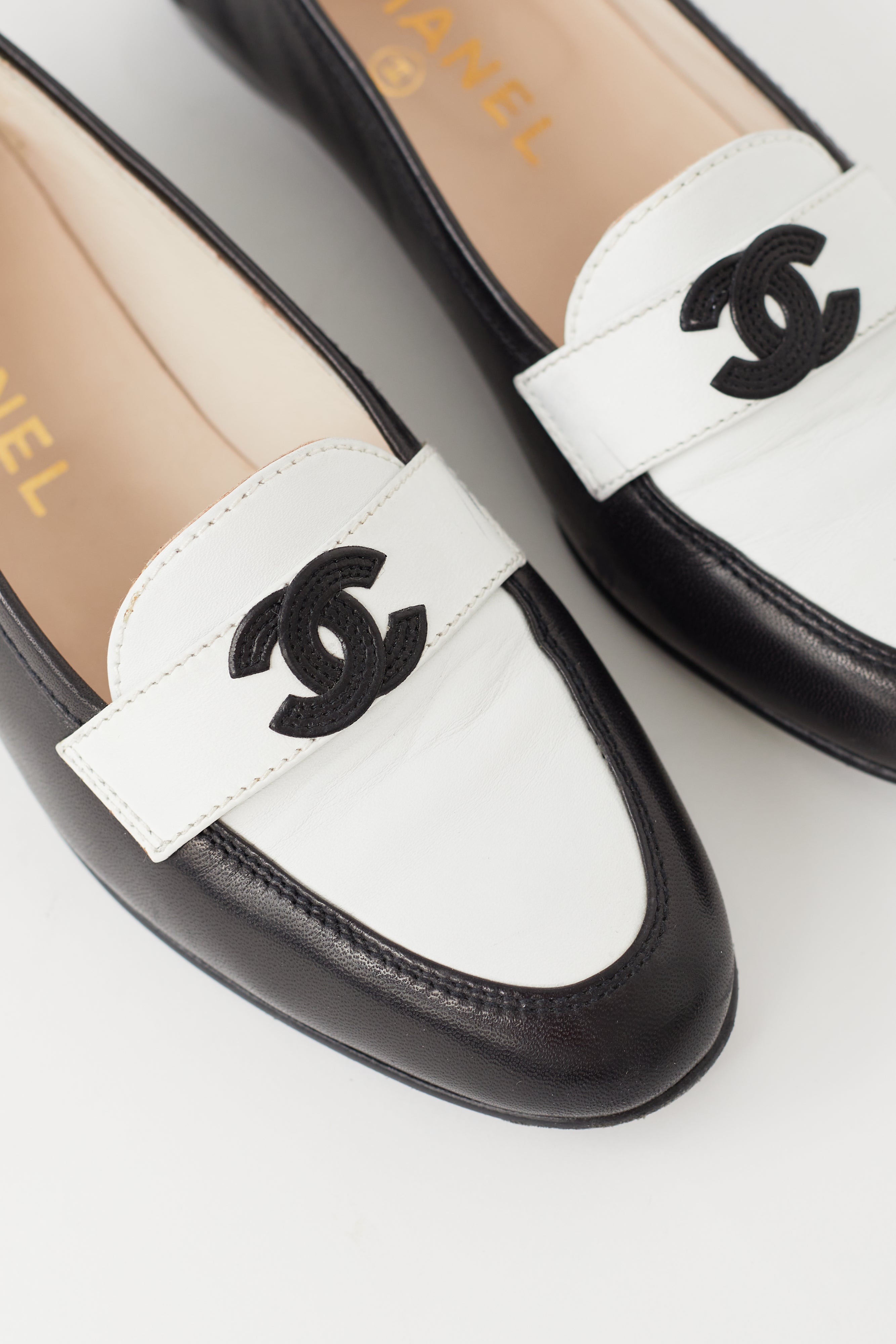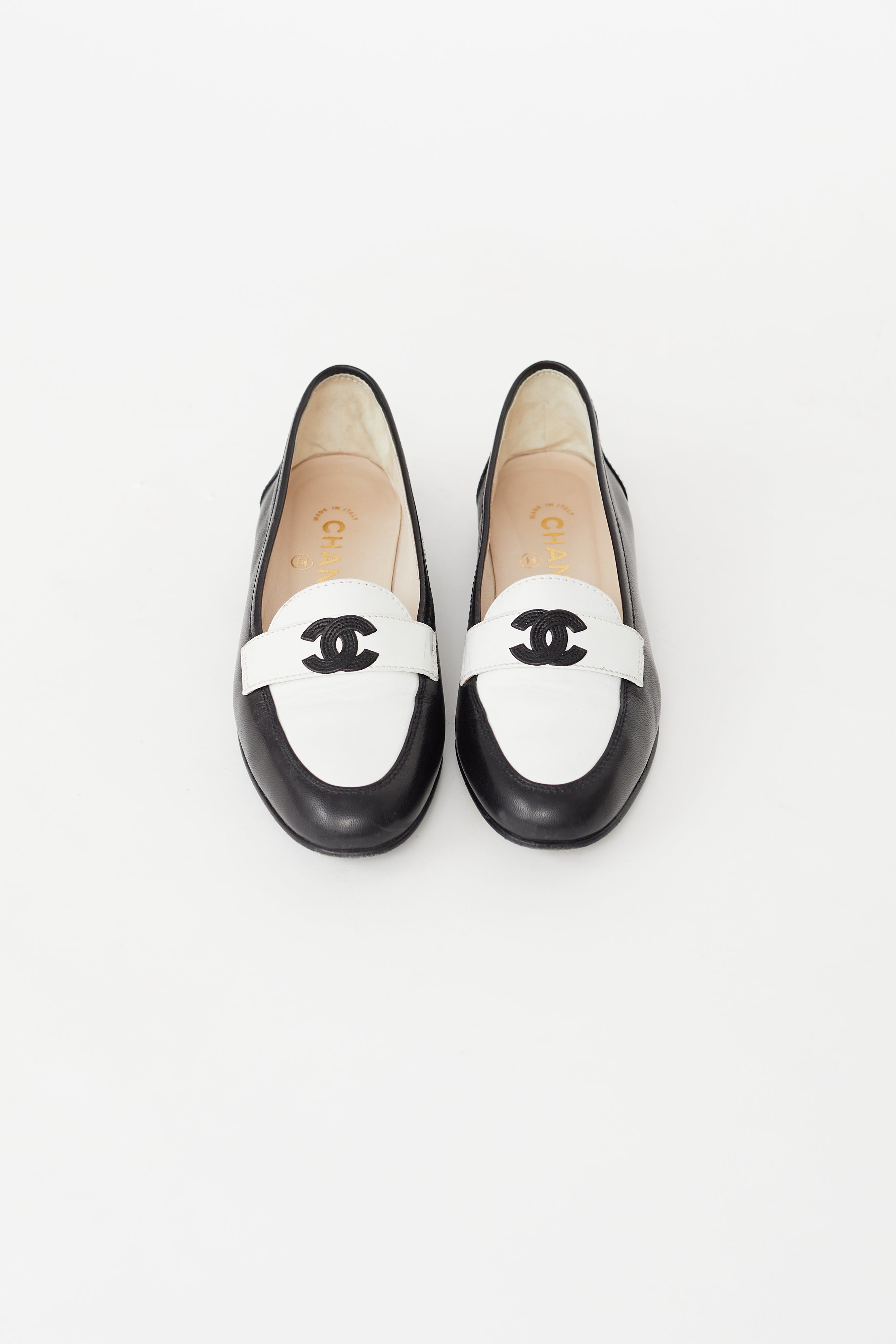 Pre-owned Spring 1994 Chanel black and white loafers featuring almond toe, white leather vamp, black CC logo at tongue, slip on entry, and stacked heel. Comes with original box.