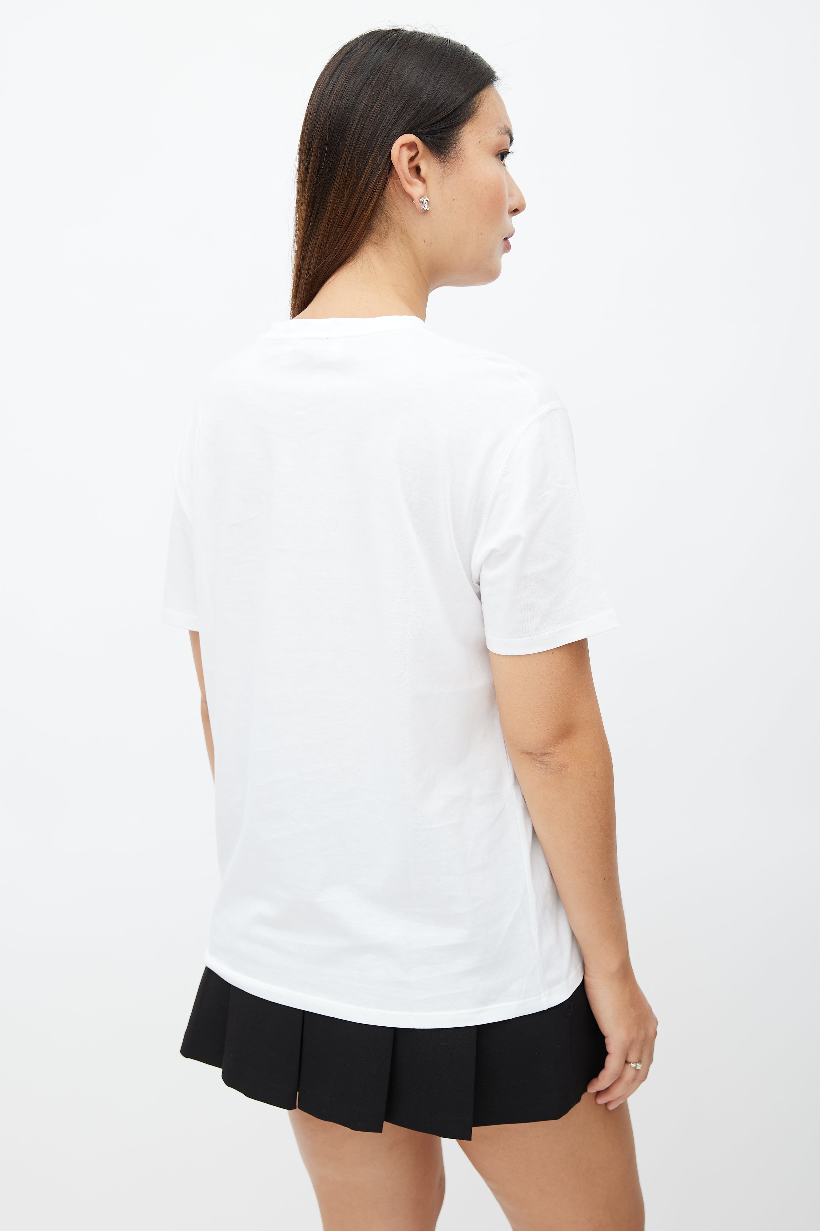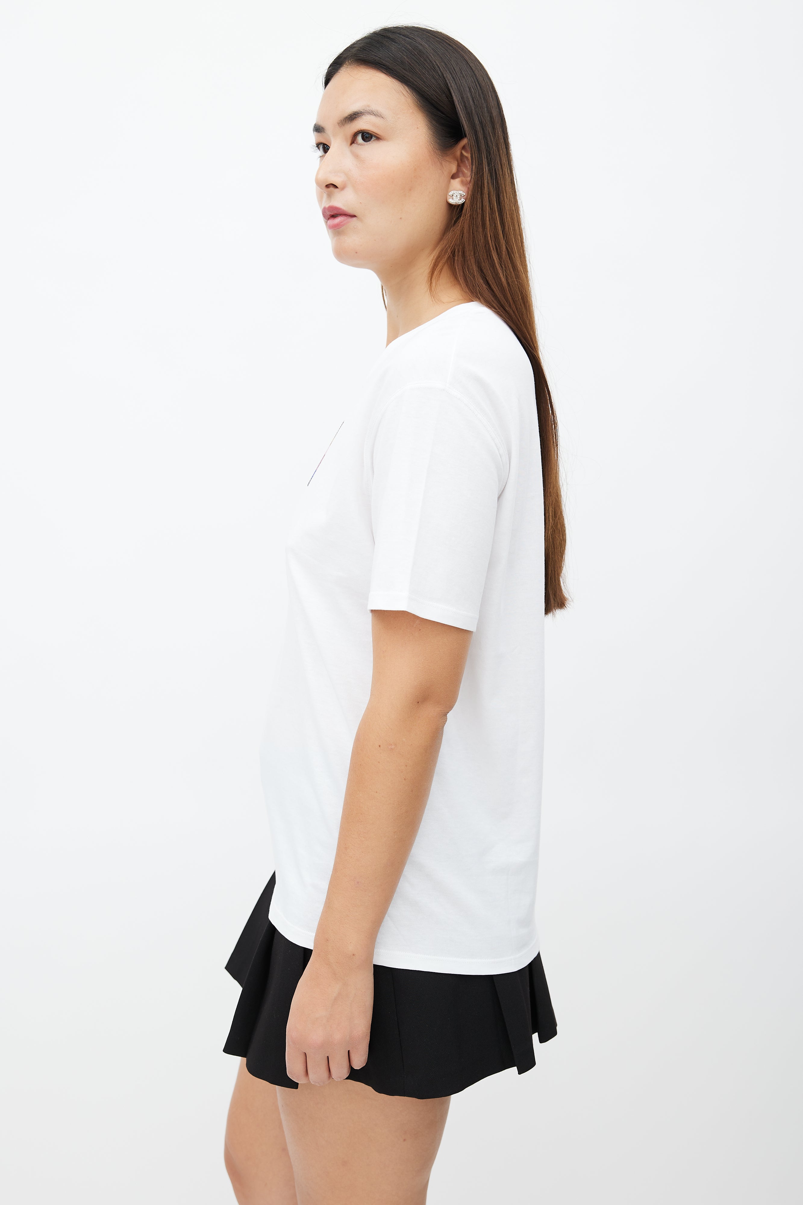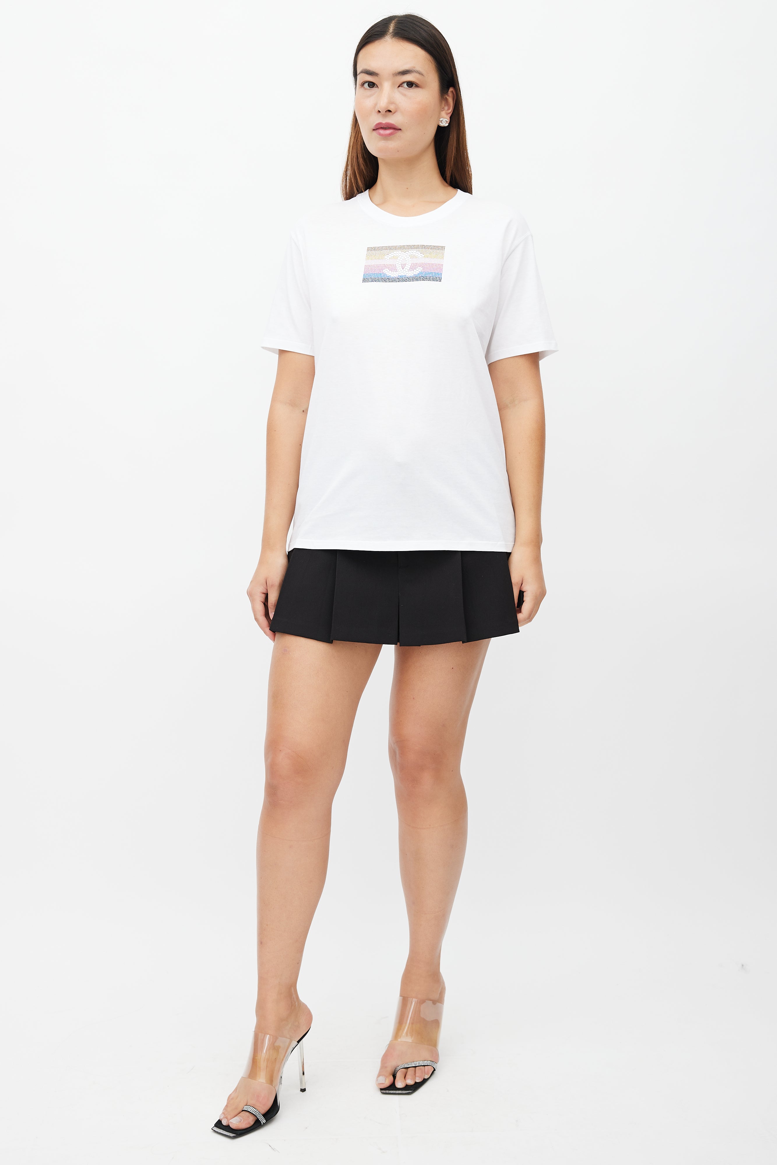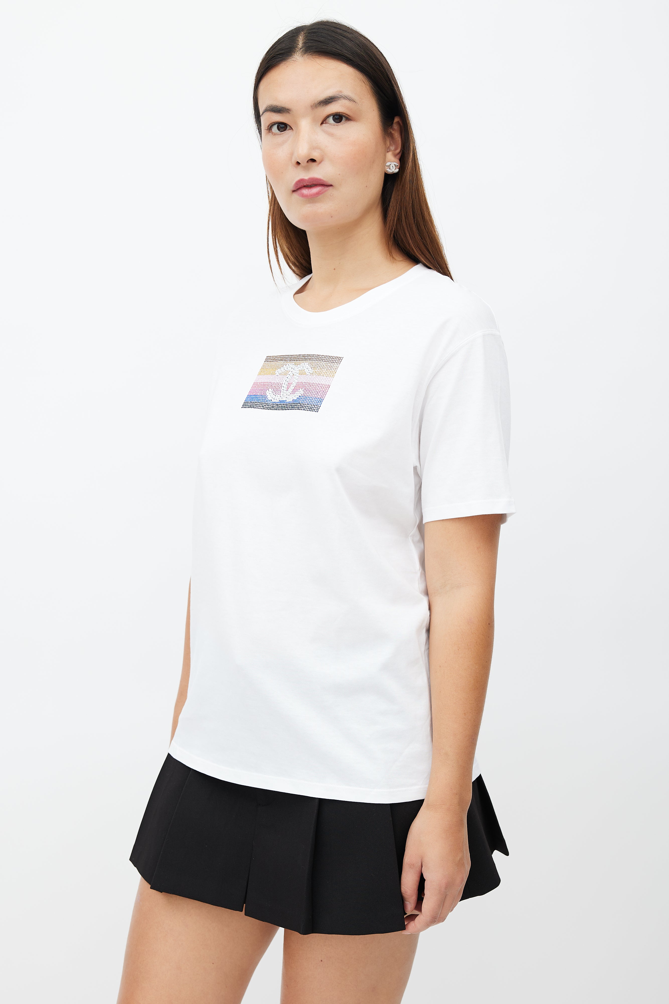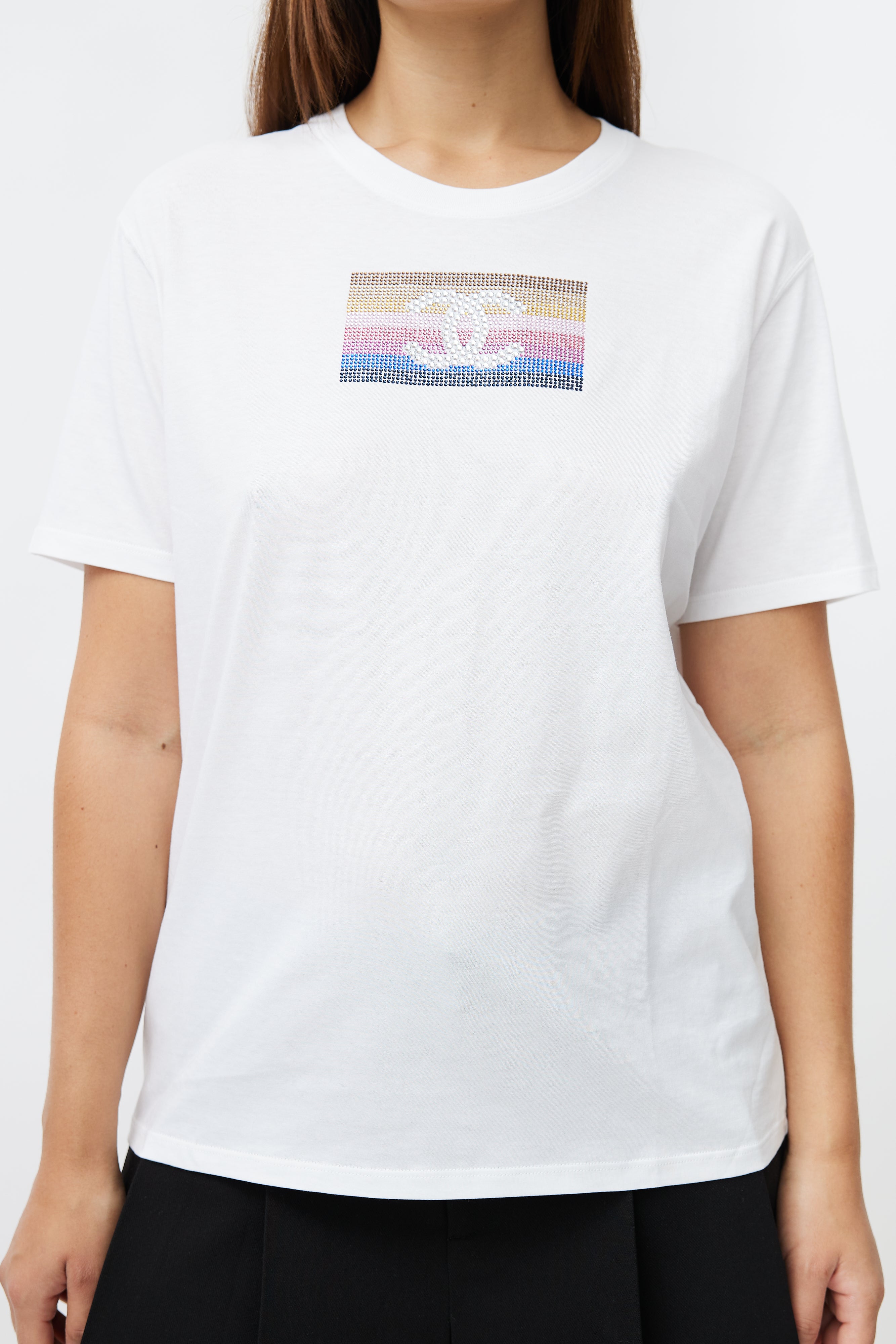 Pre-owned sample Chanel white T-shirt featuring crew neckline, short sleeves, and multicolour sequin flag and logo at front.