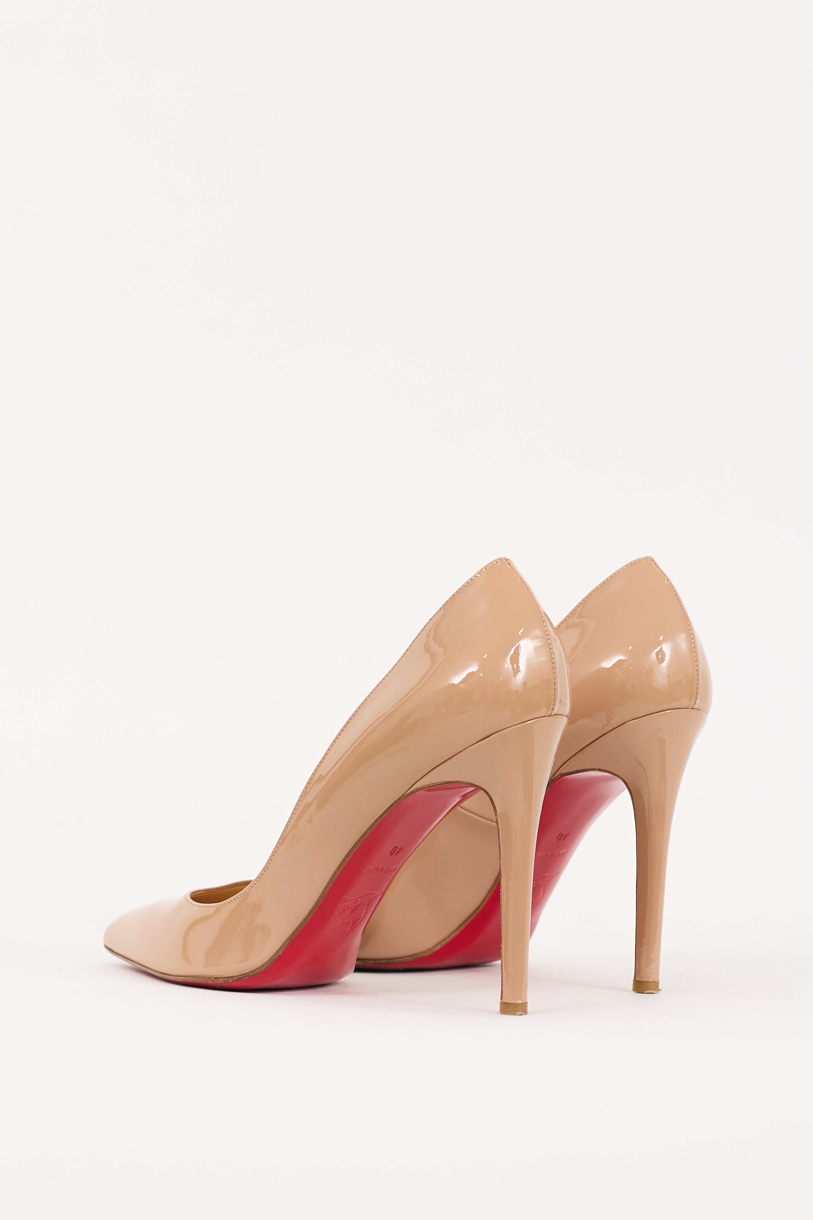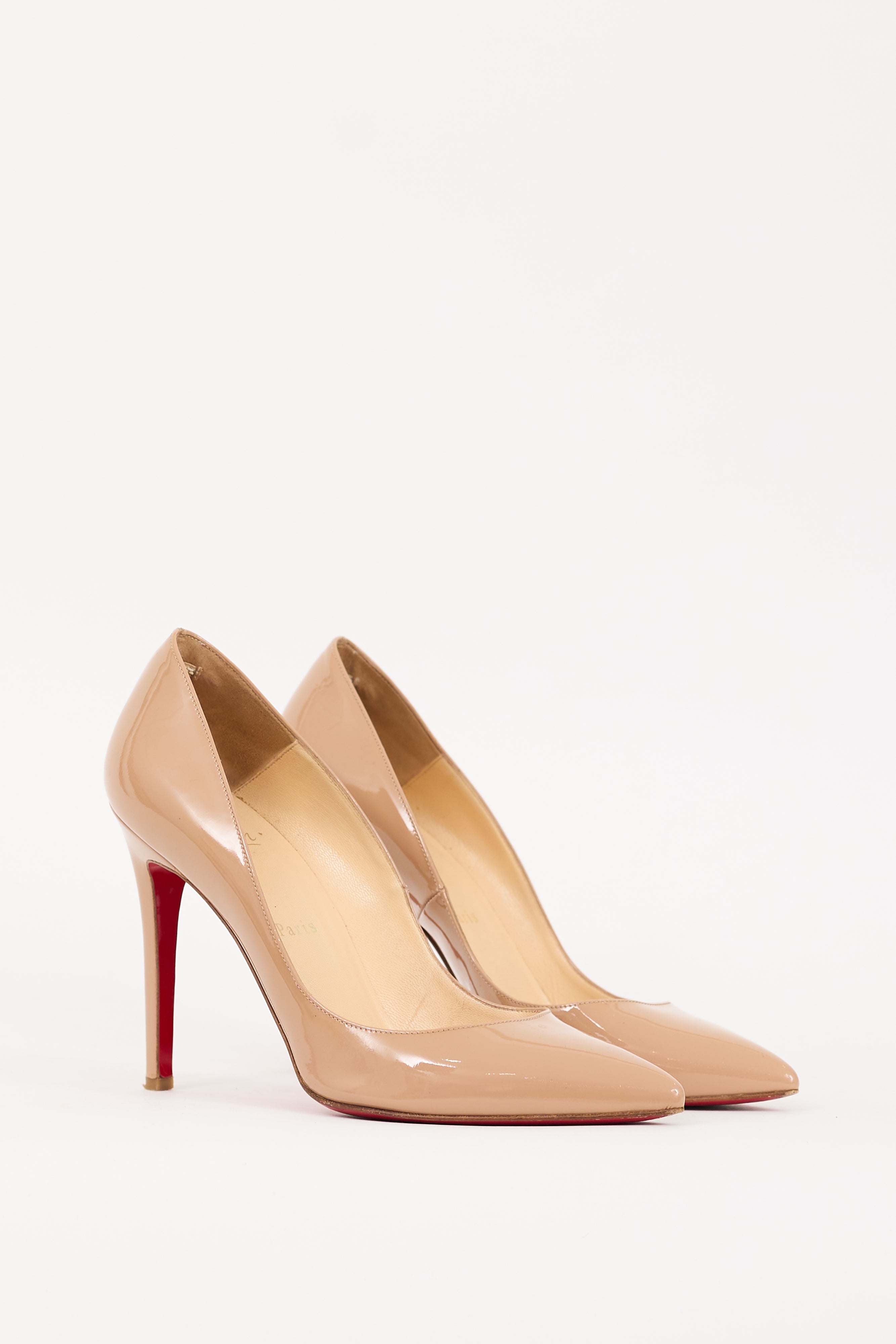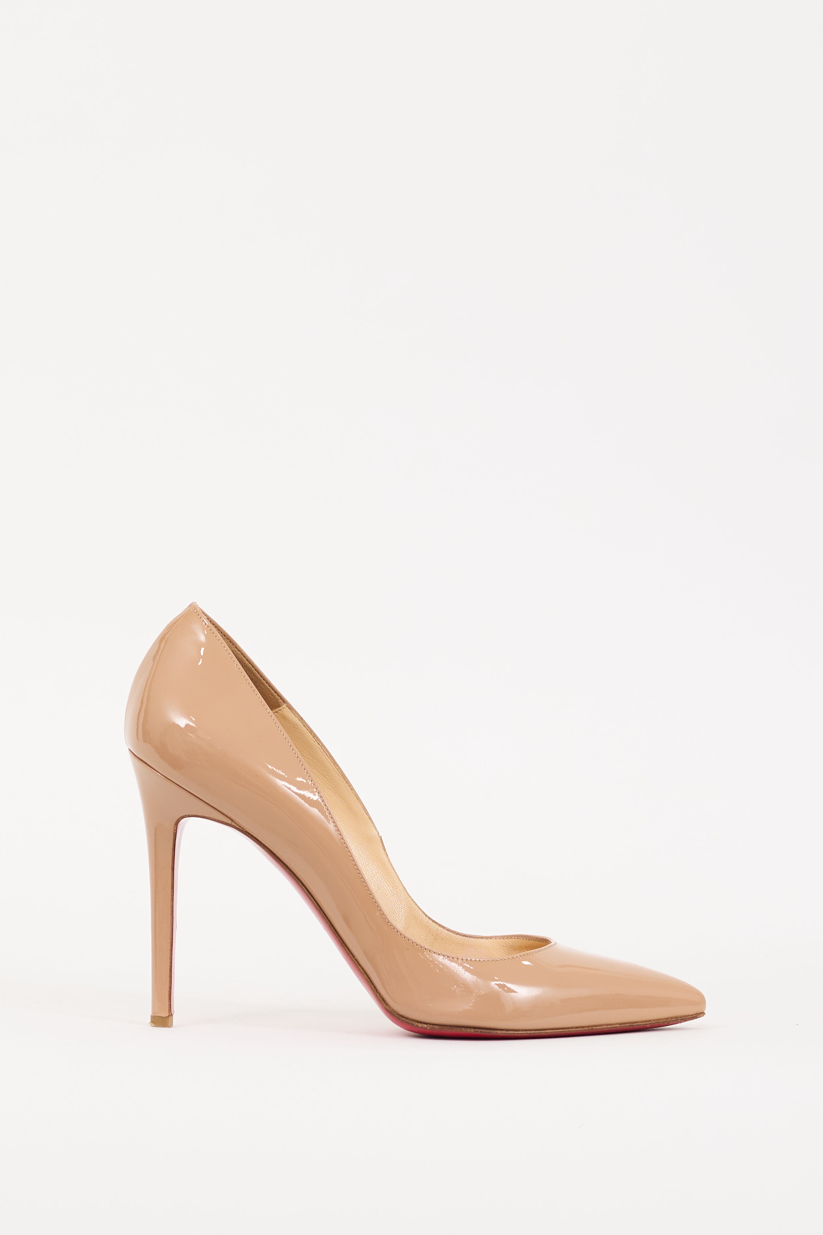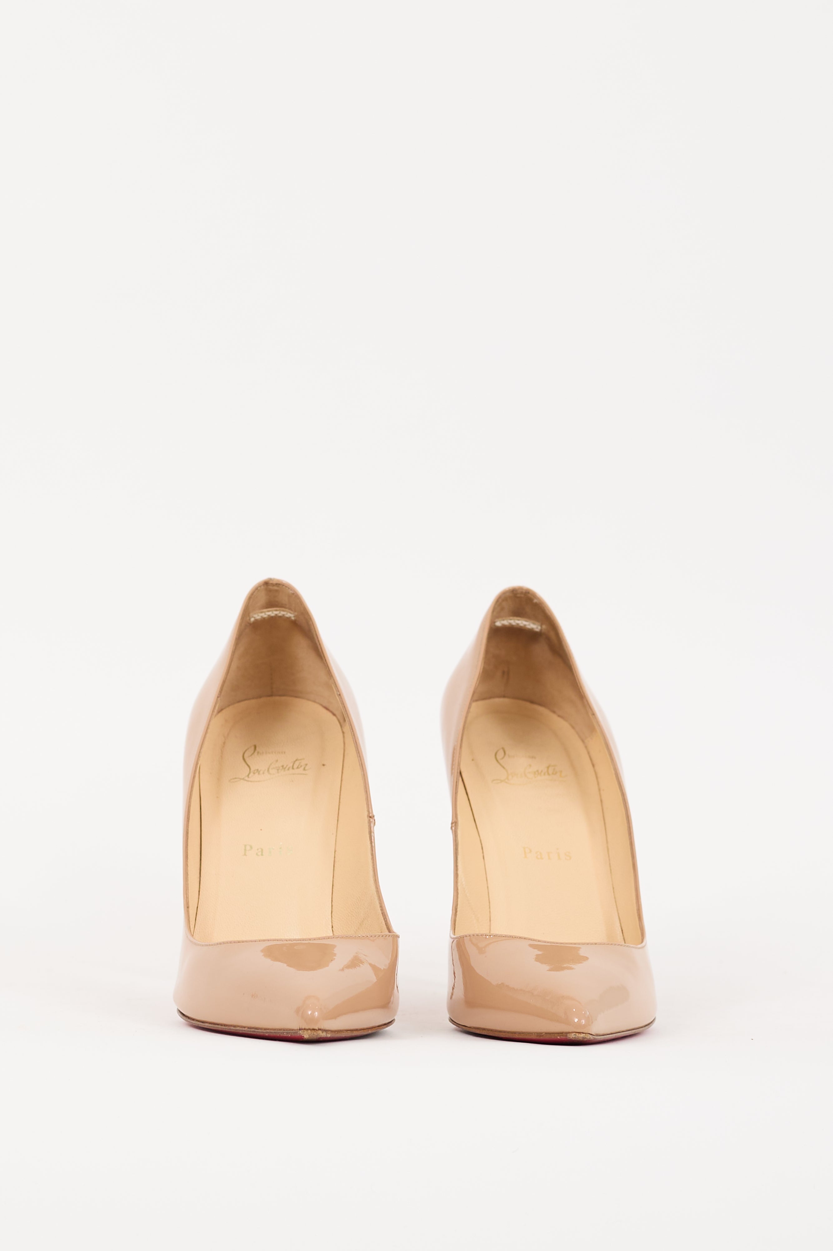Pre-owned Christian Louboutin beige patent leather So Kate 100 pumps featuring a pointed toe, tonal stitching, slip on entry, covered stiletto heel, and signature red lacquered sole. Comes with original dust bags.