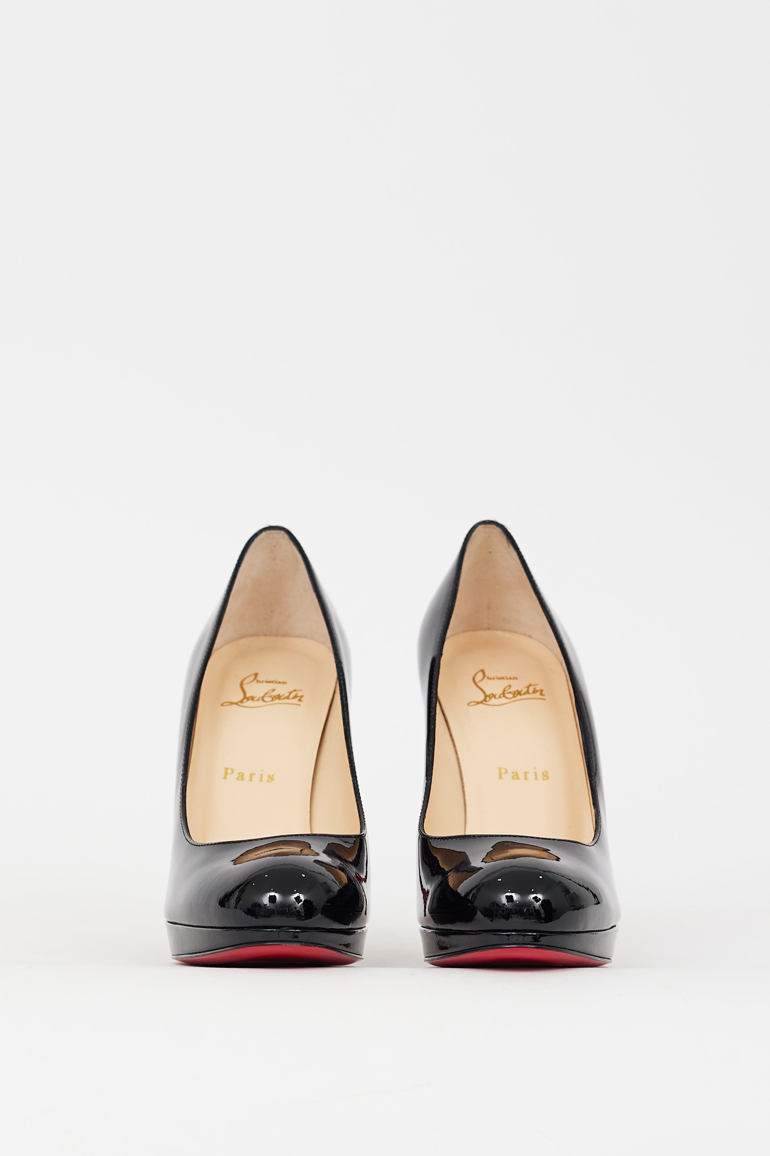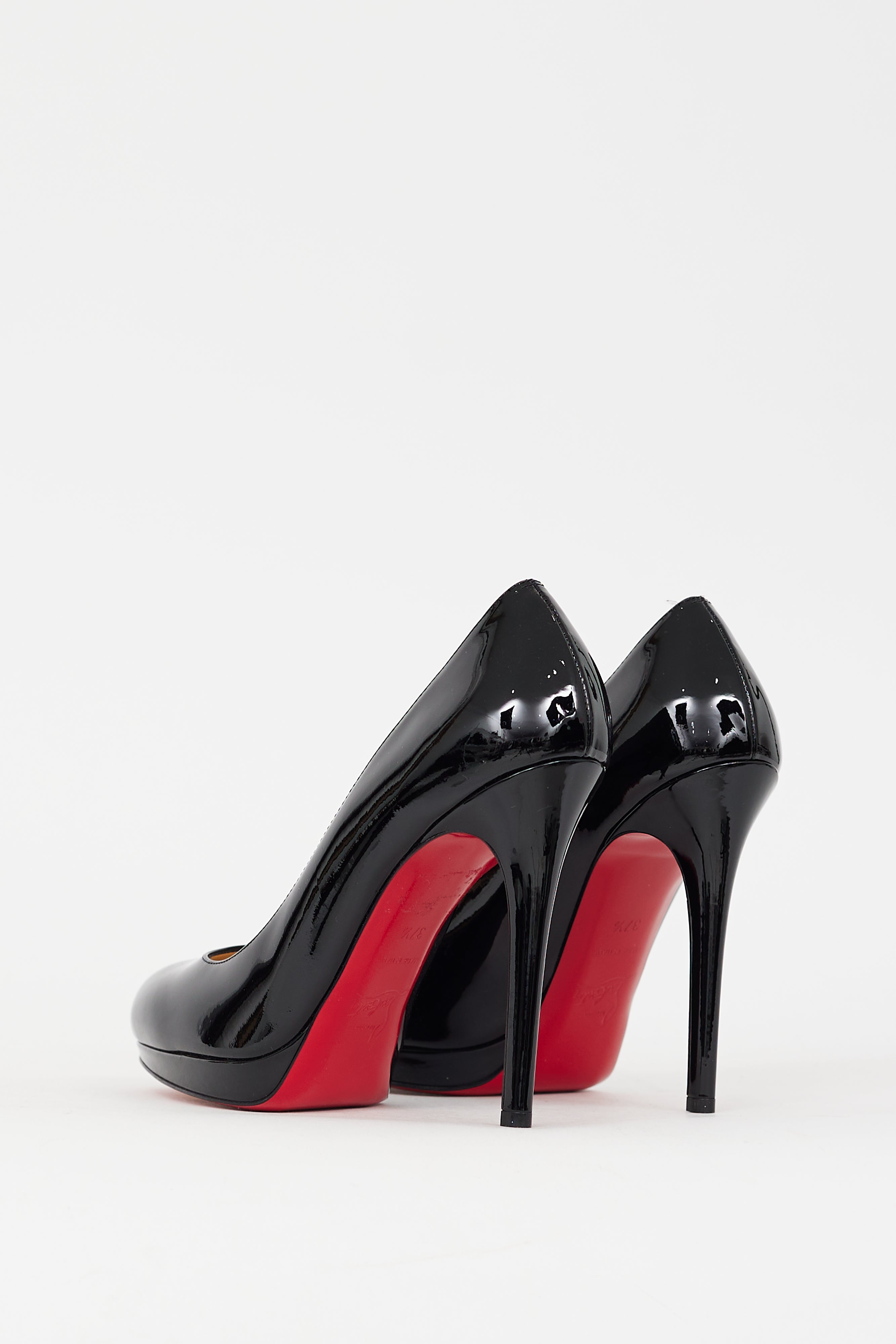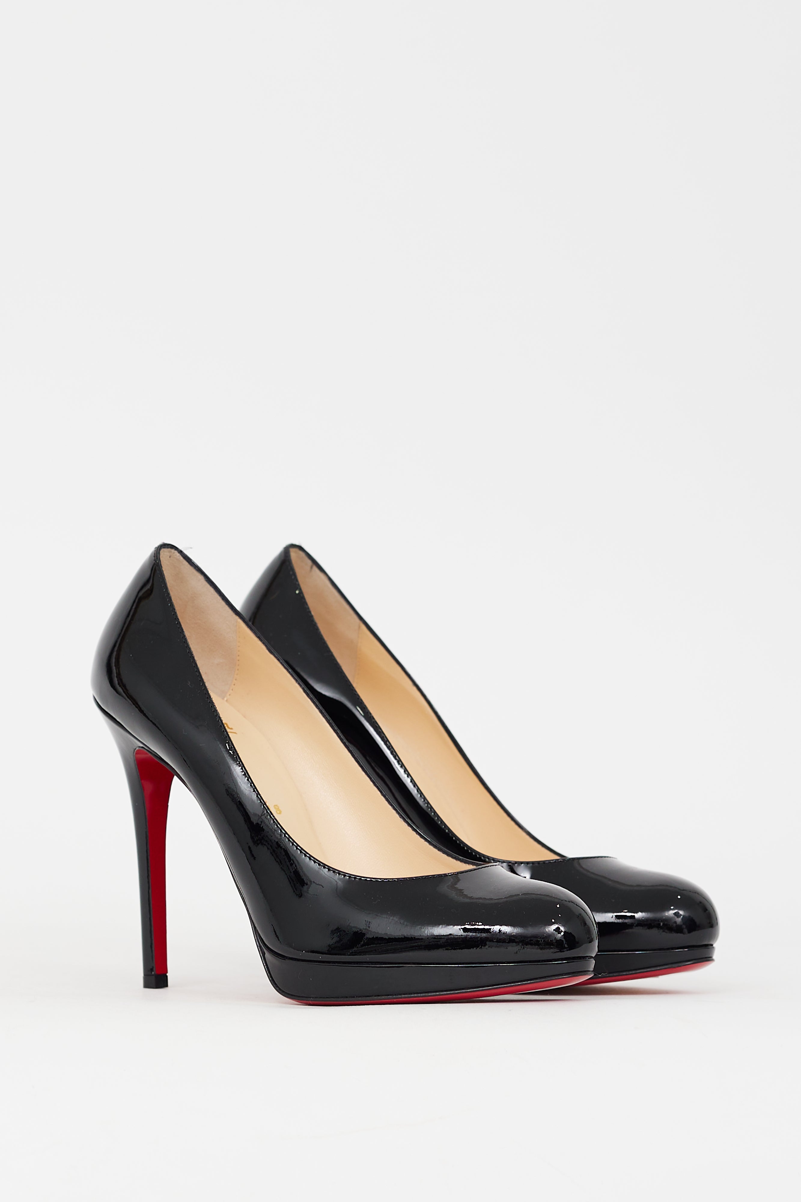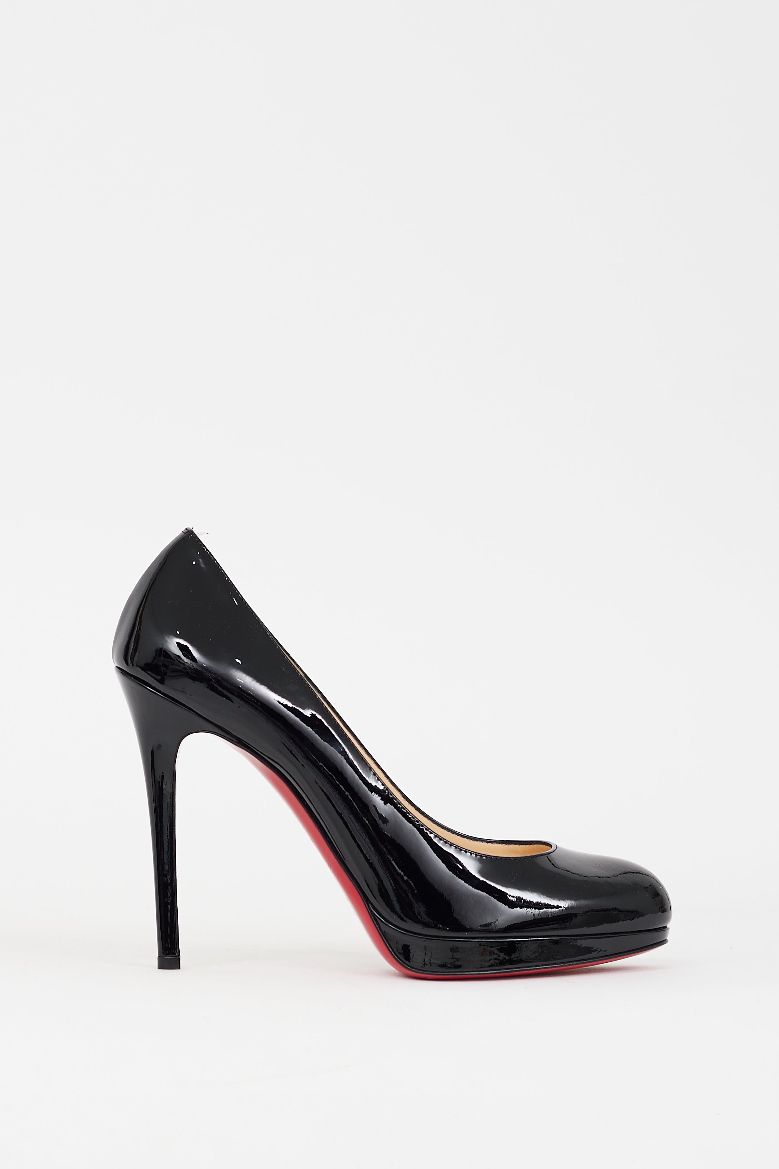 Pre-owned Christian Louboutin black patent leather New Simple 110mm pumps featuring rounded toe, slip on entry, platform toe box, stiletto heel, and signature red lacquered outsole. Comes with original dust bags.