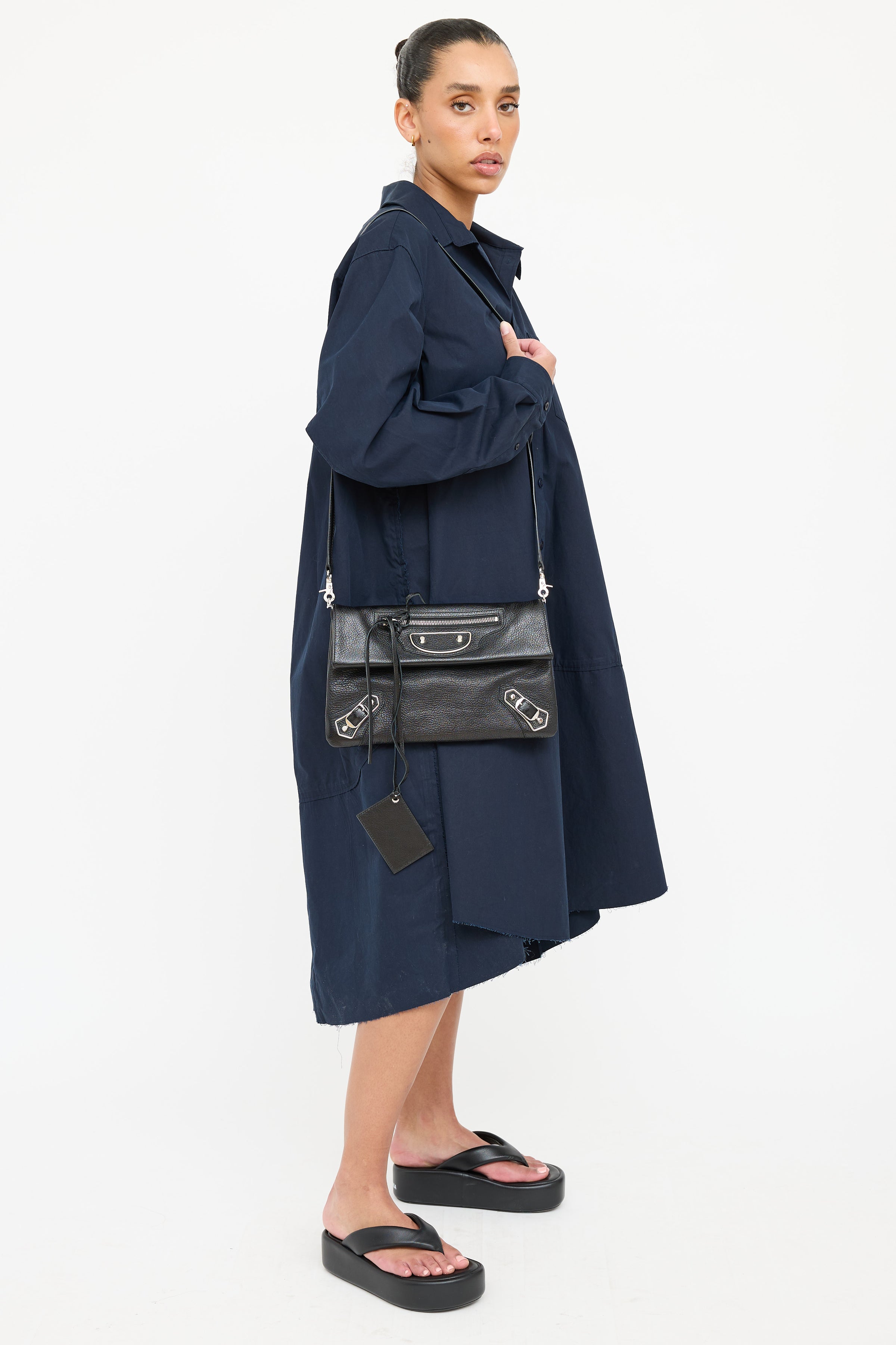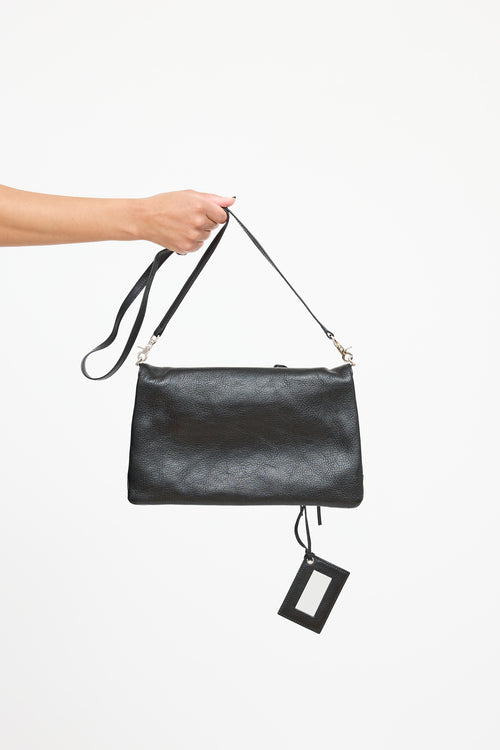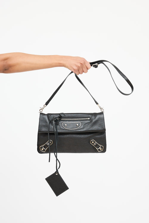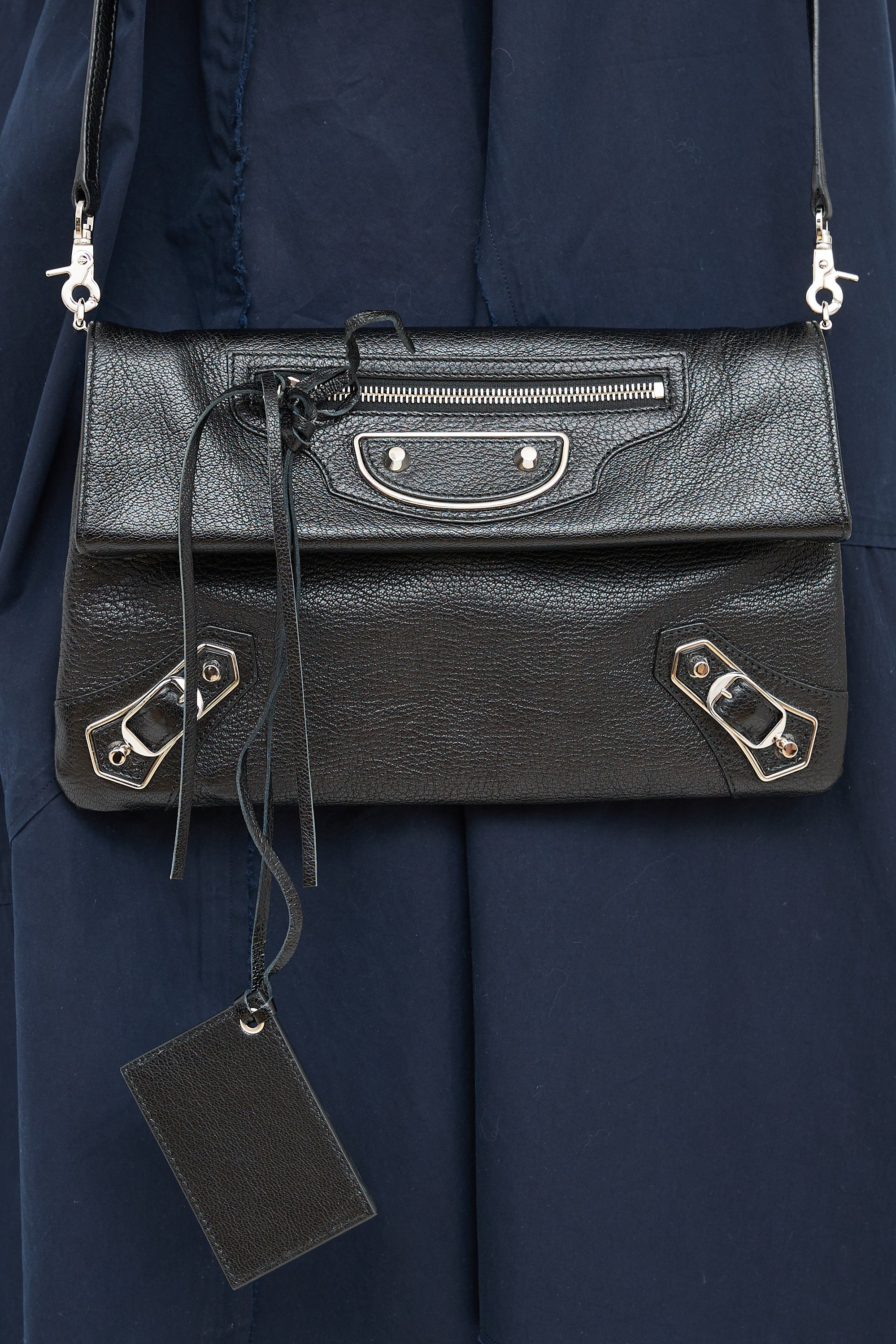 Pre-owned Balenciaga black Motorcycle Envelope Clutch Bag featuring silver tone hardware, zip pocket at front with tassel pull tab, detachable shoulder strap, fold over front flap with snap button closure, stud and buckle detailing and detachable mirror. Interior features two main compartment with one interior zip pocket.