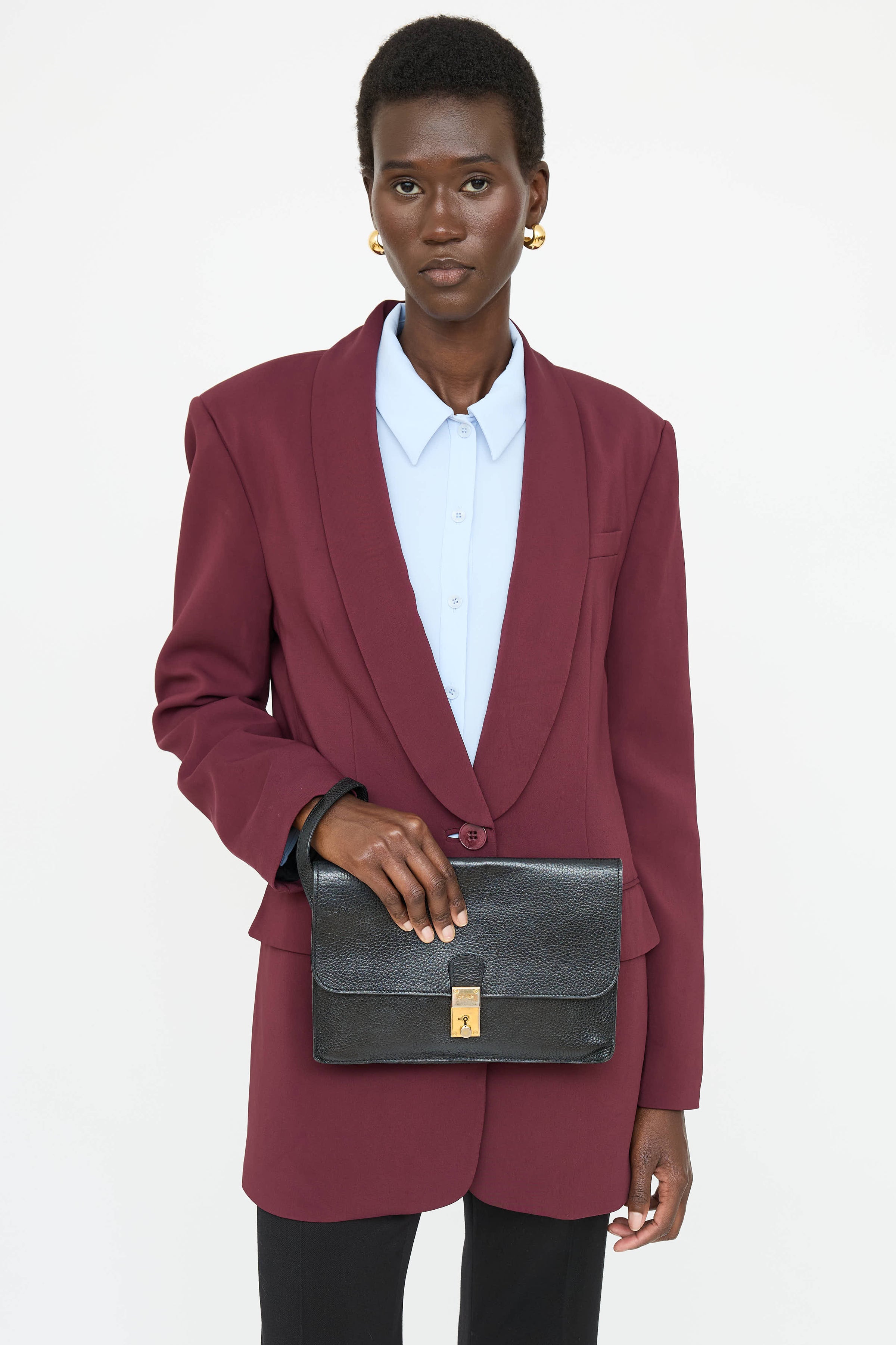Pre-owned Celine black pebbled leather wristlet featuring wrist strap, gold tone push clasp, top flap with interior slip pocket, and one main compartment and one zip pocket.