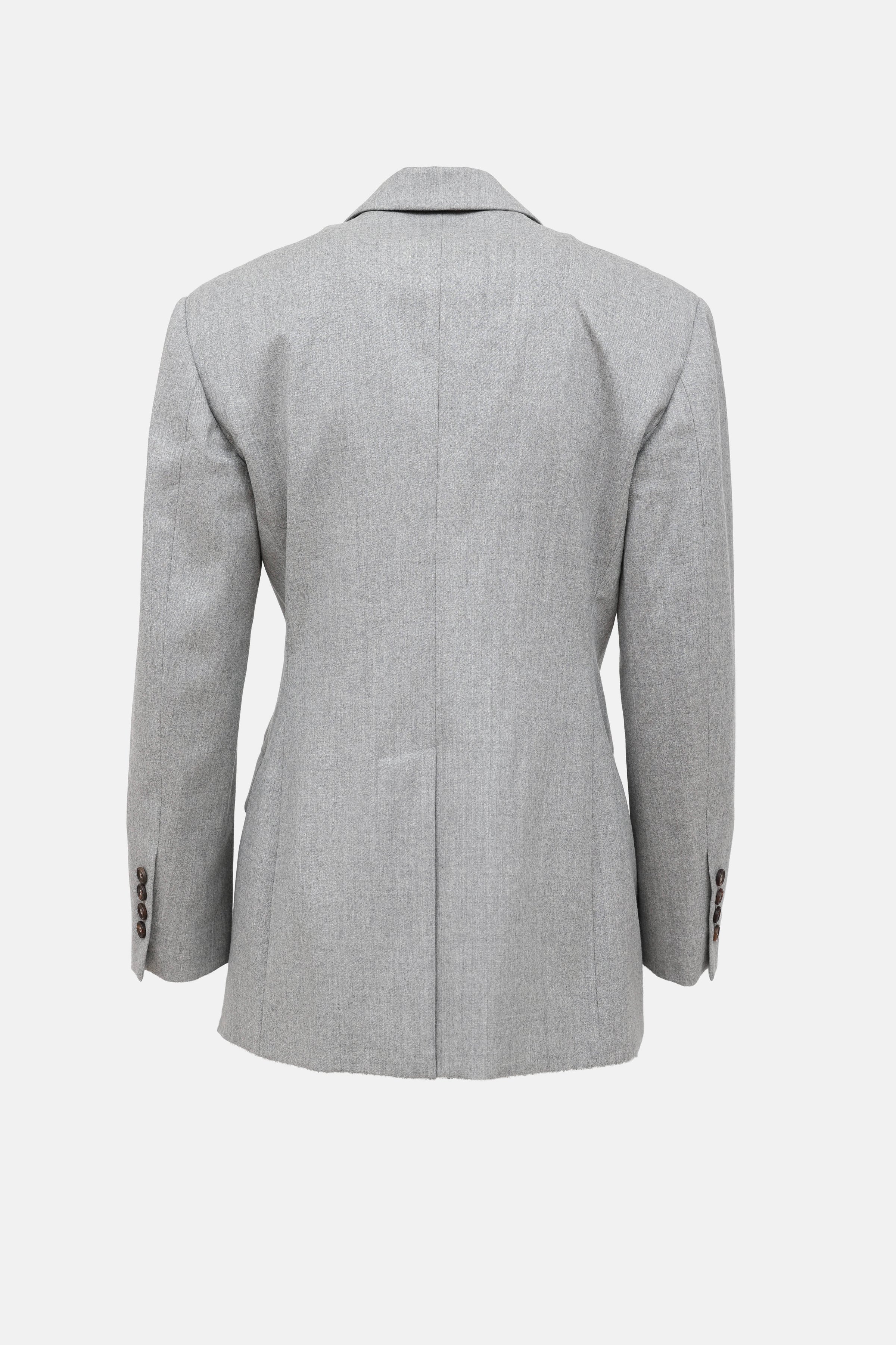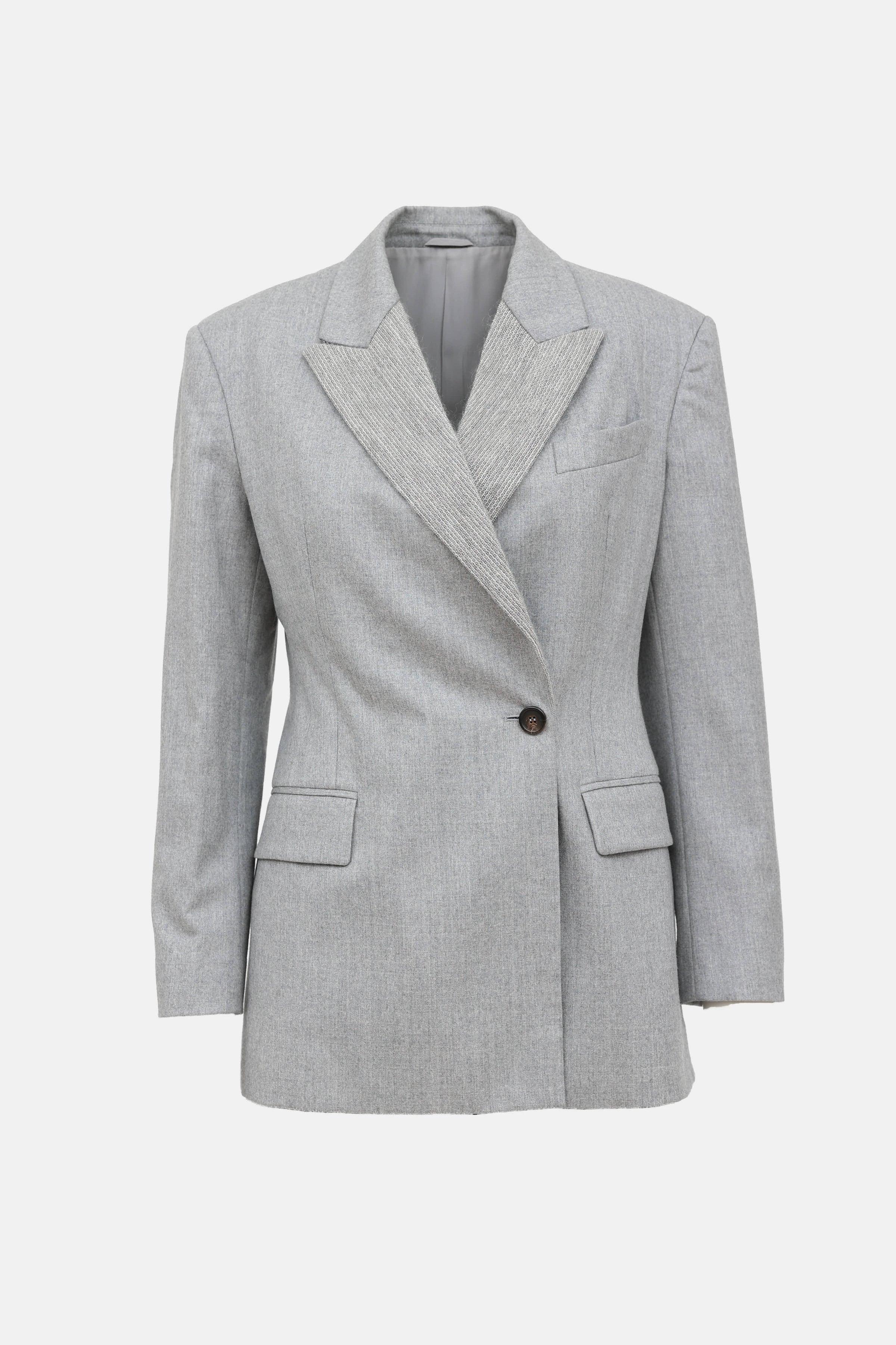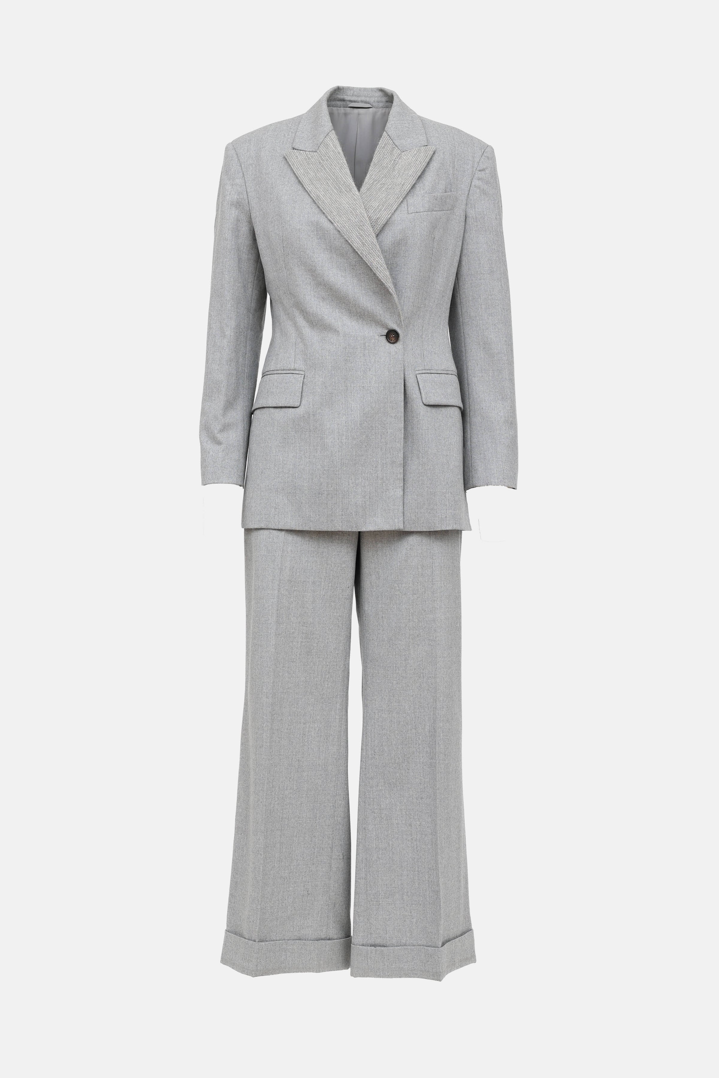 Pre-owned Brunello Cucinelli grey wool blazer featuring a peak lapel with monili bead embellishment, long sleeves with buttoned cuffs, one welt pocket at chest, two flap pockets at hip, and double breasted button closure. Matching trousers feature two slip pockets at hip, two welt pockets at back, wide leg, pleated cuff, and zip fly with button closure.