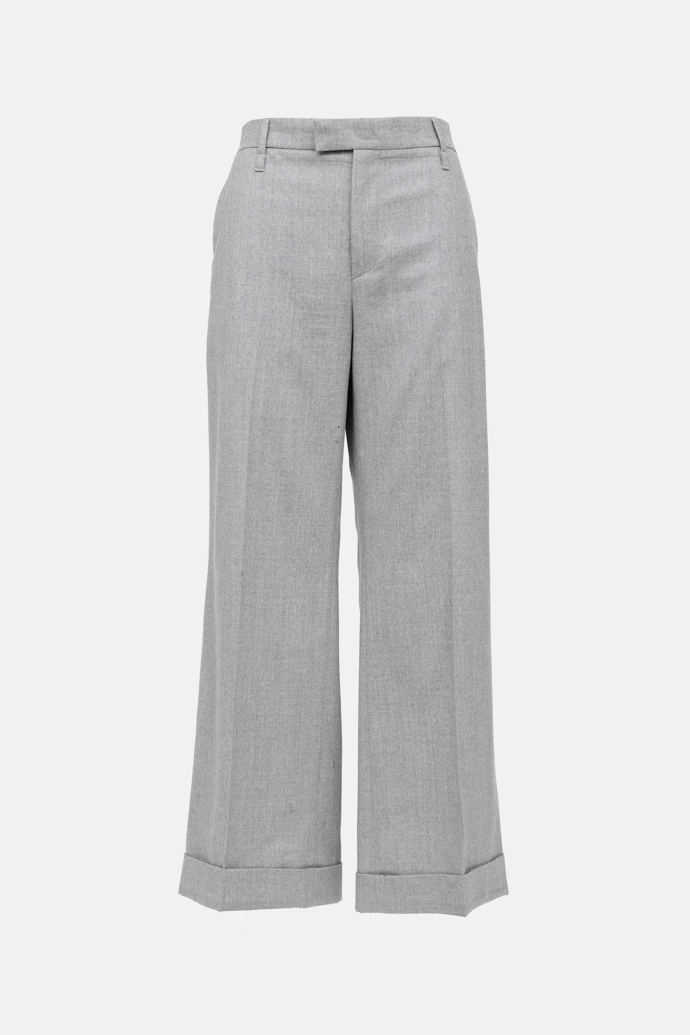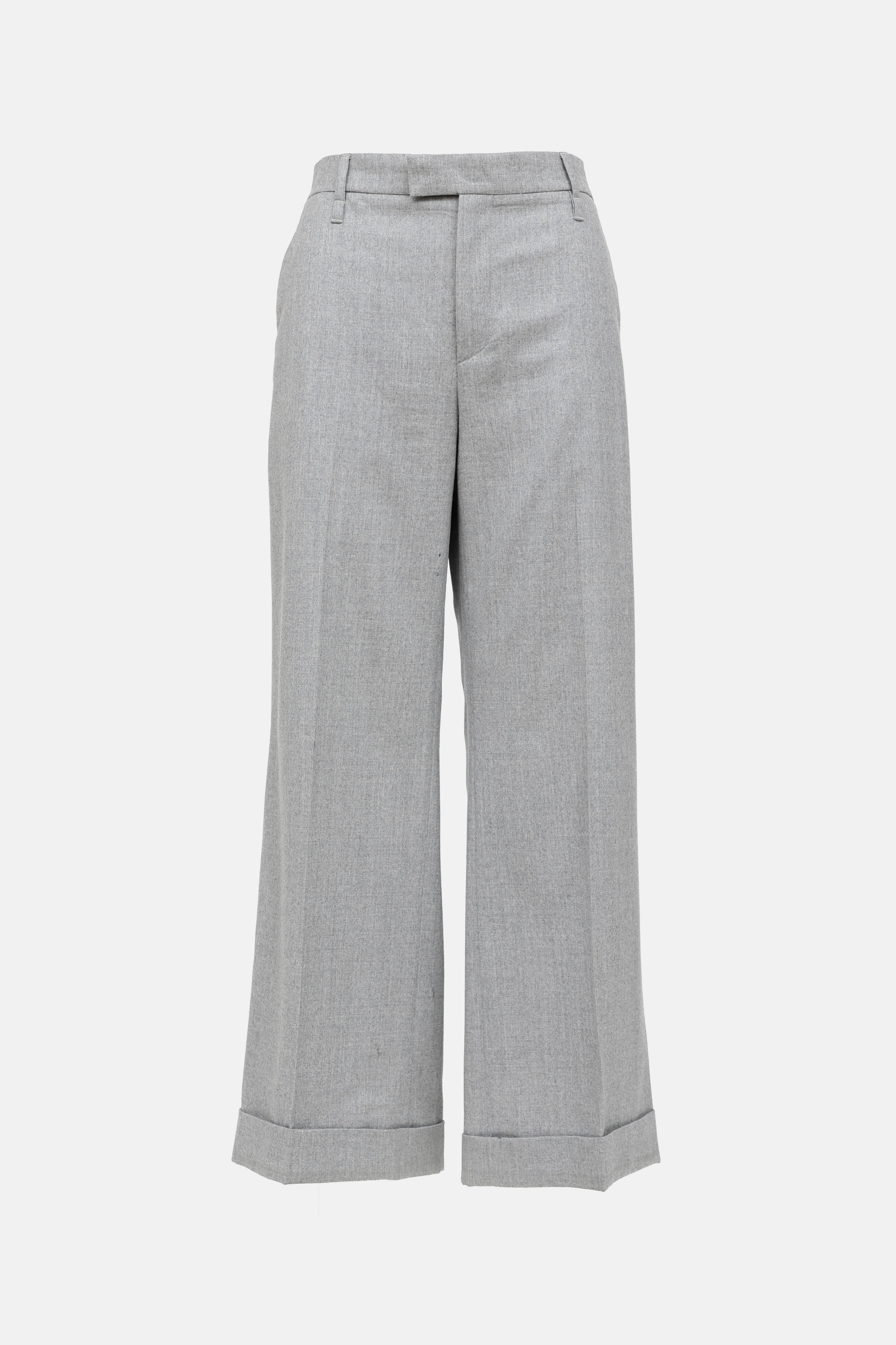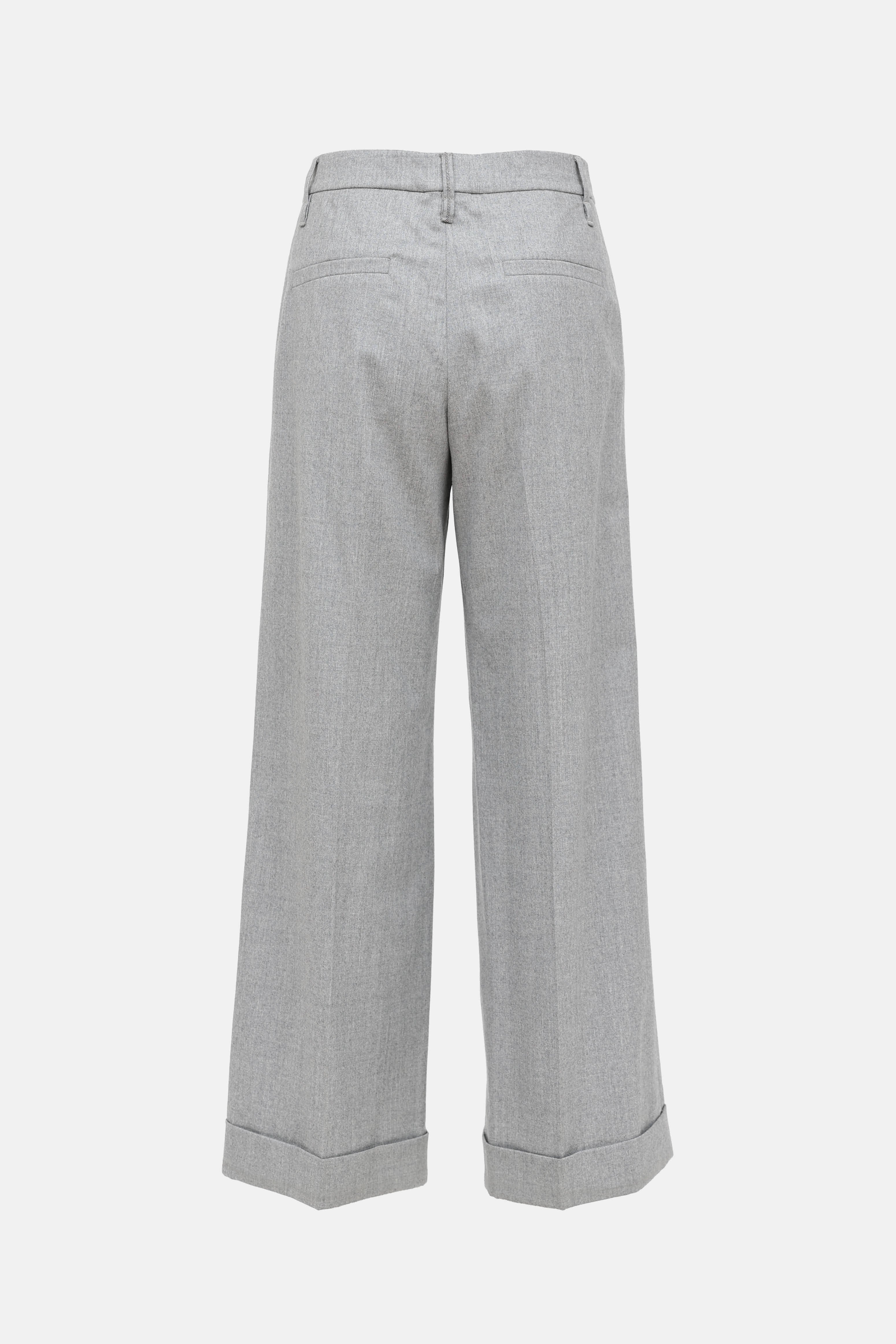 Pre-owned Brunello Cucinelli grey wool blazer featuring a peak lapel with monili bead embellishment, long sleeves with buttoned cuffs, one welt pocket at chest, two flap pockets at hip, and double breasted button closure. Matching trousers feature two slip pockets at hip, two welt pockets at back, wide leg, pleated cuff, and zip fly with button closure.