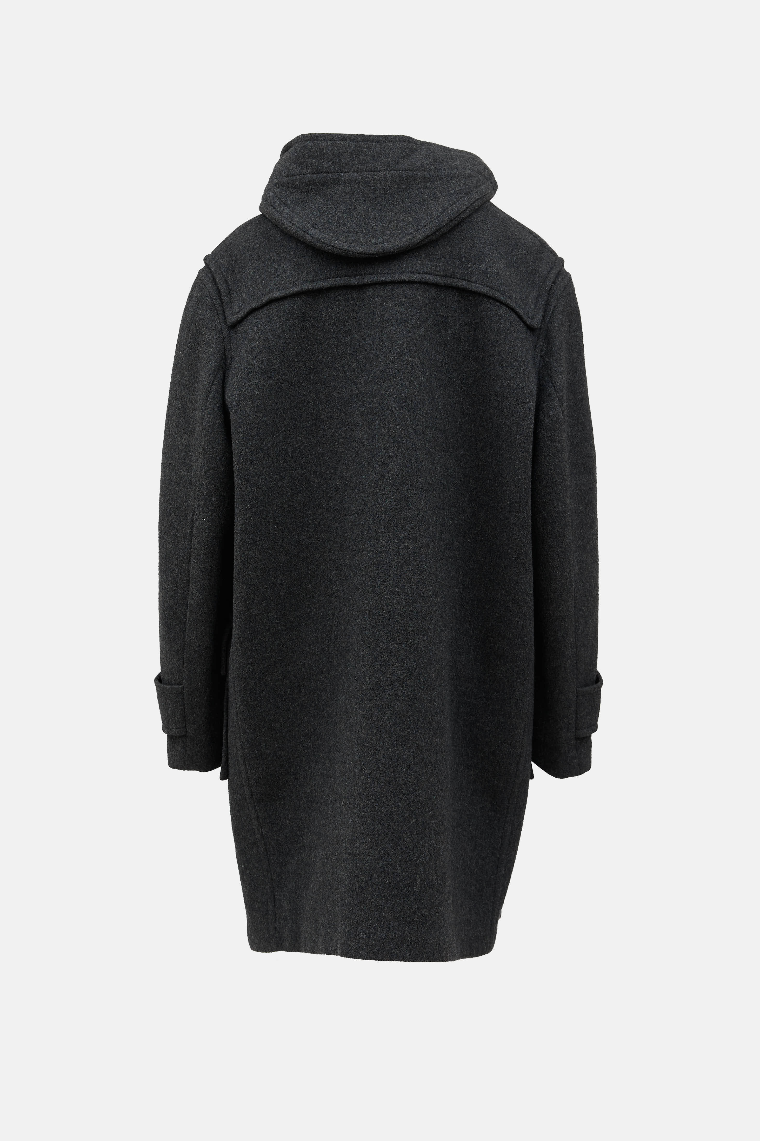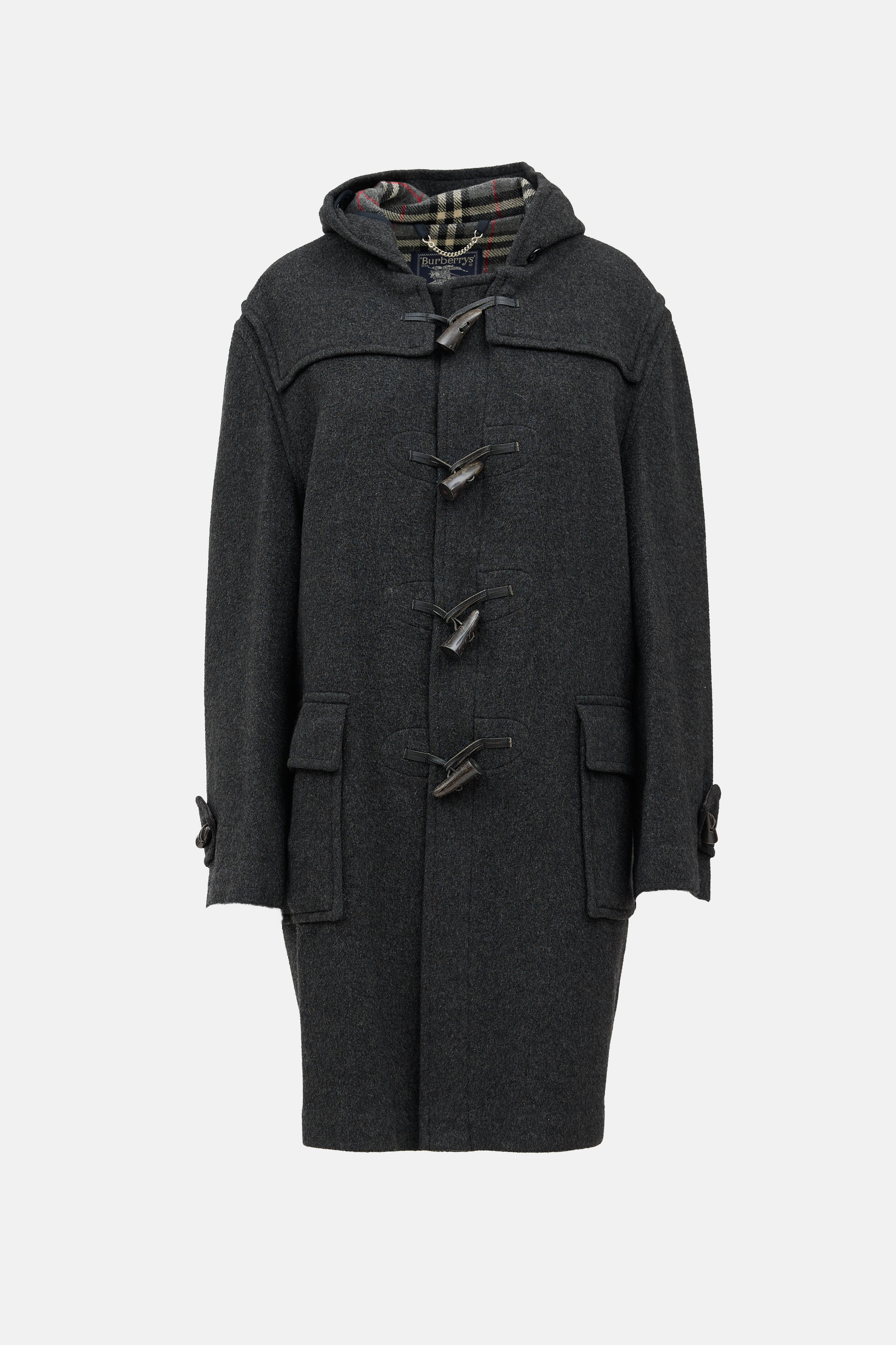 Pre-owned Burberrys' grey wool coat featuring an attached hood, long sleeves with buttoned cuffs, two flap pockets at hip, and duffle closure. Lined.