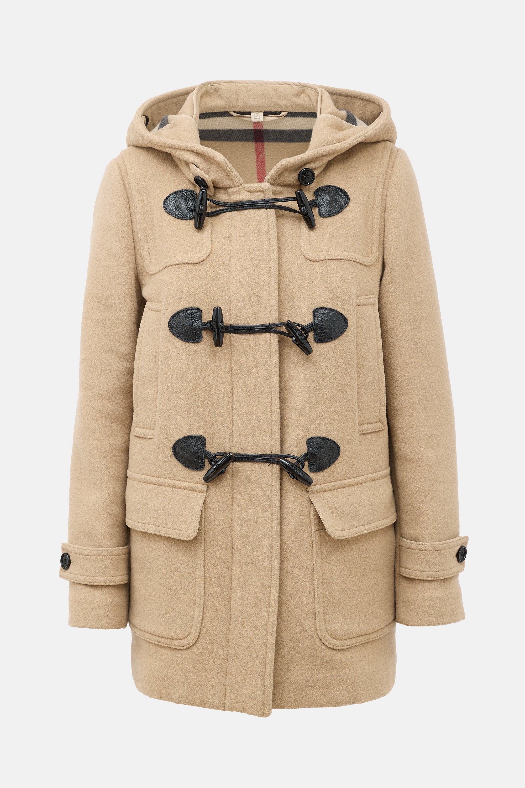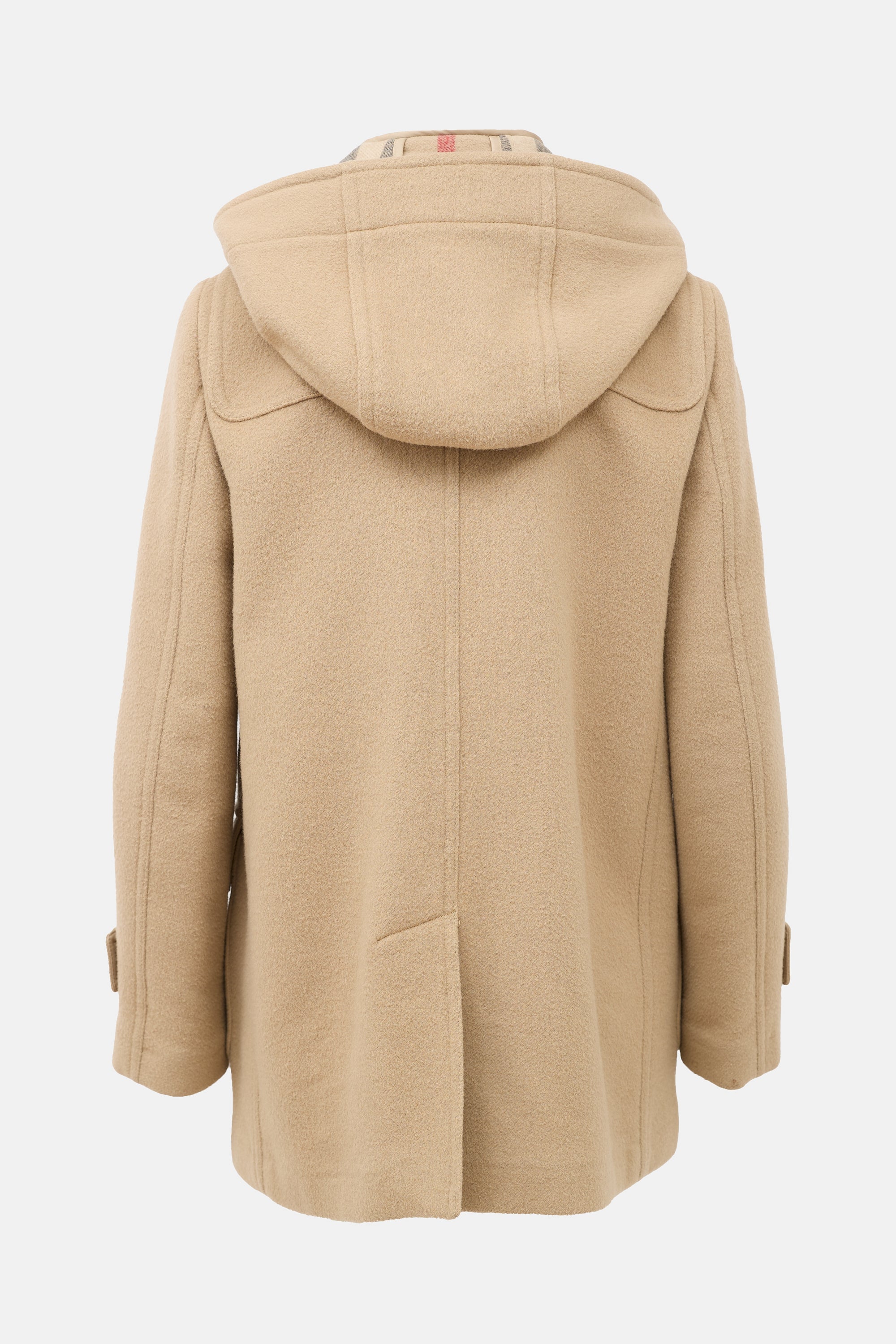 Pre-owned Burberry beige wool Duffle coat featuring a hooded collar, toggle front closure, patch pockets, and check patterned interior.