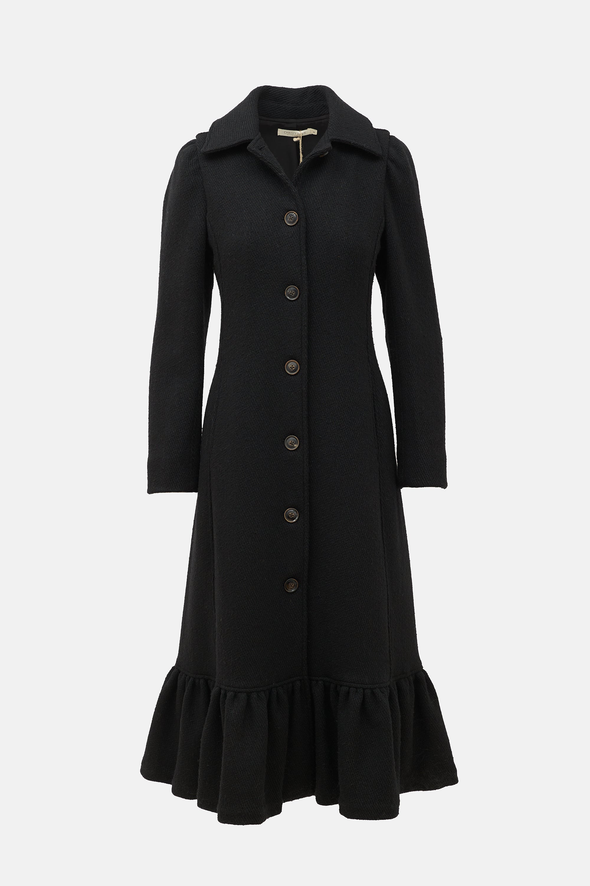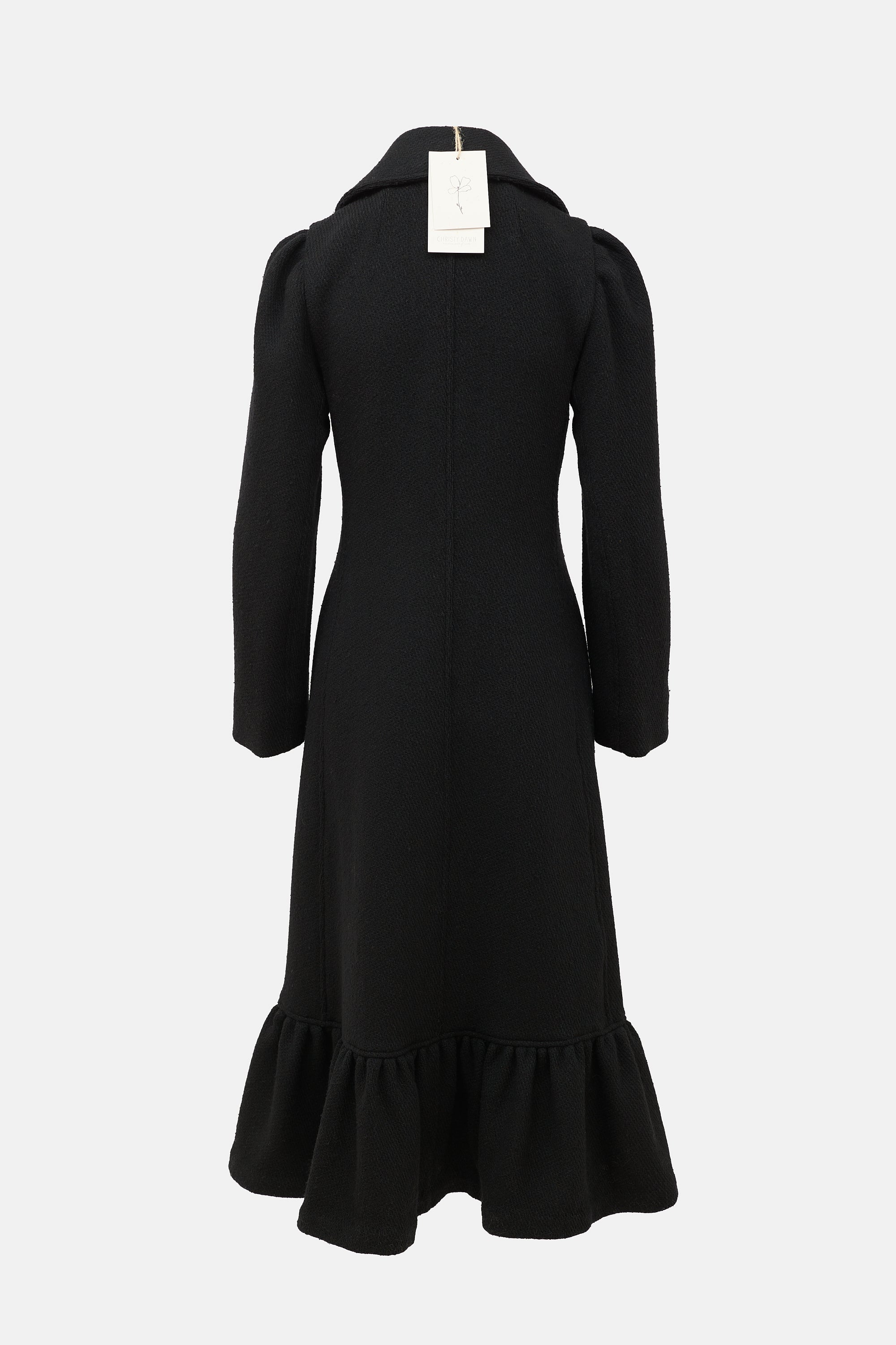 Pre-owned Christy Dawn black Lennox coat featuring a spread collar, button front, in seam pockets, and ruffled hem.