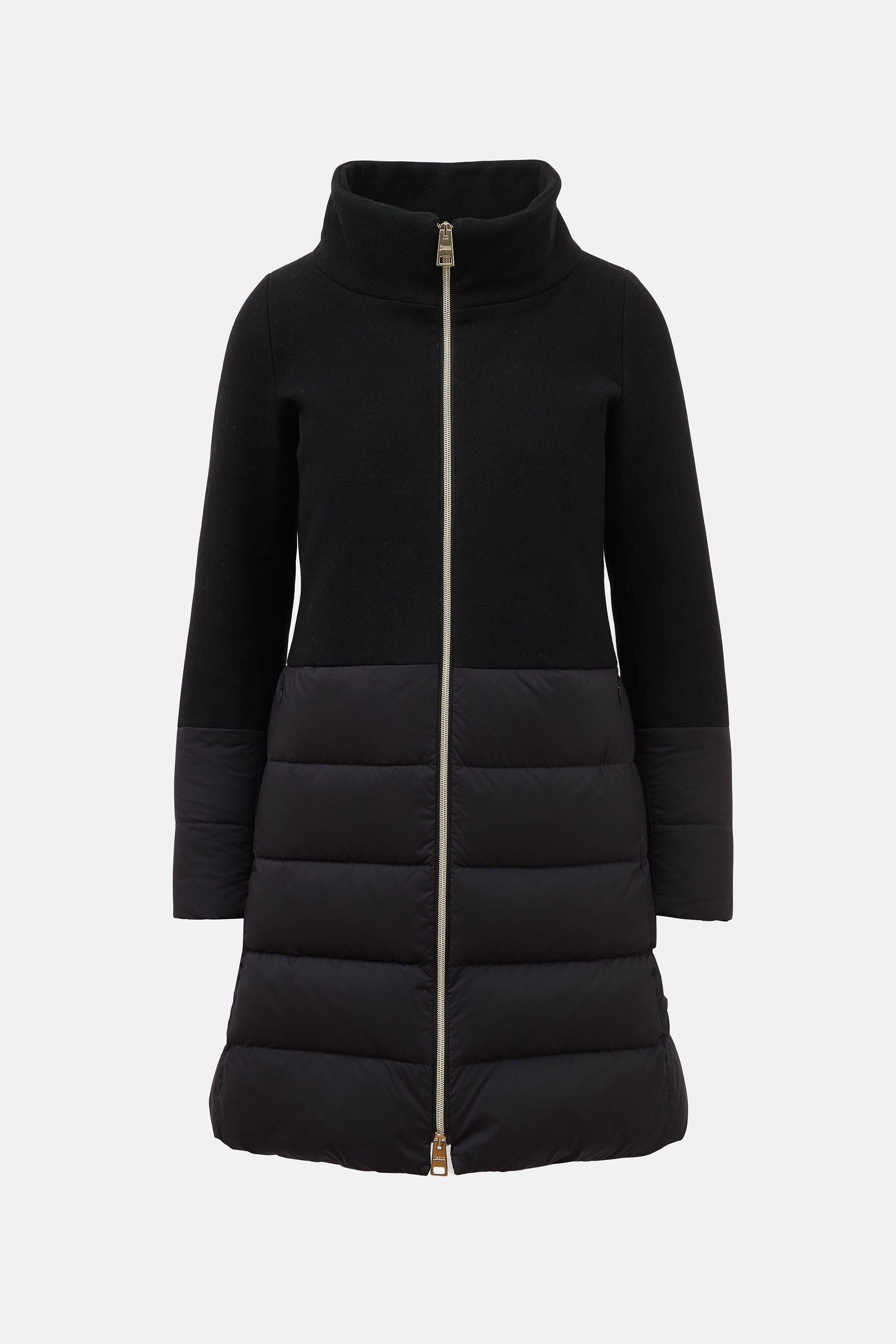 Pre-owned Herno black wool blend coat featuring a funnel neck, front zip, in seam pockets, and nylon puffer panelled hem and cuffs.