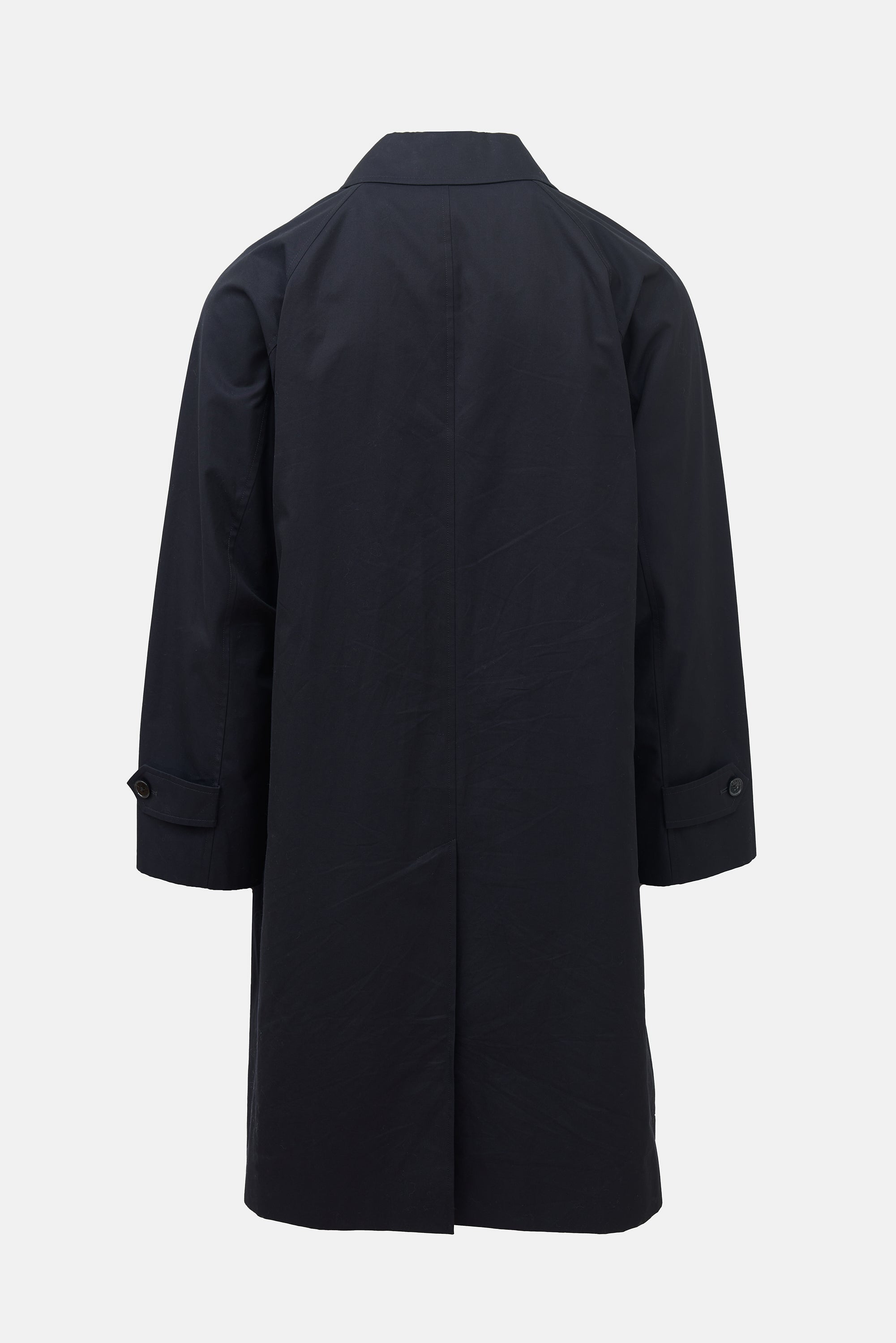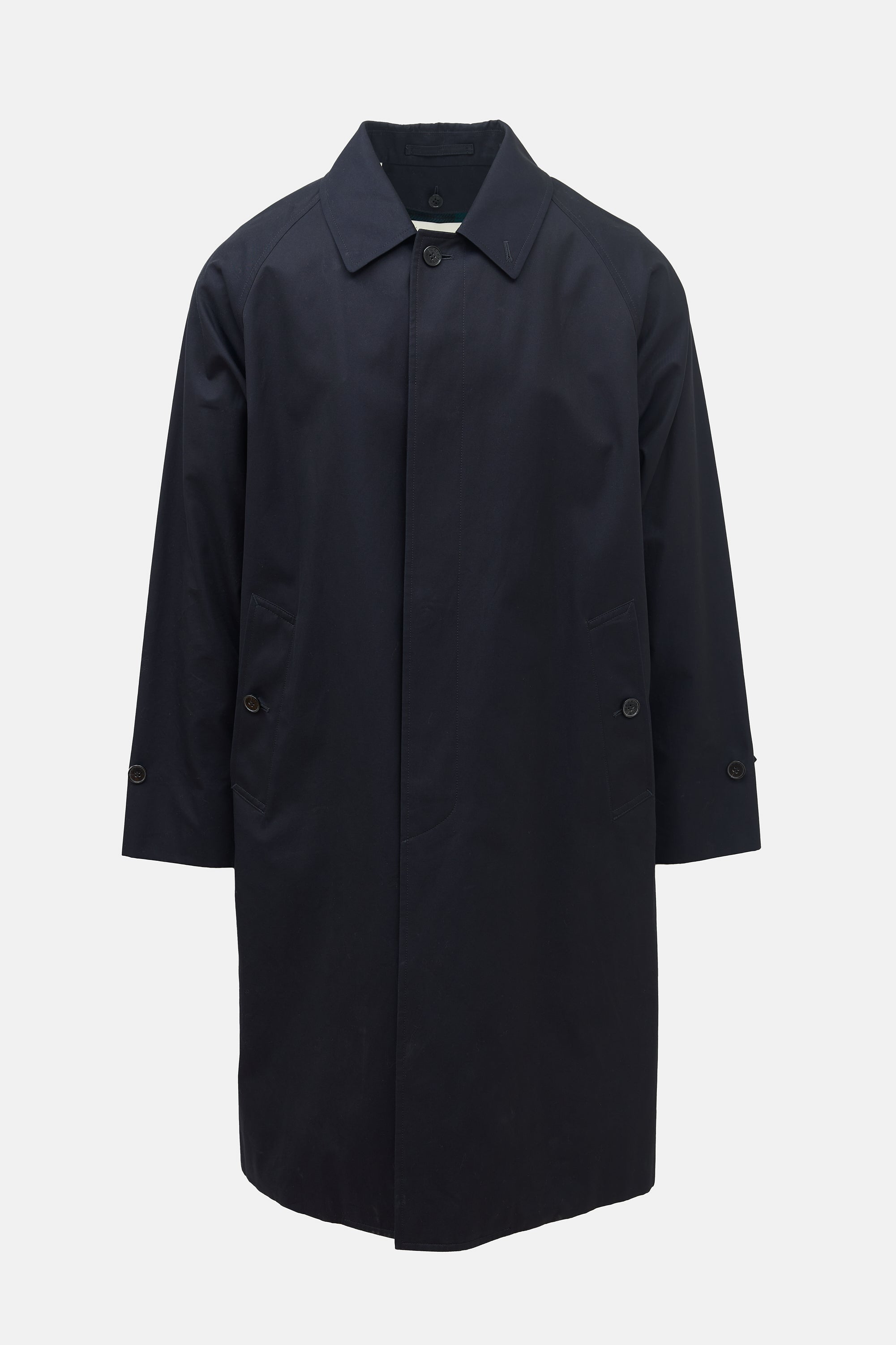 Pre-owned Mackintosh navy gabardine New Balfield Car coat featuring a spread collar, button front, raglan sleeve, welt pockets, back vent, and detachable wool check liner. Lined.