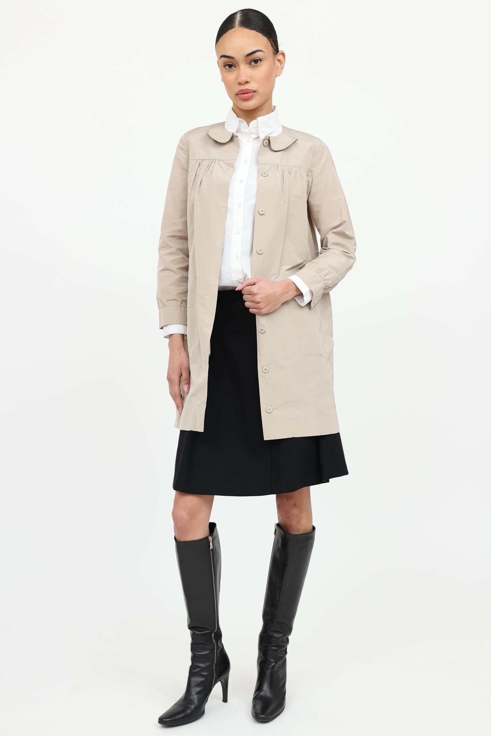 Pre-owned Miu Miu 2009 beige long sleeve coat featuring peter pan collar, snap button front, pleated chest, and buttoned cuffs.