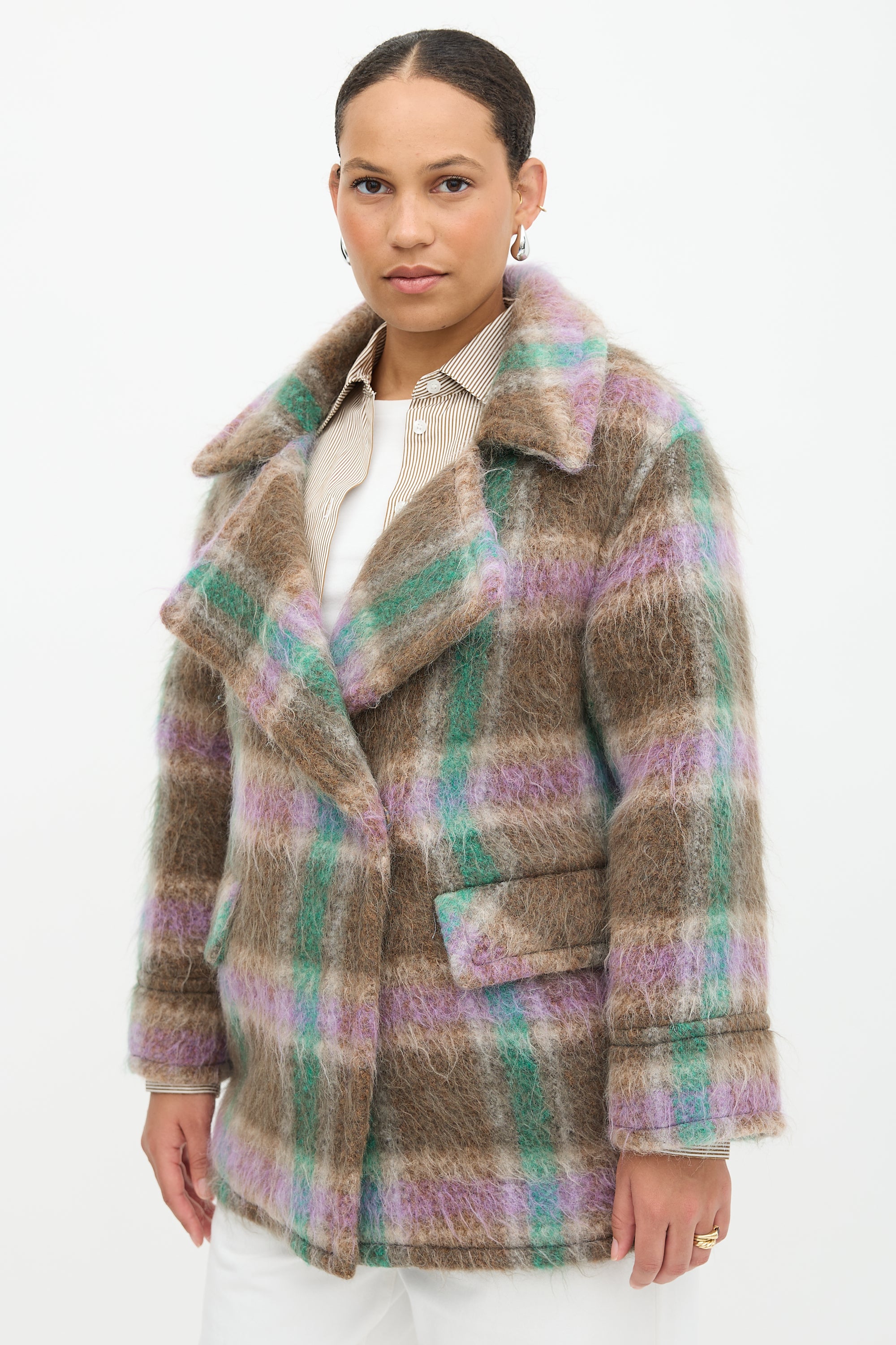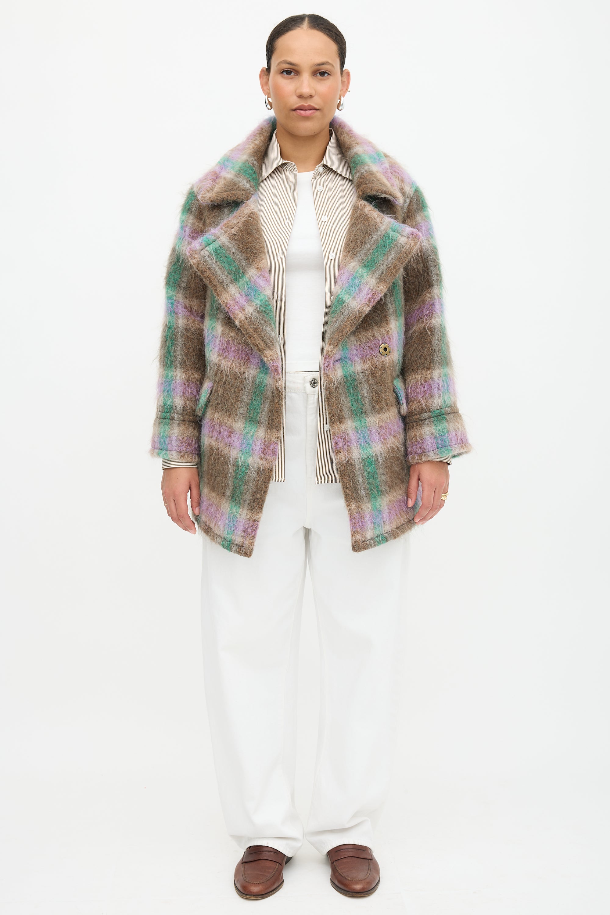 Pre-owned Smythe purple, brown, and multicolour mohair blend Blanket Car coat featuring plaid pattern, wide collar and lapel, asymmetrical front, snap button front closure, and two front flap pockets. Lined.