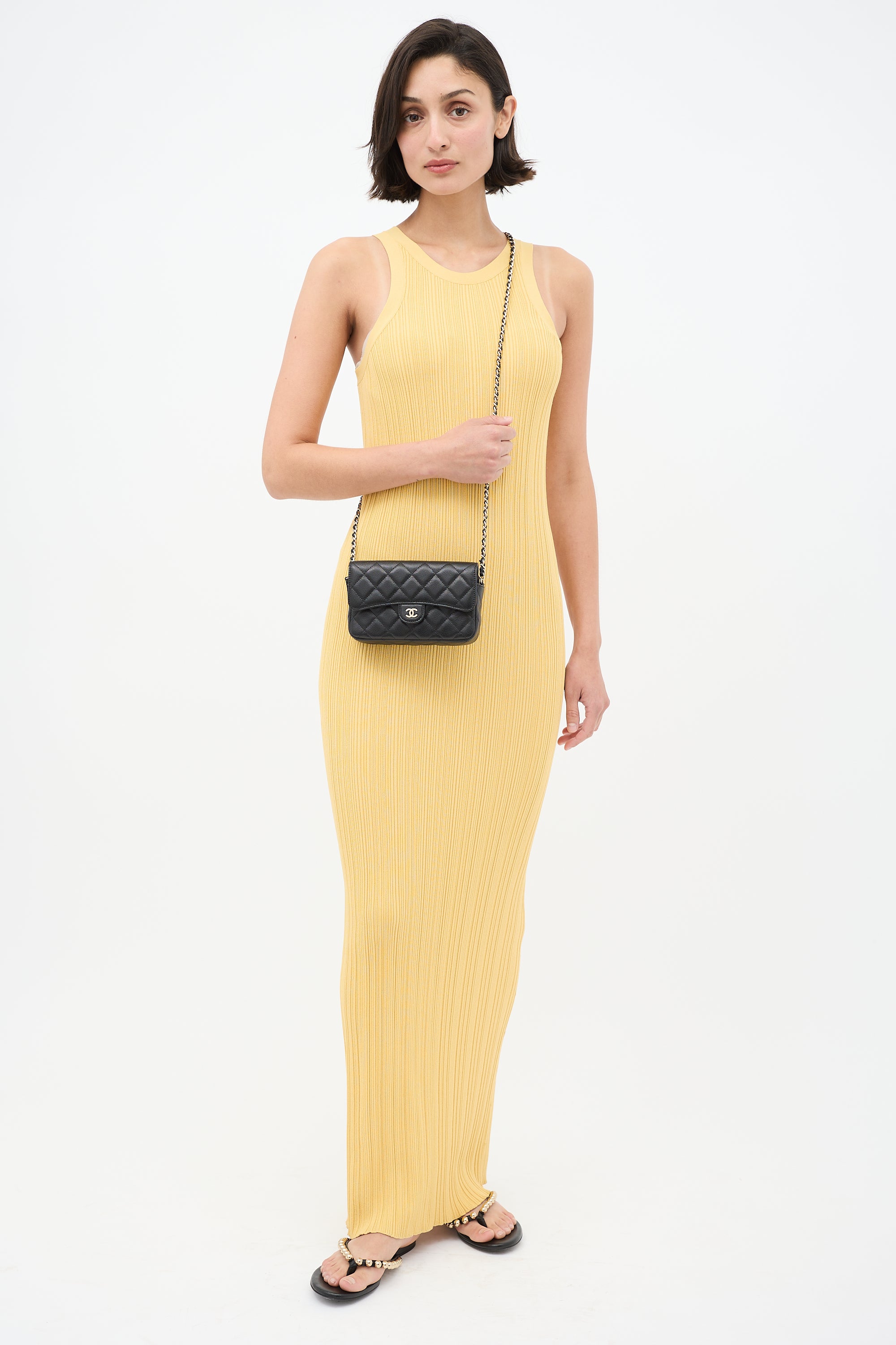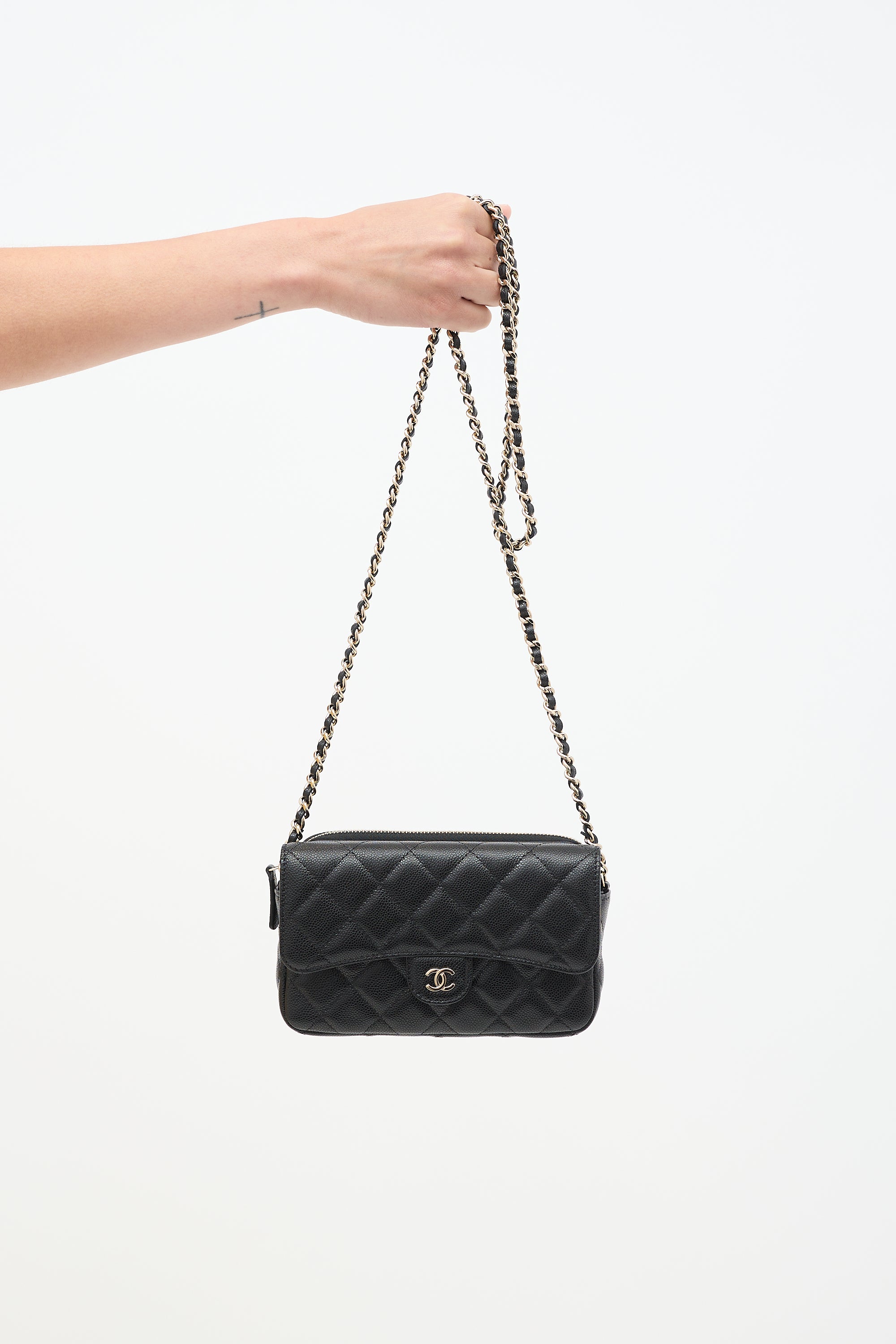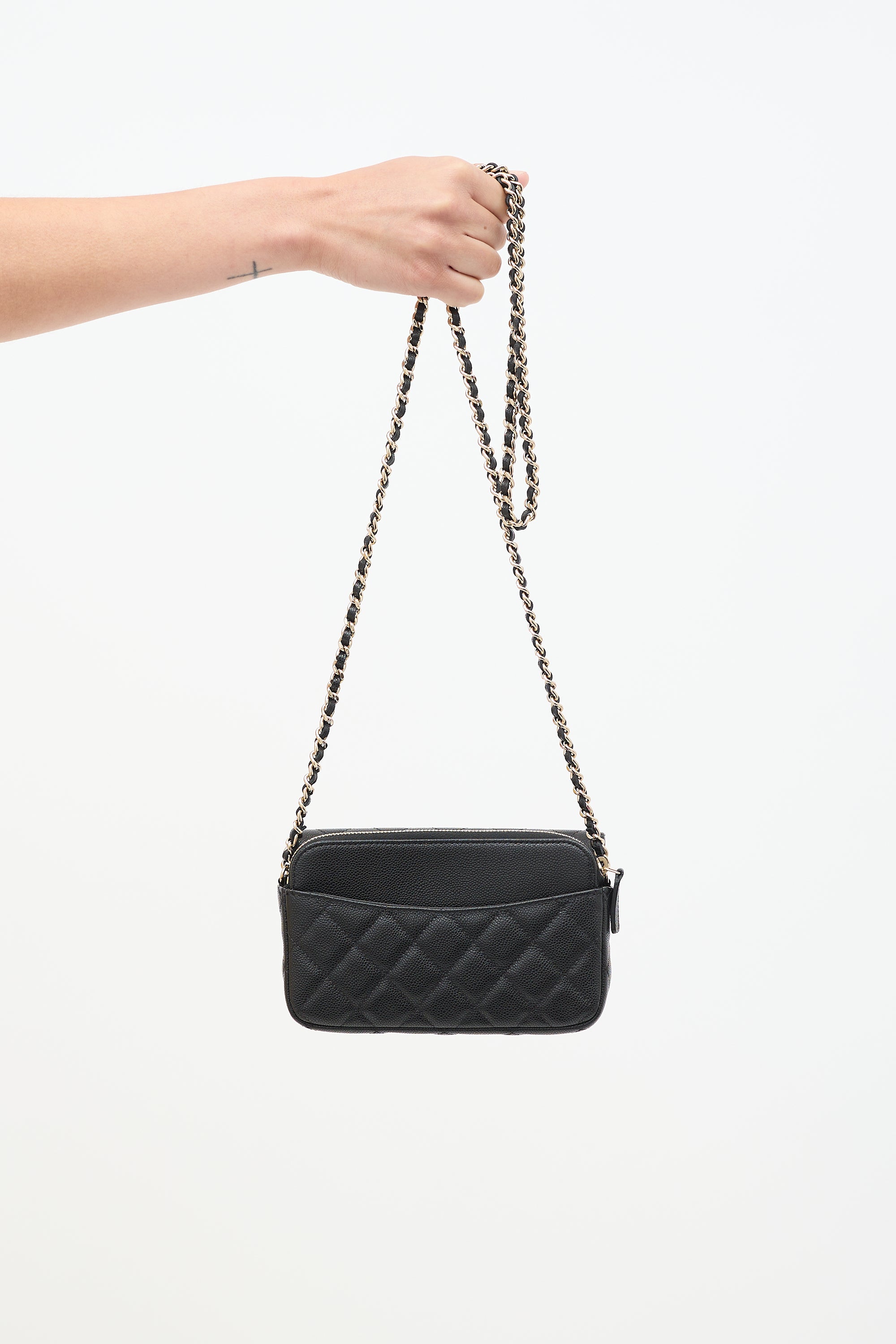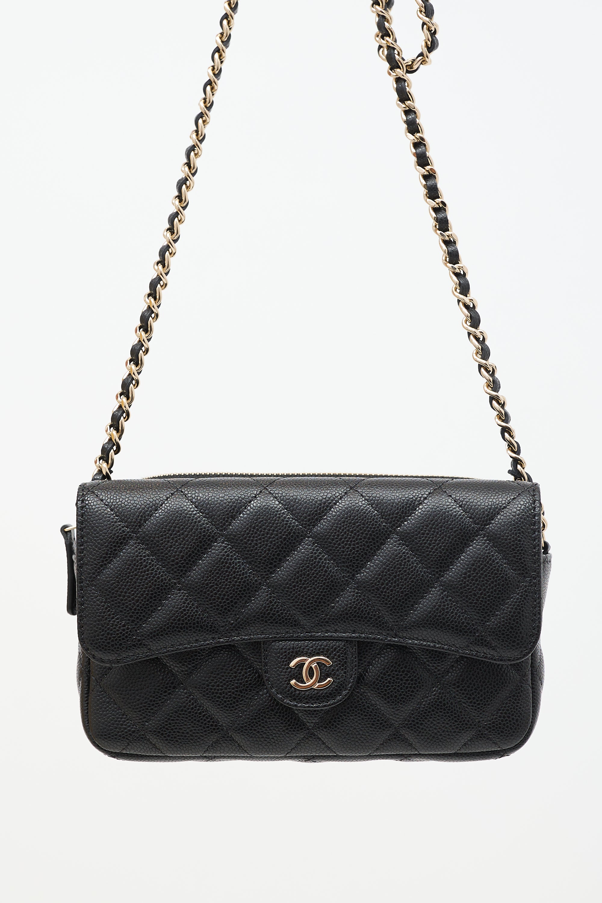 Pre-owned Chanel black Phone Holder bag featuring quilted leather, gold tone hardware, snap button closure with CC logo at front, front compartment, zip closure at top, one slip pocket at back, canvas lining, one zip pocket and three card slots at main compartment, and fixed braided leather and chain shoulder strap. Comes with original dust bag and box.
